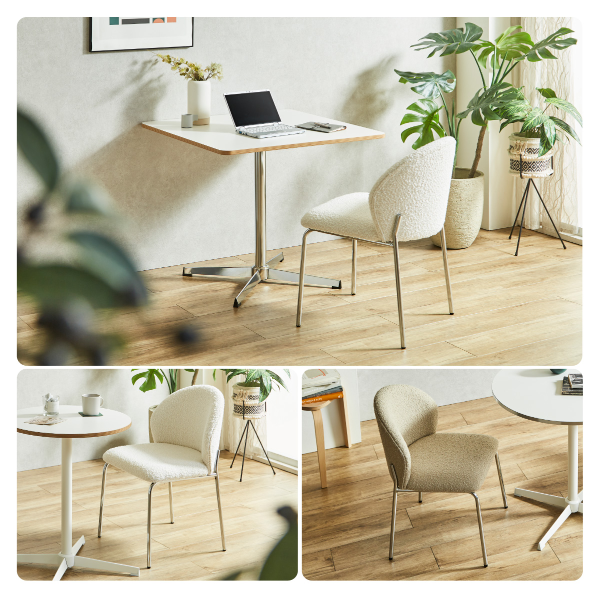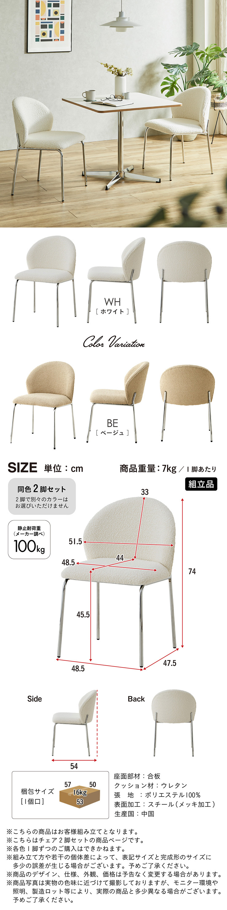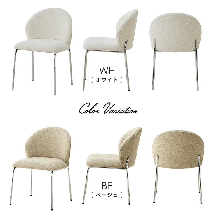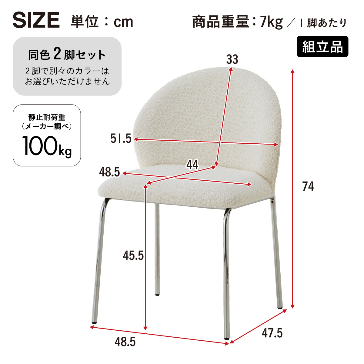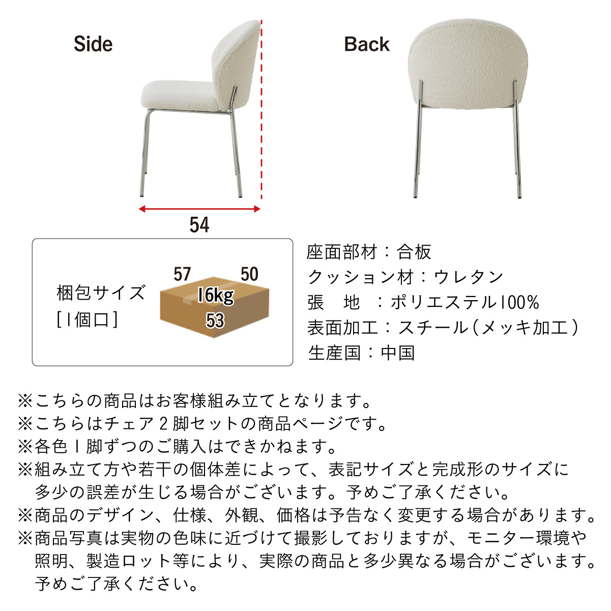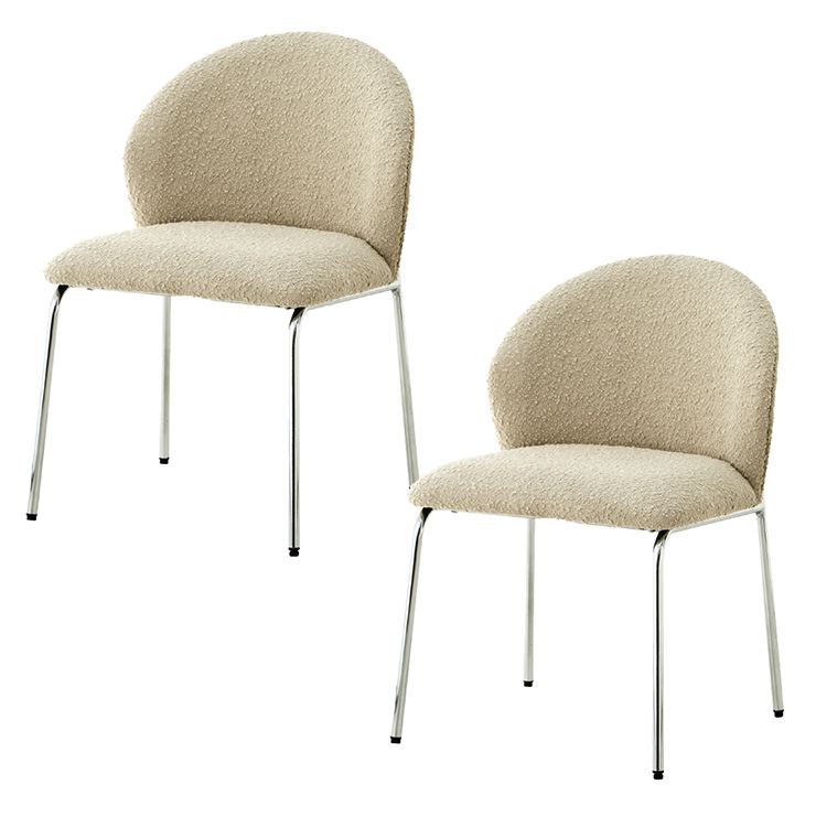 | 日常に、上質なホテルスタイルを Real(レアル)2脚セット 丸みのあるフォルムに、立体感のあるブークレ素材。 スチール脚が全体をすっきりまとめ、洗練されたバランスを生み出します。 ■曲線が映えるシェルデザイン 貝殻を思わせるなめらかな曲線が、やわらかなアクセント。 シンプルなのに印象的な、戦乱されたチェアです。 ■ふわっと包み込むブークレ素材 小さなループ糸を仕様し、ふっくらとした触り心地に。 高級感のある佇まいと、やさしい温もりを両立。 全面張り仕様で、後ろ姿まで美しく整えています。 ■美しいメッキ仕上げのスチール脚 シャープでスタイリッシュな印象を演出。 丈夫なスチール素材を使用し、耐久性と安定感にも配慮。 ■包み込まれるような安心感 身体のラインに沿う立体設計で、腰をサポート。 自然な姿勢へと導くカーブが、長時間でも快適な座り心地。 ■しっかり支える、快適クッション 座面と背もたれに程よい弾力をもたせたウレタンを使用。 身体をやさしく受け止めながら体圧を分散し、心地よい座り心地が続きます。 工具いらずのかんたん組み立て ネジで脚を固定するだけの簡単設計。 工具は付属しているので追加購入は不要です。 高さ調整ができるアジャスター付き 床に合わせて調整でき、安定して設置できます。 ※こちらの商品はお客様組み立てとなります。 ※こちらはチェア2脚セットの商品ページです。 ※サイズの計測の仕方や若干の個体差によって、表記サイズと完成系のサイズに多少の誤差が生じる場合がございます。予めご了承ください。 ※商品のデザイン、仕様、外観、価格は予告なく変更する場合がございます。 ※商品写真は実物の色味に近づけて撮影しておりますが、モニター環境や照明、製造ロットにより、実際の商品と多少異なる場合がございます。あらかじめご了承ください。 | |
