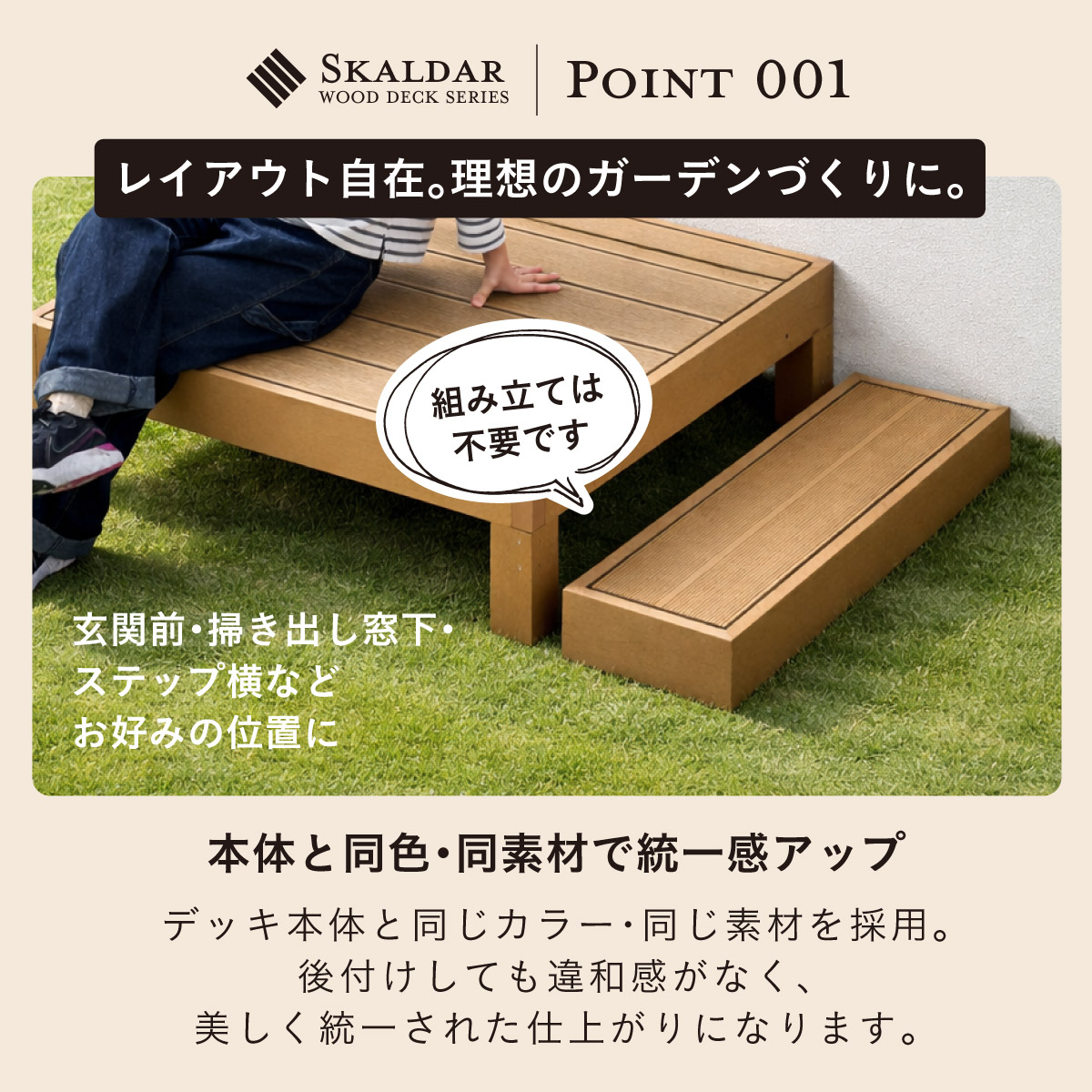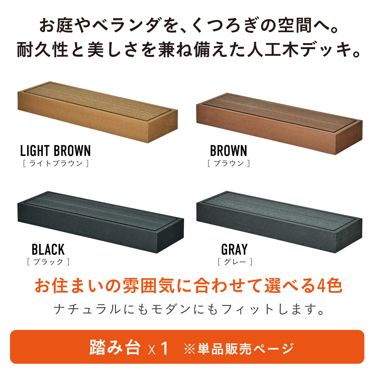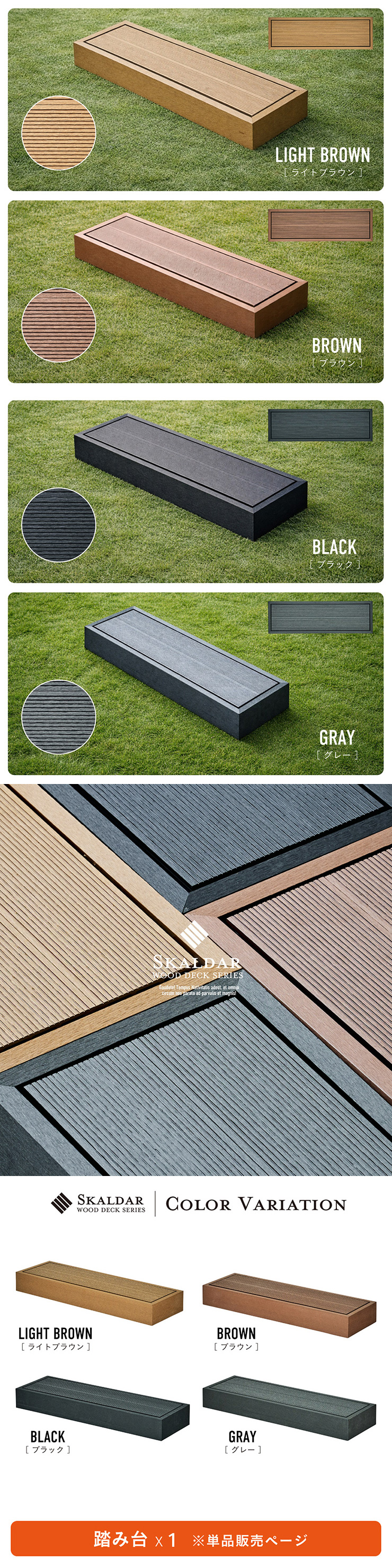 | 人工木ウッドデッキ Skaldar(スカルダー) 踏み台単品 お庭やベランダを、くつろぎの空間へ。 耐久性と美しさを兼ね揃えた人工木デッキ。 お住まいの雰囲気に合わせて選べる4色 ナチュラルにもモダンにもフィットします。 ■人工木ならではの4つのメリット ・雨や汚れに強く、屋外でも安心 ・色あせしにくく美しさ長持ち ・サッと拭くだけ、簡単お手入れ ・虫がつきにくく、腐食の心配が少ない ■お手入れ簡単な「人工木」 人工木とは、木粉と樹脂(プラスチック)を混ぜ合わせて作られた高耐久素材です。 天然木のような風合いを持ちながら、腐食しにくい・変色しにくい・反りや割れが起こりにくい 天然木デッキの悩み 持続的なメンテナンスが必要です。 お手入れを怠ると、劣化や強度低下の原因になることも。 ・定期的な防腐処理 ・色あせや塗装の塗り直し ・湿気による腐食対策 ■レイアウト自在。理想のガーデンづくりに。 本体と同色・同素材で統一感アップ デッキ本体と同じカラー・同じ素材を採用。 後付けしても違和感がなく、美しく統一された仕上がりになります。 ■雨や水に濡れても安心 人工木は水分を吸収しにくい素材 雨ざらしでも使いやすく、日常のお手入れも水洗いでOK。 屋外でも気兼ねなくお使いいただけます。 自由に組み合わせて、理想の空間へ 設置スペースやライフスタイルに合わせて、自由にレイアウトできるユニット設計。 横に広く並べて、開放感のあるデッキスペースに。 ※掲載画像のレイアウトは一例です。 ※こちらは単体の商品ページです。 ※サイズの計測の仕方や若干の個体差によって、表記サイズと完成形のサイズに多少の誤差が生じる場合がございます。予めご了承ください。 ※傾斜やバランスの悪い場所への設置はしないでください。 ※飛び乗ったり、飛び跳ねたり、乱暴な使用はおやめください。 ※商品のデザイン、仕様、外観、価格は予告なく変更する場合があります。 ※商品写真は実物の色味に近づけて撮影しておりますが、モニター環境や照明、製造ロット等により、実際の商品と多少異なる場合がございます。あらかじめご了承ください。 | |