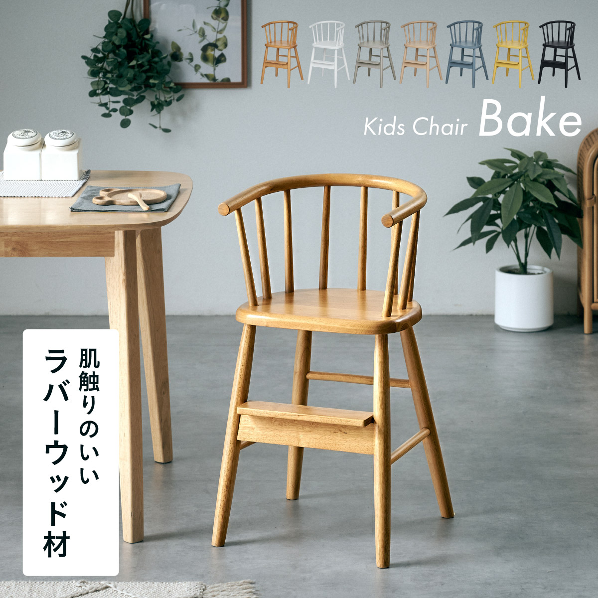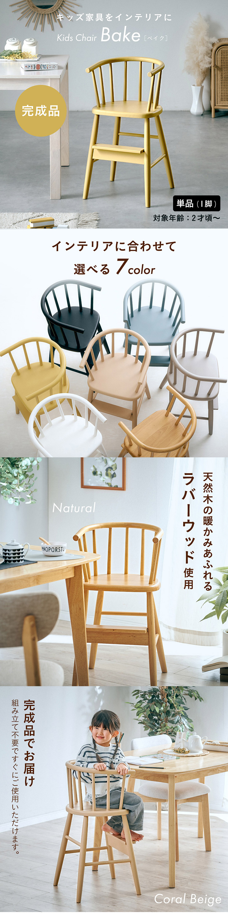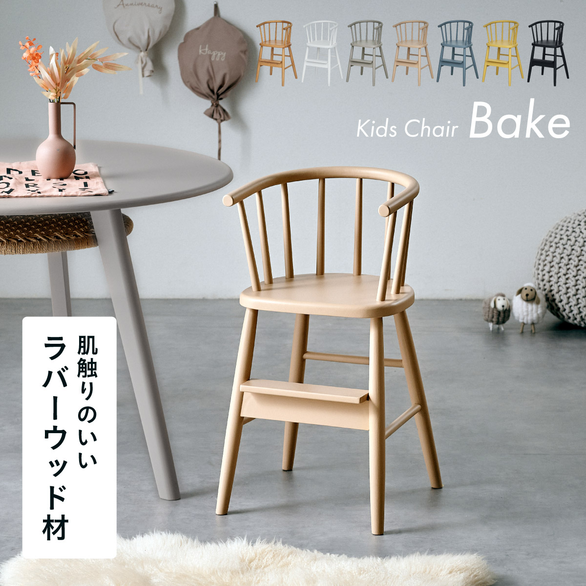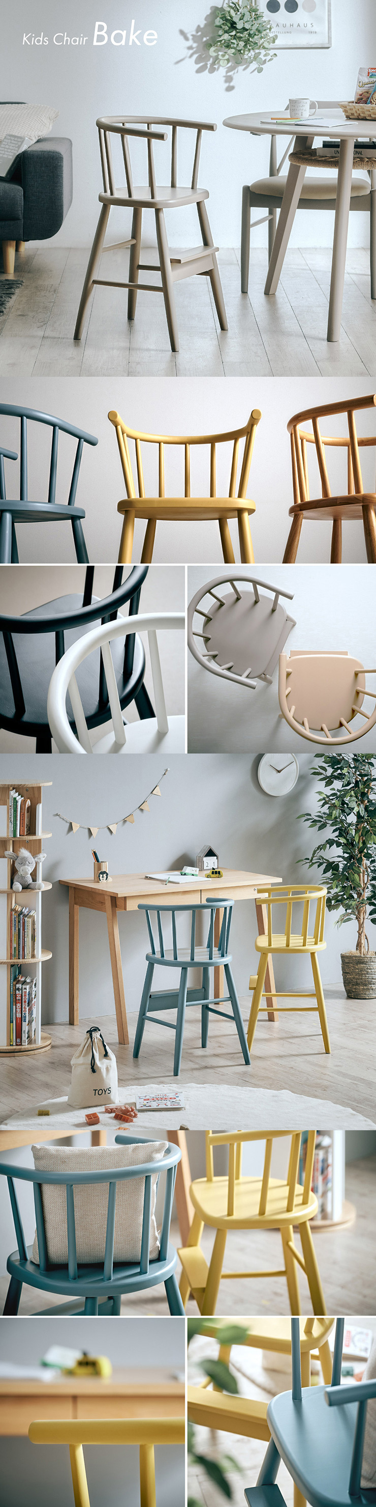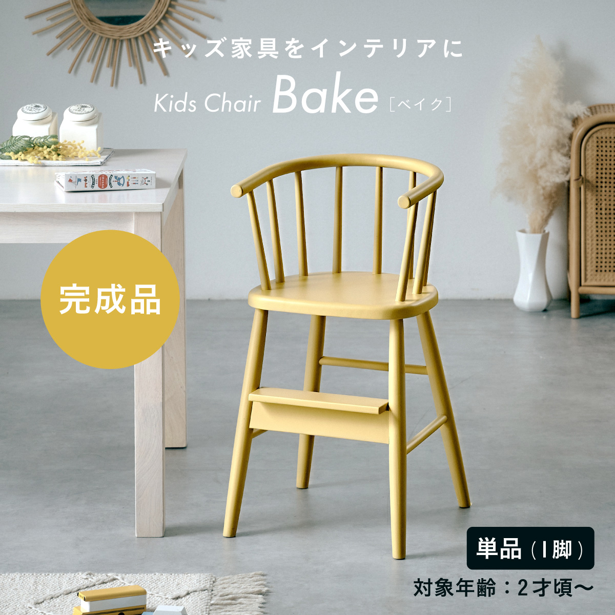| キッズ家具をインテリアに Kids Chair Bake(ベイク) ■天然木の温かみあふれるラバーウッド使用 ■完成品でお届け ■体を優しく包んでくれるラウンドフォルム ■足がしっかり届く足置き ・2才頃からお使いいただけます。 ・しっかり握れる丸みのあるやさしいフォルム ・素足にも心地いい天然木の足置き ■ラバーウッド材xウレタン塗装 なめらかな肌触りが特徴のラバーウッド材に帳面を樹脂膜で覆うことで、傷や汚れがつきにくいウレタン塗装を施しました。 ■存在感のあるデザインとカラー ダイニング以外でもさまざまな用途でご使用いただけます。 ■detail ・脚裏フェルト付き ・座面の厚み2.5cm ・お子さまが触れても安心な面取り加工 ※こちらの商品は完成品となります。 ※対象年齢:2才頃~ ※組立方や若干の個体差により、表記サイズと完成形サイズに多少の誤差が生じる場合があります。予めご了承下さい。 ※こちらは、チェア単品の販売ページとなります。テーブル等は付属しておりません。 ※こちらの商品は天然木を使用しております。木の表情や風合いには個体差がございます。節など木の風合いを理由とした返品・交換は対象外となりますのでご了承ください。 | |