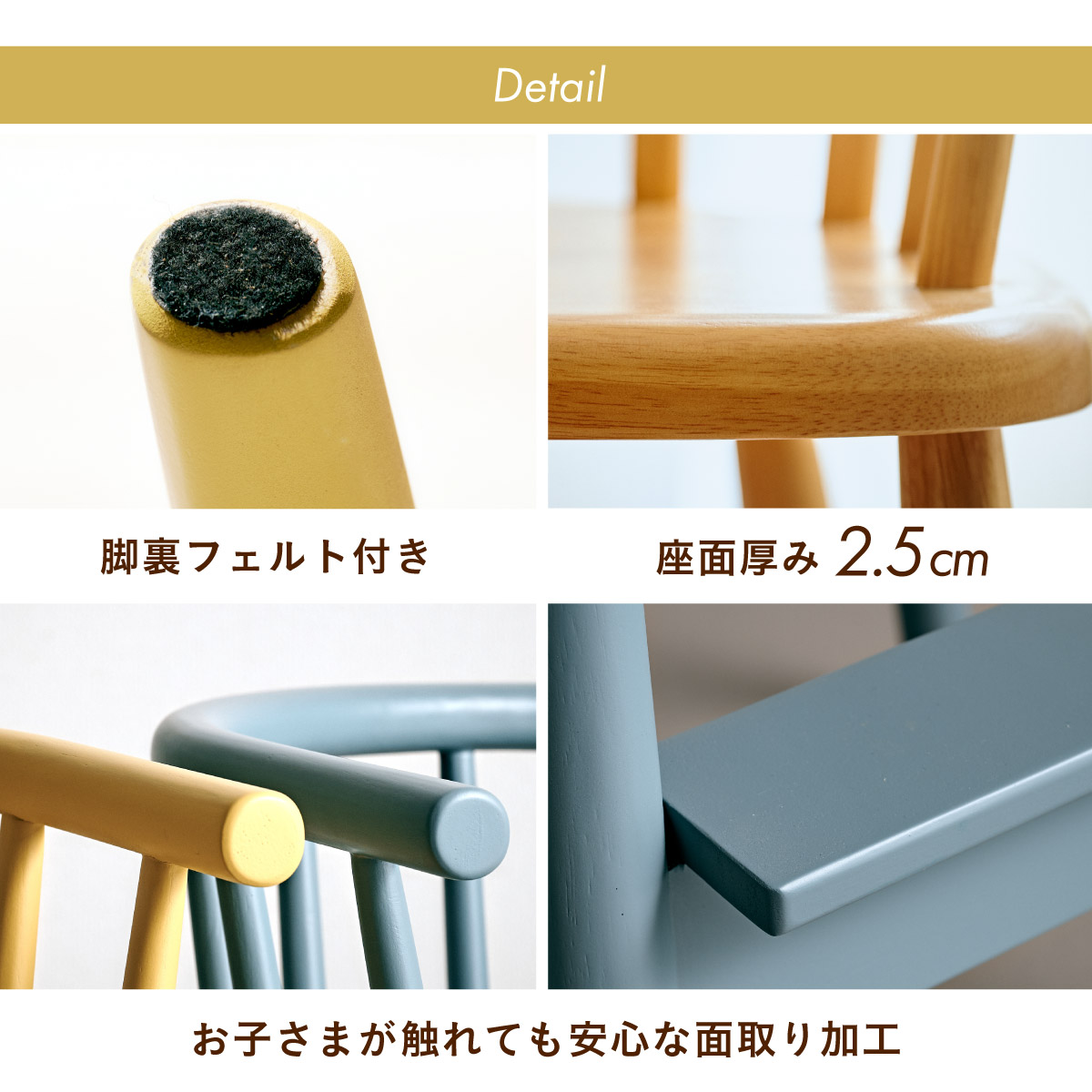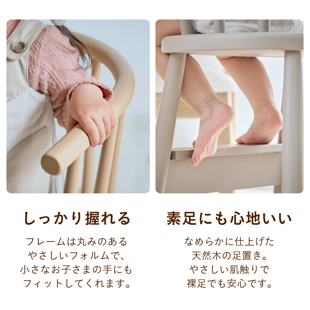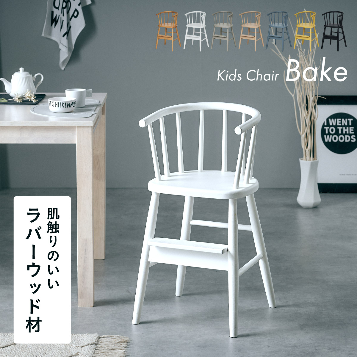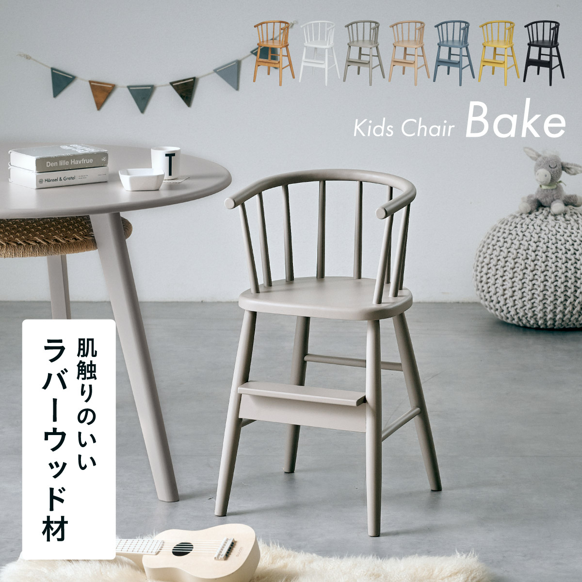 | キッズ家具をインテリアに Kids Chair Bake(ベイク) ■天然木の温かみあふれるラバーウッド使用 ■完成品でお届け ■体を優しく包んでくれるラウンドフォルム ■足がしっかり届く足置き ・2才頃からお使いいただけます。 ・しっかり握れる丸みのあるやさしいフォルム ・素足にも心地いい天然木の足置き ■ラバーウッド材xウレタン塗装 なめらかな肌触りが特徴のラバーウッド材に帳面を樹脂膜で覆うことで、傷や汚れがつきにくいウレタン塗装を施しました。 ■存在感のあるデザインとカラー ダイニング以外でもさまざまな用途でご使用いただけます。 ■detail ・脚裏フェルト付き ・座面の厚み2.5cm ・お子さまが触れても安心な面取り加工 ※こちらの商品は完成品となります。 ※対象年齢:2才頃~ ※組立方や若干の個体差により、表記サイズと完成形サイズに多少の誤差が生じる場合があります。予めご了承下さい。 ※こちらは、チェア単品の販売ページとなります。テーブル等は付属しておりません。 ※こちらの商品は天然木を使用しております。木の表情や風合いには個体差がございます。節など木の風合いを理由とした返品・交換は対象外となりますのでご了承ください。 | |