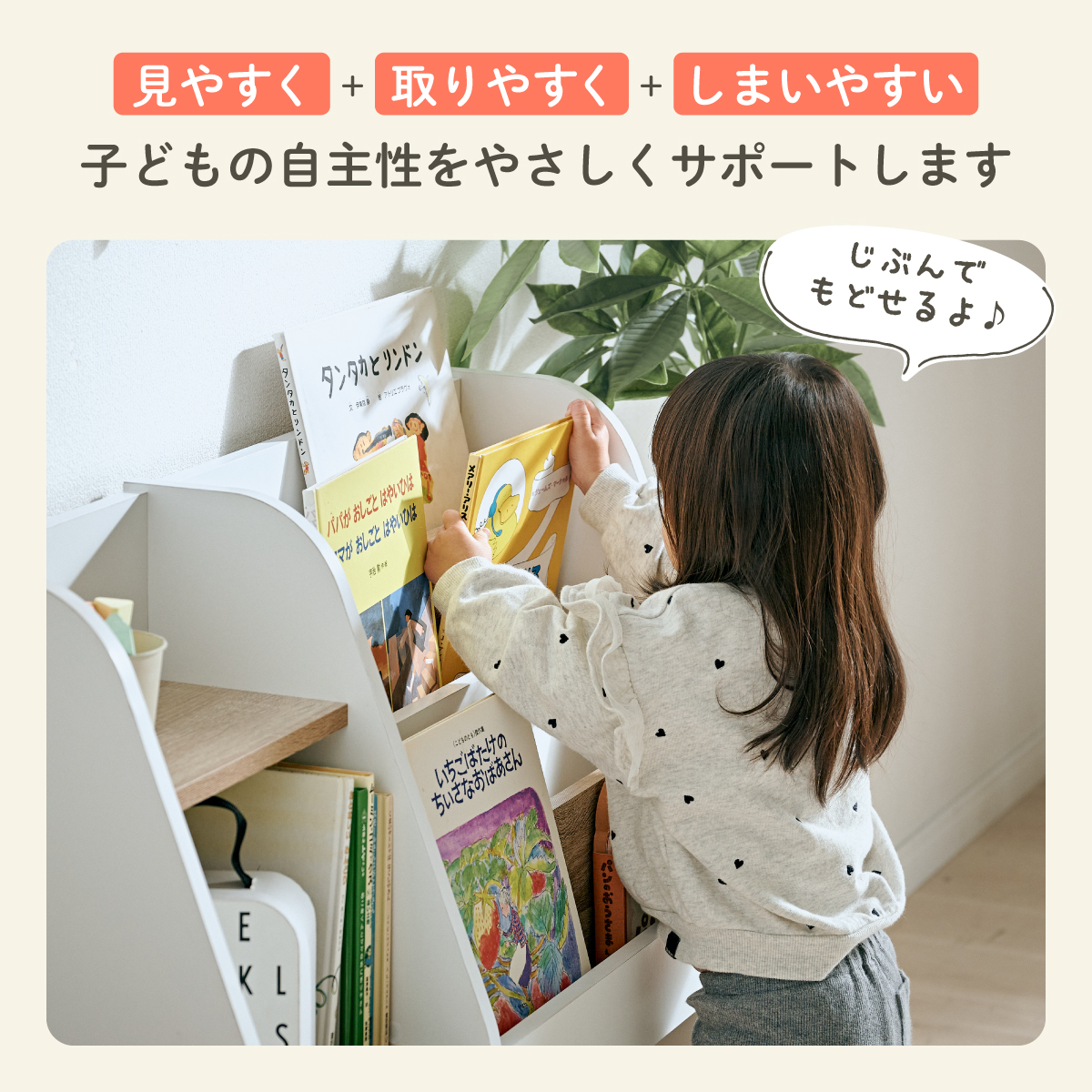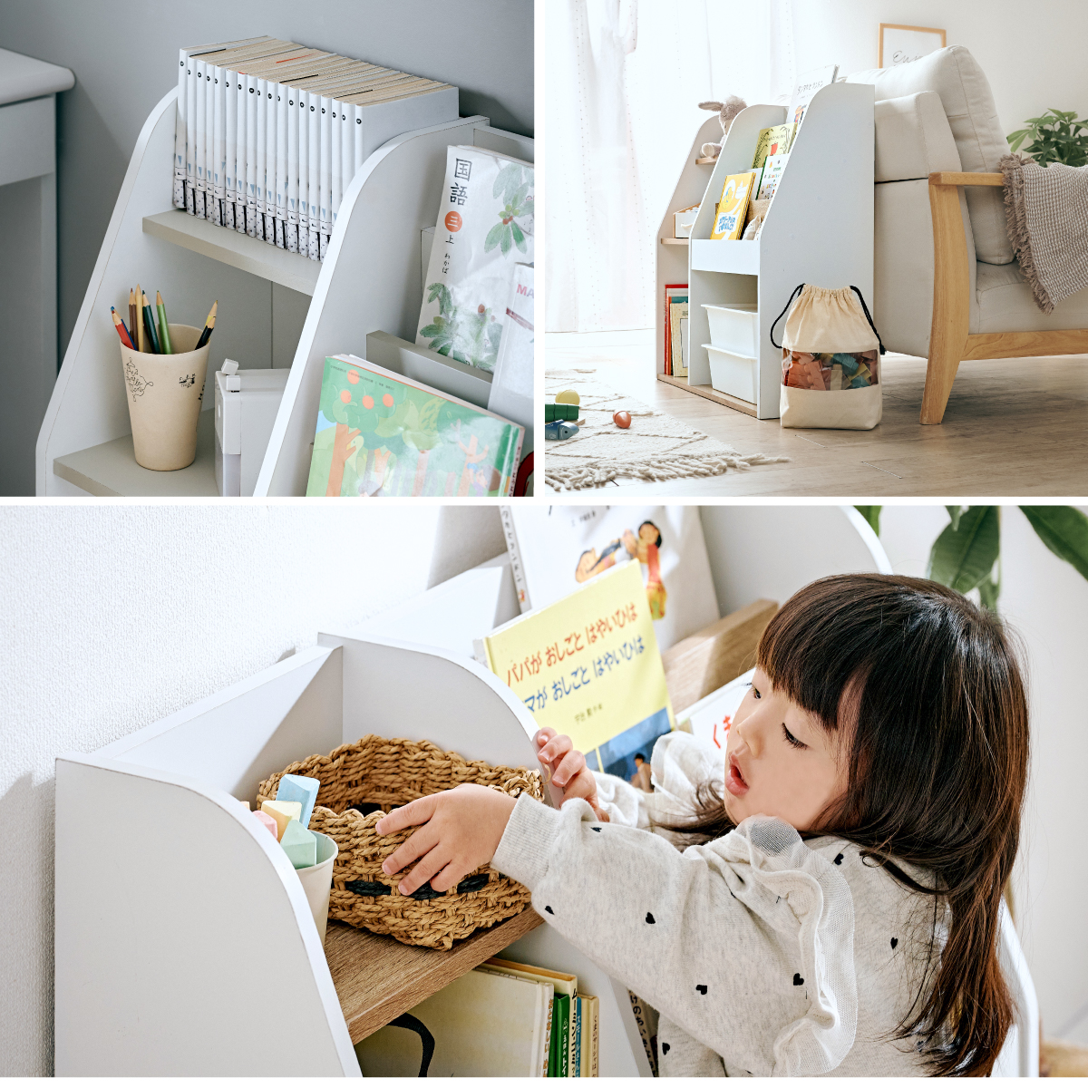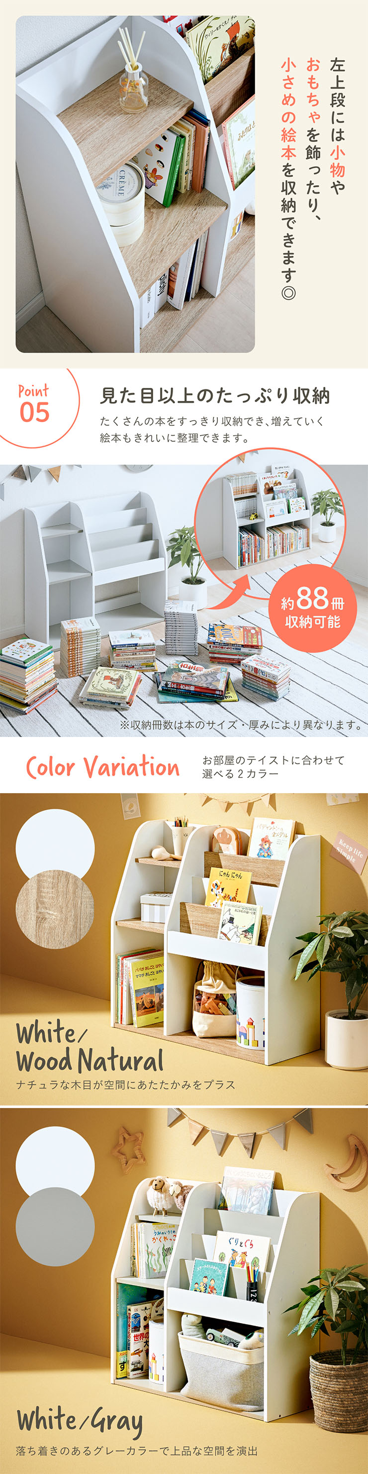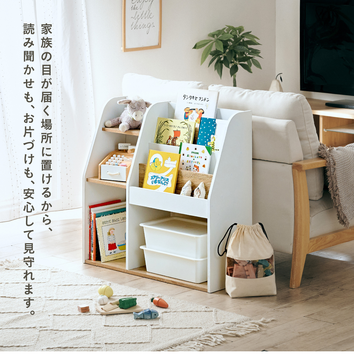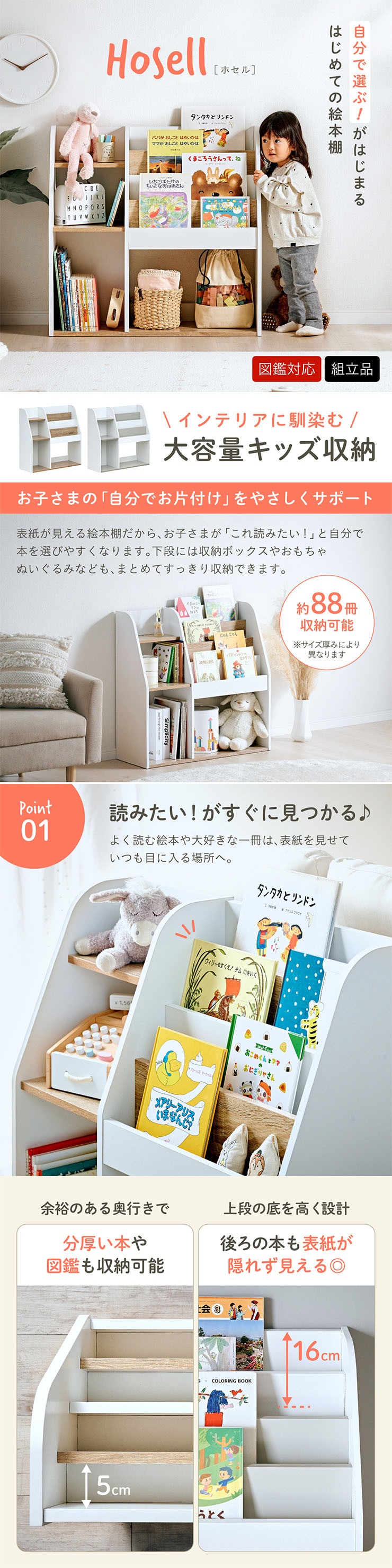 | "自分で選ぶ"がはじまる はじめての絵本棚 Hosell(ホセル) インテリアに馴染む大容量キッズ収納 表紙が見える絵本棚 お片付けの習慣化に ■読みたいがすぐ見つかる よく読む絵本や大好きな一冊は、表紙をよく見せて、いつも目に入る場所へ。 余裕のある奥行きで分厚い本や図鑑等も収納できます。 上段も底を高くしているので、後ろの本でも表紙が隠れずに見えます。 ■小さな"できた"を応援する収納 小さなお子さまでも手が届く設計で、自分で取り出して自分で戻せるから、楽しみながらお片付けの練習ができます。 見やすく、取りやすく、しまいやすい。子供の自主性をやさしくサポートします。 ■ワイド収納 絵本ラックの下は大きなおもちゃやぬいぐるみも、ゆったり入るワイド設計 ■"見せる"と"しまう"を両立するオープンシェルフ 上段は小物や文具のディスプレイに。 下段は大きめの絵本をすっきり収められる設計です。 (小学館NEO図鑑収納可) 左上段には小物やおもちゃを飾ったり、小さめの絵本を収納できます。 見た目以上の収納力でたくさんの絵本もすっきり収まります。 ※収納冊数は本のサイズ・厚みにより異なります。 ■お部屋のテイストに合わせて選べる2カラー ナチュラル木目が空間にあたたかみをプラスするホワイト/ウッドナチュラル 落ち着きのあるグレーカラーで上品な空間を演出するホワイト/グレー 絵本棚スペースの中央パネル3枚の板は自由に組み替え可能。 自分好みにデザインすることができます。 ■Living・Dining ソファやリビングの一角にすっきり設置。 家族の目が届く場所に置けるから、読み聞かせもお片付けも、安心して見守れます。 ■Kids Room キッズルームにもちょうどいいサイズ感 圧迫感なく置けて、お部屋をすっきり整えます。 ■Desk Side 下段スペースにはランドセルもすっきり収納。 教科書やドリルも立てて収納でき、入学後もそのまま活躍します。 ■やさしい角丸設計 角はすべて、丸みのある仕上げ。 小さなお子さまが使うものだから、細部までやさしさにこだわりました。 ※こちらの商品はお客様組み立てとなります。 ※組み立て方や若干の個体差によって、表記サイズと完成形のサイズに多少の誤差が生じる場合がございます。予めご了承ください。 | |
