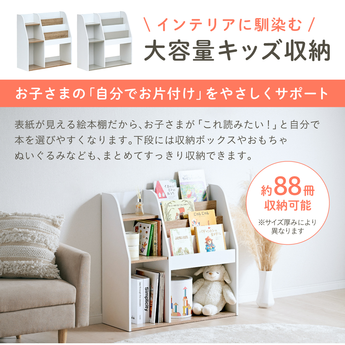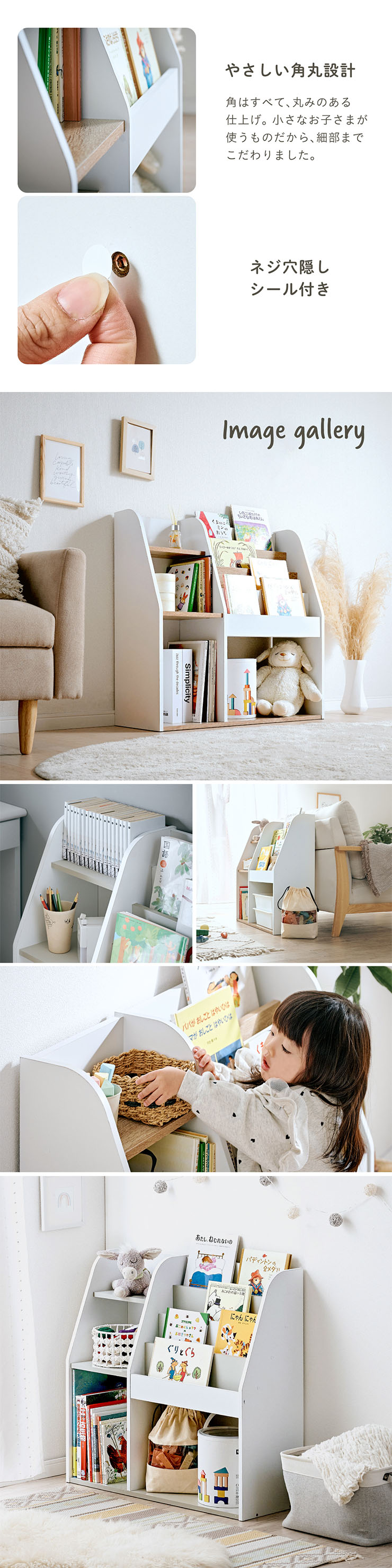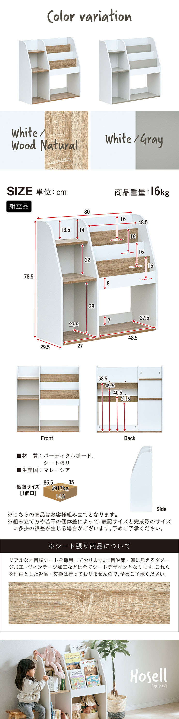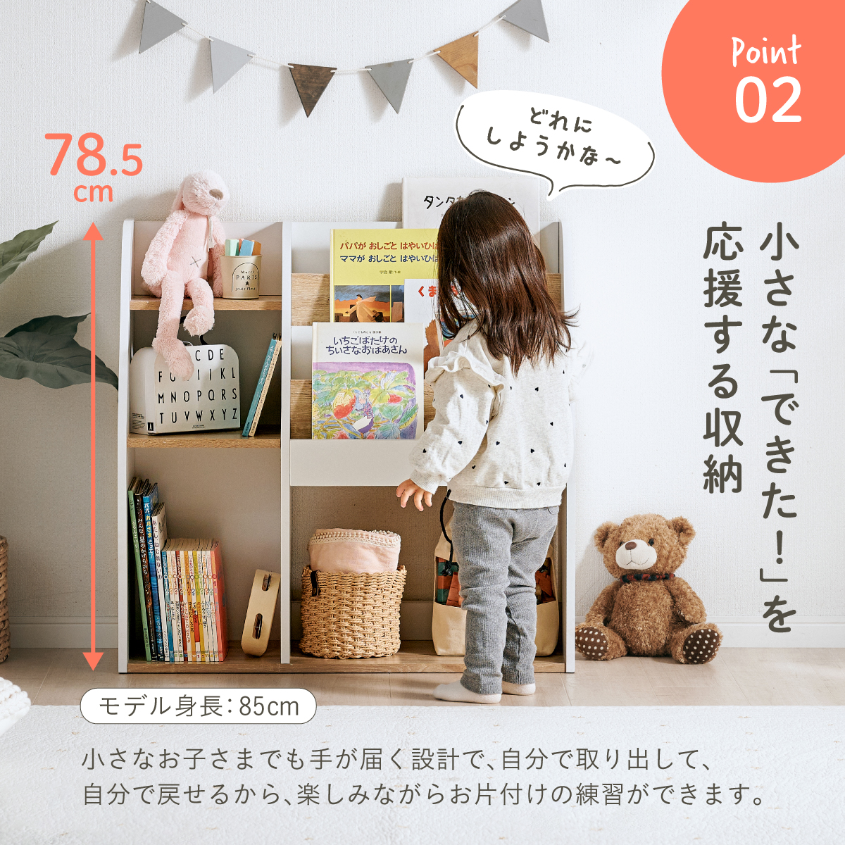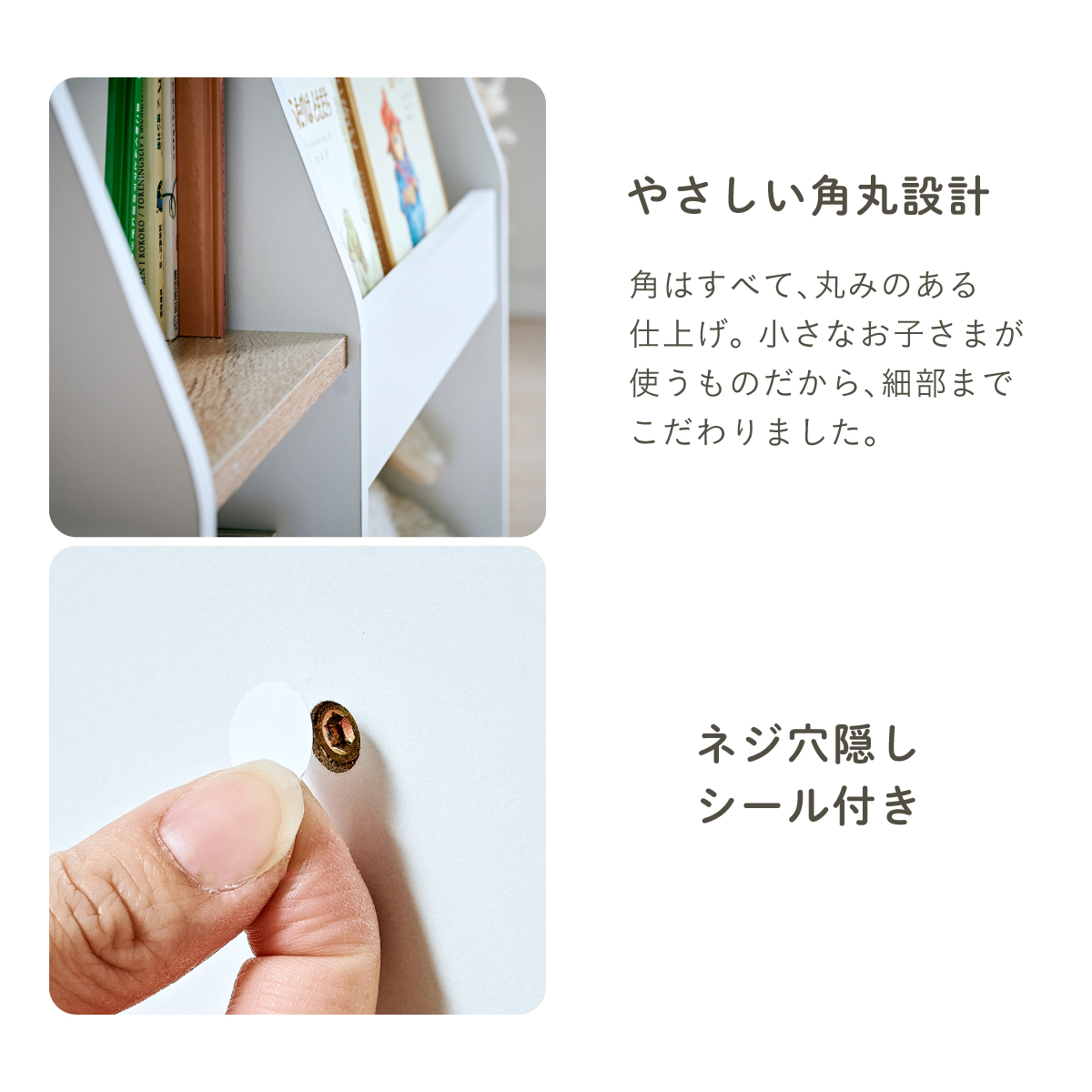 | "自分で選ぶ"がはじまる はじめての絵本棚 Hosell(ホセル) インテリアに馴染む大容量キッズ収納 表紙が見える絵本棚 お片付けの習慣化に ■読みたいがすぐ見つかる よく読む絵本や大好きな一冊は、表紙をよく見せて、いつも目に入る場所へ。 余裕のある奥行きで分厚い本や図鑑等も収納できます。 上段も底を高くしているので、後ろの本でも表紙が隠れずに見えます。 ■小さな"できた"を応援する収納 小さなお子さまでも手が届く設計で、自分で取り出して自分で戻せるから、楽しみながらお片付けの練習ができます。 見やすく、取りやすく、しまいやすい。子供の自主性をやさしくサポートします。 ■ワイド収納 絵本ラックの下は大きなおもちゃやぬいぐるみも、ゆったり入るワイド設計 ■"見せる"と"しまう"を両立するオープンシェルフ 上段は小物や文具のディスプレイに。 下段は大きめの絵本をすっきり収められる設計です。 (小学館NEO図鑑収納可) 左上段には小物やおもちゃを飾ったり、小さめの絵本を収納できます。 見た目以上の収納力でたくさんの絵本もすっきり収まります。 ※収納冊数は本のサイズ・厚みにより異なります。 ■お部屋のテイストに合わせて選べる2カラー ナチュラル木目が空間にあたたかみをプラスするホワイト/ウッドナチュラル 落ち着きのあるグレーカラーで上品な空間を演出するホワイト/グレー 絵本棚スペースの中央パネル3枚の板は自由に組み替え可能。 自分好みにデザインすることができます。 ■Living・Dining ソファやリビングの一角にすっきり設置。 家族の目が届く場所に置けるから、読み聞かせもお片付けも、安心して見守れます。 ■Kids Room キッズルームにもちょうどいいサイズ感 圧迫感なく置けて、お部屋をすっきり整えます。 ■Desk Side 下段スペースにはランドセルもすっきり収納。 教科書やドリルも立てて収納でき、入学後もそのまま活躍します。 ■やさしい角丸設計 角はすべて、丸みのある仕上げ。 小さなお子さまが使うものだから、細部までやさしさにこだわりました。 ※こちらの商品はお客様組み立てとなります。 ※組み立て方や若干の個体差によって、表記サイズと完成形のサイズに多少の誤差が生じる場合がございます。予めご了承ください。 | |