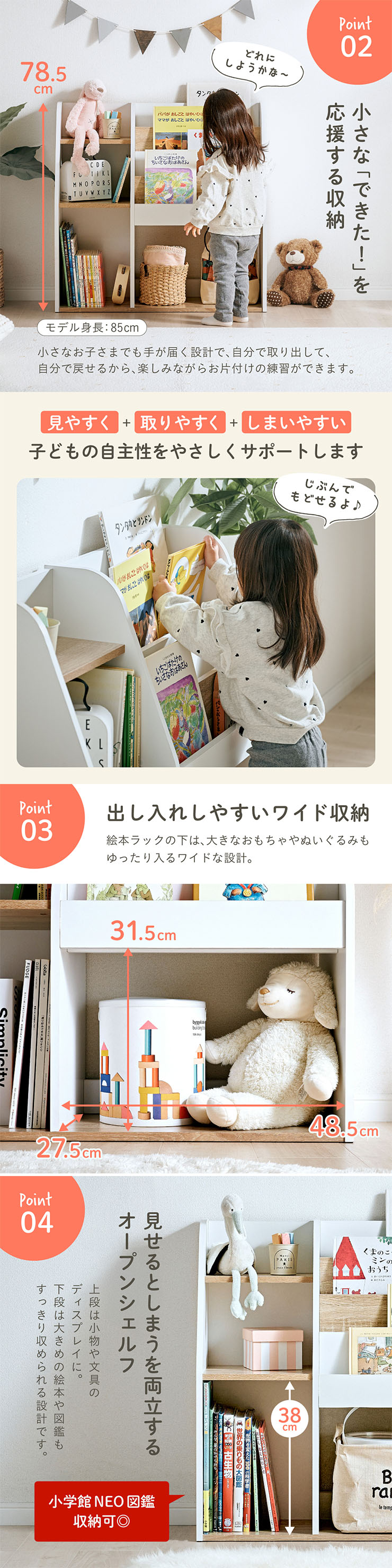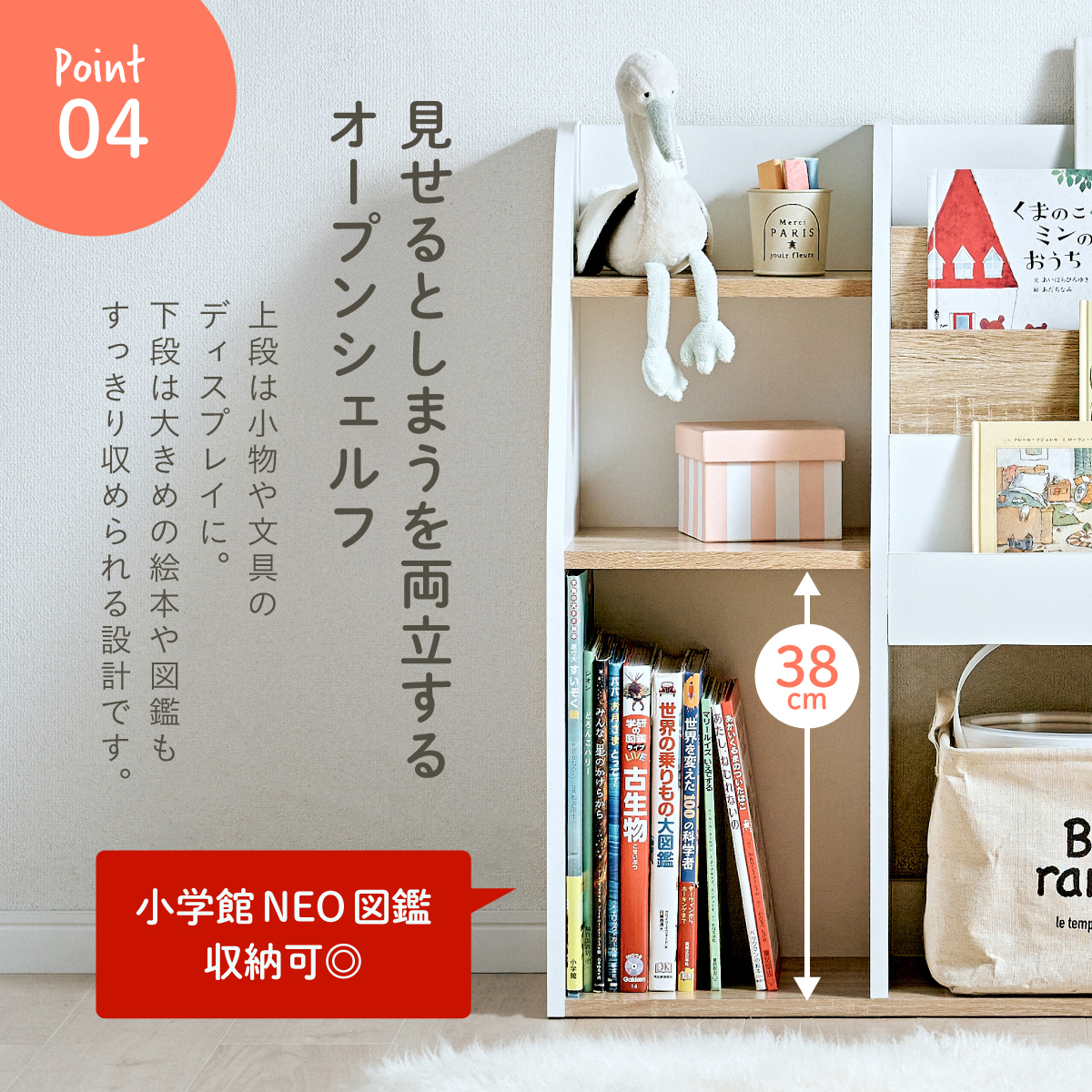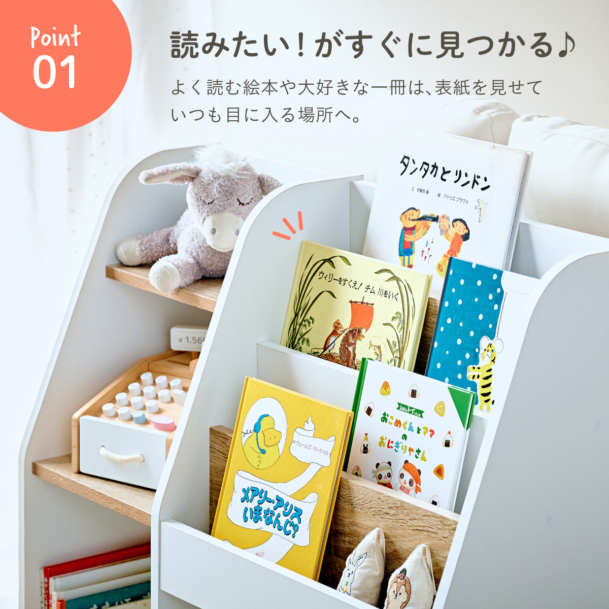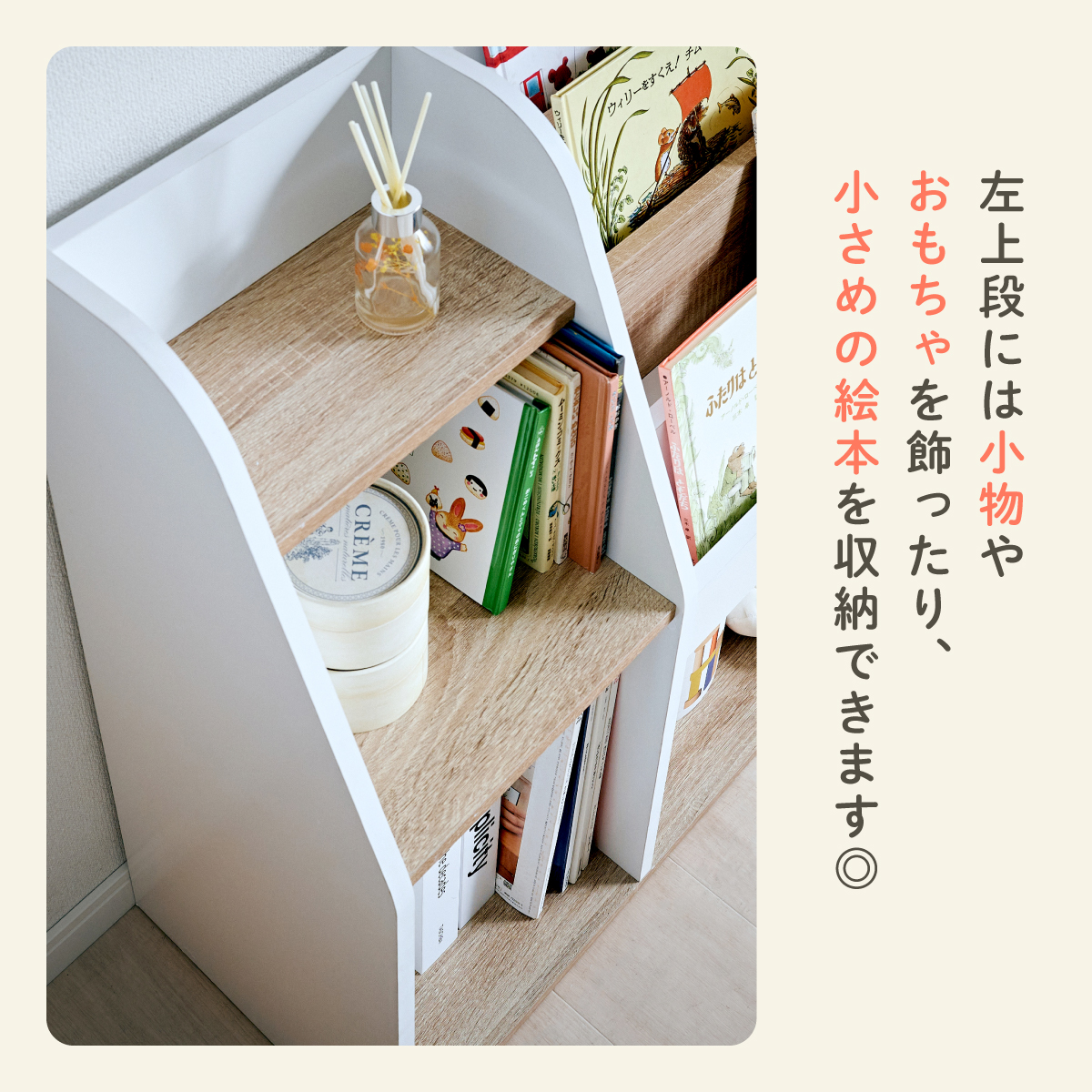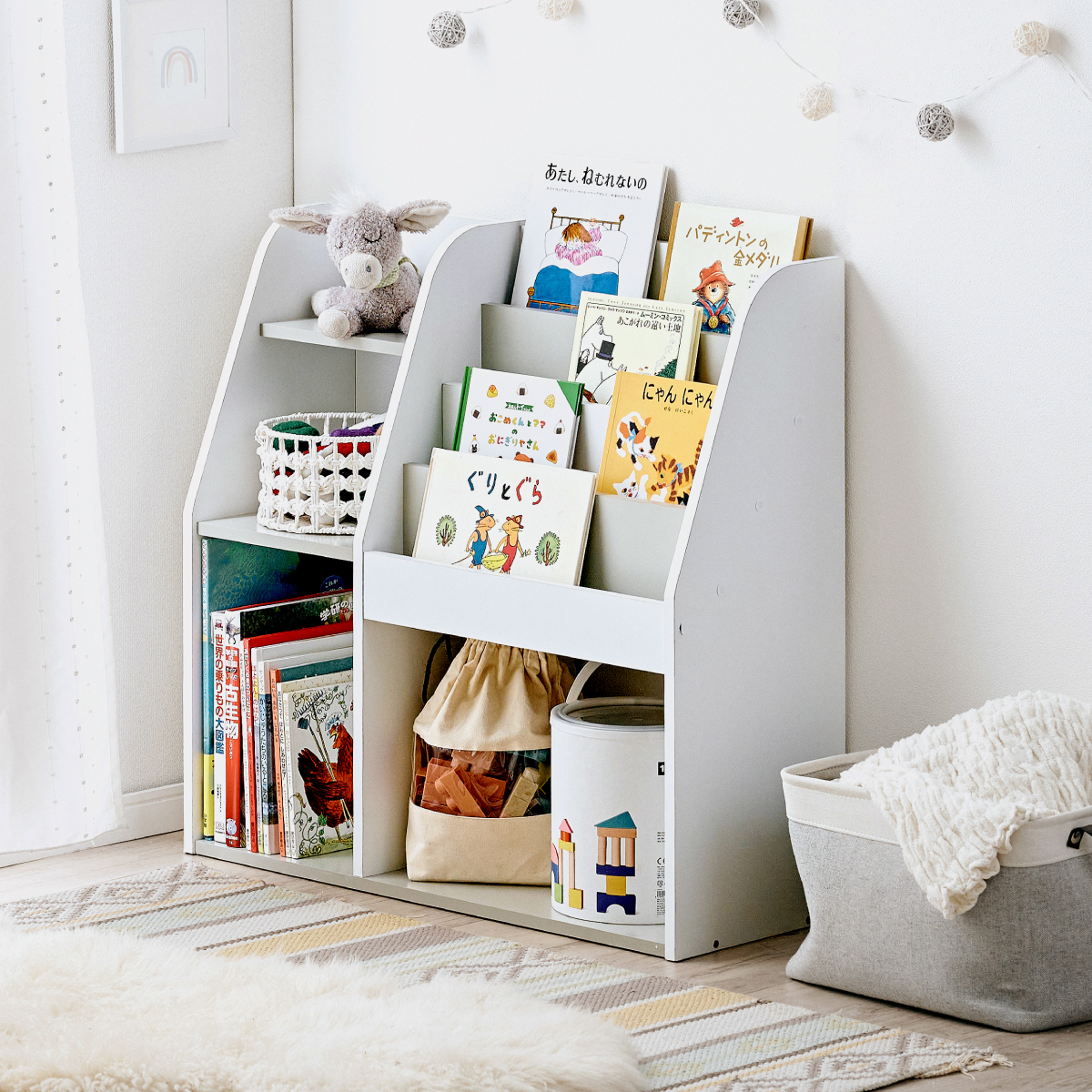 | "自分で選ぶ"がはじまる はじめての絵本棚 Hosell(ホセル) インテリアに馴染む大容量キッズ収納 表紙が見える絵本棚 お片付けの習慣化に ■読みたいがすぐ見つかる よく読む絵本や大好きな一冊は、表紙をよく見せて、いつも目に入る場所へ。 余裕のある奥行きで分厚い本や図鑑等も収納できます。 上段も底を高くしているので、後ろの本でも表紙が隠れずに見えます。 ■小さな"できた"を応援する収納 小さなお子さまでも手が届く設計で、自分で取り出して自分で戻せるから、楽しみながらお片付けの練習ができます。 見やすく、取りやすく、しまいやすい。子供の自主性をやさしくサポートします。 ■ワイド収納 絵本ラックの下は大きなおもちゃやぬいぐるみも、ゆったり入るワイド設計 ■"見せる"と"しまう"を両立するオープンシェルフ 上段は小物や文具のディスプレイに。 下段は大きめの絵本をすっきり収められる設計です。 (小学館NEO図鑑収納可) 左上段には小物やおもちゃを飾ったり、小さめの絵本を収納できます。 見た目以上の収納力でたくさんの絵本もすっきり収まります。 ※収納冊数は本のサイズ・厚みにより異なります。 ■お部屋のテイストに合わせて選べる2カラー ナチュラル木目が空間にあたたかみをプラスするホワイト/ウッドナチュラル 落ち着きのあるグレーカラーで上品な空間を演出するホワイト/グレー 絵本棚スペースの中央パネル3枚の板は自由に組み替え可能。 自分好みにデザインすることができます。 ■Living・Dining ソファやリビングの一角にすっきり設置。 家族の目が届く場所に置けるから、読み聞かせもお片付けも、安心して見守れます。 ■Kids Room キッズルームにもちょうどいいサイズ感 圧迫感なく置けて、お部屋をすっきり整えます。 ■Desk Side 下段スペースにはランドセルもすっきり収納。 教科書やドリルも立てて収納でき、入学後もそのまま活躍します。 ■やさしい角丸設計 角はすべて、丸みのある仕上げ。 小さなお子さまが使うものだから、細部までやさしさにこだわりました。 ※こちらの商品はお客様組み立てとなります。 ※組み立て方や若干の個体差によって、表記サイズと完成形のサイズに多少の誤差が生じる場合がございます。予めご了承ください。 | |