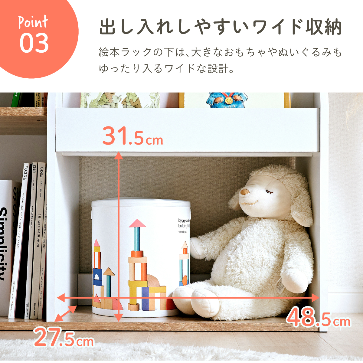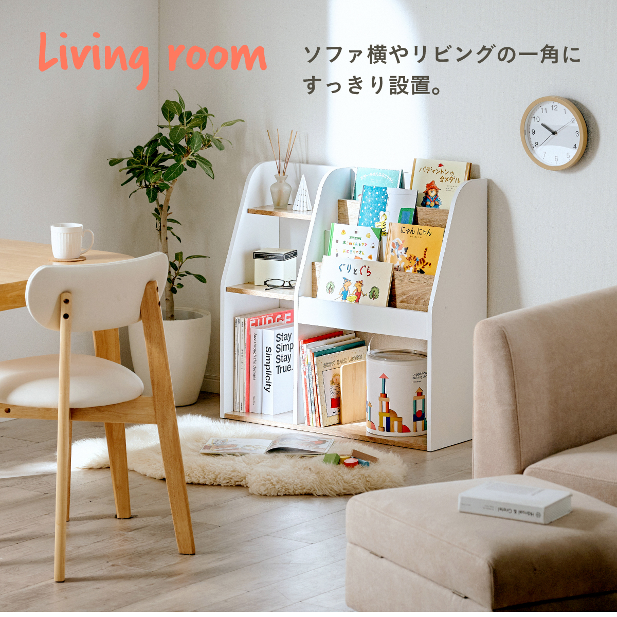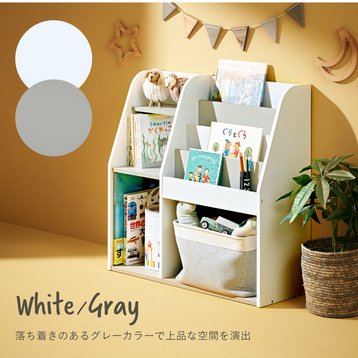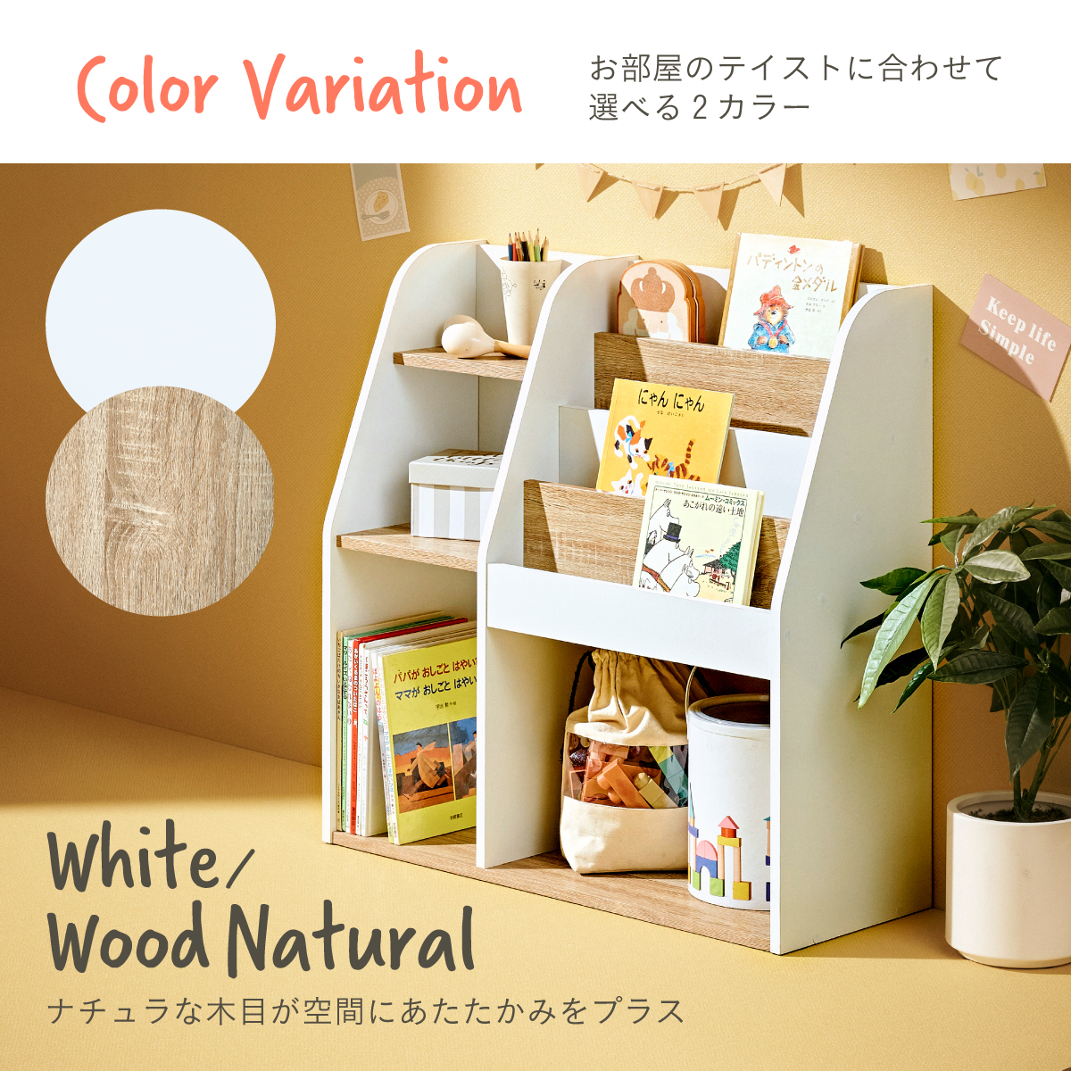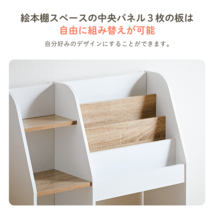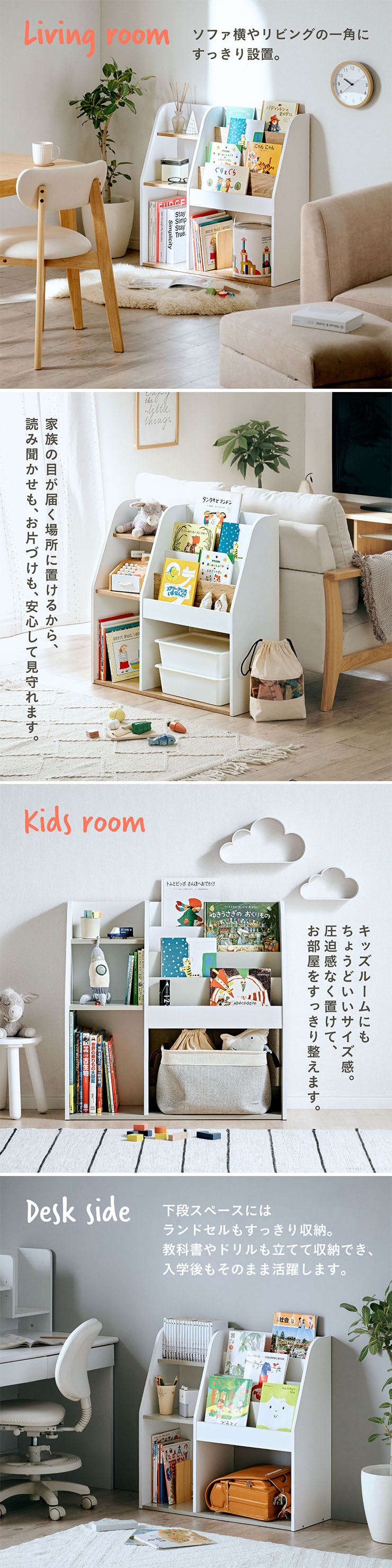 | "自分で選ぶ"がはじまる はじめての絵本棚 Hosell(ホセル) インテリアに馴染む大容量キッズ収納 表紙が見える絵本棚 お片付けの習慣化に ■読みたいがすぐ見つかる よく読む絵本や大好きな一冊は、表紙をよく見せて、いつも目に入る場所へ。 余裕のある奥行きで分厚い本や図鑑等も収納できます。 上段も底を高くしているので、後ろの本でも表紙が隠れずに見えます。 ■小さな"できた"を応援する収納 小さなお子さまでも手が届く設計で、自分で取り出して自分で戻せるから、楽しみながらお片付けの練習ができます。 見やすく、取りやすく、しまいやすい。子供の自主性をやさしくサポートします。 ■ワイド収納 絵本ラックの下は大きなおもちゃやぬいぐるみも、ゆったり入るワイド設計 ■"見せる"と"しまう"を両立するオープンシェルフ 上段は小物や文具のディスプレイに。 下段は大きめの絵本をすっきり収められる設計です。 (小学館NEO図鑑収納可) 左上段には小物やおもちゃを飾ったり、小さめの絵本を収納できます。 見た目以上の収納力でたくさんの絵本もすっきり収まります。 ※収納冊数は本のサイズ・厚みにより異なります。 ■お部屋のテイストに合わせて選べる2カラー ナチュラル木目が空間にあたたかみをプラスするホワイト/ウッドナチュラル 落ち着きのあるグレーカラーで上品な空間を演出するホワイト/グレー 絵本棚スペースの中央パネル3枚の板は自由に組み替え可能。 自分好みにデザインすることができます。 ■Living・Dining ソファやリビングの一角にすっきり設置。 家族の目が届く場所に置けるから、読み聞かせもお片付けも、安心して見守れます。 ■Kids Room キッズルームにもちょうどいいサイズ感 圧迫感なく置けて、お部屋をすっきり整えます。 ■Desk Side 下段スペースにはランドセルもすっきり収納。 教科書やドリルも立てて収納でき、入学後もそのまま活躍します。 ■やさしい角丸設計 角はすべて、丸みのある仕上げ。 小さなお子さまが使うものだから、細部までやさしさにこだわりました。 ※こちらの商品はお客様組み立てとなります。 ※組み立て方や若干の個体差によって、表記サイズと完成形のサイズに多少の誤差が生じる場合がございます。予めご了承ください。 | |