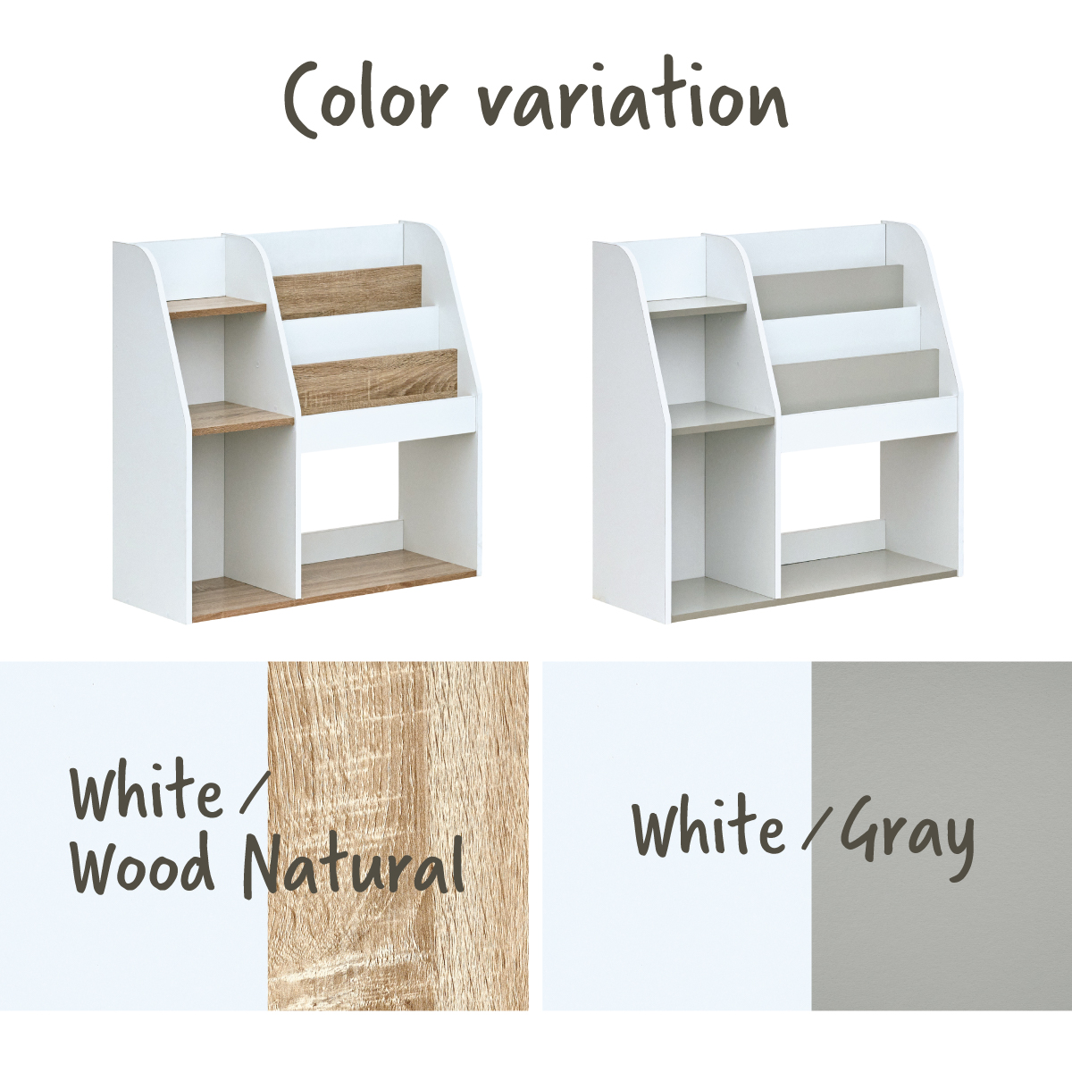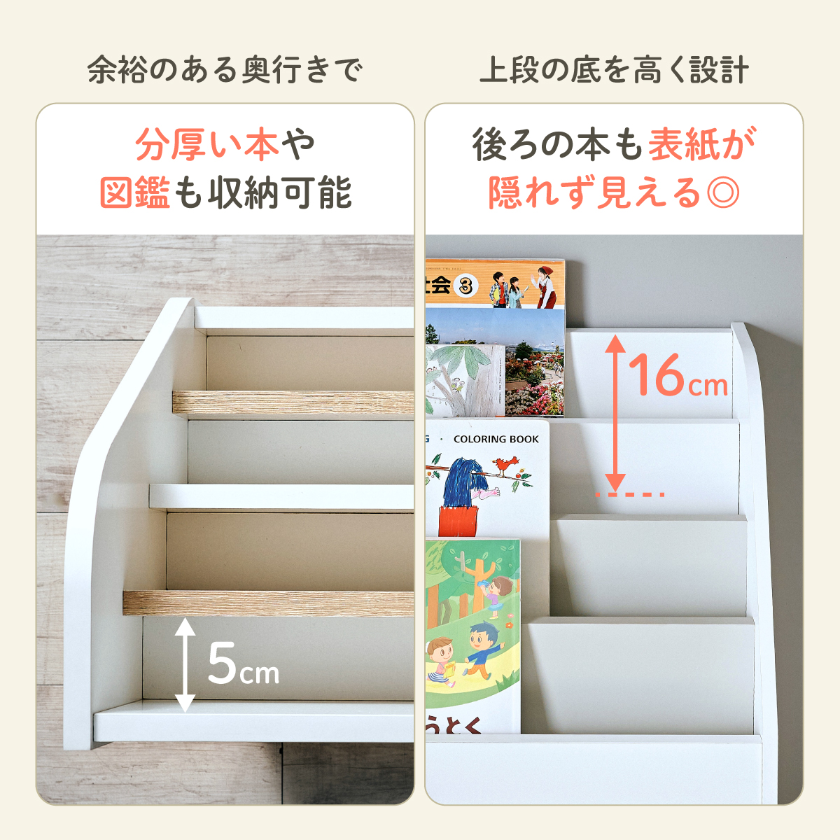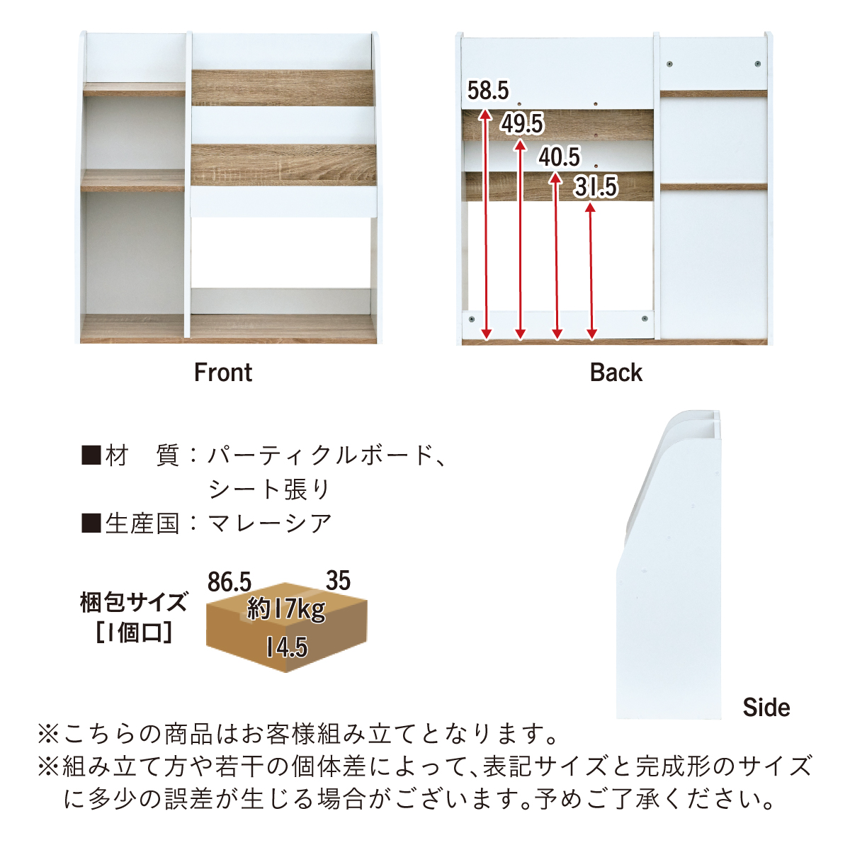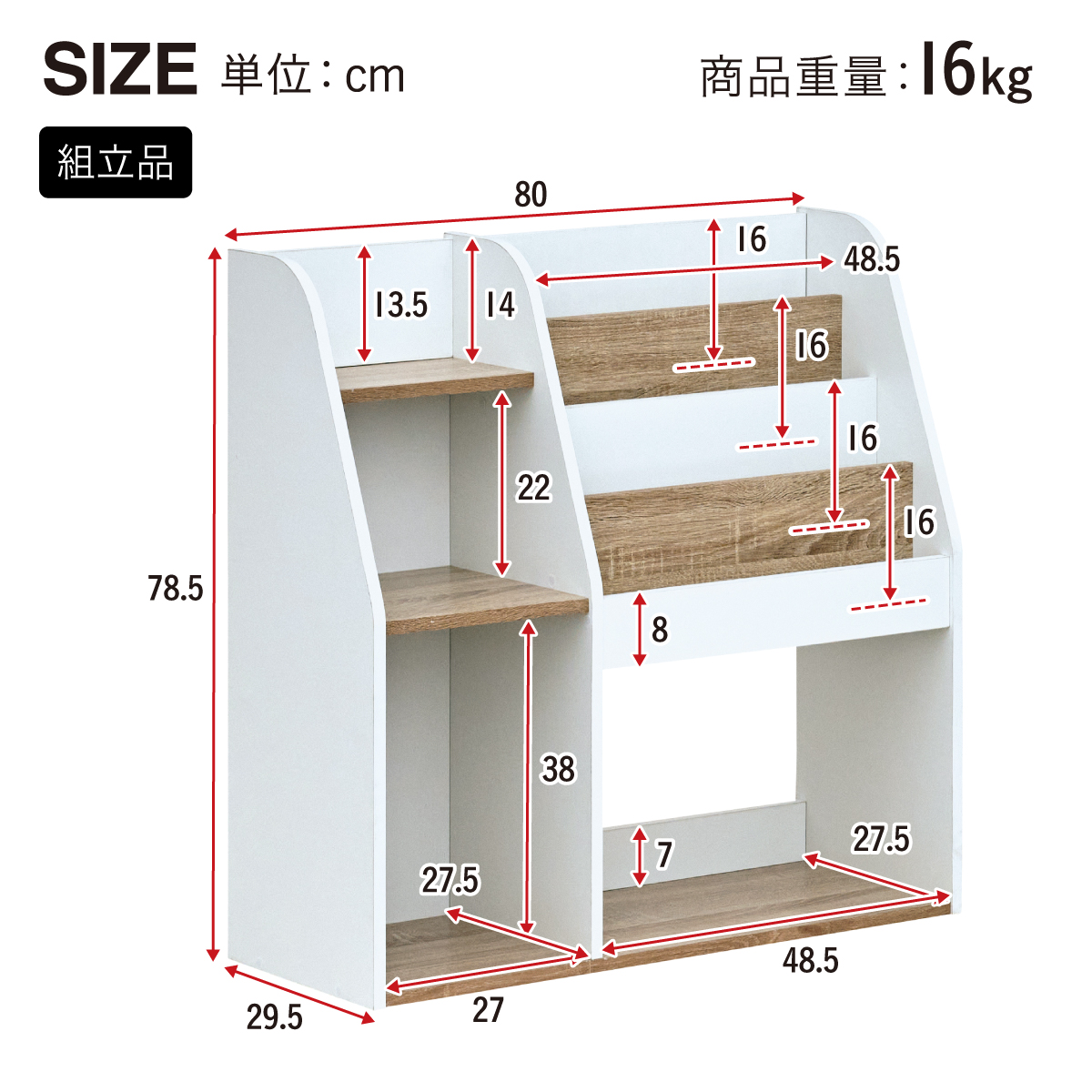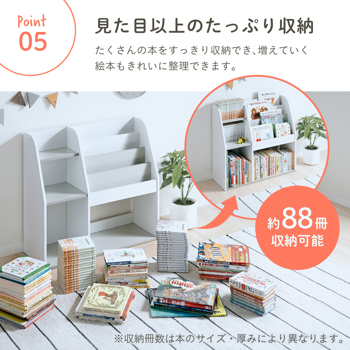| "自分で選ぶ"がはじまる はじめての絵本棚 Hosell(ホセル) インテリアに馴染む大容量キッズ収納 表紙が見える絵本棚 お片付けの習慣化に ■読みたいがすぐ見つかる よく読む絵本や大好きな一冊は、表紙をよく見せて、いつも目に入る場所へ。 余裕のある奥行きで分厚い本や図鑑等も収納できます。 上段も底を高くしているので、後ろの本でも表紙が隠れずに見えます。 ■小さな"できた"を応援する収納 小さなお子さまでも手が届く設計で、自分で取り出して自分で戻せるから、楽しみながらお片付けの練習ができます。 見やすく、取りやすく、しまいやすい。子供の自主性をやさしくサポートします。 ■ワイド収納 絵本ラックの下は大きなおもちゃやぬいぐるみも、ゆったり入るワイド設計 ■"見せる"と"しまう"を両立するオープンシェルフ 上段は小物や文具のディスプレイに。 下段は大きめの絵本をすっきり収められる設計です。 (小学館NEO図鑑収納可) 左上段には小物やおもちゃを飾ったり、小さめの絵本を収納できます。 見た目以上の収納力でたくさんの絵本もすっきり収まります。 ※収納冊数は本のサイズ・厚みにより異なります。 ■お部屋のテイストに合わせて選べる2カラー ナチュラル木目が空間にあたたかみをプラスするホワイト/ウッドナチュラル 落ち着きのあるグレーカラーで上品な空間を演出するホワイト/グレー 絵本棚スペースの中央パネル3枚の板は自由に組み替え可能。 自分好みにデザインすることができます。 ■Living・Dining ソファやリビングの一角にすっきり設置。 家族の目が届く場所に置けるから、読み聞かせもお片付けも、安心して見守れます。 ■Kids Room キッズルームにもちょうどいいサイズ感 圧迫感なく置けて、お部屋をすっきり整えます。 ■Desk Side 下段スペースにはランドセルもすっきり収納。 教科書やドリルも立てて収納でき、入学後もそのまま活躍します。 ■やさしい角丸設計 角はすべて、丸みのある仕上げ。 小さなお子さまが使うものだから、細部までやさしさにこだわりました。 ※こちらの商品はお客様組み立てとなります。 ※組み立て方や若干の個体差によって、表記サイズと完成形のサイズに多少の誤差が生じる場合がございます。予めご了承ください。 | |