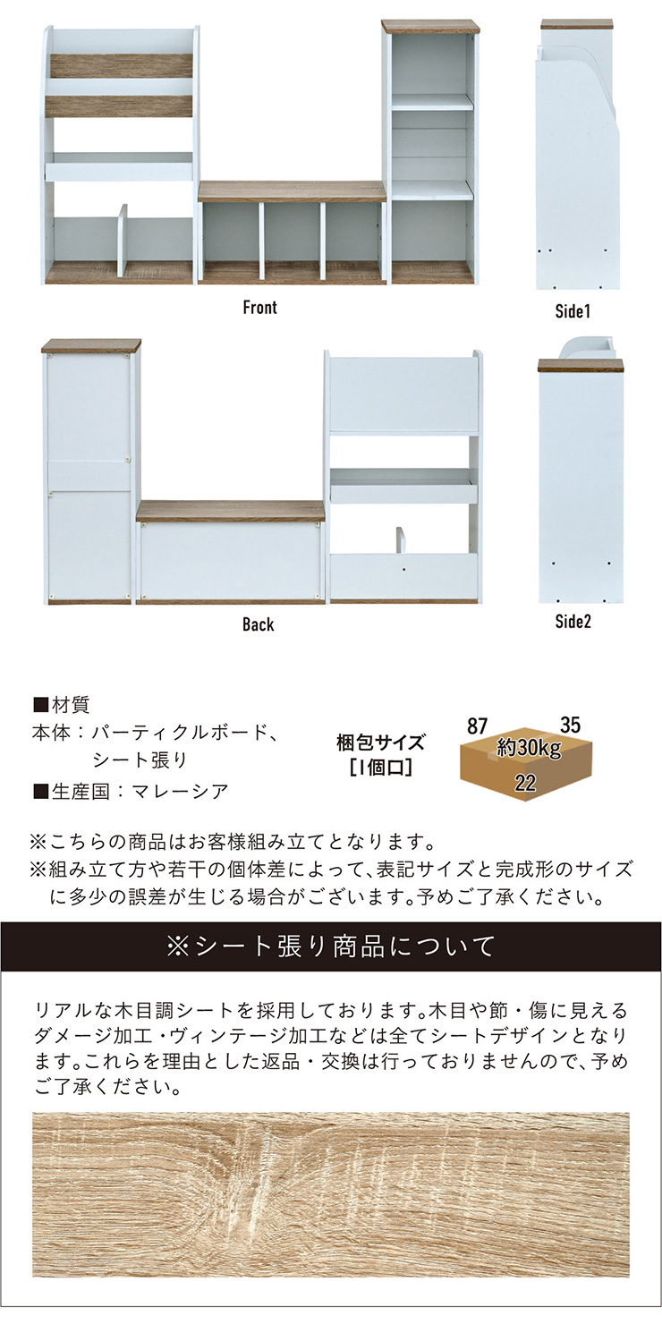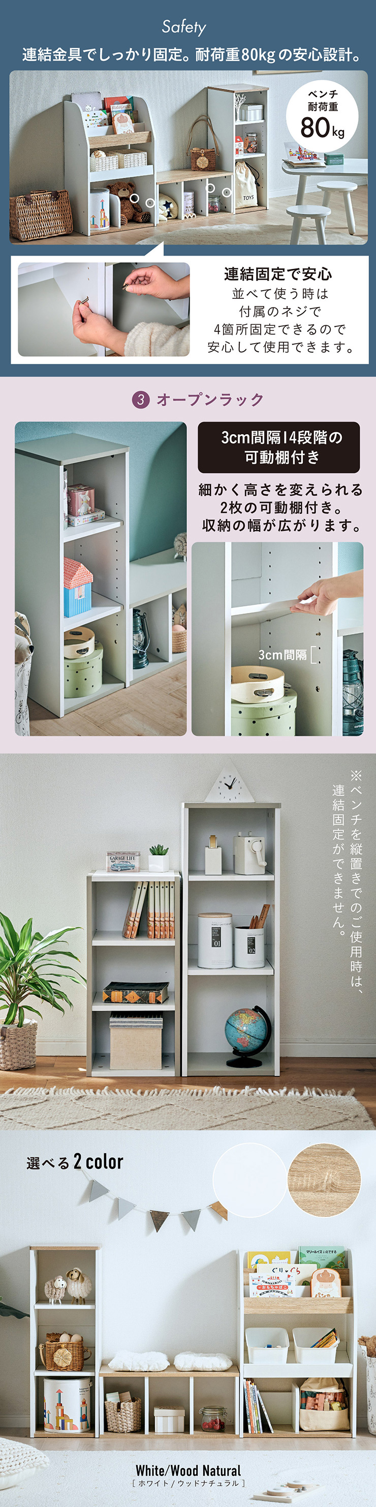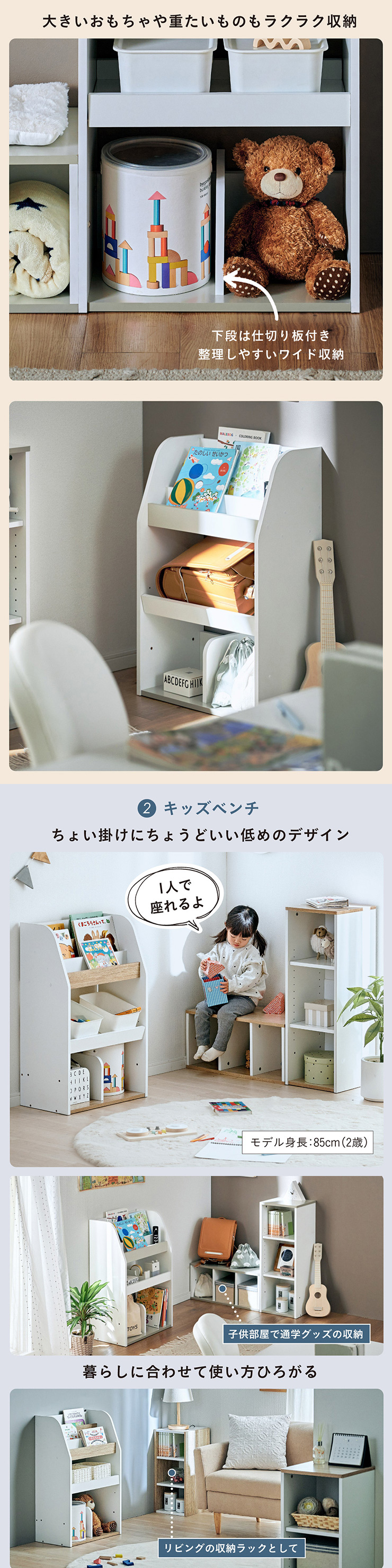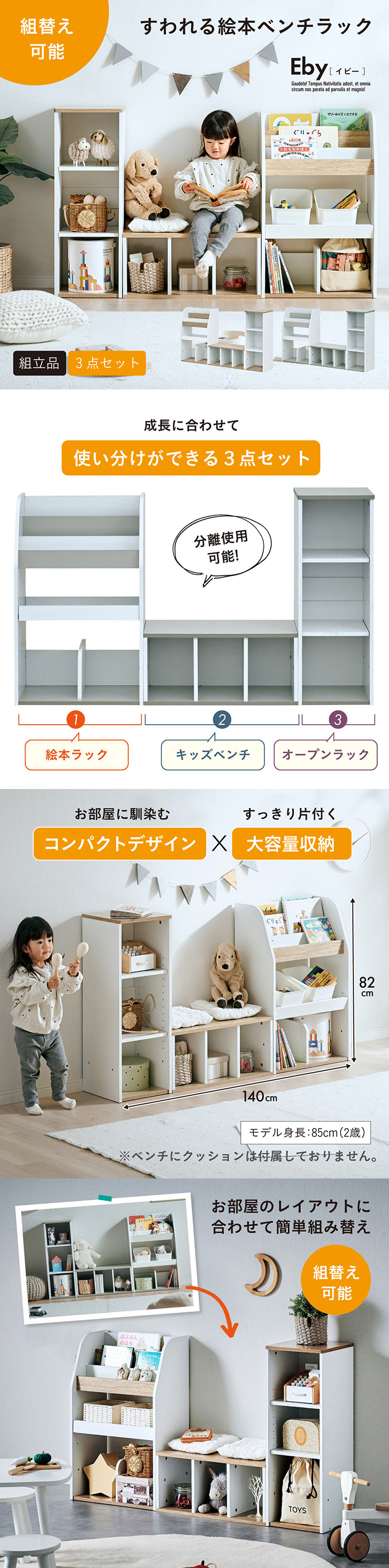 | すわれる絵本ベンチラック Eby(イビー) 成長に合わせて使い分けができる3点セット 絵本ラック・キッズベンチ・オープンラック お部屋に馴染むコンパクトデザイン すっきり片付く大容量収納 ■組み替え可能 お部屋のレイアウトに合わせて簡単組み立て ■分割仕様 分けて使えば場所を選ばずリビングにもやさしくなじむ絵本ラック ■絵本ラック 読みたい絵本がすぐに見つかる3段の絵本立て 表紙が見えるから、楽しく絵本を選ぶことができます。 前板の高さが異なるためさまざまなサイズの絵本の収納が可能です。 大きいおもちゃや重たいものもラクラク収納 下段は仕切り板付き・整理しやすいワイド収納 ■キッズベンチ ちょい掛けにちょうどいい低めのデザイン ■暮らしに合わせて使い方広がる 子供部屋で通学グッズの収納 リビングの収納ラックとして ■Safety 連結金具でしっかり固定。耐荷重80kkgの安心設計。 ■オープンラック 細かく高さを変えられる3cm間隔14段階の2枚の可動棚付き。 収納の幅が広がります。 ■商品詳細 ネジ穴隠しシール付き 床を傷つけにくいフェルト付き ※こちらの商品はお客様組み立てとなります。 ※ベンチを縦置きでのご使用時は連結固定ができません。 ※組み立て方や若干の個体差によって、表記サイズと完成形のサイズに多少の誤差が生じる場合がございます。予めご了承ください。 | |