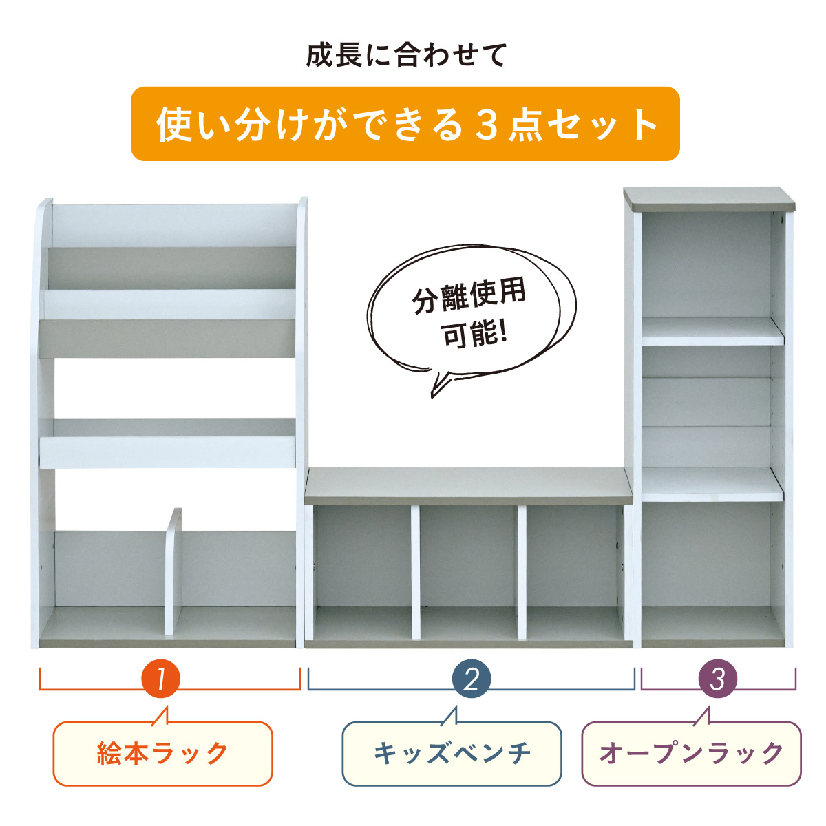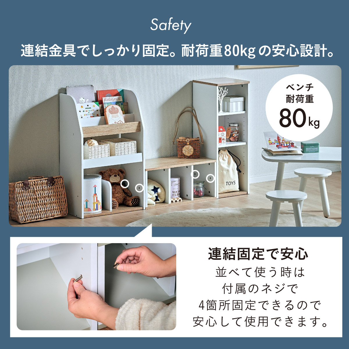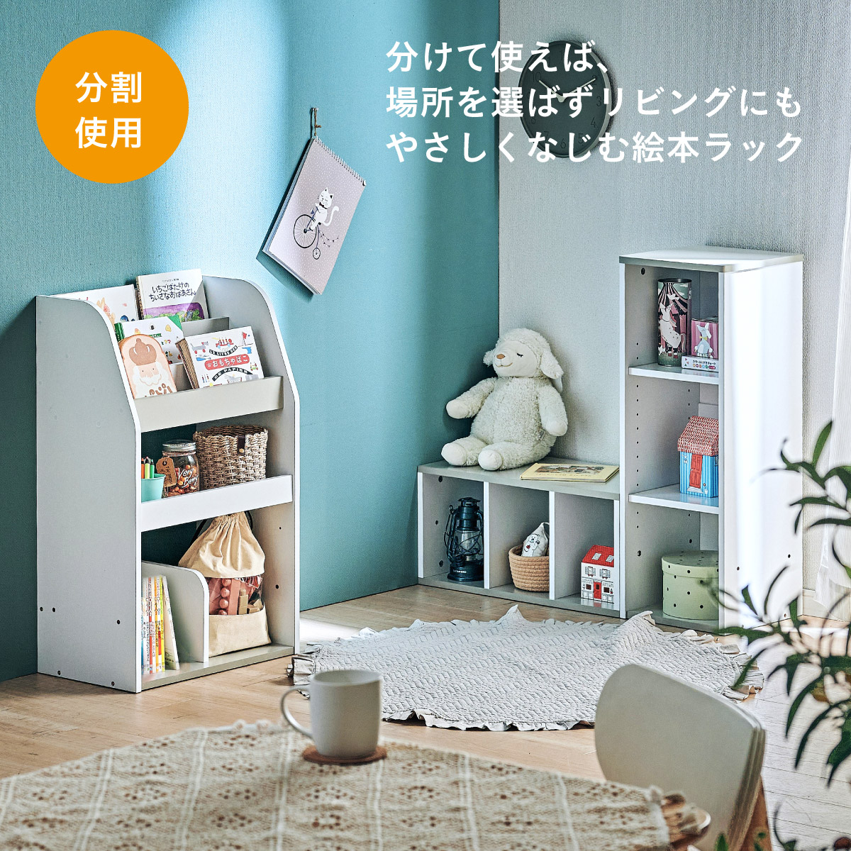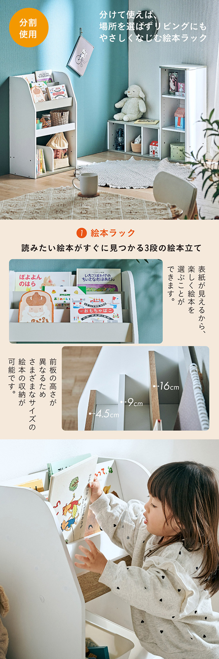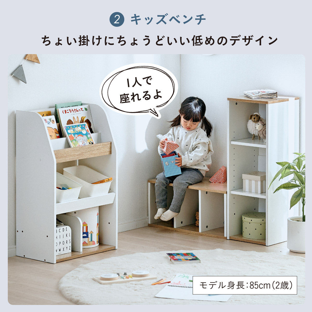 | すわれる絵本ベンチラック Eby(イビー) 成長に合わせて使い分けができる3点セット 絵本ラック・キッズベンチ・オープンラック お部屋に馴染むコンパクトデザイン すっきり片付く大容量収納 ■組み替え可能 お部屋のレイアウトに合わせて簡単組み立て ■分割仕様 分けて使えば場所を選ばずリビングにもやさしくなじむ絵本ラック ■絵本ラック 読みたい絵本がすぐに見つかる3段の絵本立て 表紙が見えるから、楽しく絵本を選ぶことができます。 前板の高さが異なるためさまざまなサイズの絵本の収納が可能です。 大きいおもちゃや重たいものもラクラク収納 下段は仕切り板付き・整理しやすいワイド収納 ■キッズベンチ ちょい掛けにちょうどいい低めのデザイン ■暮らしに合わせて使い方広がる 子供部屋で通学グッズの収納 リビングの収納ラックとして ■Safety 連結金具でしっかり固定。耐荷重80kkgの安心設計。 ■オープンラック 細かく高さを変えられる3cm間隔14段階の2枚の可動棚付き。 収納の幅が広がります。 ■商品詳細 ネジ穴隠しシール付き 床を傷つけにくいフェルト付き ※こちらの商品はお客様組み立てとなります。 ※ベンチを縦置きでのご使用時は連結固定ができません。 ※組み立て方や若干の個体差によって、表記サイズと完成形のサイズに多少の誤差が生じる場合がございます。予めご了承ください。 | |