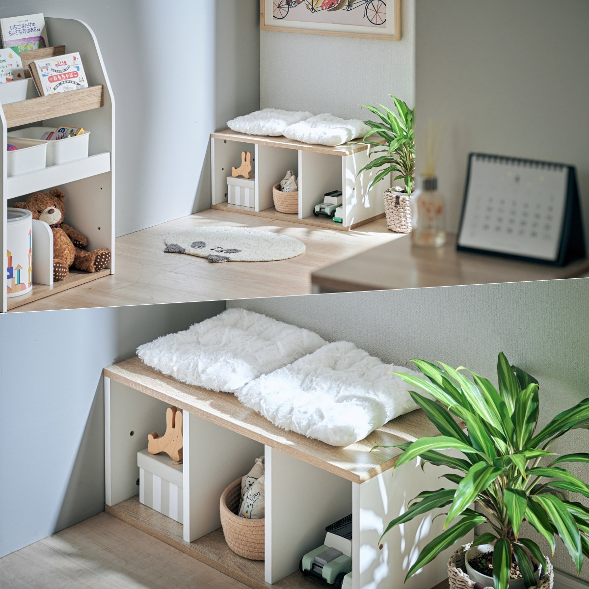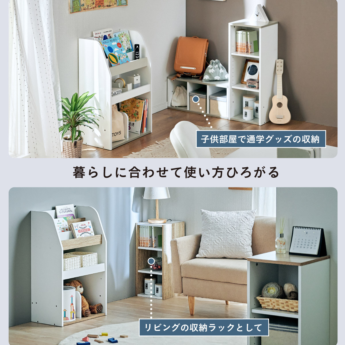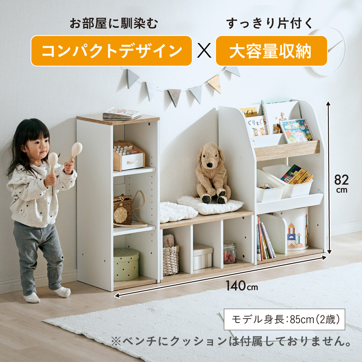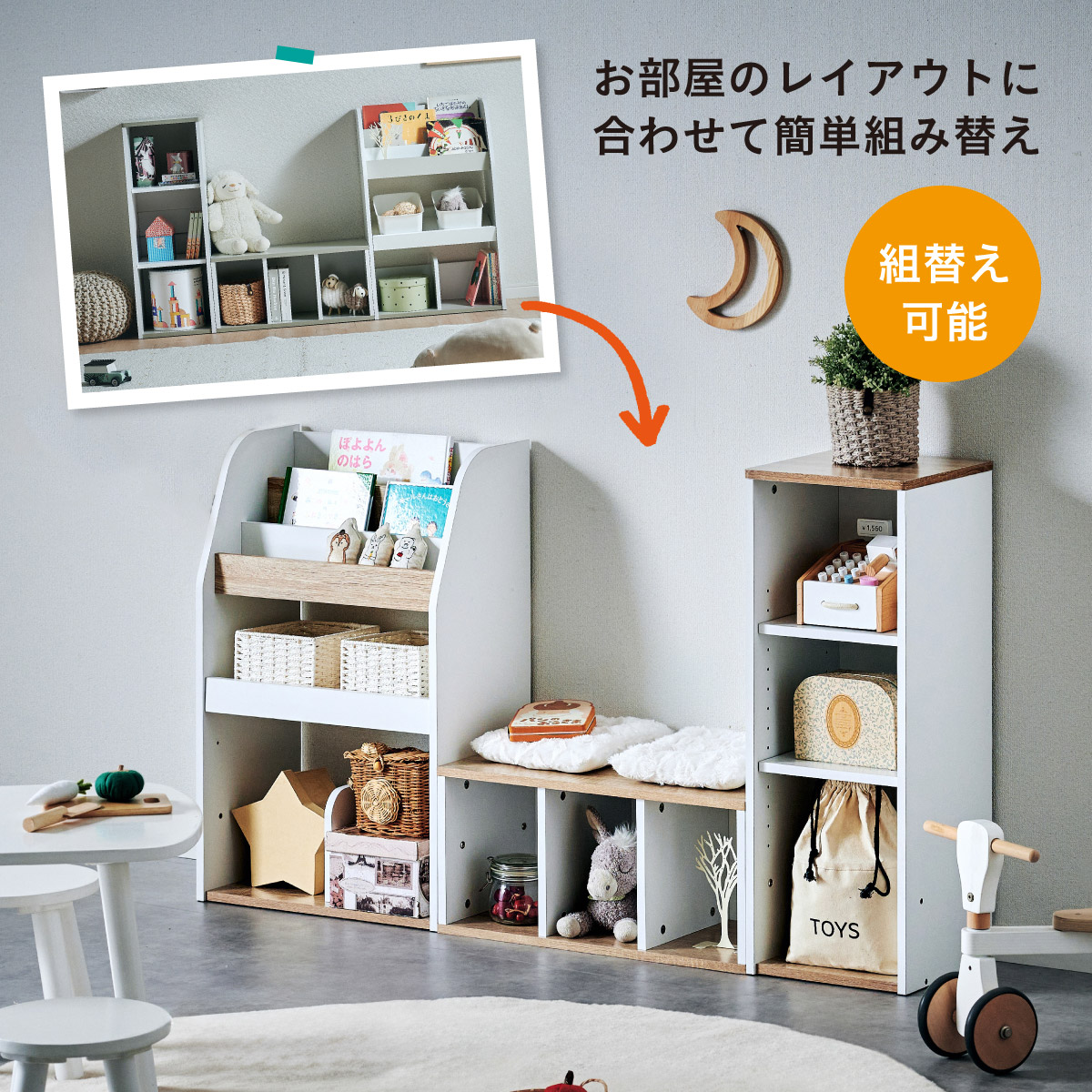 | すわれる絵本ベンチラック Eby(イビー) 成長に合わせて使い分けができる3点セット 絵本ラック・キッズベンチ・オープンラック お部屋に馴染むコンパクトデザイン すっきり片付く大容量収納 ■組み替え可能 お部屋のレイアウトに合わせて簡単組み立て ■分割仕様 分けて使えば場所を選ばずリビングにもやさしくなじむ絵本ラック ■絵本ラック 読みたい絵本がすぐに見つかる3段の絵本立て 表紙が見えるから、楽しく絵本を選ぶことができます。 前板の高さが異なるためさまざまなサイズの絵本の収納が可能です。 大きいおもちゃや重たいものもラクラク収納 下段は仕切り板付き・整理しやすいワイド収納 ■キッズベンチ ちょい掛けにちょうどいい低めのデザイン ■暮らしに合わせて使い方広がる 子供部屋で通学グッズの収納 リビングの収納ラックとして ■Safety 連結金具でしっかり固定。耐荷重80kkgの安心設計。 ■オープンラック 細かく高さを変えられる3cm間隔14段階の2枚の可動棚付き。 収納の幅が広がります。 ■商品詳細 ネジ穴隠しシール付き 床を傷つけにくいフェルト付き ※こちらの商品はお客様組み立てとなります。 ※ベンチを縦置きでのご使用時は連結固定ができません。 ※組み立て方や若干の個体差によって、表記サイズと完成形のサイズに多少の誤差が生じる場合がございます。予めご了承ください。 | |