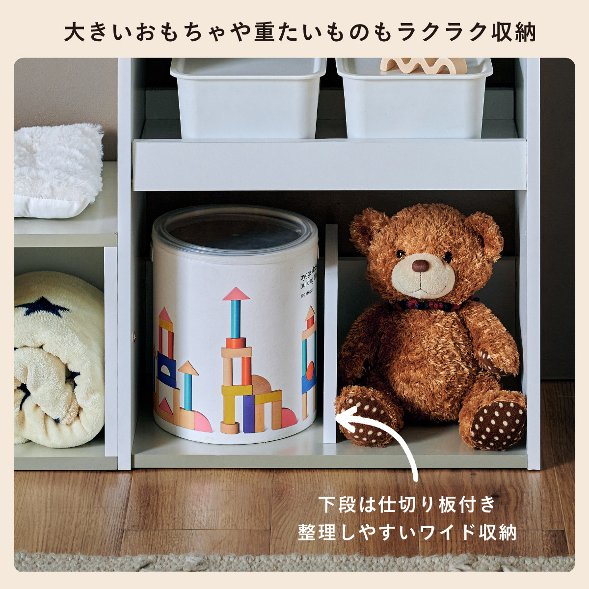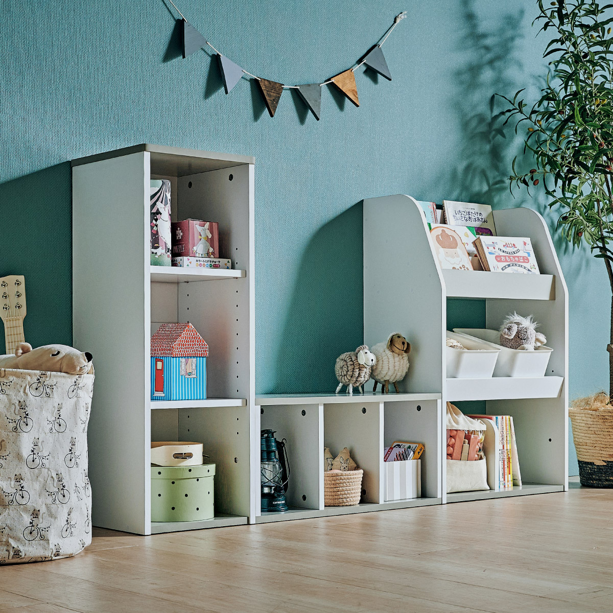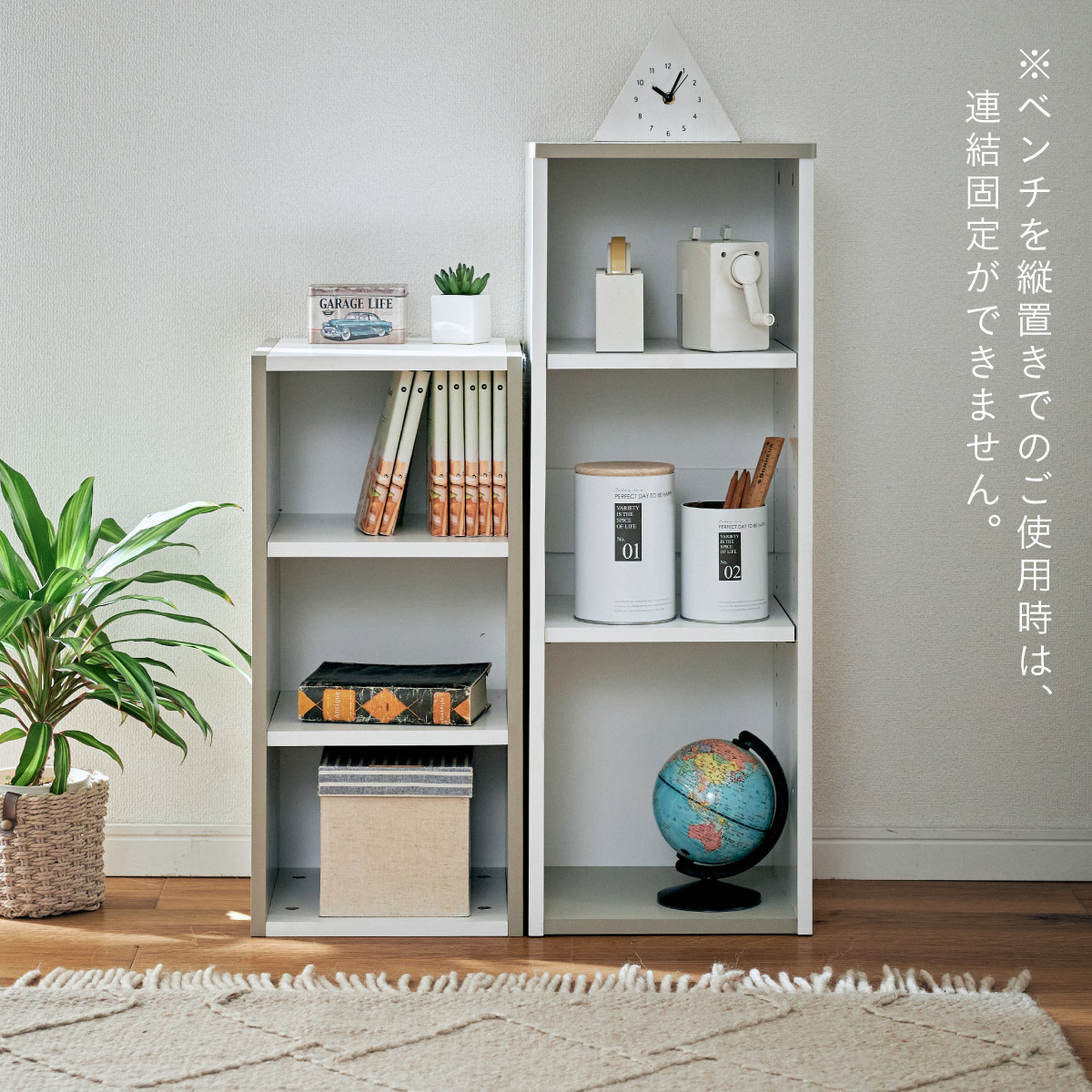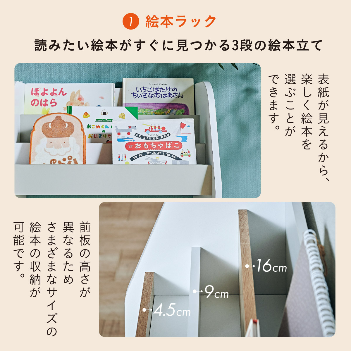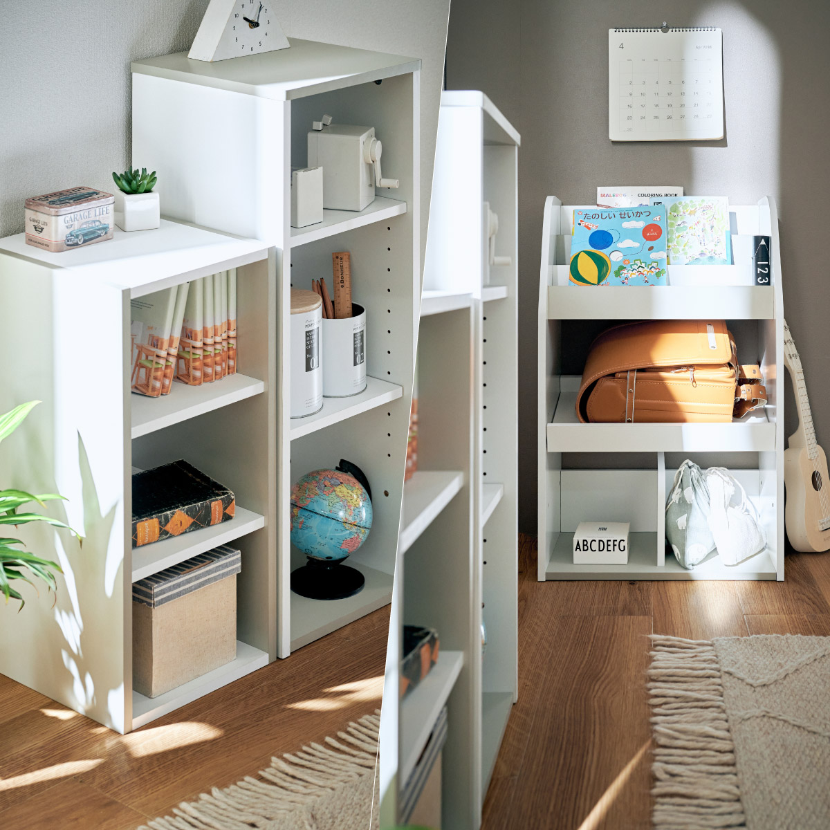 | すわれる絵本ベンチラック Eby(イビー) 成長に合わせて使い分けができる3点セット 絵本ラック・キッズベンチ・オープンラック お部屋に馴染むコンパクトデザイン すっきり片付く大容量収納 ■組み替え可能 お部屋のレイアウトに合わせて簡単組み立て ■分割仕様 分けて使えば場所を選ばずリビングにもやさしくなじむ絵本ラック ■絵本ラック 読みたい絵本がすぐに見つかる3段の絵本立て 表紙が見えるから、楽しく絵本を選ぶことができます。 前板の高さが異なるためさまざまなサイズの絵本の収納が可能です。 大きいおもちゃや重たいものもラクラク収納 下段は仕切り板付き・整理しやすいワイド収納 ■キッズベンチ ちょい掛けにちょうどいい低めのデザイン ■暮らしに合わせて使い方広がる 子供部屋で通学グッズの収納 リビングの収納ラックとして ■Safety 連結金具でしっかり固定。耐荷重80kkgの安心設計。 ■オープンラック 細かく高さを変えられる3cm間隔14段階の2枚の可動棚付き。 収納の幅が広がります。 ■商品詳細 ネジ穴隠しシール付き 床を傷つけにくいフェルト付き ※こちらの商品はお客様組み立てとなります。 ※ベンチを縦置きでのご使用時は連結固定ができません。 ※組み立て方や若干の個体差によって、表記サイズと完成形のサイズに多少の誤差が生じる場合がございます。予めご了承ください。 | |