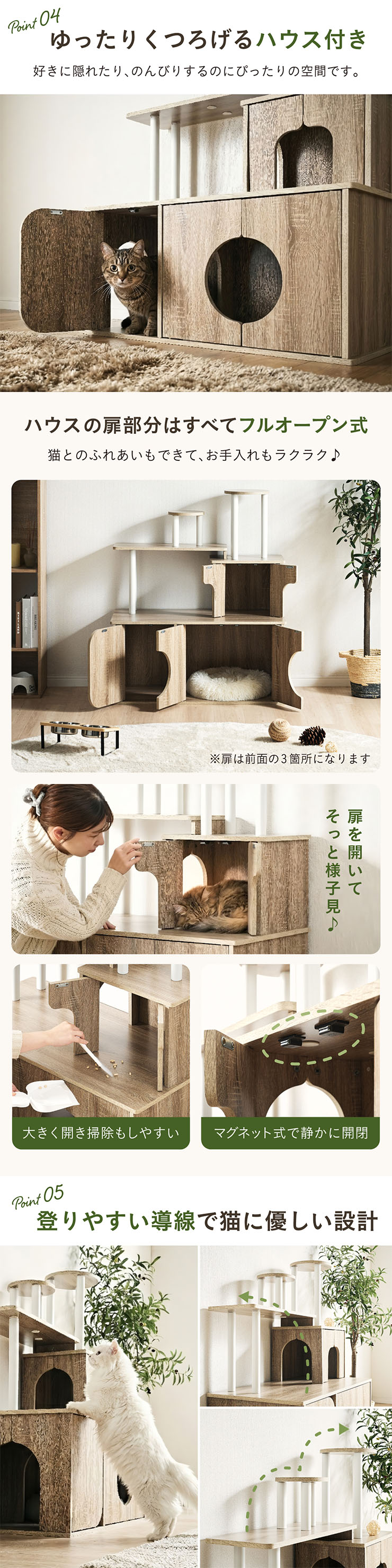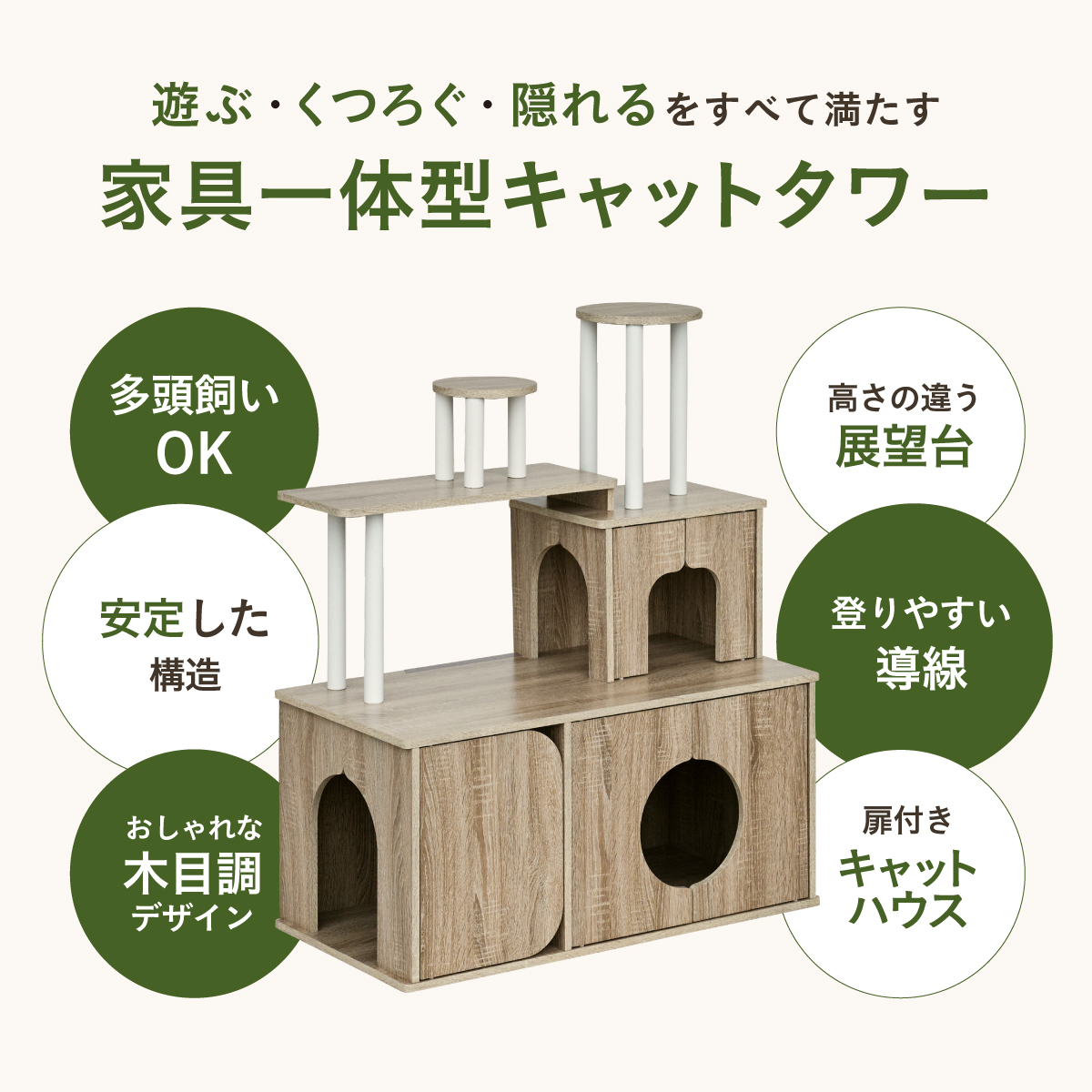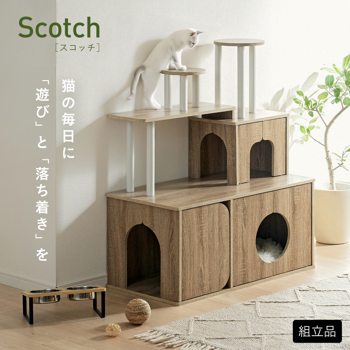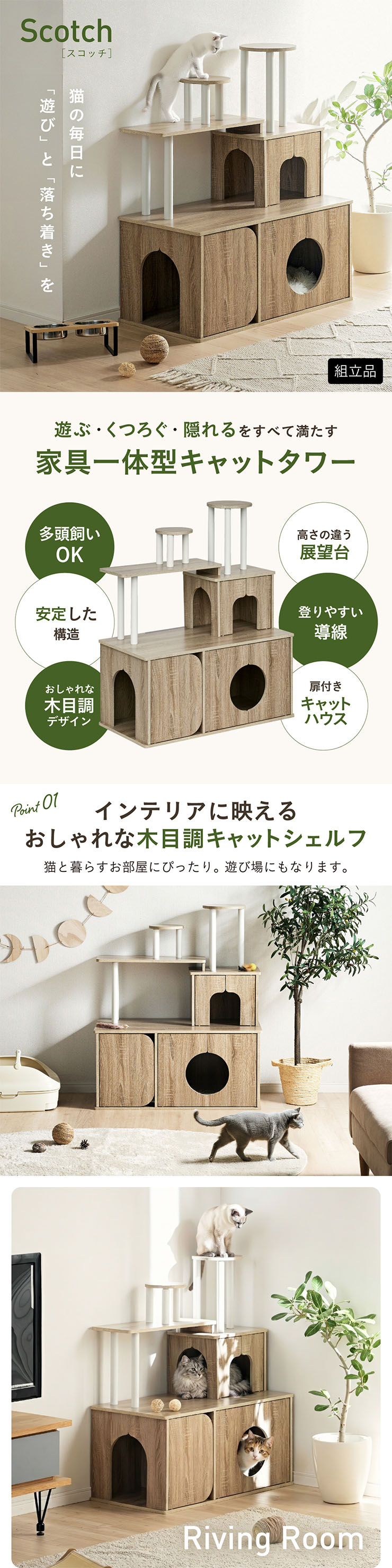 | 猫の毎日に"遊び"と"落ち着き"を。インテリアに映える家具型キャットタワー Scotch(スコッチ) 猫の「遊ぶ・くつろぐ・隠れる」をすべて満たす、家具一体型キャット ・多頭飼いOK ・安定した構造 ・おしゃれな木目調デザイン ・展望台 ・登りやすい導線 ・扉付きキャットハウス ■Point1 猫と暮らすお部屋にぴったり。 遊び場にもなる、おしゃれな木目調のキャットシェルフ。 ■Point2 多頭飼いでも使いやすい広々構造 3つのハウスやスペースを備えており、上下で猫同士の距離も取りやすく、ケンカ防止にも◎ ■Point3 安定感のある構造で、ぐらつきにくく安全。 大型猫でも安心して登れる仕様。 ※PE(ポリエチレン)素材は、割れたり、欠けたりしにくく、長期間使える素材です。 ■Point4 猫が好きなときに隠れたり、ゆったりくつろげるハウス付き。 ■Point5 上下の扉部分はすべてフルオープン式。 猫とのふれあいもできて、お手入れもラクラク ※扉は前面の3か所になります。 扉を除いてそっと様子見 大きく開き掃除もしやすい マグネット式で、静かに開閉 ■Point6 登りやすい導線で猫に優しい設計 高さの違うステップで楽しく遊べる ■Point7 くつろぎながら、そっと家族を見守れる。 2つの展望台が、猫の特等席に。 ■Point8 家具型なので床との隙間が少なく、毛やゴミが溜まりにくい。 床にフィットしていてお掃除ラクラク ■Detail 安心・安全にこだわった角丸仕様 ※こちらの商品はお客様組み立てとなります。 ※組み立て方や若干の個体差によって、表記サイズと完成形のサイズに多少の誤差が生じる場合がございます。 ※リアルな木目調シートを採用しております。木目や節・傷に見えるダメージ加工・ヴィンテージ加工などは全てシートデザインとなります。これらを理由とした返品・交換は行っておりませんので、予めご了承ください。 | |