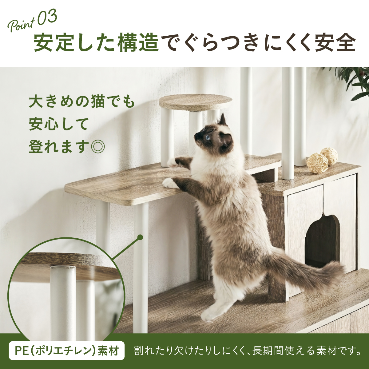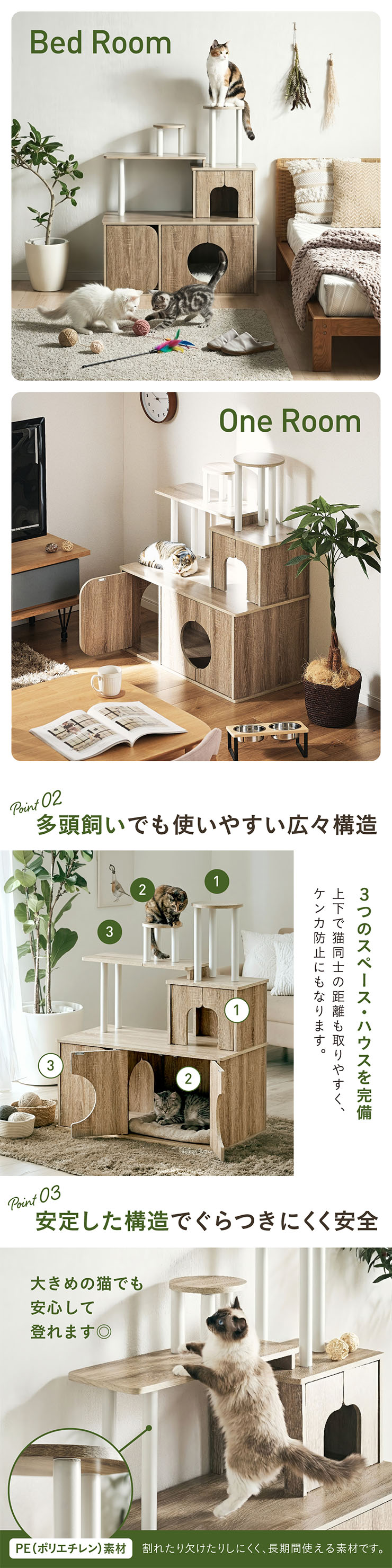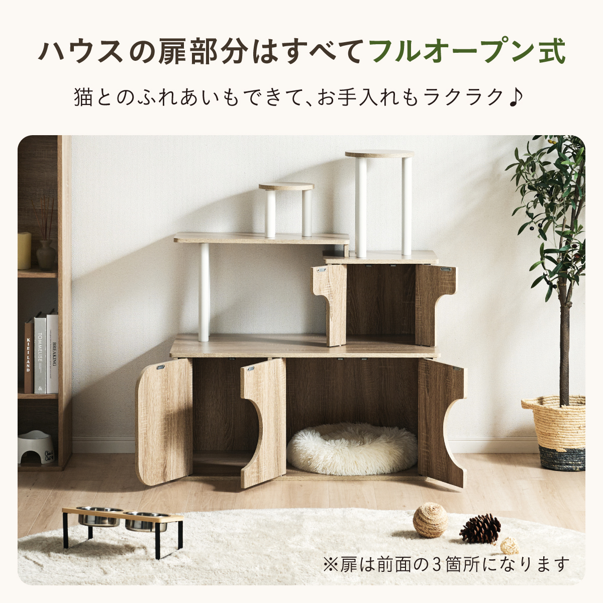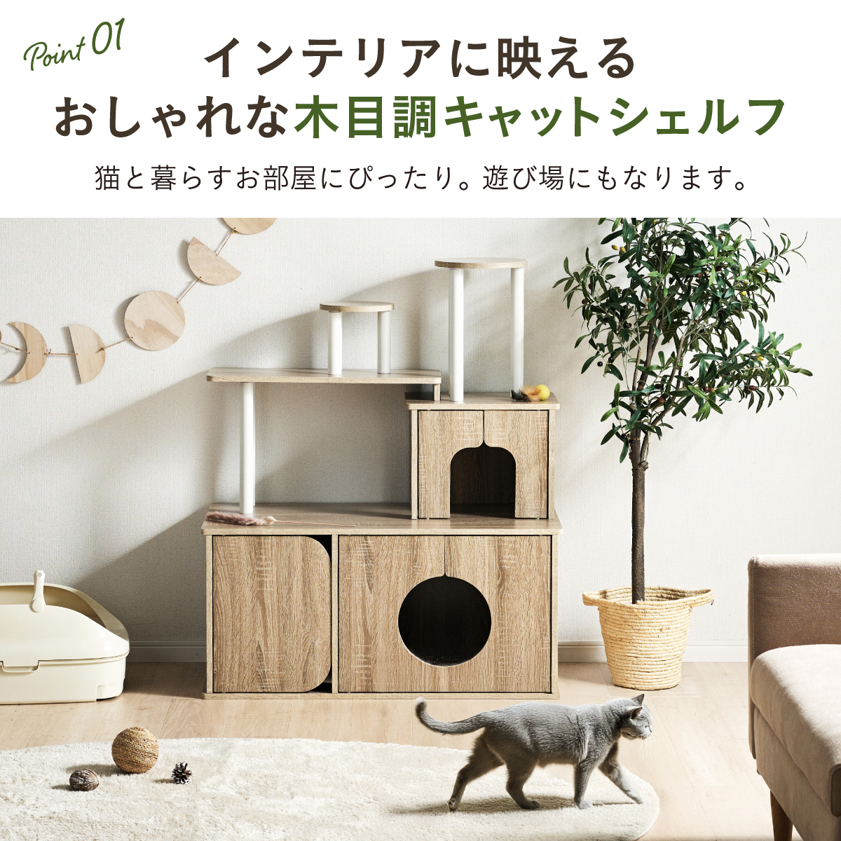 | 猫の毎日に"遊び"と"落ち着き"を。インテリアに映える家具型キャットタワー Scotch(スコッチ) 猫の「遊ぶ・くつろぐ・隠れる」をすべて満たす、家具一体型キャット ・多頭飼いOK ・安定した構造 ・おしゃれな木目調デザイン ・展望台 ・登りやすい導線 ・扉付きキャットハウス ■Point1 猫と暮らすお部屋にぴったり。 遊び場にもなる、おしゃれな木目調のキャットシェルフ。 ■Point2 多頭飼いでも使いやすい広々構造 3つのハウスやスペースを備えており、上下で猫同士の距離も取りやすく、ケンカ防止にも◎ ■Point3 安定感のある構造で、ぐらつきにくく安全。 大型猫でも安心して登れる仕様。 ※PE(ポリエチレン)素材は、割れたり、欠けたりしにくく、長期間使える素材です。 ■Point4 猫が好きなときに隠れたり、ゆったりくつろげるハウス付き。 ■Point5 上下の扉部分はすべてフルオープン式。 猫とのふれあいもできて、お手入れもラクラク ※扉は前面の3か所になります。 扉を除いてそっと様子見 大きく開き掃除もしやすい マグネット式で、静かに開閉 ■Point6 登りやすい導線で猫に優しい設計 高さの違うステップで楽しく遊べる ■Point7 くつろぎながら、そっと家族を見守れる。 2つの展望台が、猫の特等席に。 ■Point8 家具型なので床との隙間が少なく、毛やゴミが溜まりにくい。 床にフィットしていてお掃除ラクラク ■Detail 安心・安全にこだわった角丸仕様 ※こちらの商品はお客様組み立てとなります。 ※組み立て方や若干の個体差によって、表記サイズと完成形のサイズに多少の誤差が生じる場合がございます。 ※リアルな木目調シートを採用しております。木目や節・傷に見えるダメージ加工・ヴィンテージ加工などは全てシートデザインとなります。これらを理由とした返品・交換は行っておりませんので、予めご了承ください。 | |
