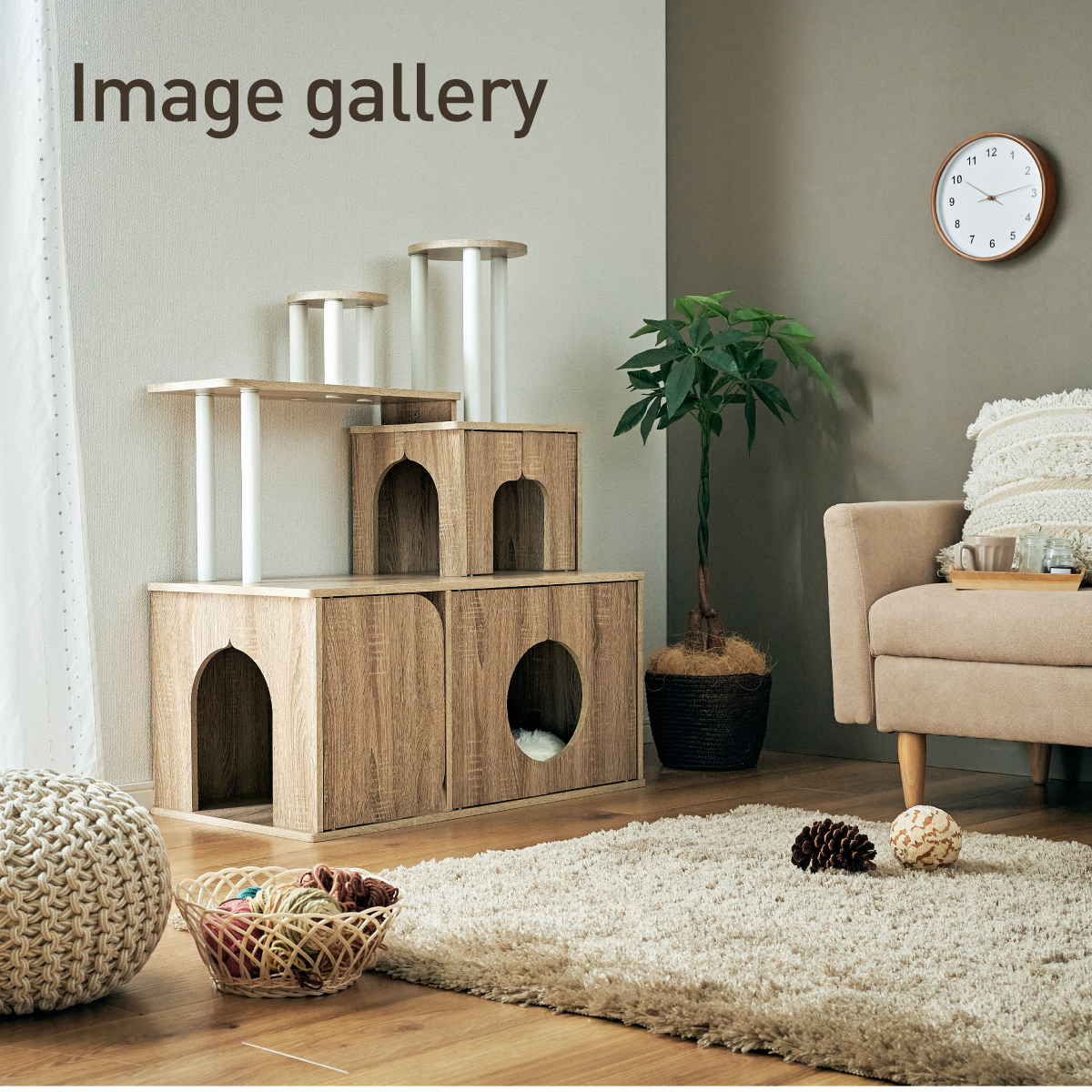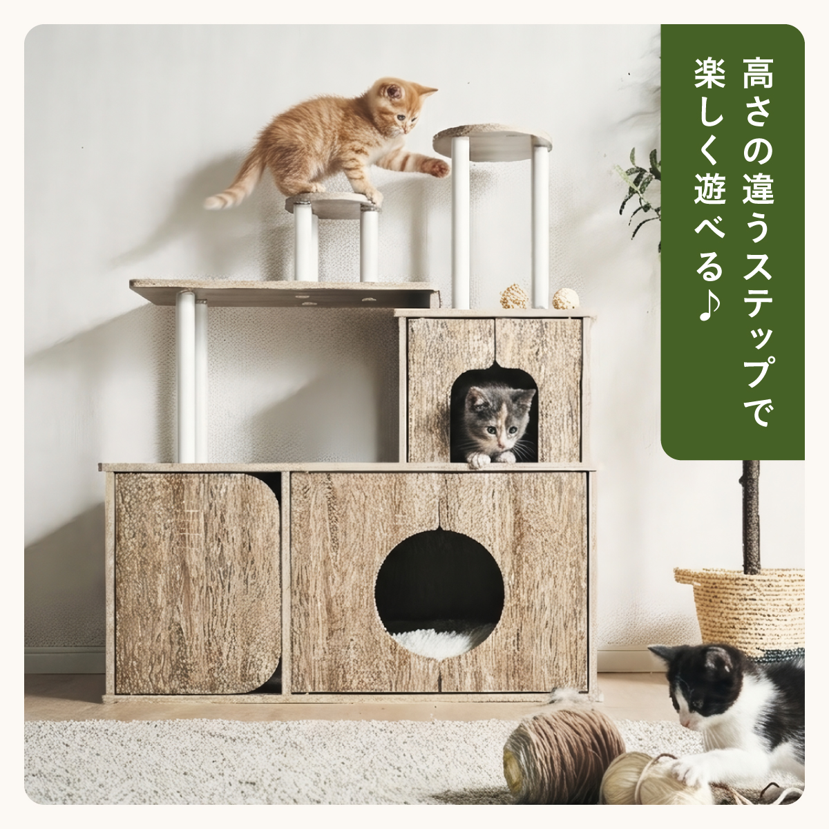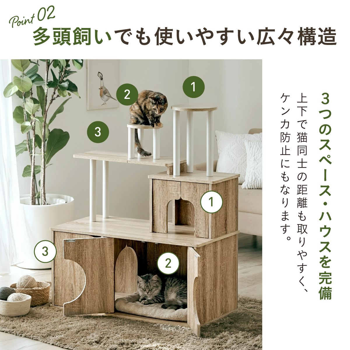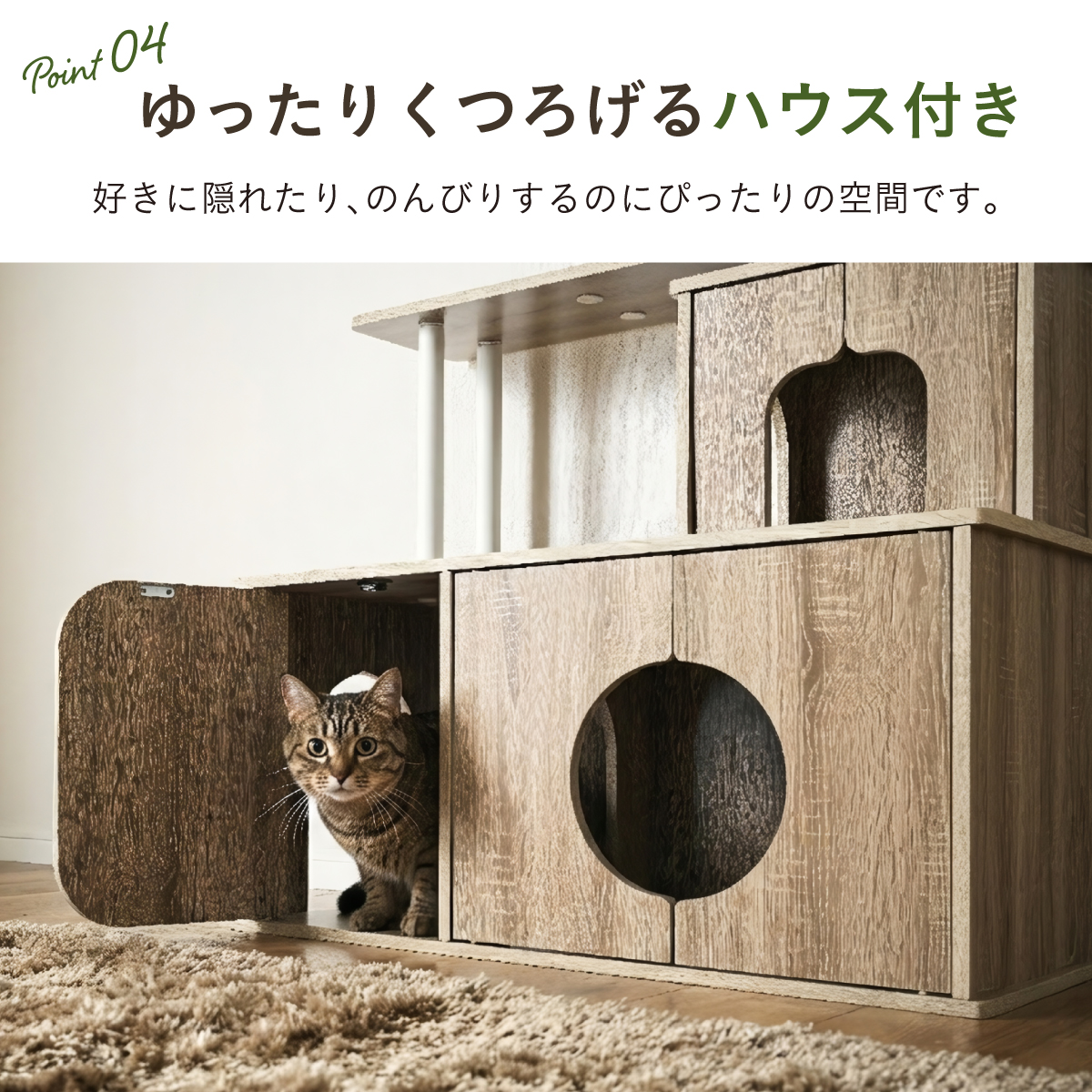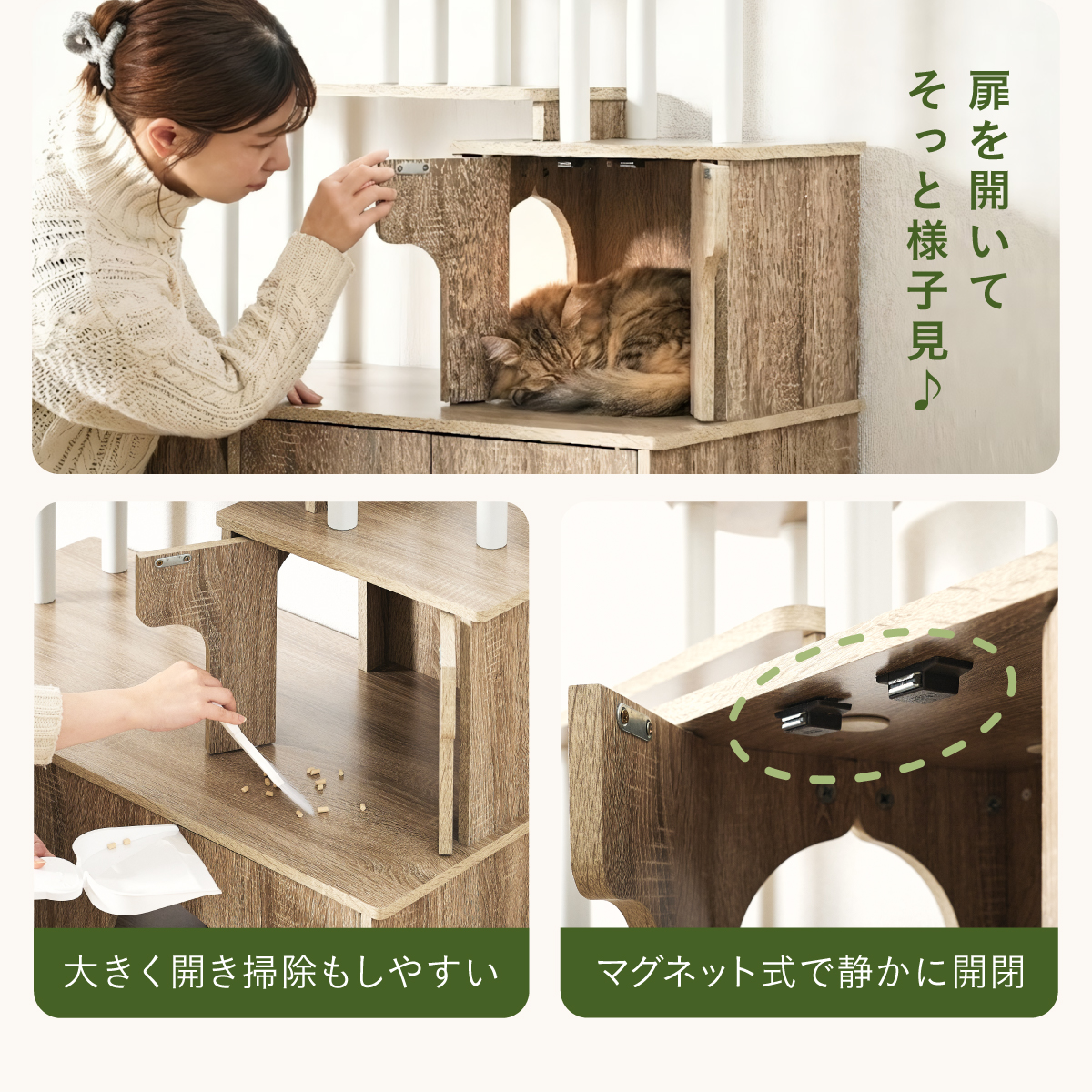 | 猫の毎日に"遊び"と"落ち着き"を。インテリアに映える家具型キャットタワー Scotch(スコッチ) 猫の「遊ぶ・くつろぐ・隠れる」をすべて満たす、家具一体型キャット ・多頭飼いOK ・安定した構造 ・おしゃれな木目調デザイン ・展望台 ・登りやすい導線 ・扉付きキャットハウス ■Point1 猫と暮らすお部屋にぴったり。 遊び場にもなる、おしゃれな木目調のキャットシェルフ。 ■Point2 多頭飼いでも使いやすい広々構造 3つのハウスやスペースを備えており、上下で猫同士の距離も取りやすく、ケンカ防止にも◎ ■Point3 安定感のある構造で、ぐらつきにくく安全。 大型猫でも安心して登れる仕様。 ※PE(ポリエチレン)素材は、割れたり、欠けたりしにくく、長期間使える素材です。 ■Point4 猫が好きなときに隠れたり、ゆったりくつろげるハウス付き。 ■Point5 上下の扉部分はすべてフルオープン式。 猫とのふれあいもできて、お手入れもラクラク ※扉は前面の3か所になります。 扉を除いてそっと様子見 大きく開き掃除もしやすい マグネット式で、静かに開閉 ■Point6 登りやすい導線で猫に優しい設計 高さの違うステップで楽しく遊べる ■Point7 くつろぎながら、そっと家族を見守れる。 2つの展望台が、猫の特等席に。 ■Point8 家具型なので床との隙間が少なく、毛やゴミが溜まりにくい。 床にフィットしていてお掃除ラクラク ■Detail 安心・安全にこだわった角丸仕様 ※こちらの商品はお客様組み立てとなります。 ※組み立て方や若干の個体差によって、表記サイズと完成形のサイズに多少の誤差が生じる場合がございます。 ※リアルな木目調シートを採用しております。木目や節・傷に見えるダメージ加工・ヴィンテージ加工などは全てシートデザインとなります。これらを理由とした返品・交換は行っておりませんので、予めご了承ください。 | |