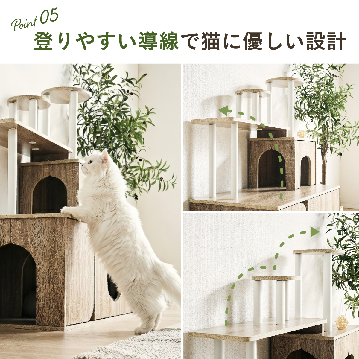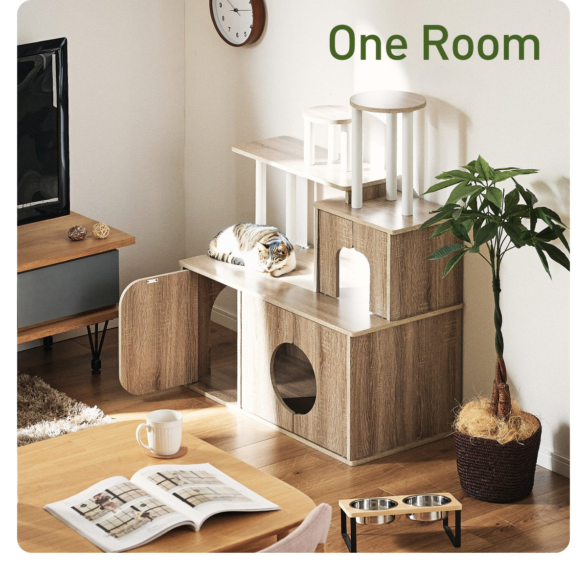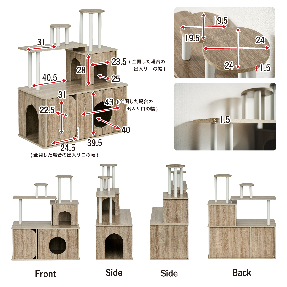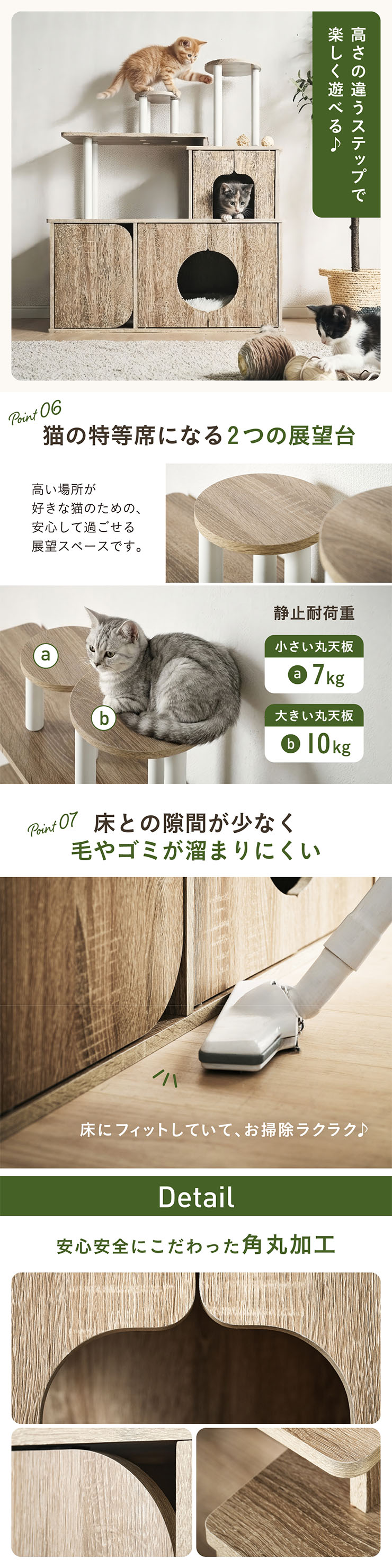 | 猫の毎日に"遊び"と"落ち着き"を。インテリアに映える家具型キャットタワー Scotch(スコッチ) 猫の「遊ぶ・くつろぐ・隠れる」をすべて満たす、家具一体型キャット ・多頭飼いOK ・安定した構造 ・おしゃれな木目調デザイン ・展望台 ・登りやすい導線 ・扉付きキャットハウス ■Point1 猫と暮らすお部屋にぴったり。 遊び場にもなる、おしゃれな木目調のキャットシェルフ。 ■Point2 多頭飼いでも使いやすい広々構造 3つのハウスやスペースを備えており、上下で猫同士の距離も取りやすく、ケンカ防止にも◎ ■Point3 安定感のある構造で、ぐらつきにくく安全。 大型猫でも安心して登れる仕様。 ※PE(ポリエチレン)素材は、割れたり、欠けたりしにくく、長期間使える素材です。 ■Point4 猫が好きなときに隠れたり、ゆったりくつろげるハウス付き。 ■Point5 上下の扉部分はすべてフルオープン式。 猫とのふれあいもできて、お手入れもラクラク ※扉は前面の3か所になります。 扉を除いてそっと様子見 大きく開き掃除もしやすい マグネット式で、静かに開閉 ■Point6 登りやすい導線で猫に優しい設計 高さの違うステップで楽しく遊べる ■Point7 くつろぎながら、そっと家族を見守れる。 2つの展望台が、猫の特等席に。 ■Point8 家具型なので床との隙間が少なく、毛やゴミが溜まりにくい。 床にフィットしていてお掃除ラクラク ■Detail 安心・安全にこだわった角丸仕様 ※こちらの商品はお客様組み立てとなります。 ※組み立て方や若干の個体差によって、表記サイズと完成形のサイズに多少の誤差が生じる場合がございます。 ※リアルな木目調シートを採用しております。木目や節・傷に見えるダメージ加工・ヴィンテージ加工などは全てシートデザインとなります。これらを理由とした返品・交換は行っておりませんので、予めご了承ください。 | |