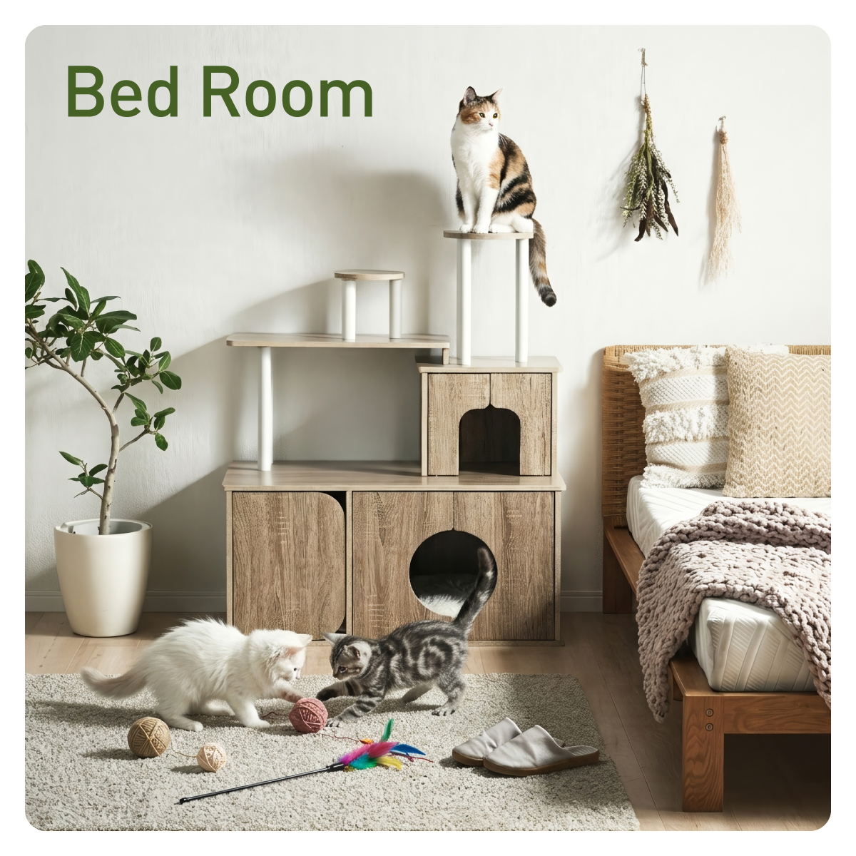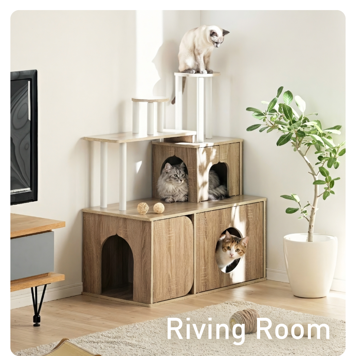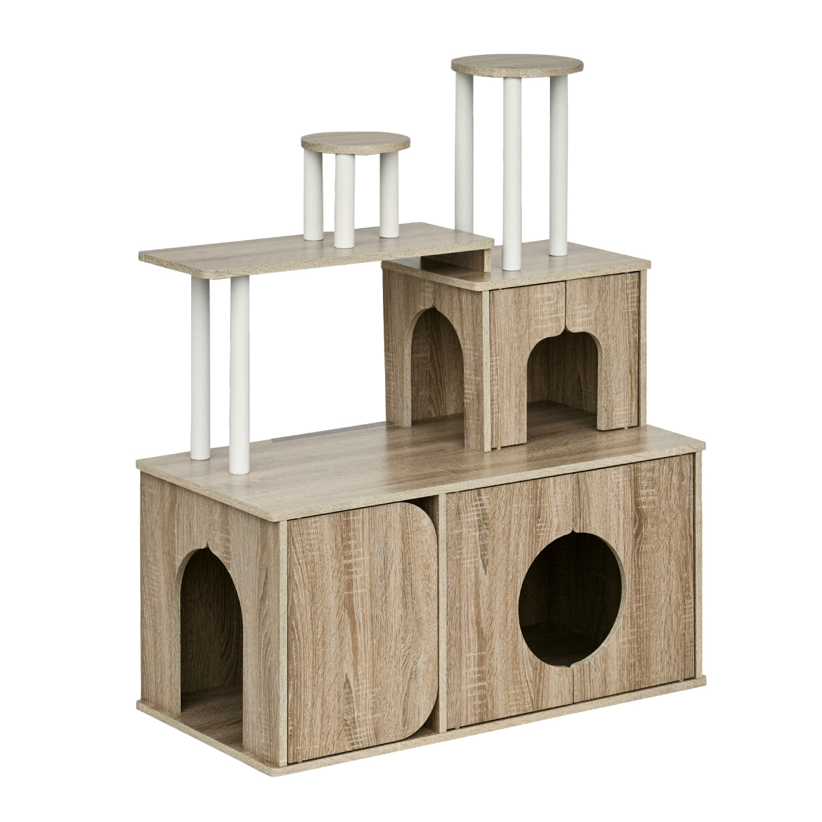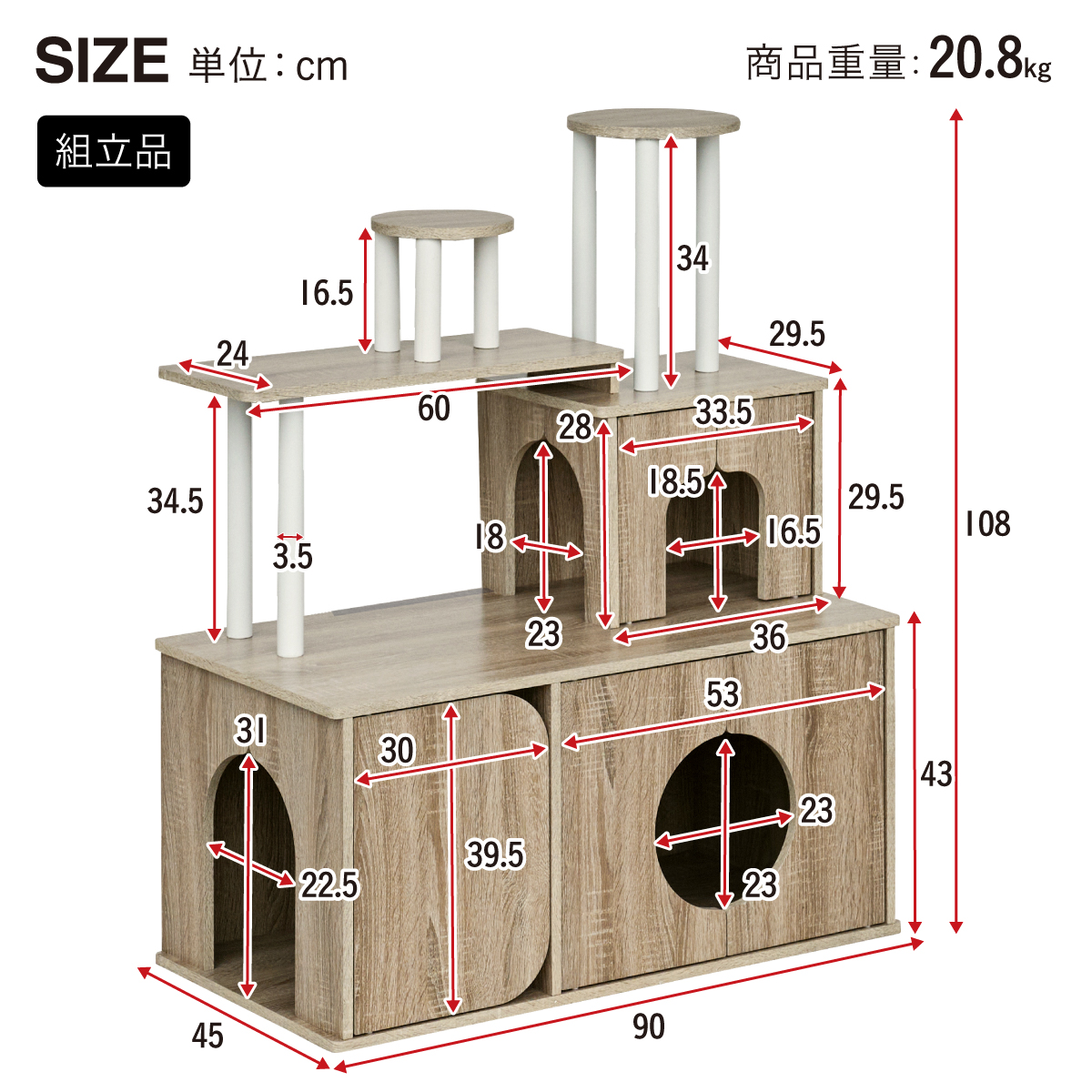 | 猫の毎日に"遊び"と"落ち着き"を。インテリアに映える家具型キャットタワー Scotch(スコッチ) 猫の「遊ぶ・くつろぐ・隠れる」をすべて満たす、家具一体型キャット ・多頭飼いOK ・安定した構造 ・おしゃれな木目調デザイン ・展望台 ・登りやすい導線 ・扉付きキャットハウス ■Point1 猫と暮らすお部屋にぴったり。 遊び場にもなる、おしゃれな木目調のキャットシェルフ。 ■Point2 多頭飼いでも使いやすい広々構造 3つのハウスやスペースを備えており、上下で猫同士の距離も取りやすく、ケンカ防止にも◎ ■Point3 安定感のある構造で、ぐらつきにくく安全。 大型猫でも安心して登れる仕様。 ※PE(ポリエチレン)素材は、割れたり、欠けたりしにくく、長期間使える素材です。 ■Point4 猫が好きなときに隠れたり、ゆったりくつろげるハウス付き。 ■Point5 上下の扉部分はすべてフルオープン式。 猫とのふれあいもできて、お手入れもラクラク ※扉は前面の3か所になります。 扉を除いてそっと様子見 大きく開き掃除もしやすい マグネット式で、静かに開閉 ■Point6 登りやすい導線で猫に優しい設計 高さの違うステップで楽しく遊べる ■Point7 くつろぎながら、そっと家族を見守れる。 2つの展望台が、猫の特等席に。 ■Point8 家具型なので床との隙間が少なく、毛やゴミが溜まりにくい。 床にフィットしていてお掃除ラクラク ■Detail 安心・安全にこだわった角丸仕様 ※こちらの商品はお客様組み立てとなります。 ※組み立て方や若干の個体差によって、表記サイズと完成形のサイズに多少の誤差が生じる場合がございます。 ※リアルな木目調シートを採用しております。木目や節・傷に見えるダメージ加工・ヴィンテージ加工などは全てシートデザインとなります。これらを理由とした返品・交換は行っておりませんので、予めご了承ください。 | |