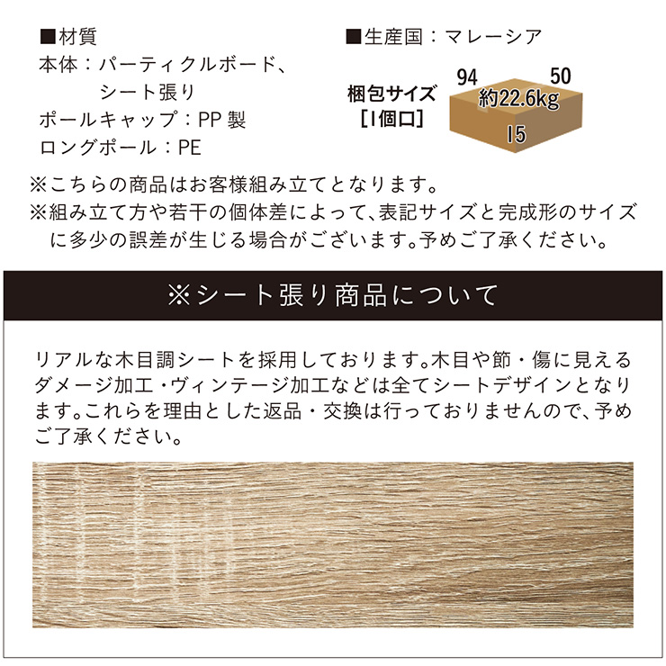 | 材質・素材 | 本体:パーティクルボード・シート張り ポールキャップ:PP製 ロングポール:PE |