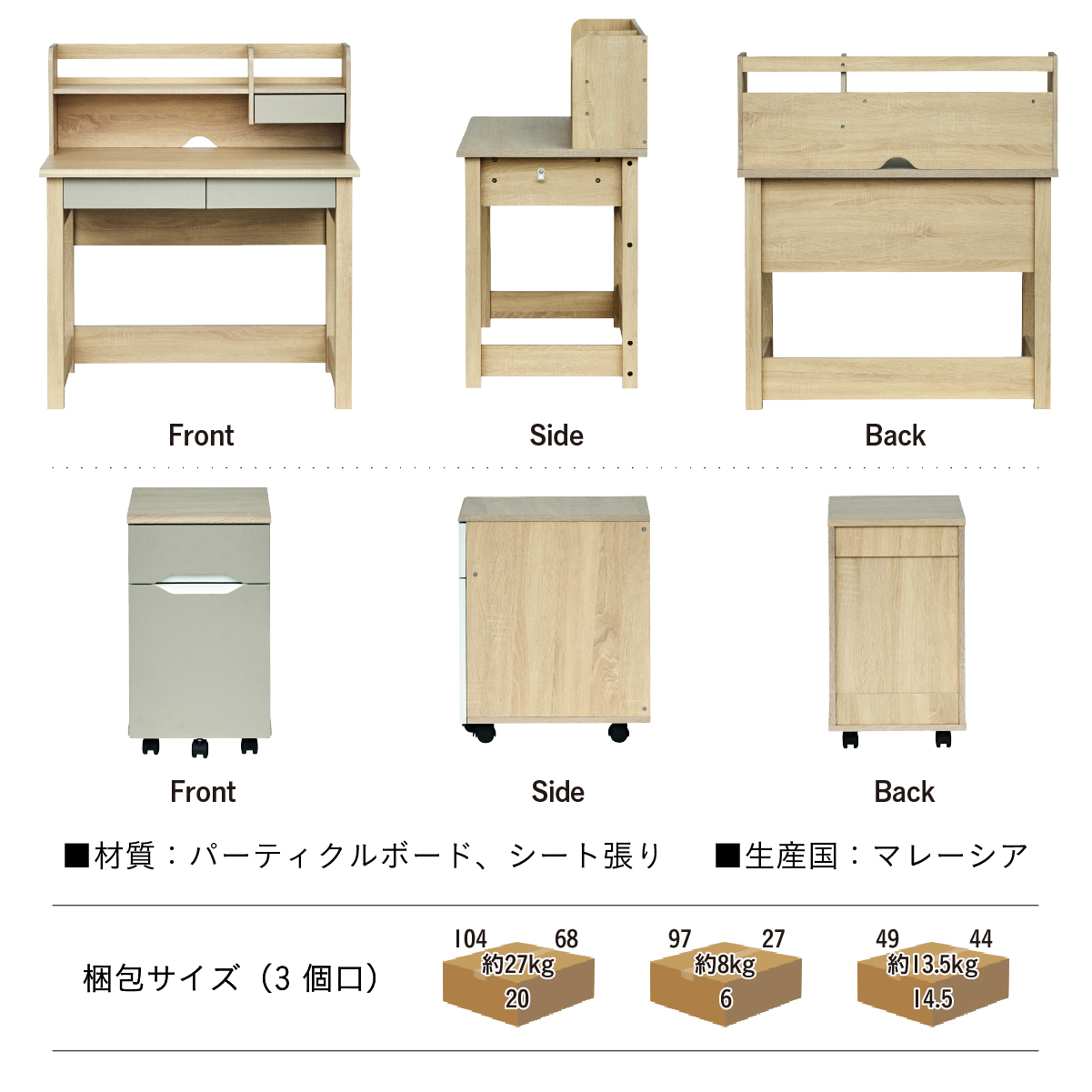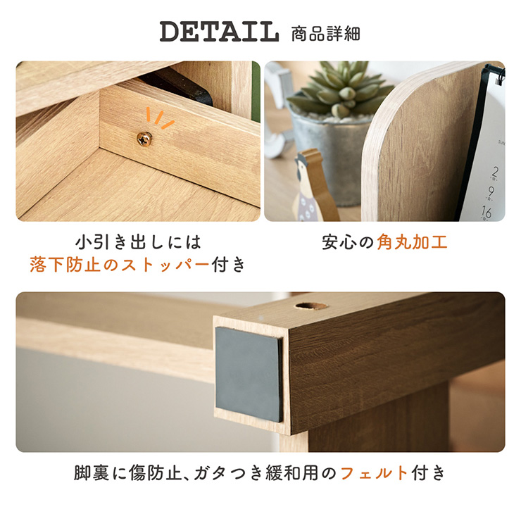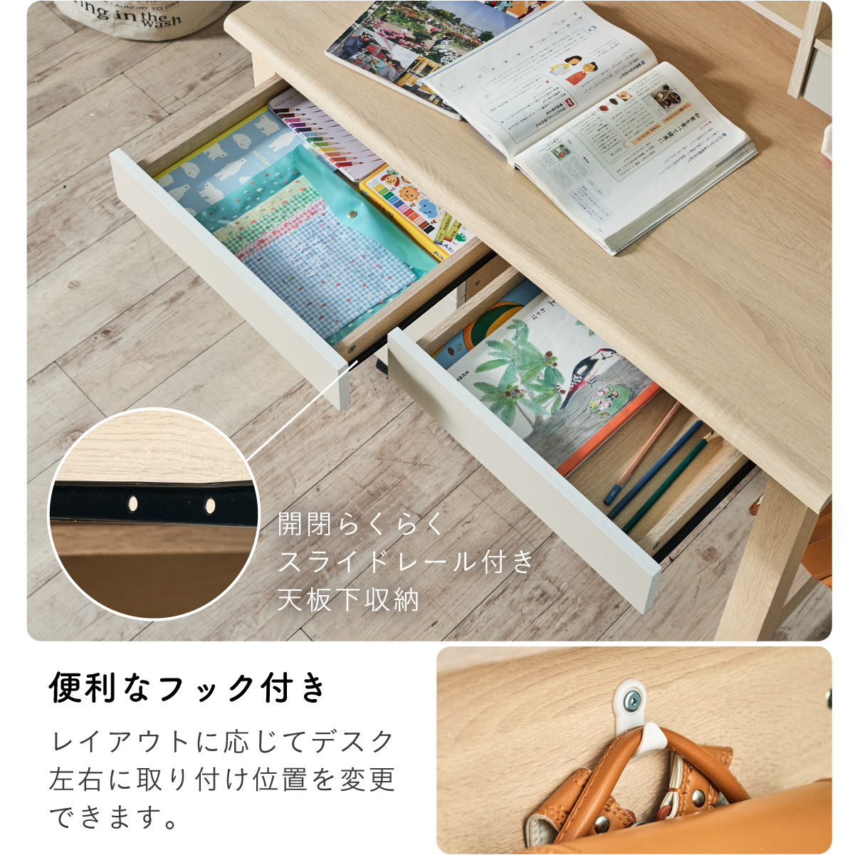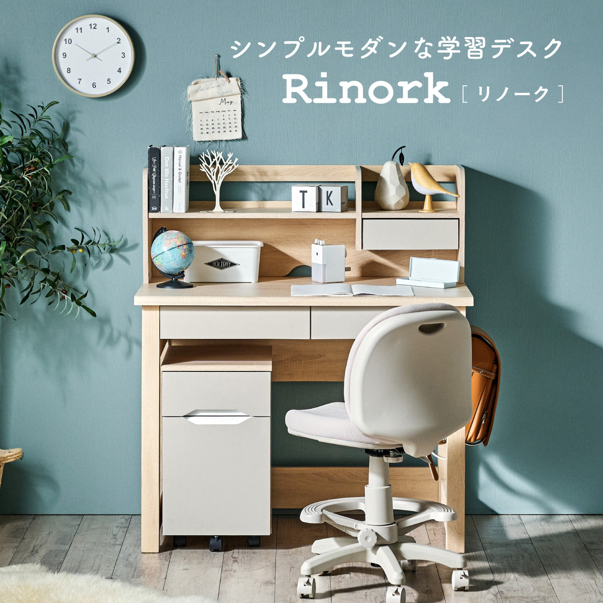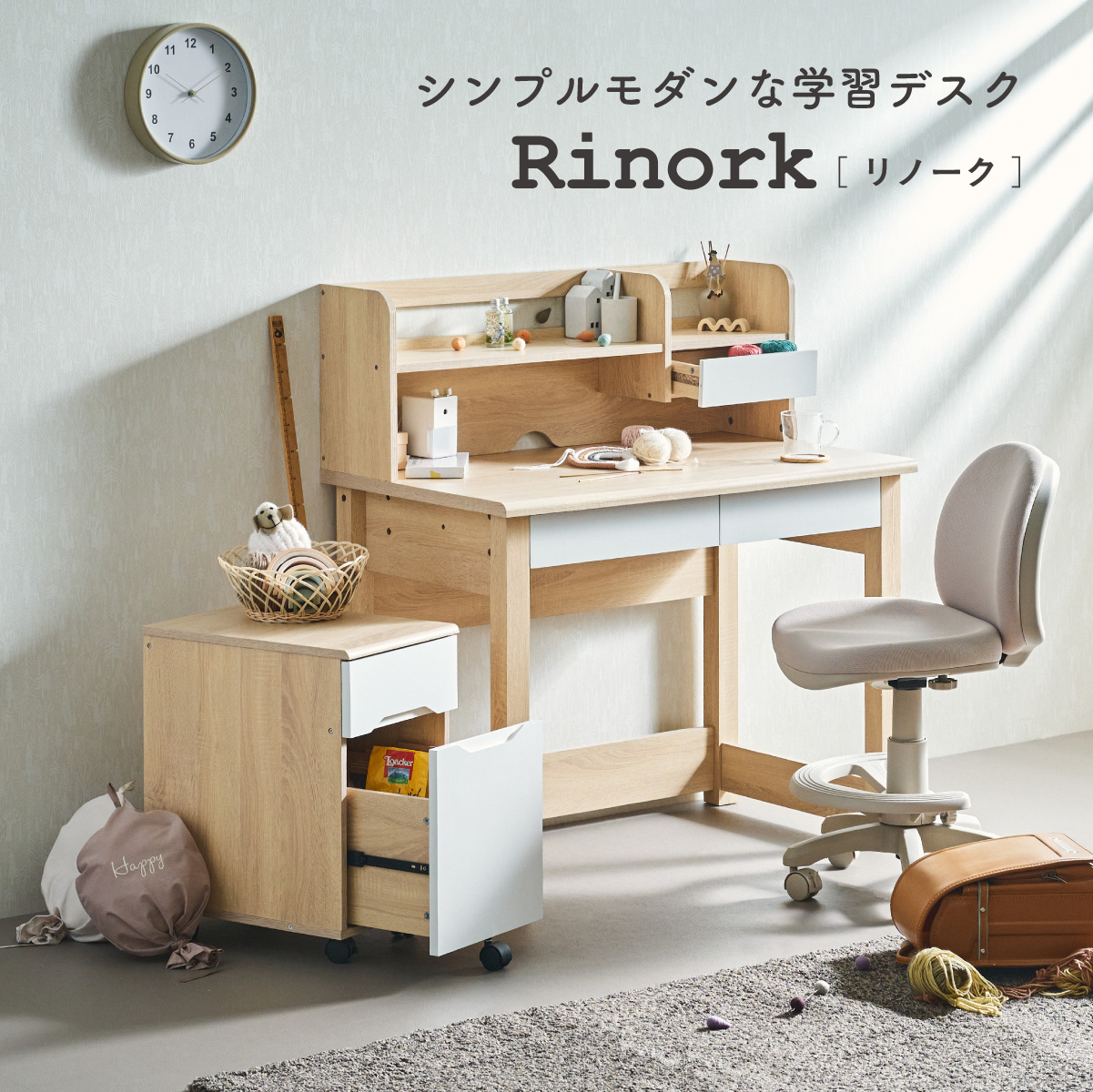 | シンプルモダンな学習デスク Rinork(リノーク) 成長しても長く使えるシンプルなデザイン学習デスク3点セット ■整理整頓が習慣になるBook Shelf 仕切り板付きのラックと小引き出しで、本や文房具を分けてすっきり収納。デスクの上をきれいに保てます。 ■Wagon ・たっぷり収納できる2杯の引き出し:スライドレール付きなので重たい物を入れてもスムーズに開閉できます。 ・移動ラクラクキャスター付き:2箇所にストッパー付きを使用。移動した後はきちんと固定ができて安心です。 ■Desk 使いやすい広々天板で毎日の学習を快適に ・開閉らくらくスライドレール付き天板下収納 ・便利なフック付き:レイアウトに応じてデスク左右に取り付け位置を変更できます。 ■大人になっても使えるシンプルデザイン ブックシェルフを外すとすっきりとした大人っぽい印象のワークデスクに ■detail ・小引き出しには落下防止のストッパー付き ・安心の角丸加工 ・脚裏に傷防止、ガタつき緩和用のフェルト付き ※こちらはお客様組み立てとなります。 ※組み立て方や若干の個体差によって、表記サイズと完成系のサイズに多少の誤差が生じる場合がございます。予めご了承ください。 ※こちらの商品はデスク/ブックシェルフ/ワゴンの3点セットでの販売となります。チェアなどは付属しておりません。 ※リアルな木目調シートを採用しております。木目や節・傷に見えるダメージ加工・ヴィンテージ加工などは全てシートデザインとなります。これらを理由とした返品・交換は行っておりませんので、予めご了承ください。 | |