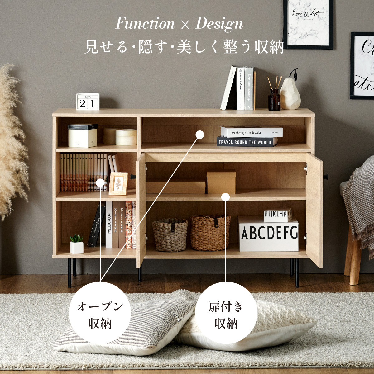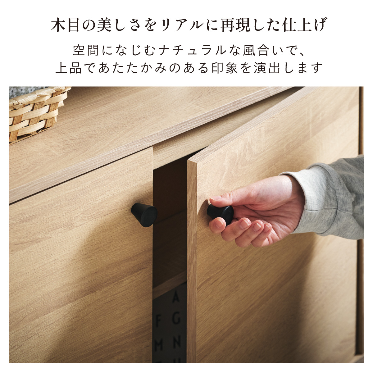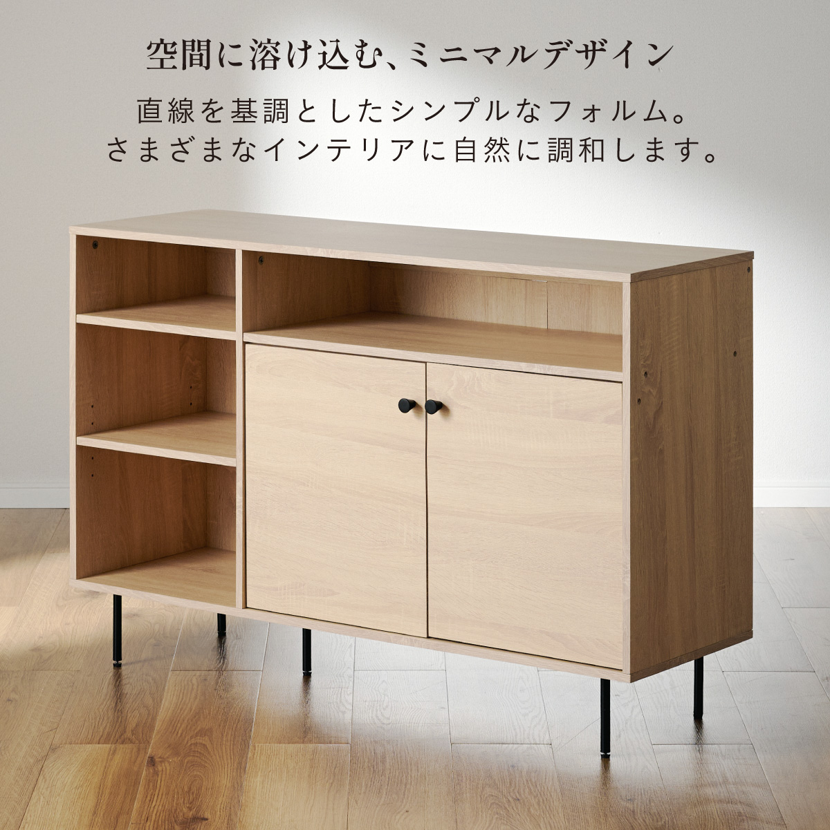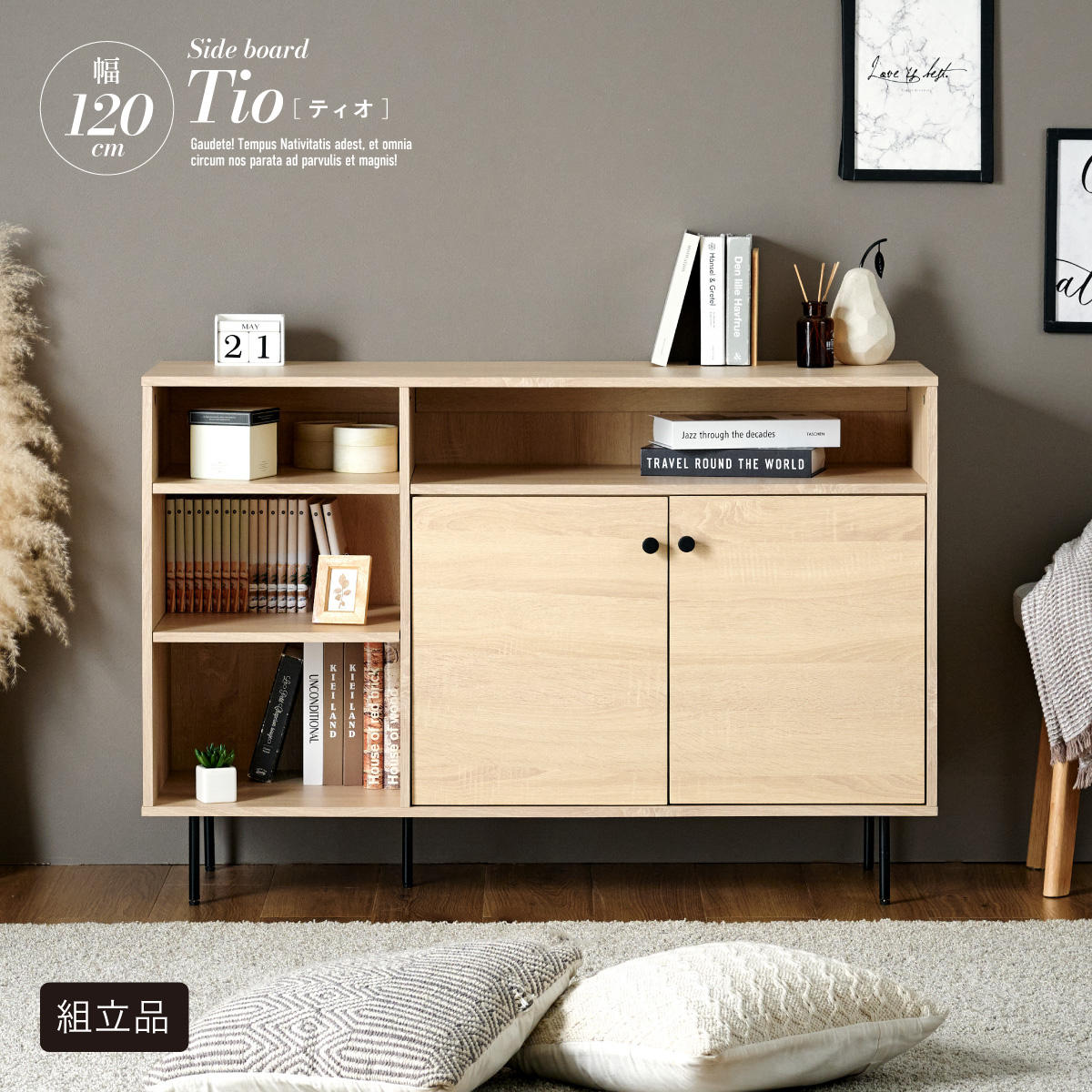 | 空間に溶け込むミニマルデザインサイドボード Tio(ティオ) 幅120cm 直線を基調としたシンプルなフォルム さまざまなインテリアに自然に調和します。 ■Function×Dedign 見せる・隠す・美しく整う収納 ・扉付き収納 ・オープン収納 ■オープン収納 お気に入りの雑貨や小物をディスプレイ感覚で収納 ■扉付き収納 生活感を出さず、雑多になりがちな物をまとめて隠せる ■Design1 ・無駄を削ぎ落としたフォルムのブラック取っ手。 木目の美しさを引き立て、サイドボード全体を引き締めます。 ・スムーズに開閉できるスライドレール。 落下防止ストッパー付きで、抜け落ちを防ぐ安心設計です。 ■Design2 直線的で無駄のない、ブラックの細身脚 床との間に空間をつくることで、サイドボード全体に圧迫感のない、すっきりとした印象を与えます。 ■Design3 ・脚はがたつきを抑えるアジャスター仕様。 床のわずかな凹凸もアジャスターで調整が可能。 ・お掃除ロボットが通れる脚高設計でお部屋のお掃除ラクラク ■広々とした天板は、ディスプレイにも作業にも最適 ディスプレイ棚としても、ちょっとした作業スペースとしても活躍する天板。 暮らしのシーンに合わせて、柔軟に使いこなせます。 下段2枚の棚部分は、可動棚となっており、3cm間隔5段階で調整が可能です。 収納物に合わせて調節が可能。 収納力を確保しながらも、通路やリビングの動線を邪魔しにくいサイズです。 圧迫感を抑え、空間をすっきり見せたい方におすすめです。 ■扉付き収納背面にはコード通し穴付き Wi-FiルーターやAV機器を収納したまま配線可能。 リビングの生活感を抑えます。 本体中央に補強脚を配置。 重さがかかっても、たわみにくい設計 ■OAK(オーク)調 明るくやさしい木目カラーが空間に自然に溶け込み、淡い色合いの中にブラック脚がアクセントとなり、ナチュラルさと上品さを両立します。 ■木目の美しさをリアルに再現した仕上げ 空間になじむナチュラルな風合いで、上品であたたかみのある印象を演出します。 ■どんな空間にもすっとなじむ 木のぬくもりとミニマルなデザインで、置く場所を選ばない収納家具 ※こちらの商品はお客様組み立てとなります。 ※組み立て方や若干の個体差によって、表記サイズと完成形のサイズに多少の誤差が生じる場合がございます。予めご了承ください。 | |