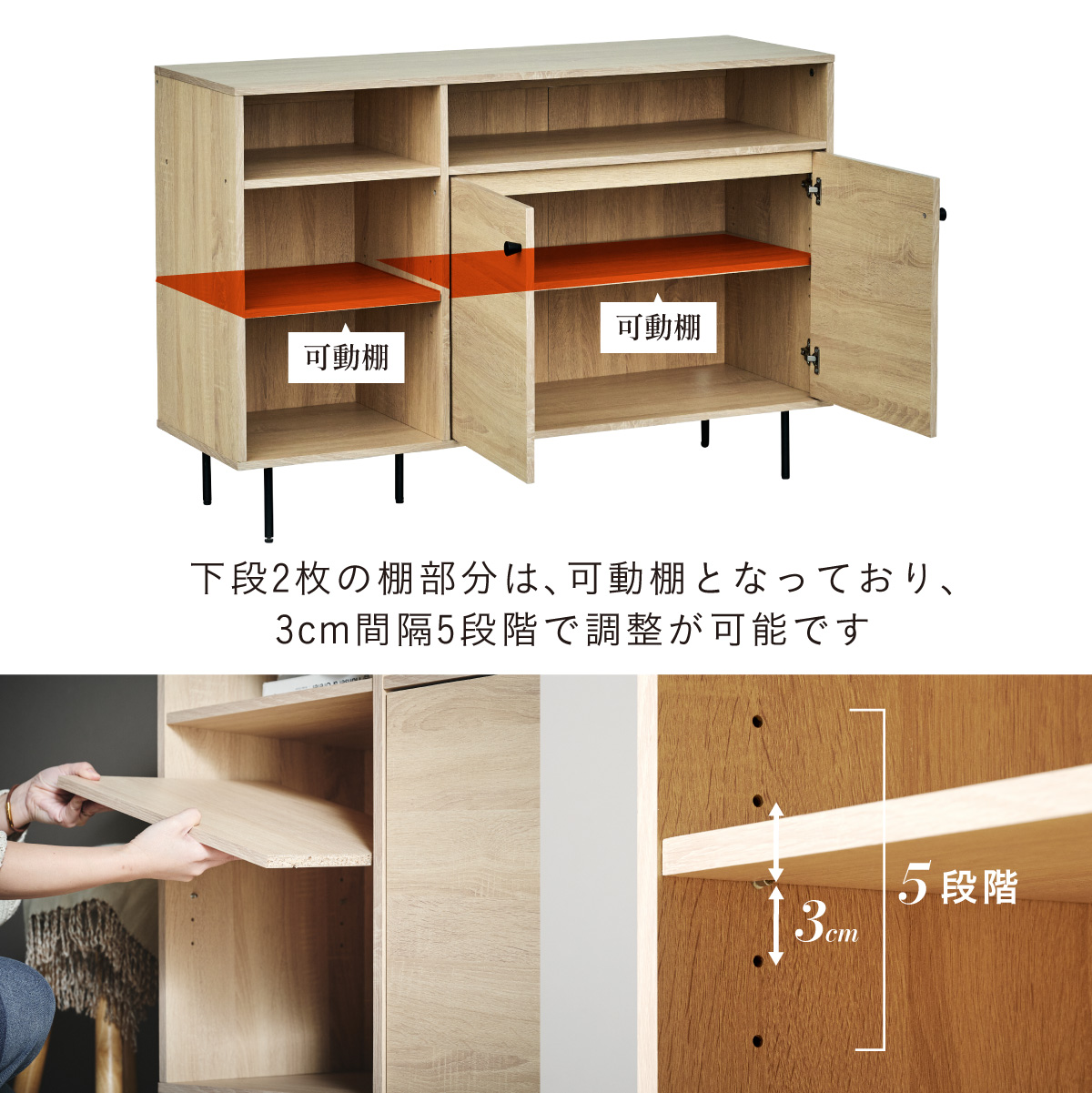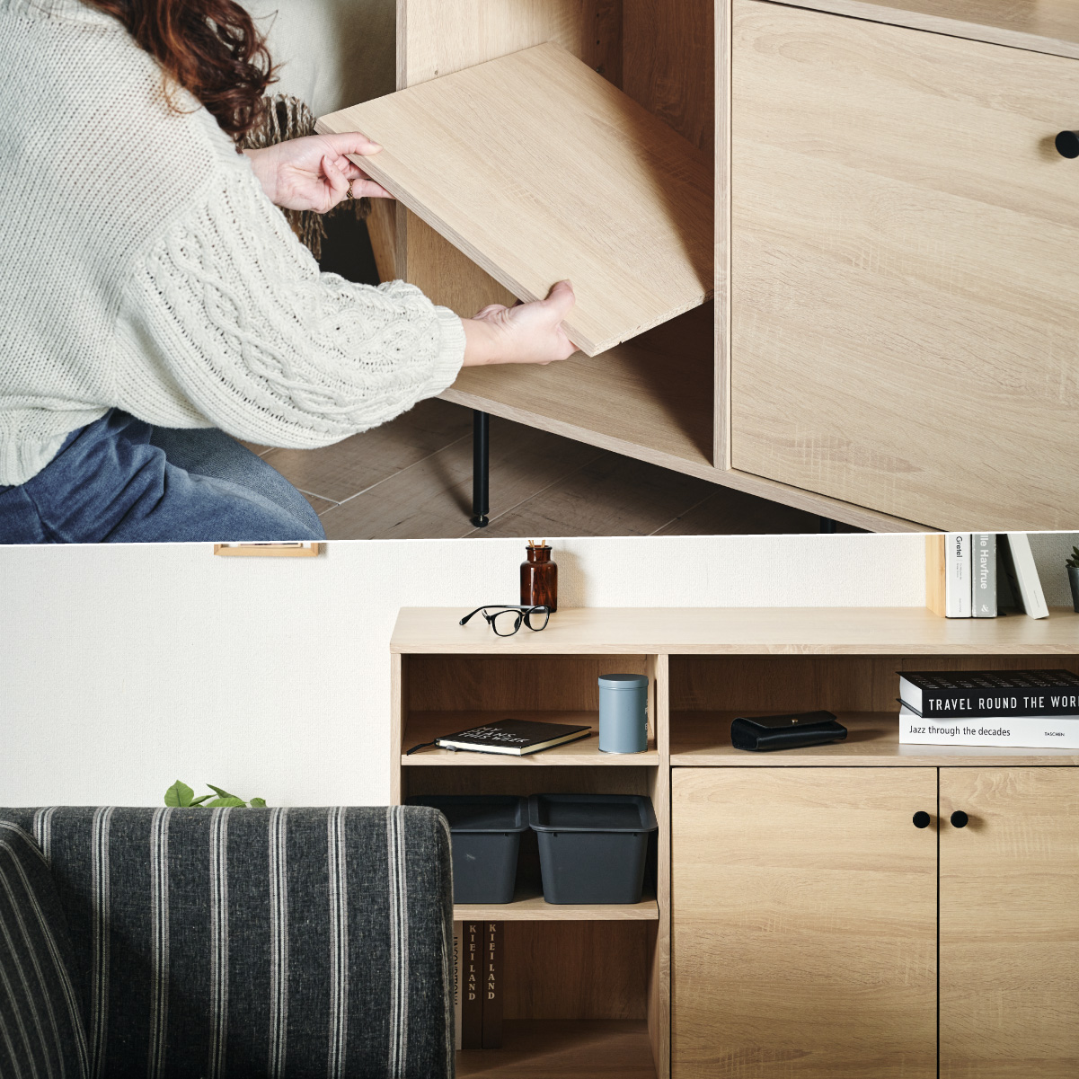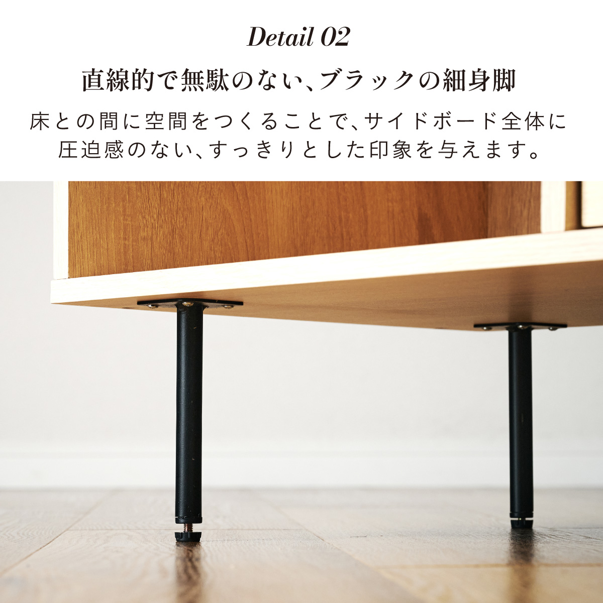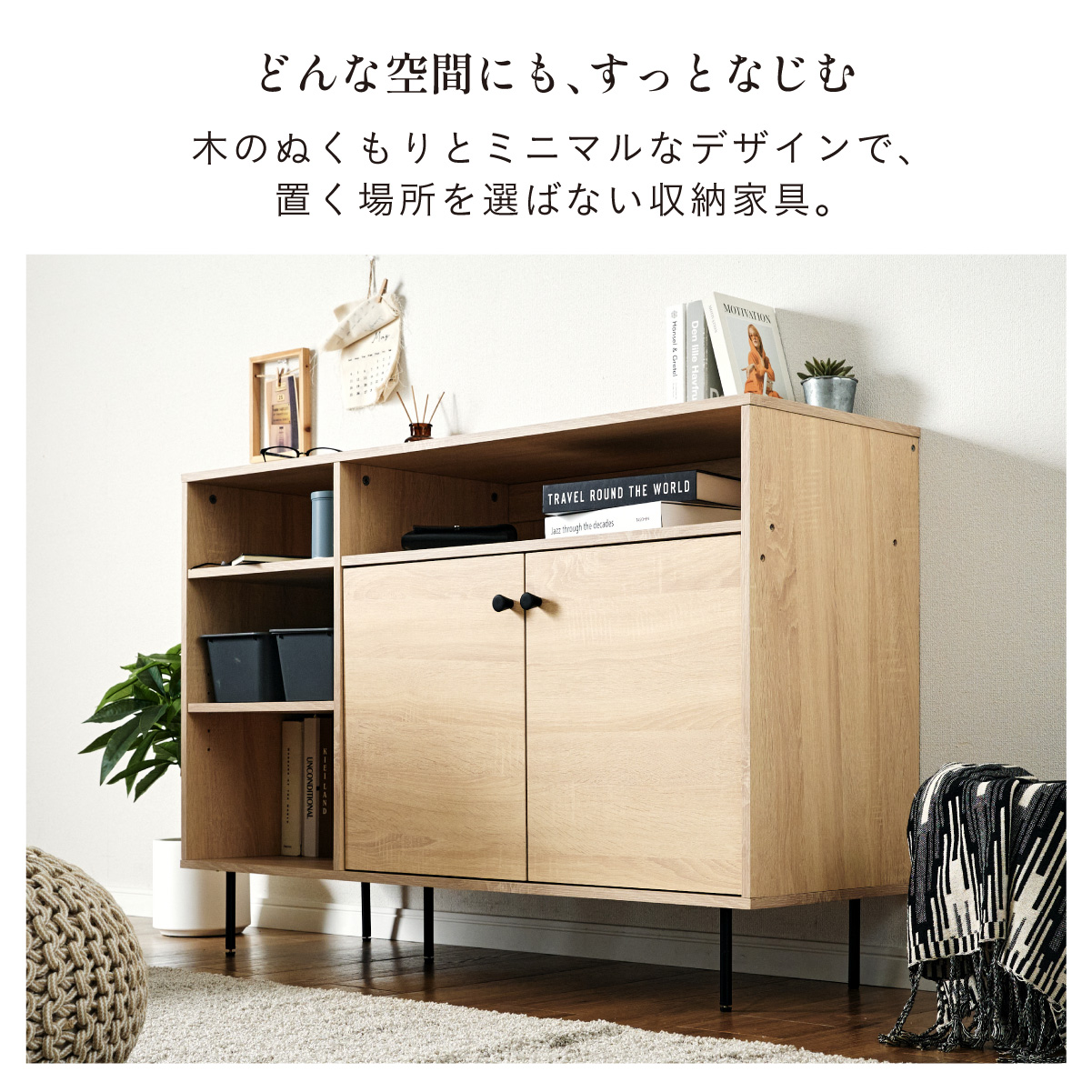 | 空間に溶け込むミニマルデザインサイドボード Tio(ティオ) 幅120cm 直線を基調としたシンプルなフォルム さまざまなインテリアに自然に調和します。 ■Function×Dedign 見せる・隠す・美しく整う収納 ・扉付き収納 ・オープン収納 ■オープン収納 お気に入りの雑貨や小物をディスプレイ感覚で収納 ■扉付き収納 生活感を出さず、雑多になりがちな物をまとめて隠せる ■Design1 ・無駄を削ぎ落としたフォルムのブラック取っ手。 木目の美しさを引き立て、サイドボード全体を引き締めます。 ・スムーズに開閉できるスライドレール。 落下防止ストッパー付きで、抜け落ちを防ぐ安心設計です。 ■Design2 直線的で無駄のない、ブラックの細身脚 床との間に空間をつくることで、サイドボード全体に圧迫感のない、すっきりとした印象を与えます。 ■Design3 ・脚はがたつきを抑えるアジャスター仕様。 床のわずかな凹凸もアジャスターで調整が可能。 ・お掃除ロボットが通れる脚高設計でお部屋のお掃除ラクラク ■広々とした天板は、ディスプレイにも作業にも最適 ディスプレイ棚としても、ちょっとした作業スペースとしても活躍する天板。 暮らしのシーンに合わせて、柔軟に使いこなせます。 下段2枚の棚部分は、可動棚となっており、3cm間隔5段階で調整が可能です。 収納物に合わせて調節が可能。 収納力を確保しながらも、通路やリビングの動線を邪魔しにくいサイズです。 圧迫感を抑え、空間をすっきり見せたい方におすすめです。 ■扉付き収納背面にはコード通し穴付き Wi-FiルーターやAV機器を収納したまま配線可能。 リビングの生活感を抑えます。 本体中央に補強脚を配置。 重さがかかっても、たわみにくい設計 ■OAK(オーク)調 明るくやさしい木目カラーが空間に自然に溶け込み、淡い色合いの中にブラック脚がアクセントとなり、ナチュラルさと上品さを両立します。 ■木目の美しさをリアルに再現した仕上げ 空間になじむナチュラルな風合いで、上品であたたかみのある印象を演出します。 ■どんな空間にもすっとなじむ 木のぬくもりとミニマルなデザインで、置く場所を選ばない収納家具 ※こちらの商品はお客様組み立てとなります。 ※組み立て方や若干の個体差によって、表記サイズと完成形のサイズに多少の誤差が生じる場合がございます。予めご了承ください。 | |