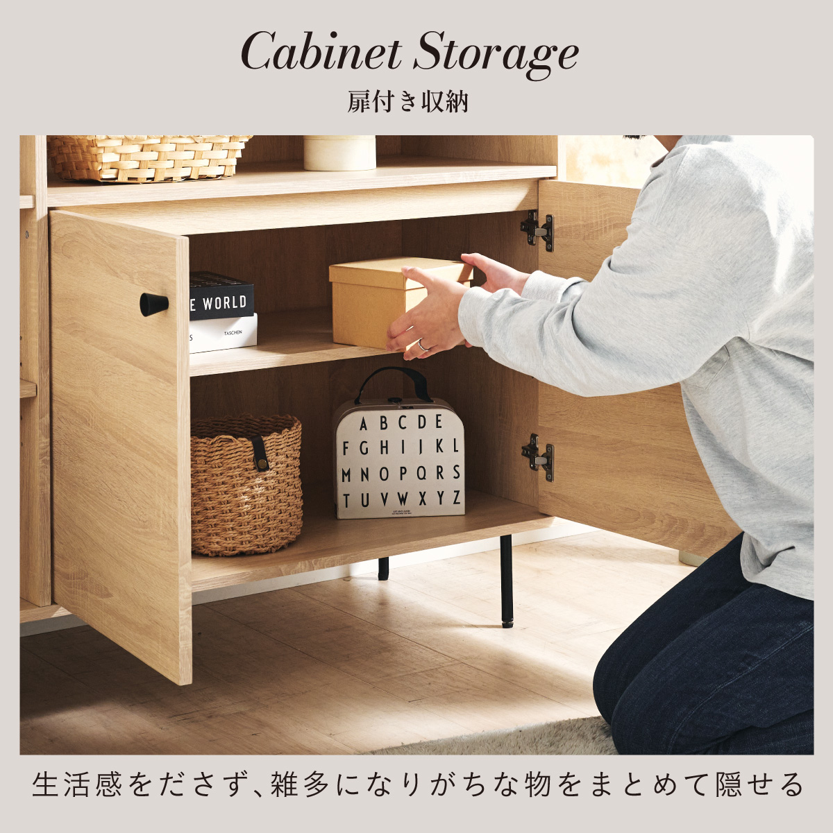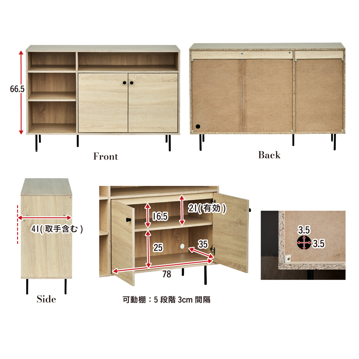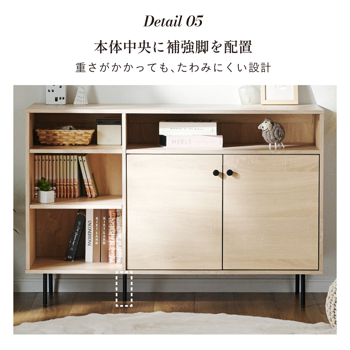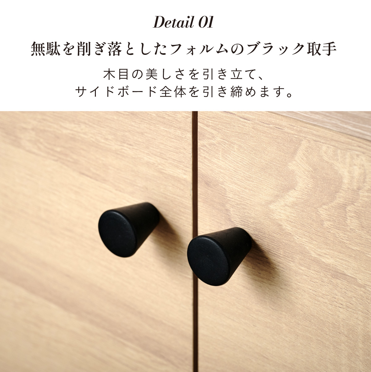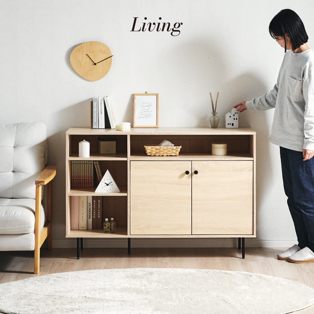 | 空間に溶け込むミニマルデザインサイドボード Tio(ティオ) 幅120cm 直線を基調としたシンプルなフォルム さまざまなインテリアに自然に調和します。 ■Function×Dedign 見せる・隠す・美しく整う収納 ・扉付き収納 ・オープン収納 ■オープン収納 お気に入りの雑貨や小物をディスプレイ感覚で収納 ■扉付き収納 生活感を出さず、雑多になりがちな物をまとめて隠せる ■Design1 ・無駄を削ぎ落としたフォルムのブラック取っ手。 木目の美しさを引き立て、サイドボード全体を引き締めます。 ・スムーズに開閉できるスライドレール。 落下防止ストッパー付きで、抜け落ちを防ぐ安心設計です。 ■Design2 直線的で無駄のない、ブラックの細身脚 床との間に空間をつくることで、サイドボード全体に圧迫感のない、すっきりとした印象を与えます。 ■Design3 ・脚はがたつきを抑えるアジャスター仕様。 床のわずかな凹凸もアジャスターで調整が可能。 ・お掃除ロボットが通れる脚高設計でお部屋のお掃除ラクラク ■広々とした天板は、ディスプレイにも作業にも最適 ディスプレイ棚としても、ちょっとした作業スペースとしても活躍する天板。 暮らしのシーンに合わせて、柔軟に使いこなせます。 下段2枚の棚部分は、可動棚となっており、3cm間隔5段階で調整が可能です。 収納物に合わせて調節が可能。 収納力を確保しながらも、通路やリビングの動線を邪魔しにくいサイズです。 圧迫感を抑え、空間をすっきり見せたい方におすすめです。 ■扉付き収納背面にはコード通し穴付き Wi-FiルーターやAV機器を収納したまま配線可能。 リビングの生活感を抑えます。 本体中央に補強脚を配置。 重さがかかっても、たわみにくい設計 ■OAK(オーク)調 明るくやさしい木目カラーが空間に自然に溶け込み、淡い色合いの中にブラック脚がアクセントとなり、ナチュラルさと上品さを両立します。 ■木目の美しさをリアルに再現した仕上げ 空間になじむナチュラルな風合いで、上品であたたかみのある印象を演出します。 ■どんな空間にもすっとなじむ 木のぬくもりとミニマルなデザインで、置く場所を選ばない収納家具 ※こちらの商品はお客様組み立てとなります。 ※組み立て方や若干の個体差によって、表記サイズと完成形のサイズに多少の誤差が生じる場合がございます。予めご了承ください。 | |