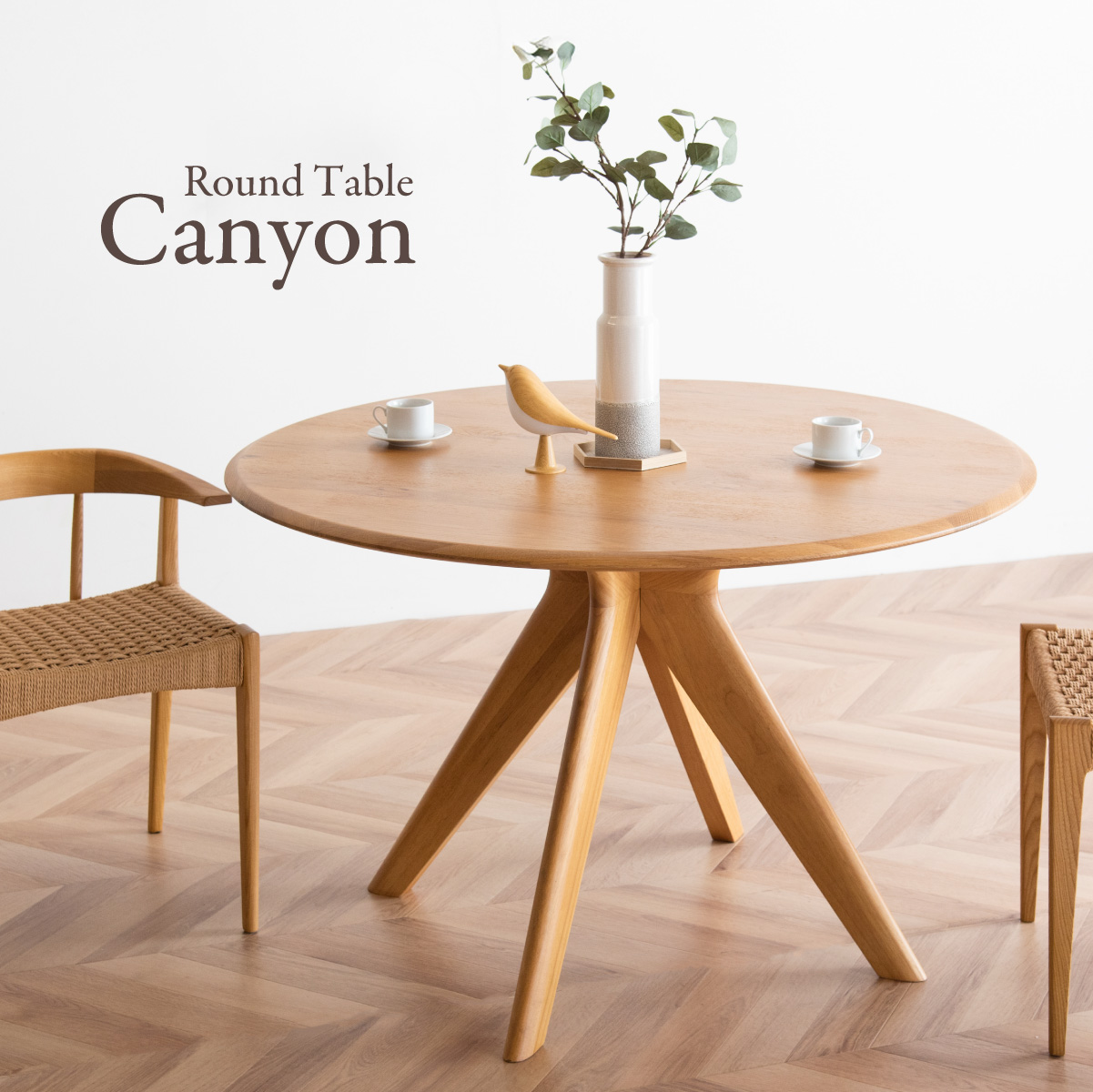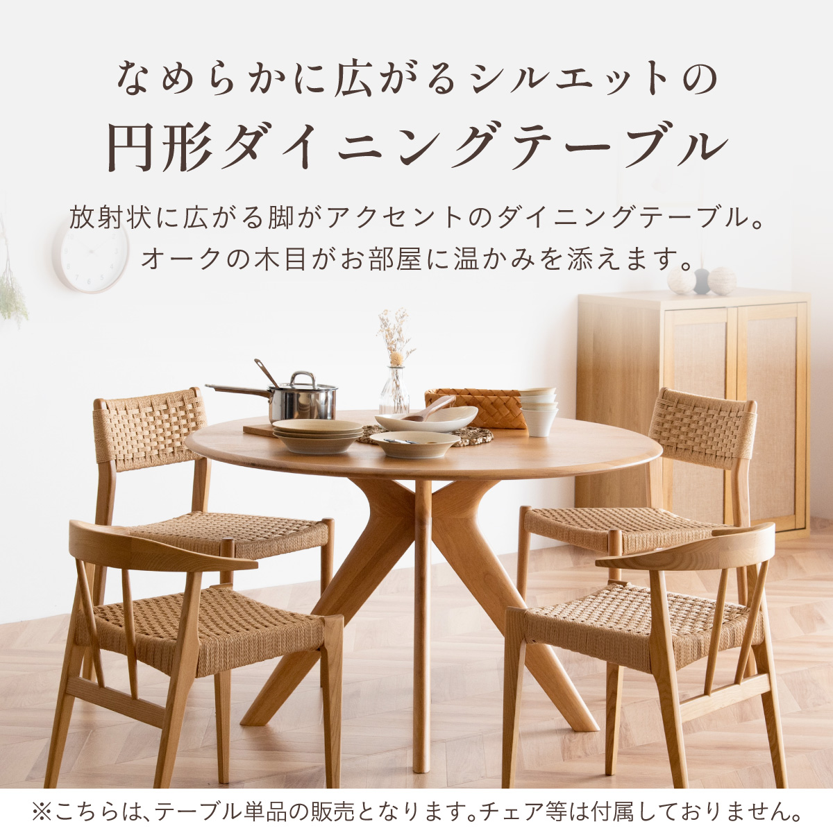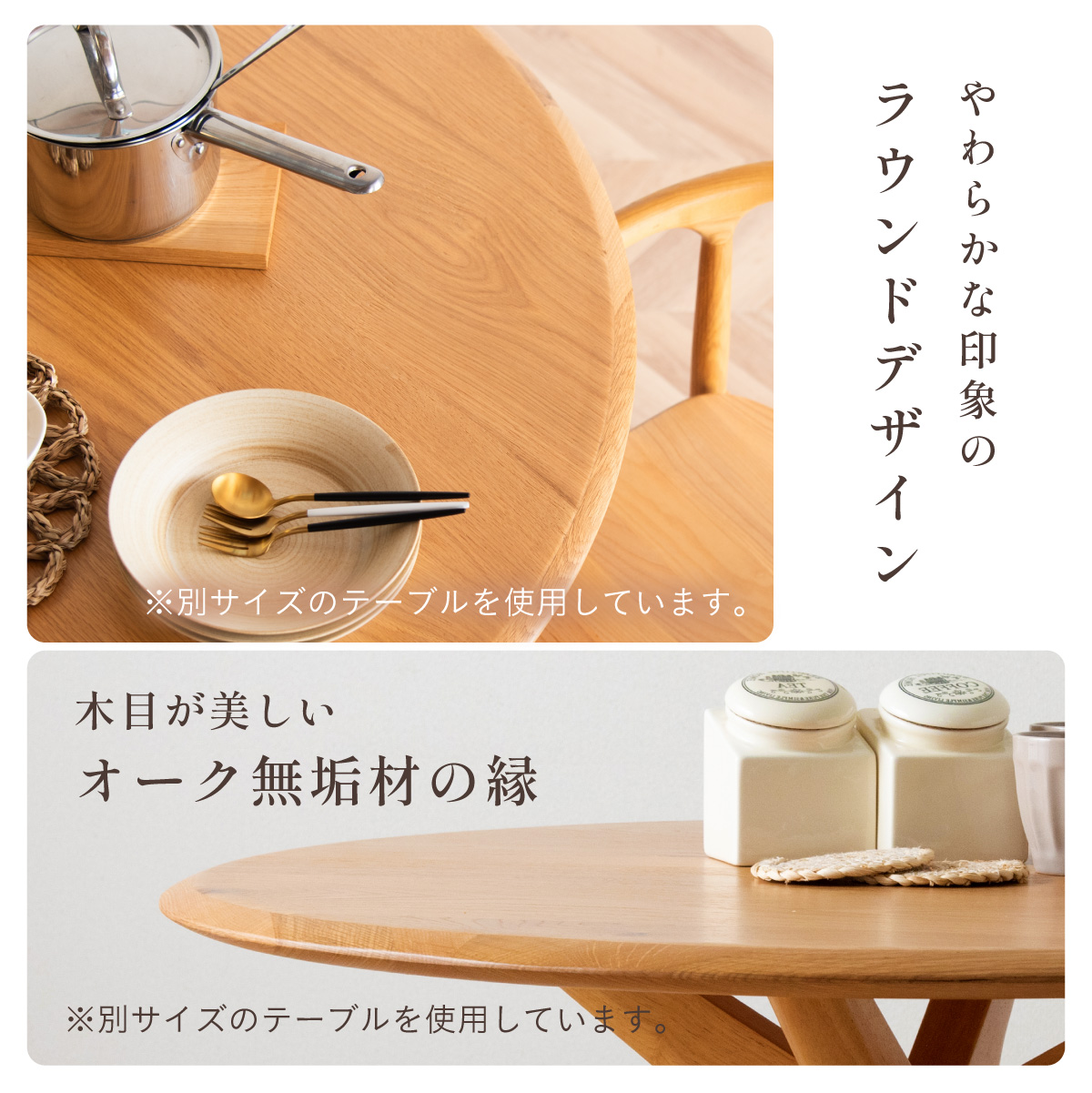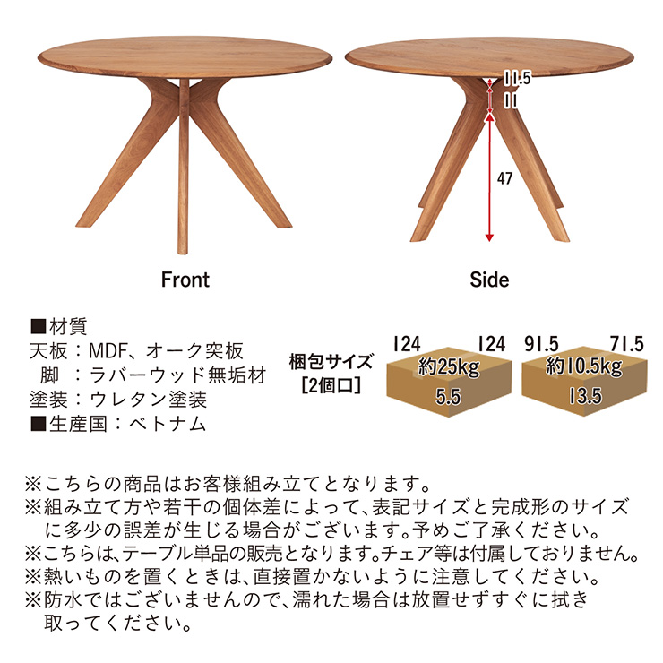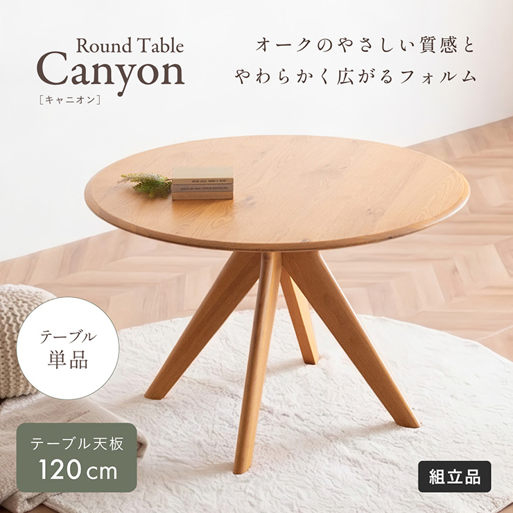 | サイズが選べるオーク突板のラウンドダイニングテーブル Canyon(キャニオン) 天板幅120cm 家族が自然に集まり、会話が広がるお部屋の中心に 家族のかたちに合わせられる3つの天板幅90・110・120cm ※当ページは幅120cmのサイズになります。 やわらかな印象のラウンドデザイン 厚さ25mmの天板 ■4〜6人でもゆったり囲める120cmの天板 大皿や鍋を置いても余裕のある広さ。家族の食卓はもちろん、来客時も自然に囲めます。 ■まるで無垢のような天板 通常より厚い1mm突板を使い、割れや節など無垢材のような自然な味わいを楽しめます。 ■彫刻のように美しい放射状の脚デザイン 中央からすっと伸びる脚が、空間に軽やかな抜け感と上質な存在感を生み出します。 ■環境にやさしいラバーウッド脚 ゴムの木(ラバーウッド)を再利用したサステナブル素材。 適度な硬さで安定感があり、やさしい木目が空間になじみます。 足元にゆとりがあるからチェアからの出入りが簡単 がたつき防止のアジャスター付き 天板裏には反り止め防止のプレート ※こちらの商品はお客様組み立てとなります。 ※組み立て方や若干の個体差によって、表記サイズと完成形のサイズに多少の誤差が生じる場合がございます。予めご了承ください。 | |