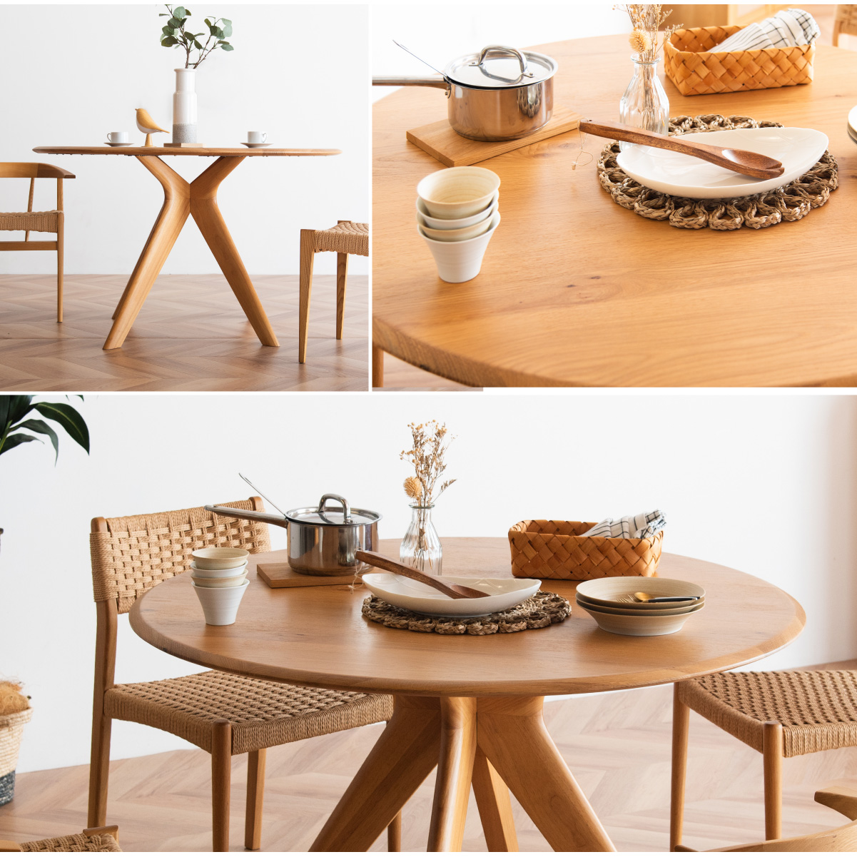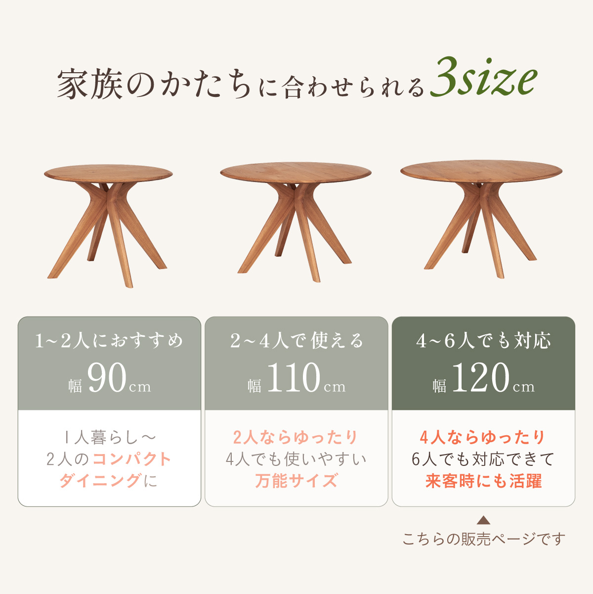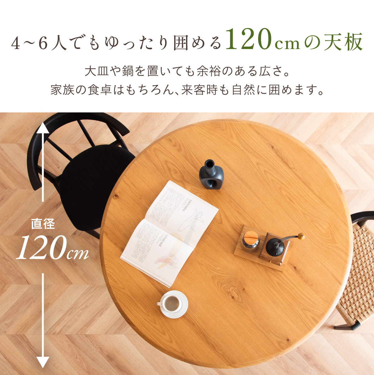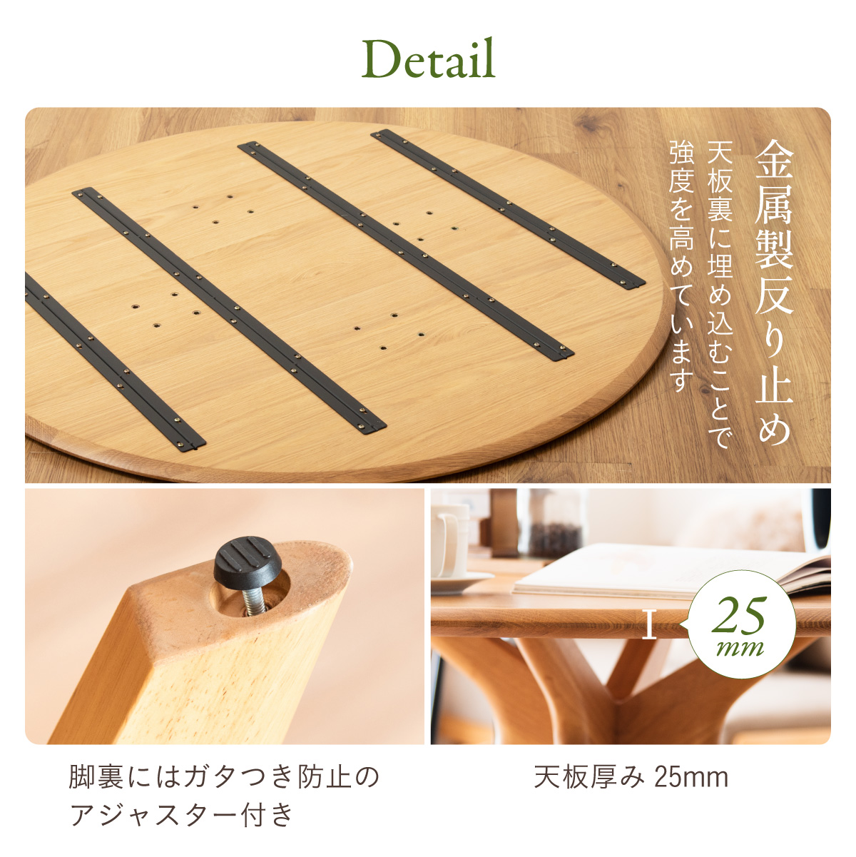| サイズが選べるオーク突板のラウンドダイニングテーブル Canyon(キャニオン) 天板幅120cm 家族が自然に集まり、会話が広がるお部屋の中心に 家族のかたちに合わせられる3つの天板幅90・110・120cm ※当ページは幅120cmのサイズになります。 やわらかな印象のラウンドデザイン 厚さ25mmの天板 ■4〜6人でもゆったり囲める120cmの天板 大皿や鍋を置いても余裕のある広さ。家族の食卓はもちろん、来客時も自然に囲めます。 ■まるで無垢のような天板 通常より厚い1mm突板を使い、割れや節など無垢材のような自然な味わいを楽しめます。 ■彫刻のように美しい放射状の脚デザイン 中央からすっと伸びる脚が、空間に軽やかな抜け感と上質な存在感を生み出します。 ■環境にやさしいラバーウッド脚 ゴムの木(ラバーウッド)を再利用したサステナブル素材。 適度な硬さで安定感があり、やさしい木目が空間になじみます。 足元にゆとりがあるからチェアからの出入りが簡単 がたつき防止のアジャスター付き 天板裏には反り止め防止のプレート ※こちらの商品はお客様組み立てとなります。 ※組み立て方や若干の個体差によって、表記サイズと完成形のサイズに多少の誤差が生じる場合がございます。予めご了承ください。 | |