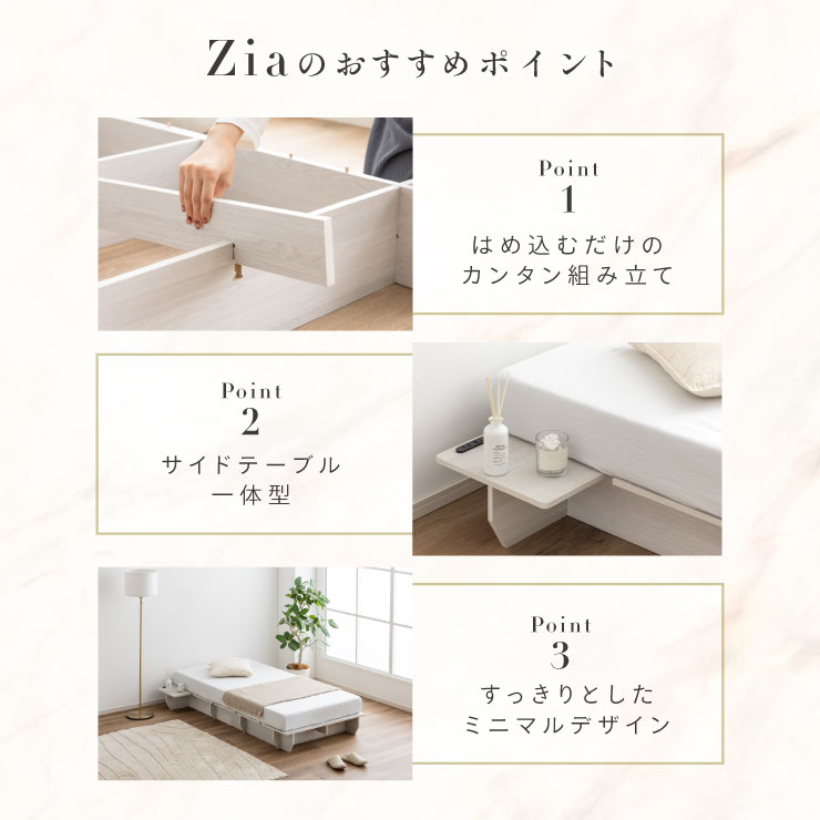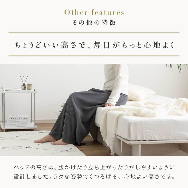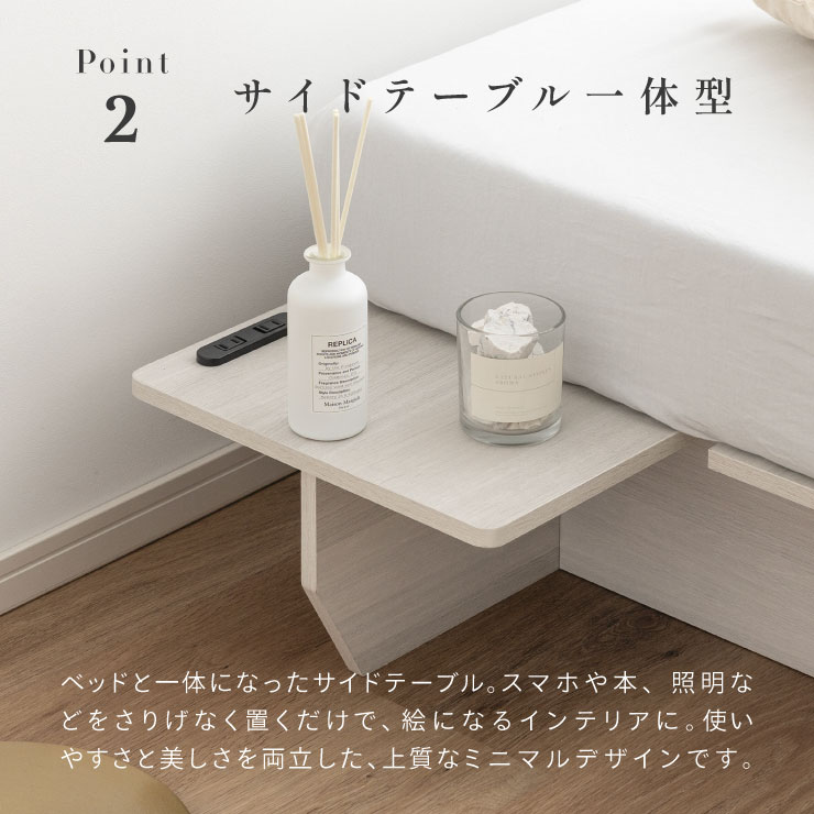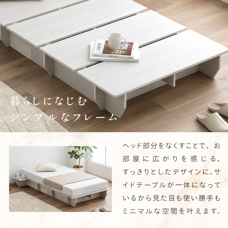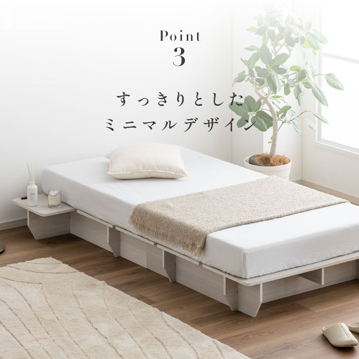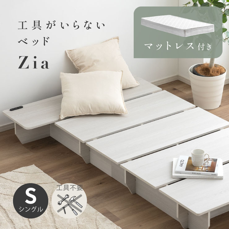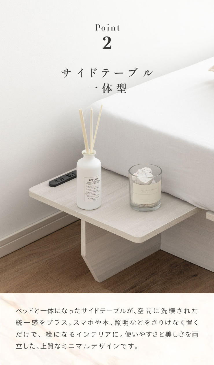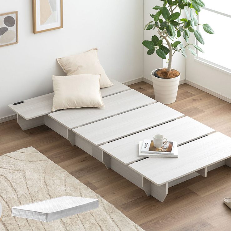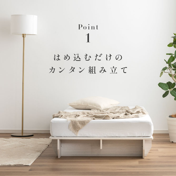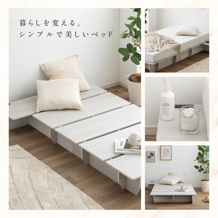 | ベッドフレーム Zia(ジア)+マットレスセット Ciel(シエル) 暮らしを変える、シンプルで美しいベッド Ziaのおすすめポイント ・はめ込むだけのカンタン組み立て ・サイドテーブル一体型 ・すっきりとしたミニマルデザイン ■工具不要のカンタン組み立て 板をはめ込んでいくだけなので、ネジもドライバーも六角も不要!パズル感覚で組み立てできます。 ■パーツはこれだけ パーツの種類が少ないので、組み立てが苦手な方や初心者さんでも安心! ネジや工具を使わずに、差し込むだけで組み立てができるので、組み立てに不慣れな方にもおすすめです。 ■サイドテーブル一体型 ベッドと一体になったサイドテーブル。 スマホや本、照明などをさりげなく置くだけで、絵になるインテリアに。 使いやすさと美しさを両立した、上質なミニマルデザインです。 ■寝る前の時間も、もっと快適に。コンセント・照明付きのヘッドボード 寝る前に読みたい本屋、メガネ・スマホなどの小物をサッと置ける便利な宮付き。 ベッドまわりがすっきり片付き、毎日の寝室時間がより快適に。 ■便利な2口コンセント付き サイドテーブルには便利なコンセント付き スマホを充電したり、ライトを灯したり。 ベッドまわりが更に快適になります。 コンセント部分は未使用時にすっきり閉じられる、スライドカバー仕様。 ほこりが入りにくく安全です。 スマホの充電にぴったりのサイズ感。 毎日の暮らしにちょうどいい、うれしいポイントです。 ■サイドテーブル・コンセントは組み立て時に左右を選べます。 サイドテーブル+コンセントは、インテリアに合わせて左右どちらにも設置可能。 お部屋のレイアウトやコンセント位置に合わせて、使いやすく配置できます。 ■暮らしになじむシンプルなフレーム ヘッド部分をなくすことで、お部屋に広がりを感じる、すっきりとしたデザインに。 サイドテーブルが一体になっているから見た目も使い勝手もミニマルな空間を叶えます。 ■床板の角は面取り加工済み 上には面取り加工を施し、手触りの良さと安全性を高めました。 見た目も上品な印象に仕上がっています。 ■空間を明るく、すっきりと見せるホワイトウォッシュ 白木のようなやわらかな色合いが特徴のホワイトウォッシュ。 素材の温もりを感じながらも、軽やかで洗練された印象に。 リアルな木目を再現した強化シート仕様なので、天然木のようなやさしい風合いを楽しめてお手入れがラクラクです。 ■ちょうどいい高さで、毎日がもっと心地よく ベッドの高さは、腰かけたり立ち上がったりがしやすいように設計しました。 ラクな姿勢でくつろげる、心地よい高さです。 高さをおさえたデザインだから、圧迫感がなく空間がすっきり。 お部屋全体が広く、開放的に感じられます。 通気性に優れた、すのこ仕様。 湿気を逃して、布団の蒸れを防ぎます。 季節を問わず、さらっと快適な寝心地に。 しっかり支える、安心の耐荷重 見た目はすっきりしていても、耐荷重は約200kg。 安定感のある寝心地を叶えます。 ※こちらの商品はお客様組み立てとなります。 ※こちらはベッドルーム+マットレスのセットの商品ページとなります。 ※組み立て方や若干の個体差によって、表記サイズと完成形のサイズに多少の誤差が生じる場合がございます。あらかじめご了承ください。 ※マットレスの幅をぴったりに置きたい場合、1サイズ上げたサイズをご購入ください。 ※お掃除ロボットを使用する場合は、高さをご確認ください。 ※圧縮袋は一度開封すると再圧縮できません。 ※開封する際はハサミを使用し、ケガ等に十分気をつけながら行ってください。 ※開封後約1~2日で本来の大きさに復元します。 ※サイズには多少の誤差が生じる場合がございます。 ※マットレスを干す際、日光にさらし続けると変色を起こす恐れがありますので、ご注意ください。 ※布団乾燥機のご使用はお避け下さい。 ※普段のお手入れは、柔らかい布地で乾拭きしてください。 ※ご使用の際にはカバーや敷きバッド等を合わせてお使い下さい。 ※商品ページの画像内には一部サイズ違いのものを使用しております。 ※マットレスは3か月を目安に頭と足元側を回転して、入れ替えていただくことをおすすめします。また喚起をこまめに行うことで、より長くお使いいただけます。 ※当マットレスは片面仕様です。裏返してご使用はできません。 | |