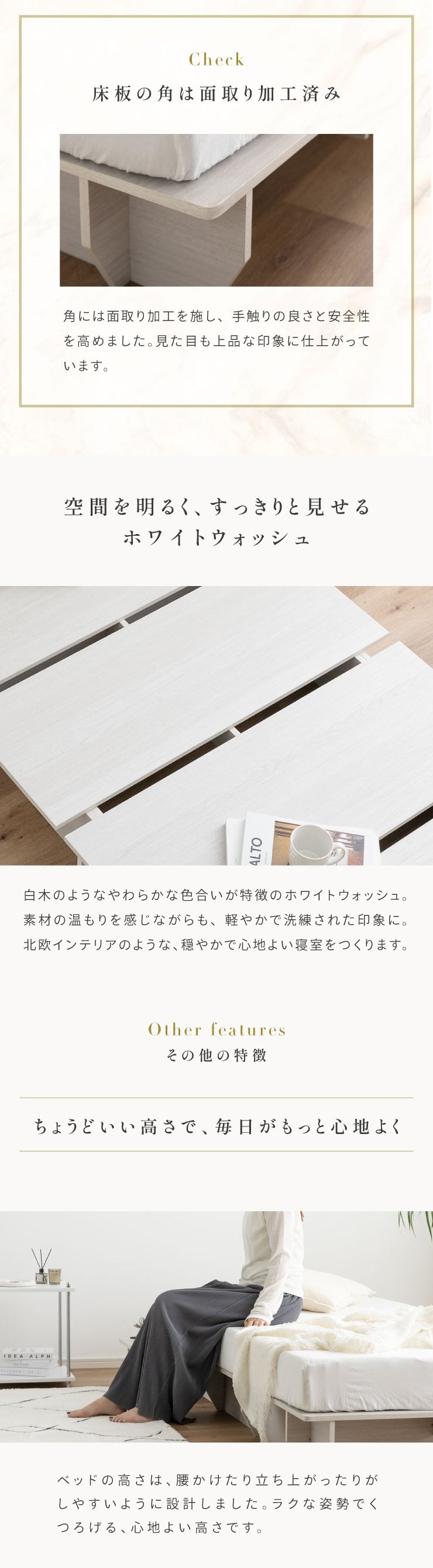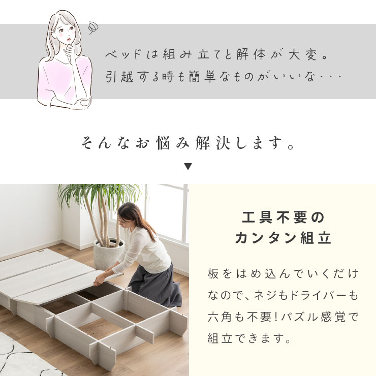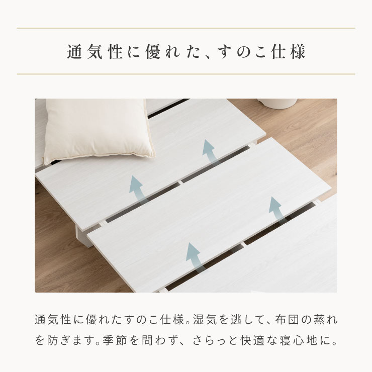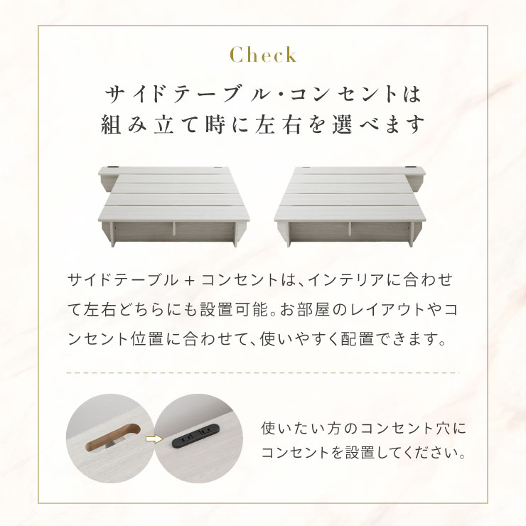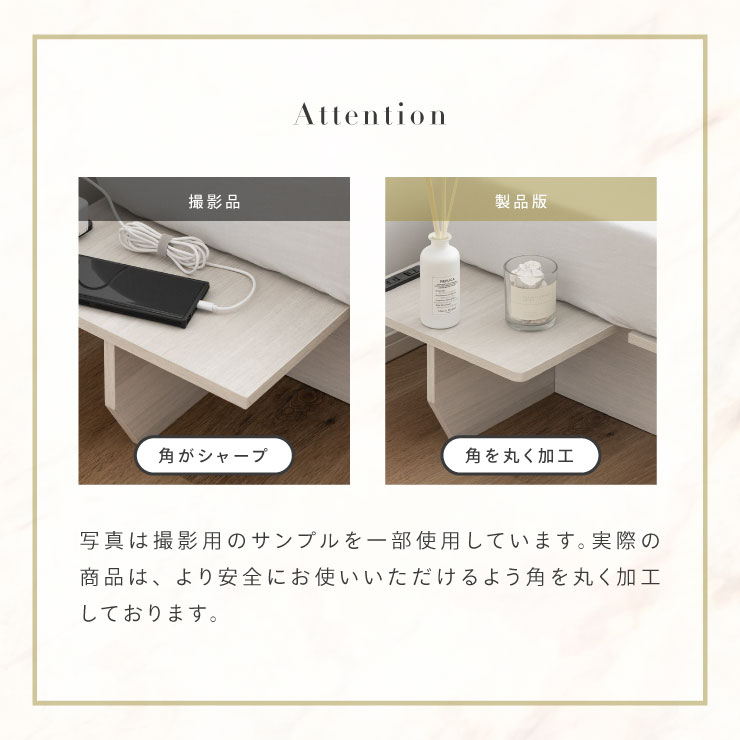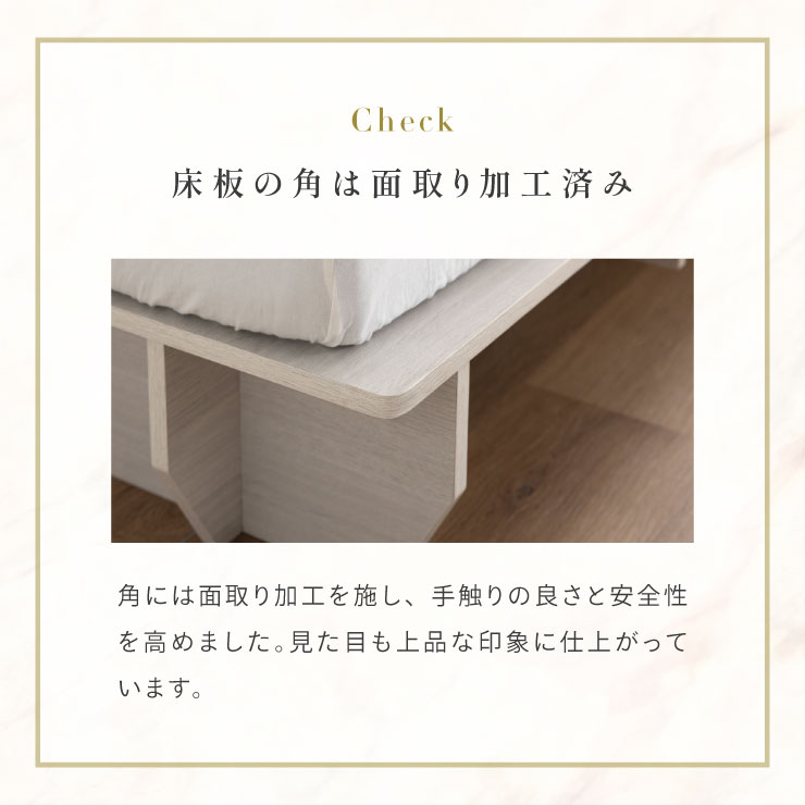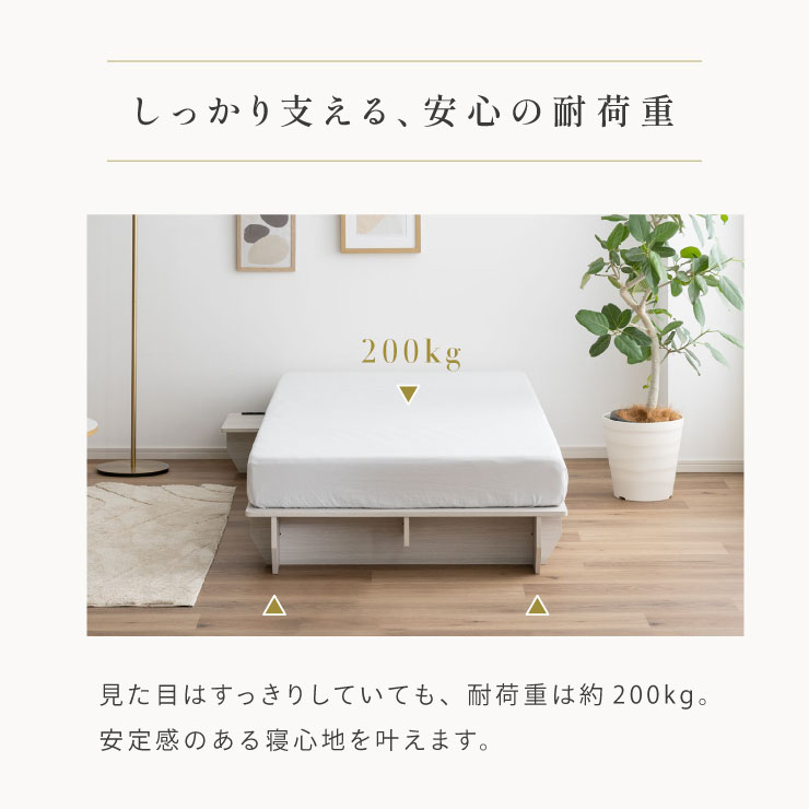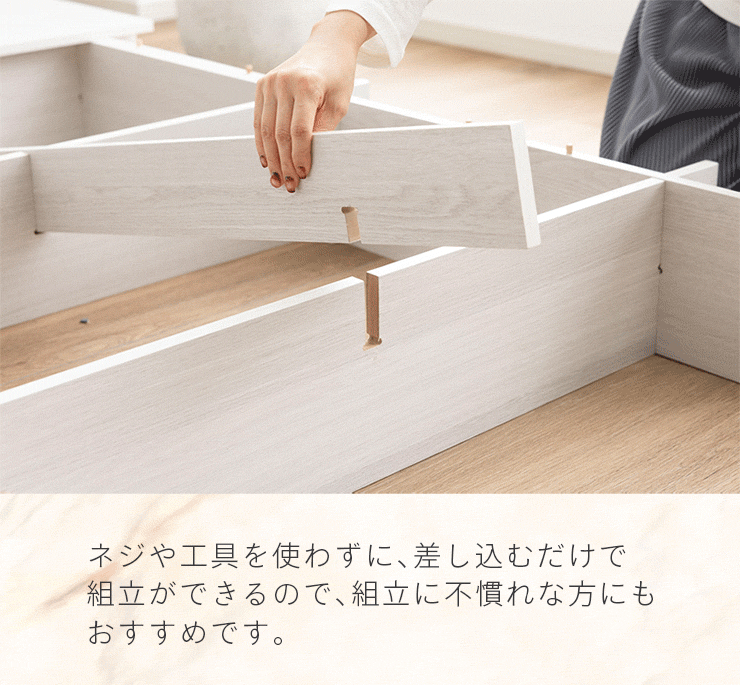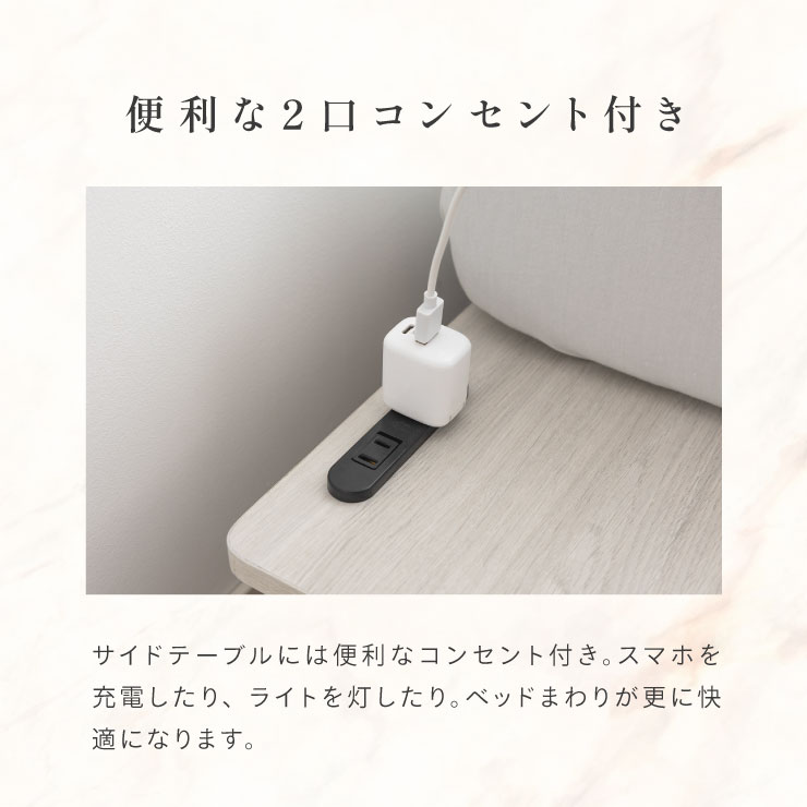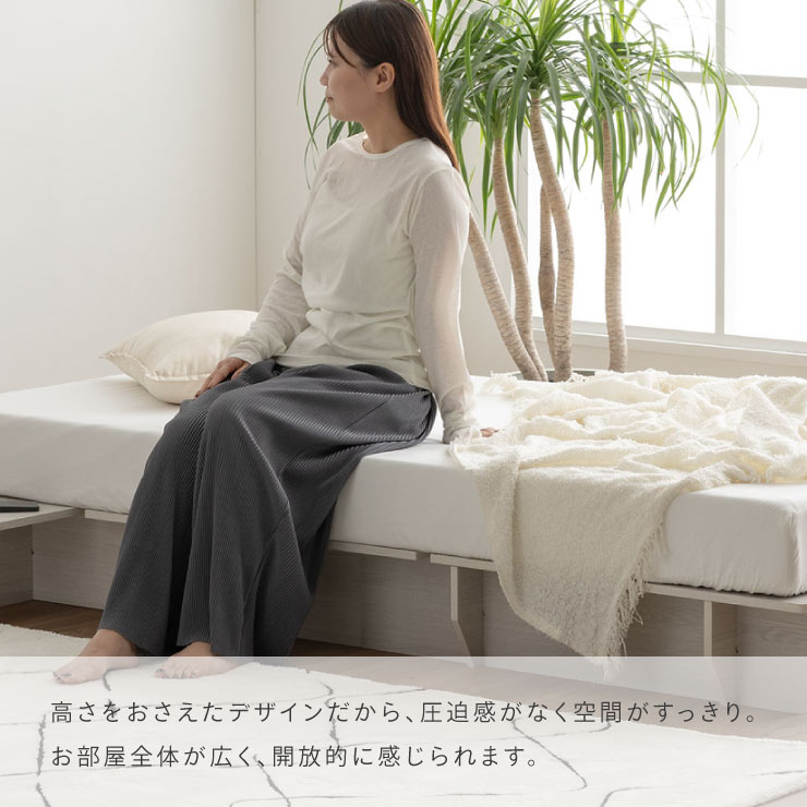 | ベッドフレーム Zia(ジア)+マットレスセット Ciel(シエル) 暮らしを変える、シンプルで美しいベッド Ziaのおすすめポイント ・はめ込むだけのカンタン組み立て ・サイドテーブル一体型 ・すっきりとしたミニマルデザイン ■工具不要のカンタン組み立て 板をはめ込んでいくだけなので、ネジもドライバーも六角も不要!パズル感覚で組み立てできます。 ■パーツはこれだけ パーツの種類が少ないので、組み立てが苦手な方や初心者さんでも安心! ネジや工具を使わずに、差し込むだけで組み立てができるので、組み立てに不慣れな方にもおすすめです。 ■サイドテーブル一体型 ベッドと一体になったサイドテーブル。 スマホや本、照明などをさりげなく置くだけで、絵になるインテリアに。 使いやすさと美しさを両立した、上質なミニマルデザインです。 ■寝る前の時間も、もっと快適に。コンセント・照明付きのヘッドボード 寝る前に読みたい本屋、メガネ・スマホなどの小物をサッと置ける便利な宮付き。 ベッドまわりがすっきり片付き、毎日の寝室時間がより快適に。 ■便利な2口コンセント付き サイドテーブルには便利なコンセント付き スマホを充電したり、ライトを灯したり。 ベッドまわりが更に快適になります。 コンセント部分は未使用時にすっきり閉じられる、スライドカバー仕様。 ほこりが入りにくく安全です。 スマホの充電にぴったりのサイズ感。 毎日の暮らしにちょうどいい、うれしいポイントです。 ■サイドテーブル・コンセントは組み立て時に左右を選べます。 サイドテーブル+コンセントは、インテリアに合わせて左右どちらにも設置可能。 お部屋のレイアウトやコンセント位置に合わせて、使いやすく配置できます。 ■暮らしになじむシンプルなフレーム ヘッド部分をなくすことで、お部屋に広がりを感じる、すっきりとしたデザインに。 サイドテーブルが一体になっているから見た目も使い勝手もミニマルな空間を叶えます。 ■床板の角は面取り加工済み 上には面取り加工を施し、手触りの良さと安全性を高めました。 見た目も上品な印象に仕上がっています。 ■空間を明るく、すっきりと見せるホワイトウォッシュ 白木のようなやわらかな色合いが特徴のホワイトウォッシュ。 素材の温もりを感じながらも、軽やかで洗練された印象に。 リアルな木目を再現した強化シート仕様なので、天然木のようなやさしい風合いを楽しめてお手入れがラクラクです。 ■ちょうどいい高さで、毎日がもっと心地よく ベッドの高さは、腰かけたり立ち上がったりがしやすいように設計しました。 ラクな姿勢でくつろげる、心地よい高さです。 高さをおさえたデザインだから、圧迫感がなく空間がすっきり。 お部屋全体が広く、開放的に感じられます。 通気性に優れた、すのこ仕様。 湿気を逃して、布団の蒸れを防ぎます。 季節を問わず、さらっと快適な寝心地に。 しっかり支える、安心の耐荷重 見た目はすっきりしていても、耐荷重は約200kg。 安定感のある寝心地を叶えます。 ※こちらの商品はお客様組み立てとなります。 ※こちらはベッドルーム+マットレスのセットの商品ページとなります。 ※組み立て方や若干の個体差によって、表記サイズと完成形のサイズに多少の誤差が生じる場合がございます。あらかじめご了承ください。 ※マットレスの幅をぴったりに置きたい場合、1サイズ上げたサイズをご購入ください。 ※お掃除ロボットを使用する場合は、高さをご確認ください。 ※圧縮袋は一度開封すると再圧縮できません。 ※開封する際はハサミを使用し、ケガ等に十分気をつけながら行ってください。 ※開封後約1~2日で本来の大きさに復元します。 ※サイズには多少の誤差が生じる場合がございます。 ※マットレスを干す際、日光にさらし続けると変色を起こす恐れがありますので、ご注意ください。 ※布団乾燥機のご使用はお避け下さい。 ※普段のお手入れは、柔らかい布地で乾拭きしてください。 ※ご使用の際にはカバーや敷きバッド等を合わせてお使い下さい。 ※商品ページの画像内には一部サイズ違いのものを使用しております。 ※マットレスは3か月を目安に頭と足元側を回転して、入れ替えていただくことをおすすめします。また喚起をこまめに行うことで、より長くお使いいただけます。 ※当マットレスは片面仕様です。裏返してご使用はできません。 | |