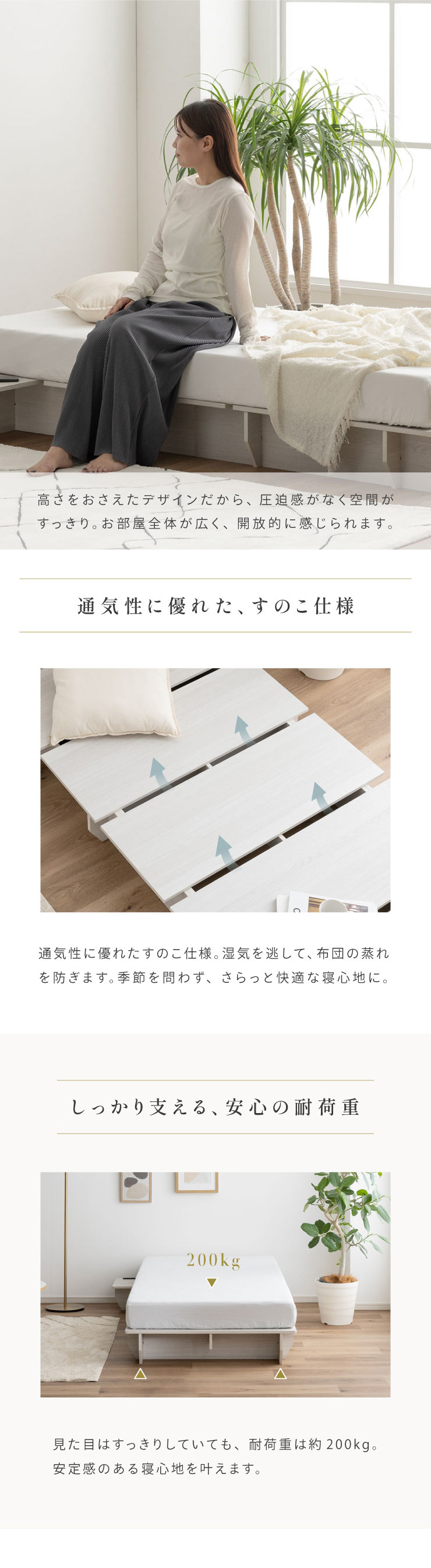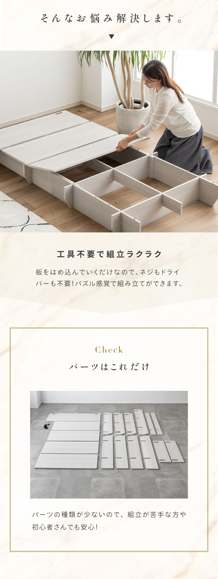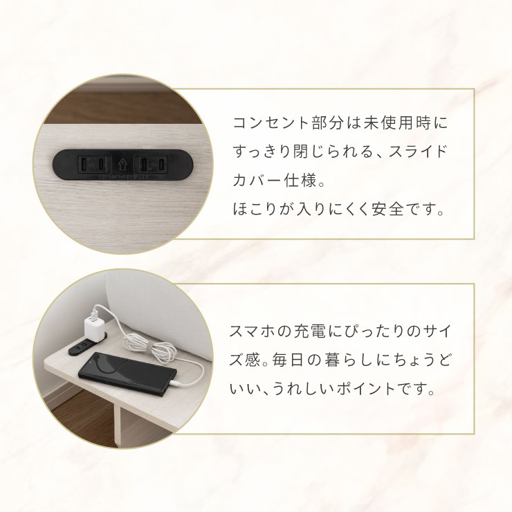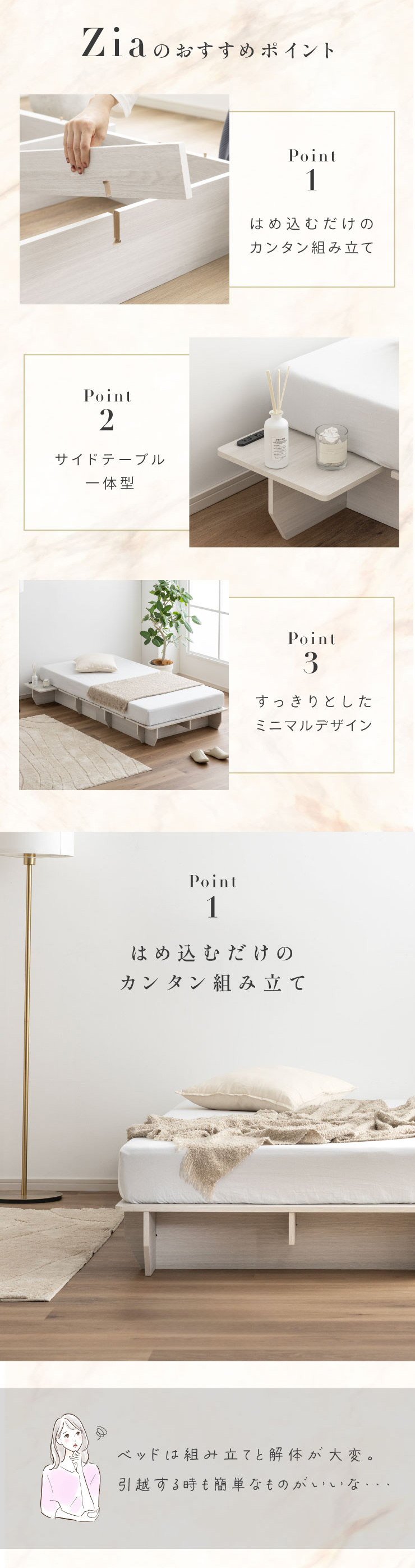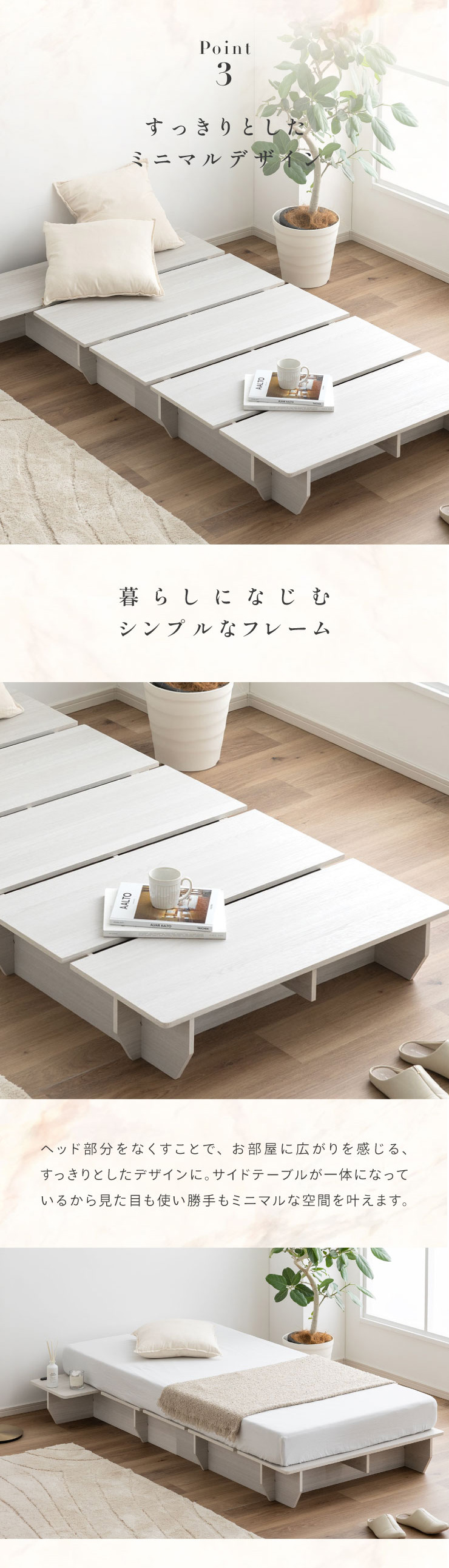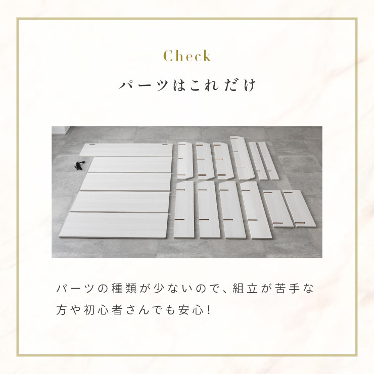 | ベッドフレーム Zia(ジア)+マットレスセット Ciel(シエル) 暮らしを変える、シンプルで美しいベッド Ziaのおすすめポイント ・はめ込むだけのカンタン組み立て ・サイドテーブル一体型 ・すっきりとしたミニマルデザイン ■工具不要のカンタン組み立て 板をはめ込んでいくだけなので、ネジもドライバーも六角も不要!パズル感覚で組み立てできます。 ■パーツはこれだけ パーツの種類が少ないので、組み立てが苦手な方や初心者さんでも安心! ネジや工具を使わずに、差し込むだけで組み立てができるので、組み立てに不慣れな方にもおすすめです。 ■サイドテーブル一体型 ベッドと一体になったサイドテーブル。 スマホや本、照明などをさりげなく置くだけで、絵になるインテリアに。 使いやすさと美しさを両立した、上質なミニマルデザインです。 ■寝る前の時間も、もっと快適に。コンセント・照明付きのヘッドボード 寝る前に読みたい本屋、メガネ・スマホなどの小物をサッと置ける便利な宮付き。 ベッドまわりがすっきり片付き、毎日の寝室時間がより快適に。 ■便利な2口コンセント付き サイドテーブルには便利なコンセント付き スマホを充電したり、ライトを灯したり。 ベッドまわりが更に快適になります。 コンセント部分は未使用時にすっきり閉じられる、スライドカバー仕様。 ほこりが入りにくく安全です。 スマホの充電にぴったりのサイズ感。 毎日の暮らしにちょうどいい、うれしいポイントです。 ■サイドテーブル・コンセントは組み立て時に左右を選べます。 サイドテーブル+コンセントは、インテリアに合わせて左右どちらにも設置可能。 お部屋のレイアウトやコンセント位置に合わせて、使いやすく配置できます。 ■暮らしになじむシンプルなフレーム ヘッド部分をなくすことで、お部屋に広がりを感じる、すっきりとしたデザインに。 サイドテーブルが一体になっているから見た目も使い勝手もミニマルな空間を叶えます。 ■床板の角は面取り加工済み 上には面取り加工を施し、手触りの良さと安全性を高めました。 見た目も上品な印象に仕上がっています。 ■空間を明るく、すっきりと見せるホワイトウォッシュ 白木のようなやわらかな色合いが特徴のホワイトウォッシュ。 素材の温もりを感じながらも、軽やかで洗練された印象に。 リアルな木目を再現した強化シート仕様なので、天然木のようなやさしい風合いを楽しめてお手入れがラクラクです。 ■ちょうどいい高さで、毎日がもっと心地よく ベッドの高さは、腰かけたり立ち上がったりがしやすいように設計しました。 ラクな姿勢でくつろげる、心地よい高さです。 高さをおさえたデザインだから、圧迫感がなく空間がすっきり。 お部屋全体が広く、開放的に感じられます。 通気性に優れた、すのこ仕様。 湿気を逃して、布団の蒸れを防ぎます。 季節を問わず、さらっと快適な寝心地に。 しっかり支える、安心の耐荷重 見た目はすっきりしていても、耐荷重は約200kg。 安定感のある寝心地を叶えます。 ※こちらの商品はお客様組み立てとなります。 ※こちらはベッドルーム+マットレスのセットの商品ページとなります。 ※組み立て方や若干の個体差によって、表記サイズと完成形のサイズに多少の誤差が生じる場合がございます。あらかじめご了承ください。 ※マットレスの幅をぴったりに置きたい場合、1サイズ上げたサイズをご購入ください。 ※お掃除ロボットを使用する場合は、高さをご確認ください。 ※圧縮袋は一度開封すると再圧縮できません。 ※開封する際はハサミを使用し、ケガ等に十分気をつけながら行ってください。 ※開封後約1~2日で本来の大きさに復元します。 ※サイズには多少の誤差が生じる場合がございます。 ※マットレスを干す際、日光にさらし続けると変色を起こす恐れがありますので、ご注意ください。 ※布団乾燥機のご使用はお避け下さい。 ※普段のお手入れは、柔らかい布地で乾拭きしてください。 ※ご使用の際にはカバーや敷きバッド等を合わせてお使い下さい。 ※商品ページの画像内には一部サイズ違いのものを使用しております。 ※マットレスは3か月を目安に頭と足元側を回転して、入れ替えていただくことをおすすめします。また喚起をこまめに行うことで、より長くお使いいただけます。 ※当マットレスは片面仕様です。裏返してご使用はできません。 | |