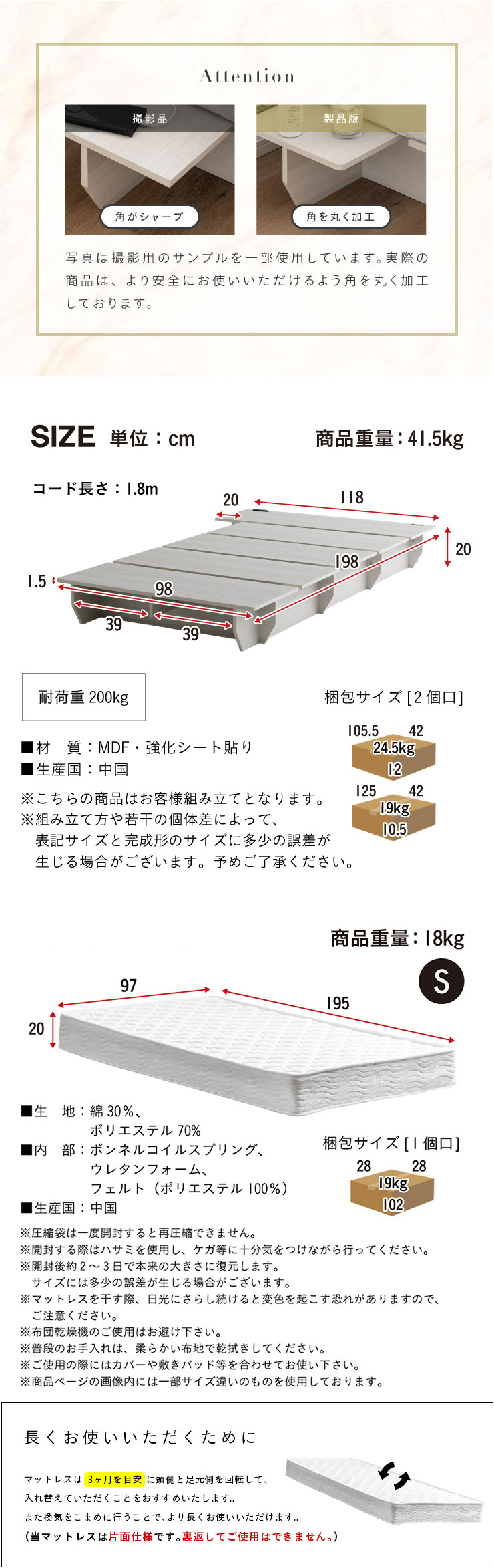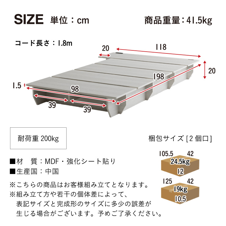 | サイズ | 【ベッド】 本体:約W118 x D198 x H20cm(重量:41.5kg) 耐荷重:200kg 【マットレス】 本体:約W97 x D195 x H20cm(重量:18kg) |
