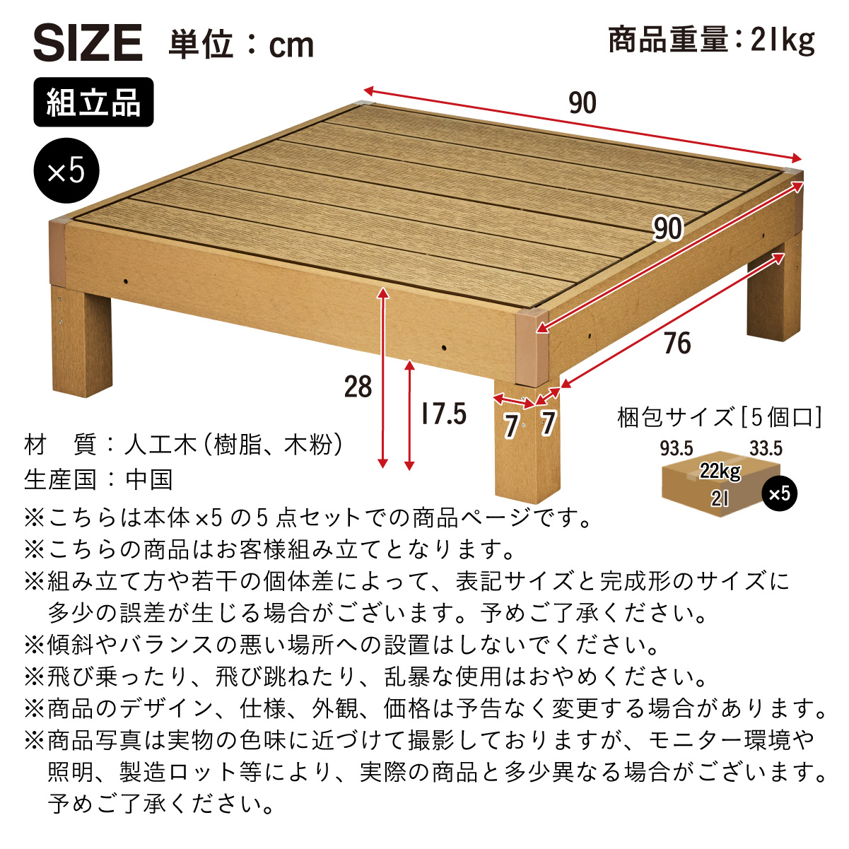 | 商品サイズ | W90 x D90 x H28cm(商品重量:21kg)×5 |