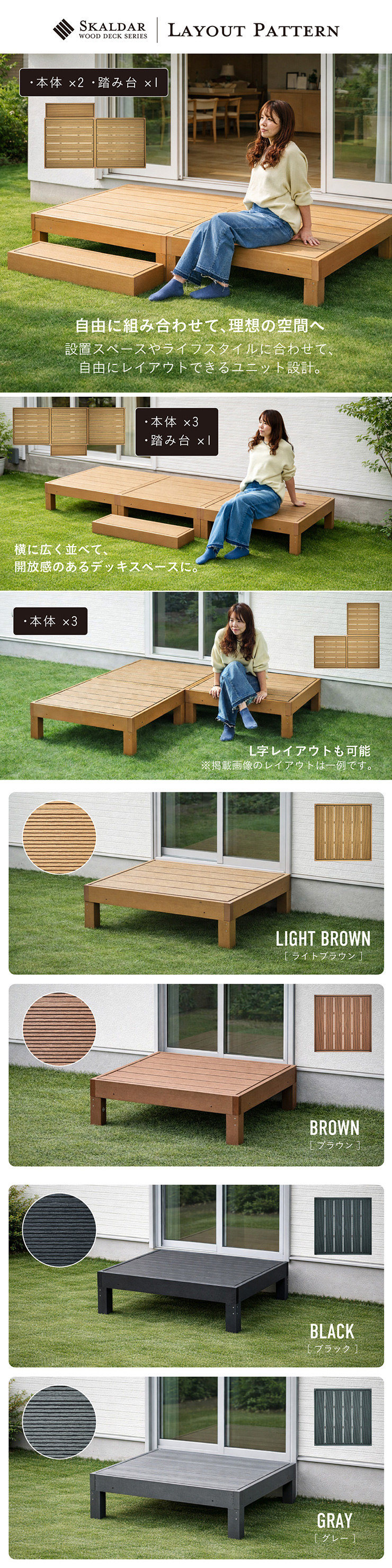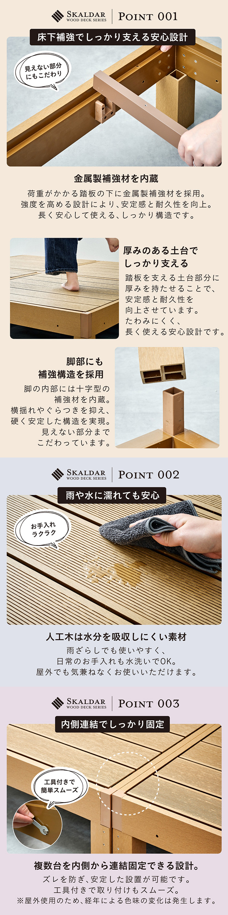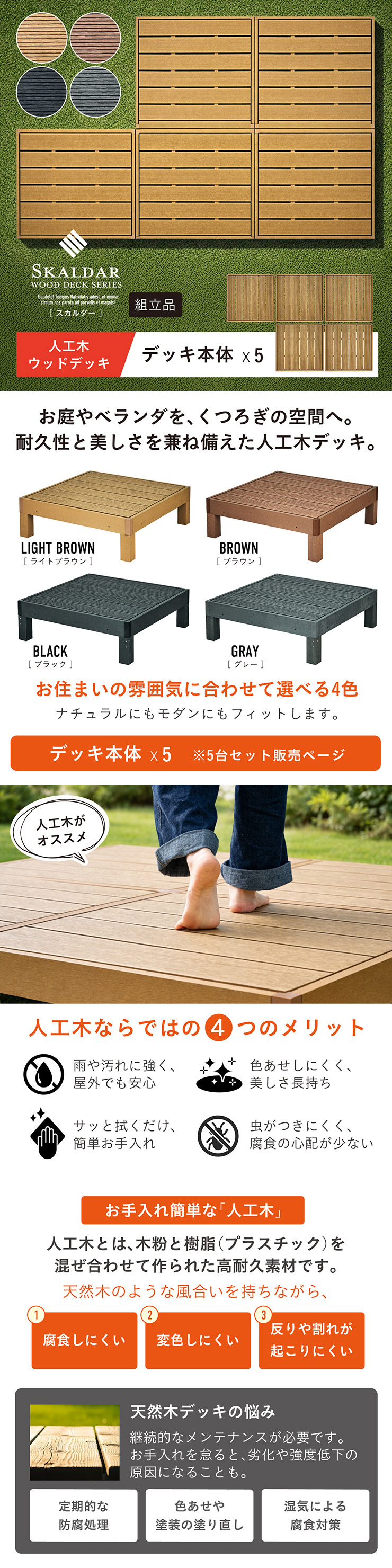 | 人工木ウッドデッキ Skaldar(スカルダー) デッキ本体5個セット お庭やベランダを、くつろぎの空間へ。 耐久性と美しさを兼ね揃えた人工木デッキ。 お住まいの雰囲気に合わせて選べる4色 ナチュラルもモダンにもフィットします。 ■人工木ならではの4つのメリット ・雨や汚れに強く、屋外でも安心 ・色あせしにくく美しさ長持ち ・サッと拭くだけ、簡単お手入れ ・虫がつきにくく、腐食の心配が少ない ■お手入れ簡単な「人工木」 人工木とは、木粉と樹脂(プラスチック)を混ぜ合わせて作られた高耐久素材です。 天然木のような風合いを持ちながら、腐食しにくい・変色しにくい・反りや割れが起こりにくい 天然木デッキの悩み 持続的なメンテナンスが必要です。 お手入れを怠ると、劣化や強度低下の原因になることも。 ・定期的な防腐処理 ・色あせや塗装の塗り直し ・湿気による腐食対策 ■床下補強でしっかり支える安心設計 負荷がかかる踏板の下に金属製補強材を採用。 強度を高める設計により、安定感と耐久性を向上。 長く安心して使える、しっかり構造です。 ■厚みのある土台でしっかり支える 踏板を支える土台部分に厚みを持たせることで、安定感と耐久性を向上させています。 たわみにくく、長く使える安心設計です。 ■脚部にも補強構造を採用 脚の内部には十字型の補強材を内蔵。 横揺れやぐらつきを抑え、硬く安定した構造を実現。 見えない部分までこだわっています。 ■雨や水に濡れても安心 人工木は水分を吸収しにくい素材 雨ざらしでも使いやすく、日常のお手入れも水洗いでOK。 屋外でも気兼ねなくお使いいただけます。 ■内部連結でしっかり固定 複数台を内側から連結固定できる設計。 ズレを防ぎ、安定した設置が可能です。 工具付きで取り付けもスムーズ。 ※屋外使用のため、経年による色味の変化は発生します。 自由に組み合わせて、理想の空間へ 設置スペースやライフスタイルに合わせて、自由にレイアウトできるユニット設計。 横に広く並べて、開放感のあるデッキスペースに。 L字レイアウトも可能 ※掲載画像のレイアウトは一例です。 ※こちらは本体5点セットでの商品ページです。 ※こちらの商品はお客様組み立てとなります。 ※組み立て方や若干の個体差によって、表記サイズと完成形のサイズに多少の誤差が生じる場合がございます。予めご了承ください。 ※傾斜やバランスの悪い場所への設置はしないでください。 ※飛び乗ったり、飛び跳ねたり、乱暴な使用はおやめください。 ※商品のデザイン、仕様、外観、価格は予告なく変更する場合があります。 ※商品写真は実物の色味に近づけて撮影しておりますが、モニター環境や照明、製造ロット等により、実際の商品と多少異なる場合がございます。あらかじめご了承ください。 | |