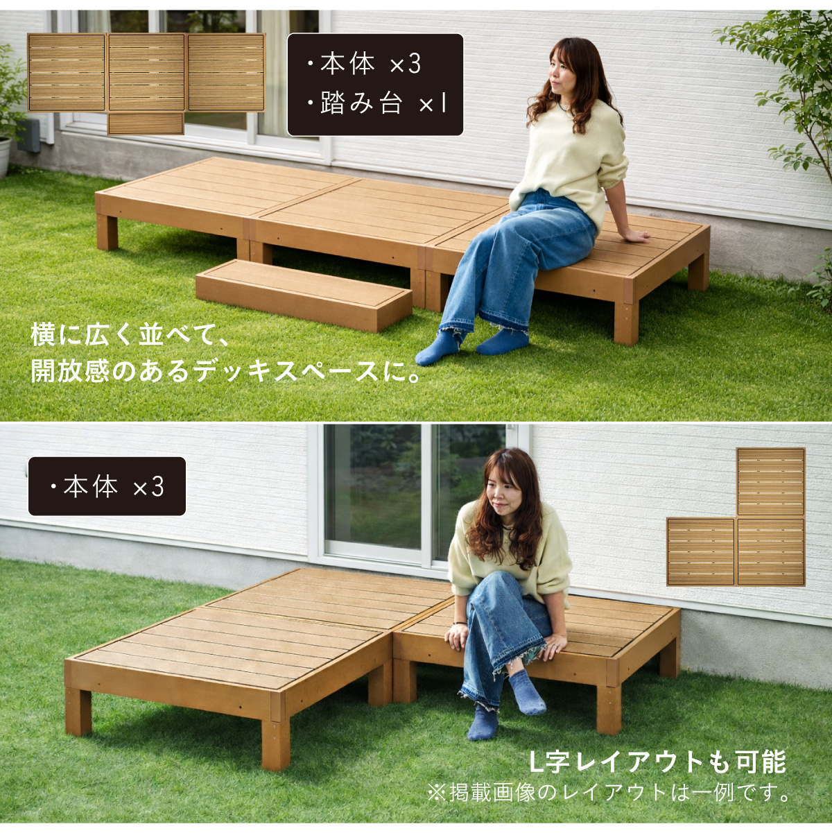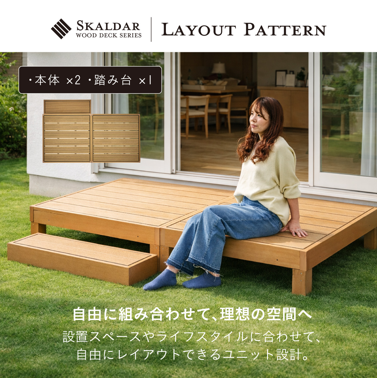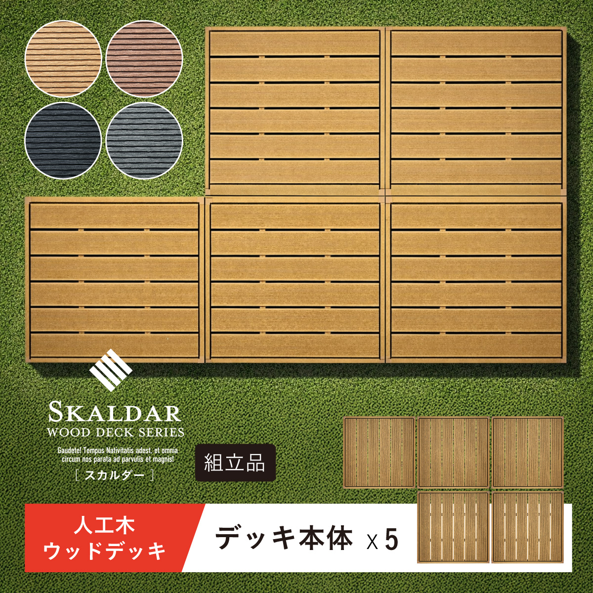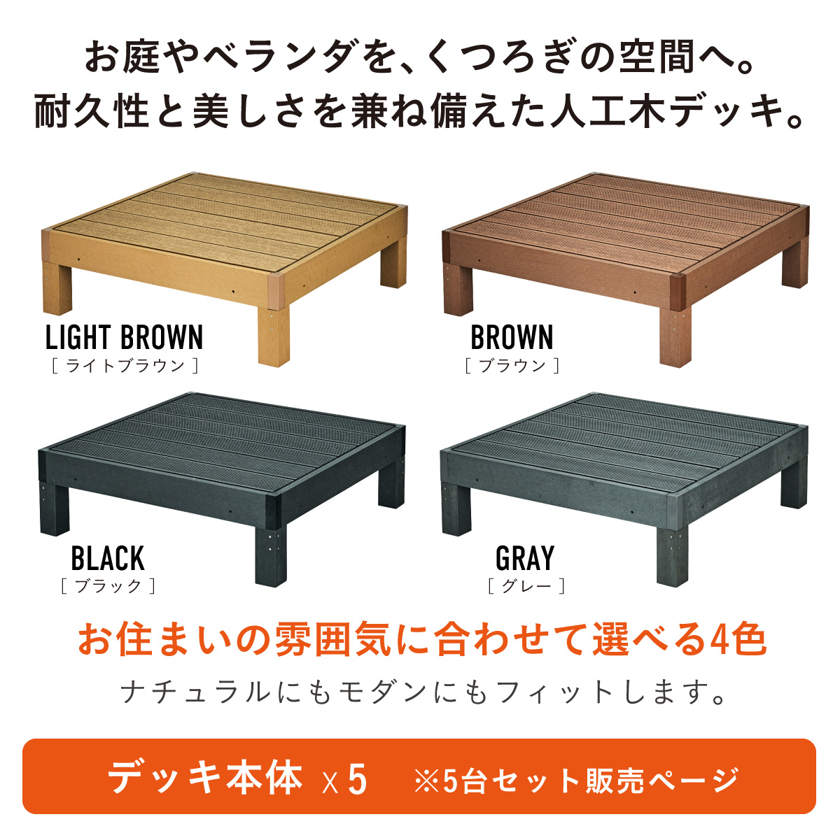 | 人工木ウッドデッキ Skaldar(スカルダー) デッキ本体5個セット お庭やベランダを、くつろぎの空間へ。 耐久性と美しさを兼ね揃えた人工木デッキ。 お住まいの雰囲気に合わせて選べる4色 ナチュラルもモダンにもフィットします。 ■人工木ならではの4つのメリット ・雨や汚れに強く、屋外でも安心 ・色あせしにくく美しさ長持ち ・サッと拭くだけ、簡単お手入れ ・虫がつきにくく、腐食の心配が少ない ■お手入れ簡単な「人工木」 人工木とは、木粉と樹脂(プラスチック)を混ぜ合わせて作られた高耐久素材です。 天然木のような風合いを持ちながら、腐食しにくい・変色しにくい・反りや割れが起こりにくい 天然木デッキの悩み 持続的なメンテナンスが必要です。 お手入れを怠ると、劣化や強度低下の原因になることも。 ・定期的な防腐処理 ・色あせや塗装の塗り直し ・湿気による腐食対策 ■床下補強でしっかり支える安心設計 負荷がかかる踏板の下に金属製補強材を採用。 強度を高める設計により、安定感と耐久性を向上。 長く安心して使える、しっかり構造です。 ■厚みのある土台でしっかり支える 踏板を支える土台部分に厚みを持たせることで、安定感と耐久性を向上させています。 たわみにくく、長く使える安心設計です。 ■脚部にも補強構造を採用 脚の内部には十字型の補強材を内蔵。 横揺れやぐらつきを抑え、硬く安定した構造を実現。 見えない部分までこだわっています。 ■雨や水に濡れても安心 人工木は水分を吸収しにくい素材 雨ざらしでも使いやすく、日常のお手入れも水洗いでOK。 屋外でも気兼ねなくお使いいただけます。 ■内部連結でしっかり固定 複数台を内側から連結固定できる設計。 ズレを防ぎ、安定した設置が可能です。 工具付きで取り付けもスムーズ。 ※屋外使用のため、経年による色味の変化は発生します。 自由に組み合わせて、理想の空間へ 設置スペースやライフスタイルに合わせて、自由にレイアウトできるユニット設計。 横に広く並べて、開放感のあるデッキスペースに。 L字レイアウトも可能 ※掲載画像のレイアウトは一例です。 ※こちらは本体5点セットでの商品ページです。 ※こちらの商品はお客様組み立てとなります。 ※組み立て方や若干の個体差によって、表記サイズと完成形のサイズに多少の誤差が生じる場合がございます。予めご了承ください。 ※傾斜やバランスの悪い場所への設置はしないでください。 ※飛び乗ったり、飛び跳ねたり、乱暴な使用はおやめください。 ※商品のデザイン、仕様、外観、価格は予告なく変更する場合があります。 ※商品写真は実物の色味に近づけて撮影しておりますが、モニター環境や照明、製造ロット等により、実際の商品と多少異なる場合がございます。あらかじめご了承ください。 | |