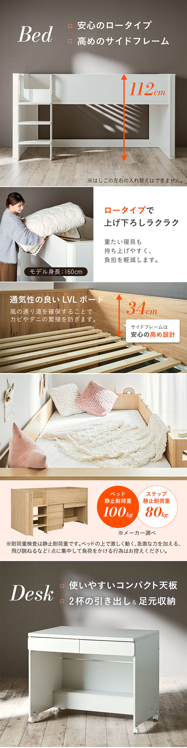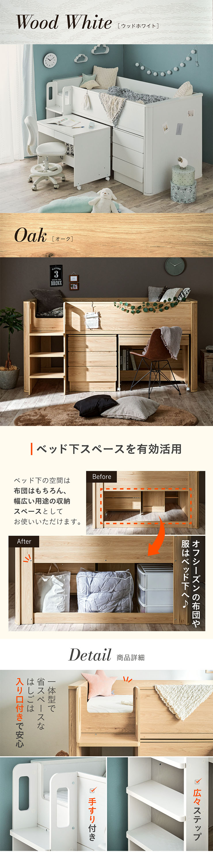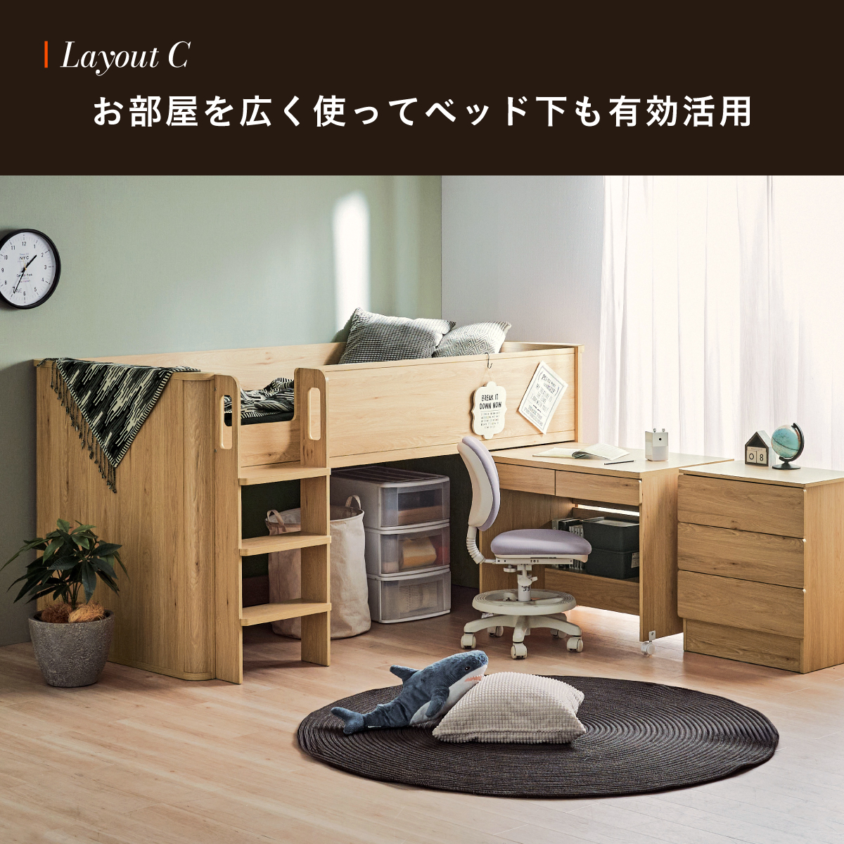 | システムベッド マットレスセット Electra(エレクトラ)+Unity(ユニティ)ブラック コンパクト省スペース ・デザイン支柱 ・分割使用可の3点セット ・安心のロータイプ ■新構造ラウンドポール やさしい曲線のプレミアムデザイン支柱 丸みのあるデザインが、やさしい雰囲気と高級感をアップ ■用途に合わせて使い分けできる分割3点セット シーン別に使えて毎日がもっと快適に。 お部屋に合わせて自由にレイアウトできます。 ・LayoutA システムベッドのスタンダードスタイル ・LayoutB 全て収納して広々空間に ・LayoutC お部屋を広く使ってベッド下も有効活用 ・LayoutD それぞれ単独で使えてどんな間取りにも対応 ■Bed 安心のロータイプ&高さのあるサイドフレーム ※はしごの左右の入れ替えはできません。 ■ロータイプなので布団やマットレスの上げ下ろしもスムーズに行えます。 通気性のいいLVLボードで風の通り道を確保し、カビやダニの繁殖を防ぎます。 ■Desk 広々天板で嬉しい引き出し付き&足元にも収納棚 ・散らかりがちな文具をしまえる2杯の引き出し付き ・レールはスムーズに開閉できるスライドレール仕様 ・デスクの足元を有効活用できる、便利なオープン棚 ・勉強道具がしっかり置けるワイド天板 出し入れがスムーズにできるキャスター付。 前方2つにはロック機能が付いているので固定することも可能 ■Chest スライドレール仕様でスムーズに開閉&小物や衣類を収納可 引き出しはスライドレール仕様で、力を入れずにスムーズに開閉できます。 横からのスムーズ開閉で取手のないフラットデザイン ベッド下の空間をムダなく活用布団収納スペースとしても使えるベッド下空間。 一体型で省スペースなはしごは入り口付きで安心。 手すり付き&広々ステップで上り下りラクラク。 尖った危険な角には丸みをつけ、安全性をアップ! ネジ穴を隠せるシール付き ※こちらの商品はお客様組み立てとなります。 ※組み立て方や若干の個体差によって、表記サイズと完成形のサイズに多少の誤差が生じる場合がございます。予めご了承ください。 ※こちらの商品はベッド+マットレス(ブラック)のセット販売となります。 ※サイズの商品画像はSDサイズを使用しております。 ※圧縮袋は一度開封すると再圧縮できません。 ※開封する際はハサミを使用し、ケガ等に十分気をつけながら行ってください。 ※開封後約1日~2日程度で本来の大きさに復元します。 ※本製品はウレタン製品のため、開封後すぐはウレタン特有のニオイがする場合がございます。ニオイがきつい場合は、ご使用の前に一度陰干ししてニオイを飛ばしてからご使用くださいますようお願いいたします。 ※臭いは新品のウレタン特有のもので無害です。 ※直射日光はウレタンの変色を促す恐れがあるためお避けください。 ※カバーを洗濯する時は、洗濯ネットに入れてください。 ※マットレスは片面仕様です。裏返してご使用はできません。 ※計測の仕方や、ロットによりサイズに多少の誤差が生じる場合がございます。予めご了承ください。 ※商品のデザイン、仕様、外観、価格は予告なく変更する場合があります。 ※商品写真はできる限り実物の色に近づけるよう徹底しておりますが、お使いのモニター設定、お部屋の照明、製造ロット等により実際の商品と若干色味が異なる場合がございますので予めご了承ください。 | |