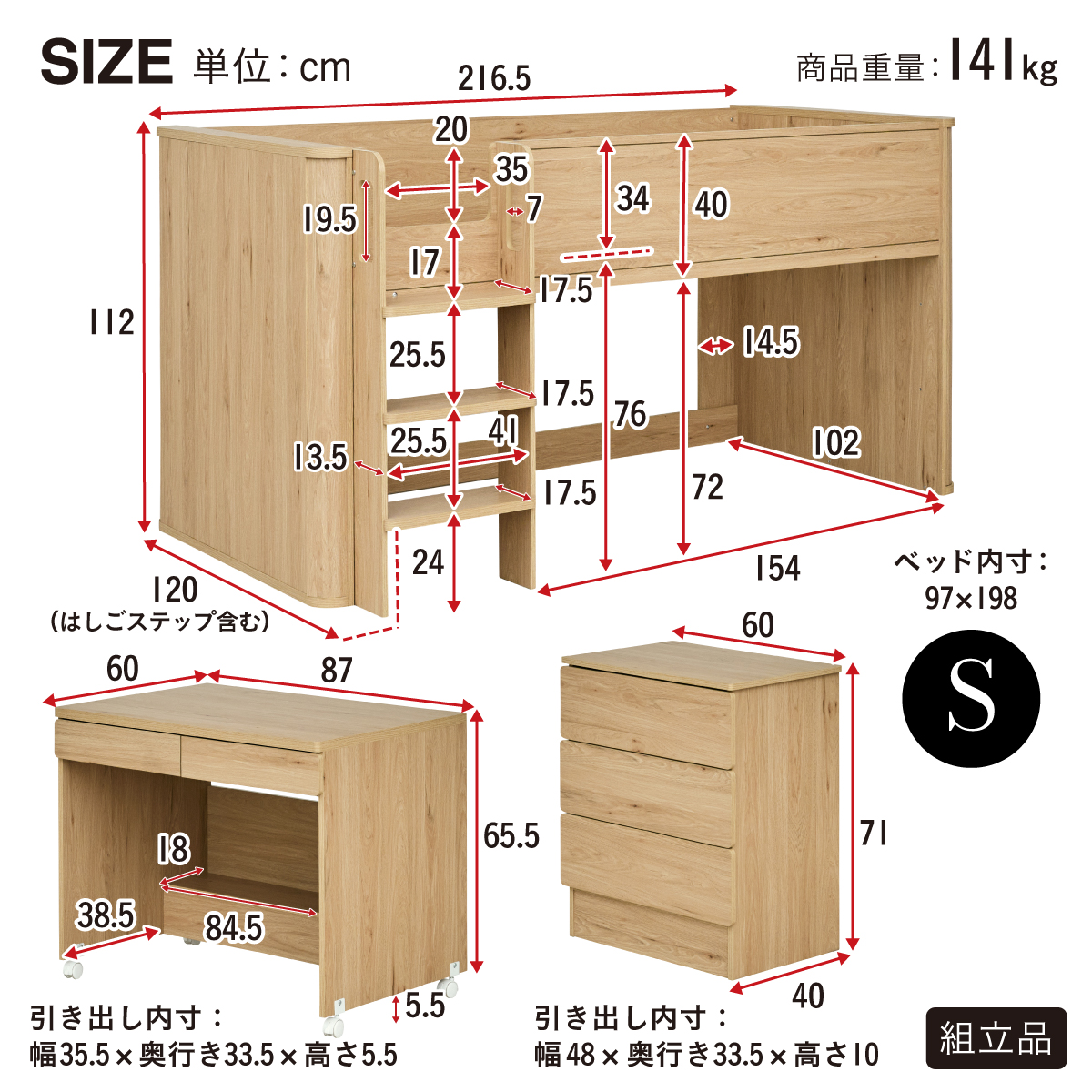 | 商品サイズ | 【ベッド】 本体:W216.5 x D120 x H112cm(重量:141kg) デスク:W87 x D60 x H65.5cm チェスト:W60 x D40 x H71cm 【マットレス】 約W97 x D195 x H15cm(重量:10.5kg) |
