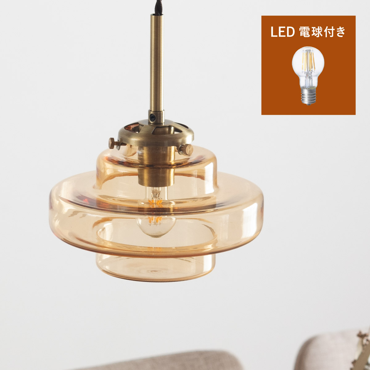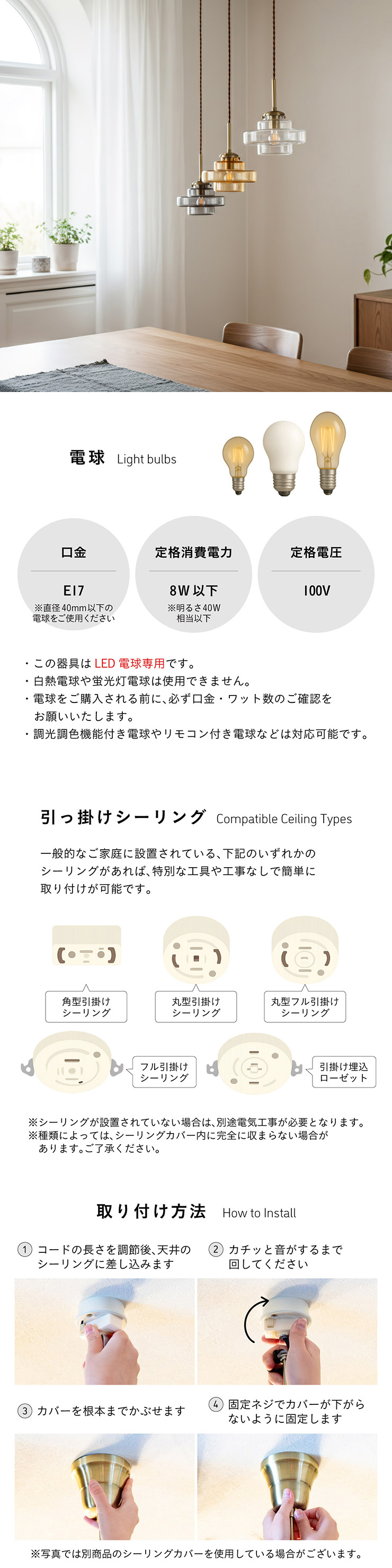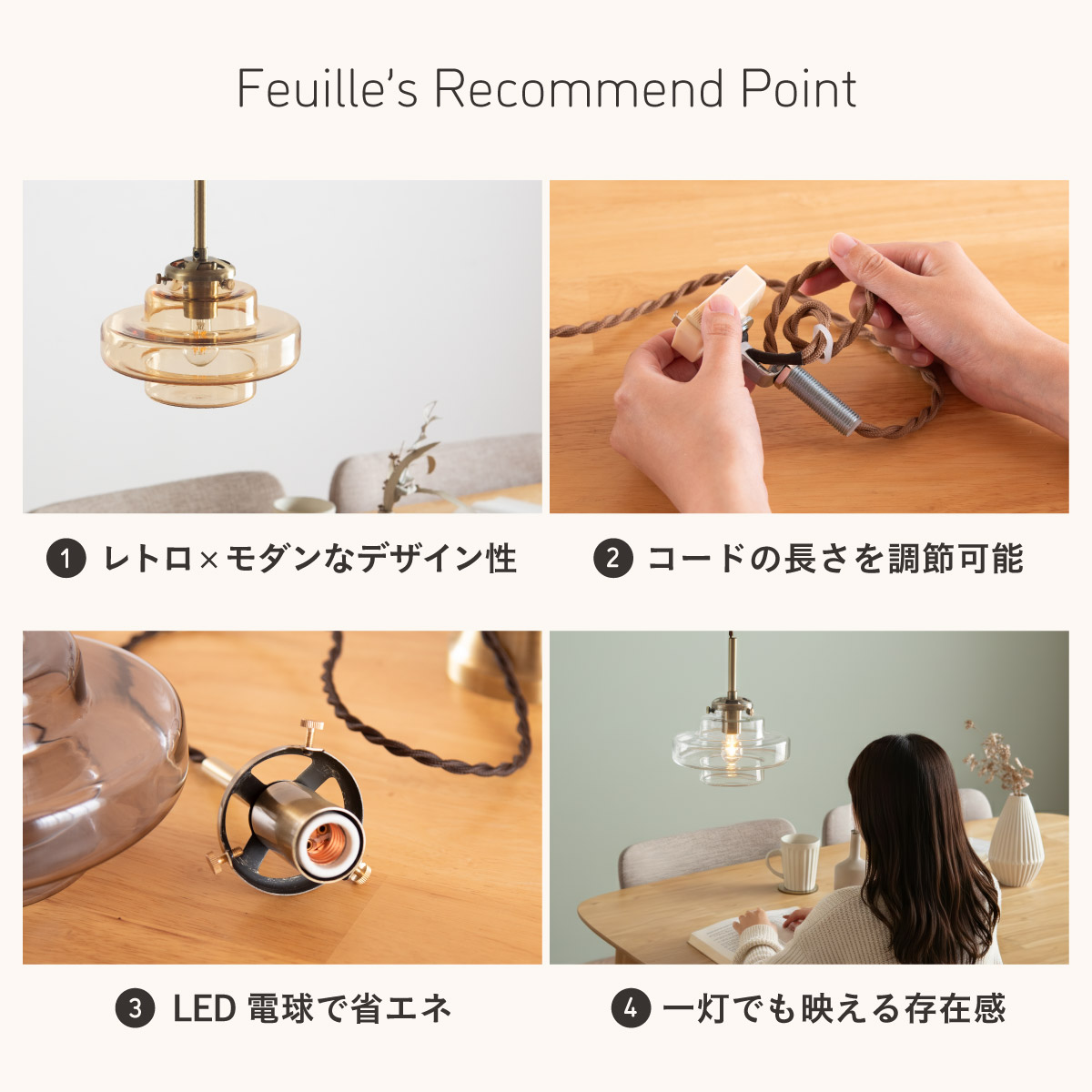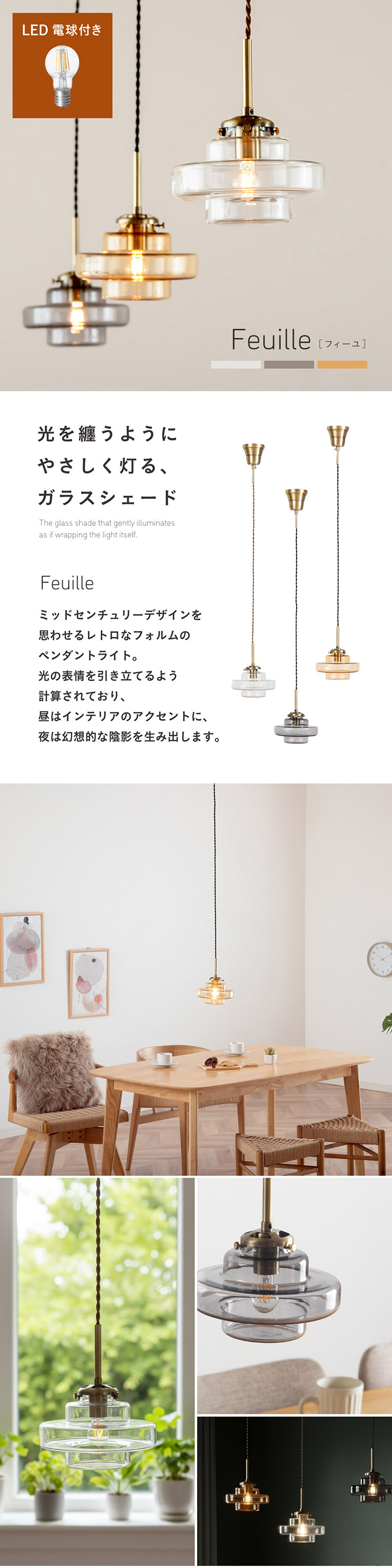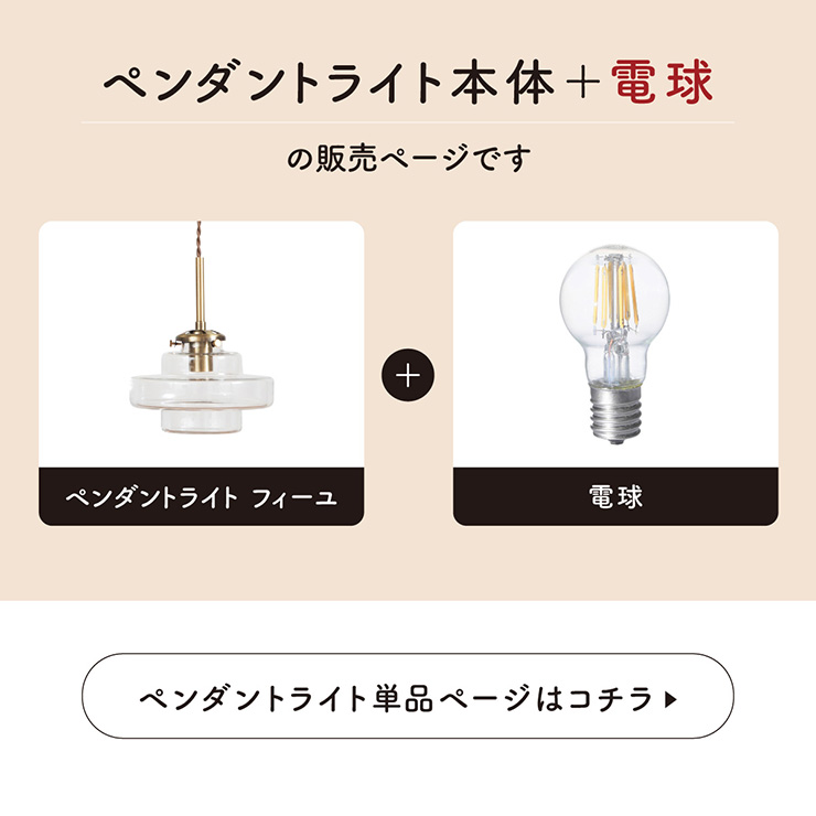 | LED電球専用 ペンダントライト Feuille(フィーユ) 電球セット 光を纏うようにやさしく灯る、ガラスシェード ミッドセンチュリーデザインを思わせるレトロなフォルムのペンダントライト。 光の表情を引き立てるよう計算されており、昼はインテリアのアクセントに、夜は幻想的な陰影を生み出します。 ■レトロxモダンなデザイン性 どこか懐かしさを感じるフォルムで、ヴィンテージにもモダンにも合う、トレンド感のあるデザイン。 ■コードの長さを調節可能 コード長さを自由に調節できるから、天井の高さに合わせてベストな配置が可能 ■LED電球で省エネ LED電球専用ライトだから、あかるさを確保しながら電気代も抑えられます。 ■1灯でも映える存在感 ひとつ灯すだけで空間がグッと洗練された印象に。眺めたくなる存在感 ■電球 ・口金:E17 ・定格消費電力:8W以下(※明るさ40W相当以下) ・定格電圧:100V ・この器具はLED電球専用です。 ・白熱電球や蛍光灯電球は使用できません。 ・電球は付属しておりません。 ・電球をご購入される前に、必ずロ金・ワット数のご確認をお願いいたします。 ・調光調色機能付き電球やリモコン付き電球などは対応可能です。 ■引掛けシーリング 一般的なご家庭に設置されている、下記のいずれかのシーリングがあれば、特別な工具や工事なしで簡単に取り付けが可能です。 ・角型引掛けシーリング ・丸型引掛けシーリング ・丸型フル引掛けシーリング ・フル引掛けシーリング ・引掛け埋込ローゼット ※シーリングが設置されていない場合は、別途電気工事が必要になります。 ※種類によっては、シーリングカバー内に完全に収まらない場合があります。ご了承ください。 ■取り付け場所 次のような天井には取り付けないでください。 ・突出部のある天井 ・たわみやすい天井、補強のない薄い天井(ベニヤ板、石膏ボードなど) ・傾斜した天井 ・凸凹のある天井 ※指定以外の場所に取り付けると、火災・落下などの原因になります。 調光機能がついた壁スイッチには取り付けできません。 ※火災の原因になるため、一般のスイッチに交換する取り付けないでください。 ■ダクトレールでもご使用可能〇 ダクトレールとダクトレール専用の変換プラグは別途ご用意ください。 ■LED電球を1灯付属しています ・クリプトン球40形相当 ・きらめきが広がるLED電球フィラメントタイプ ・光の広がり約290°全方向タイプ ・E17口金、電球色 ・メーカー:オーム電機 ※直径40mm以下の電球をご使用ください。 ※電気用品安全法(PSE法)および日本の安全規格に適合した製品です。 ※本製品のガラス部分には、製造工程上、小さな気泡やゆがみが生じる場合がございます。こちらはガラス製品特有の風合いであり、不良品ではございません。一点ずつ異なる表情をお楽しみいただければ幸いです。 ※屋内専用(屋外使用禁止) ※交流100V 50/60Hz 共有 ※次のような器具には使用できません。 調光機能のついた器具(100%点灯でも使用不可)・誘導灯、非常用照明器具・HIDランプ器具、水銀灯器具・断熱材施工器具1(SB・SGI・SG形表示器具など)・ランプと反射板の距離が狭い器具・直流電源 ※このほか使用器具の種類によって寸法的、熱的、その他の状況(リモコン機器のついた器具など)により使用できない場合があります。 ※ご使用になられる照明器具の構造によっては、放熱不良で短寿命となることがあります。 ※密閉器具でのご使用の場合、器具の寸法により、使用できない場合や寿命が短くなる場合があります。 | |