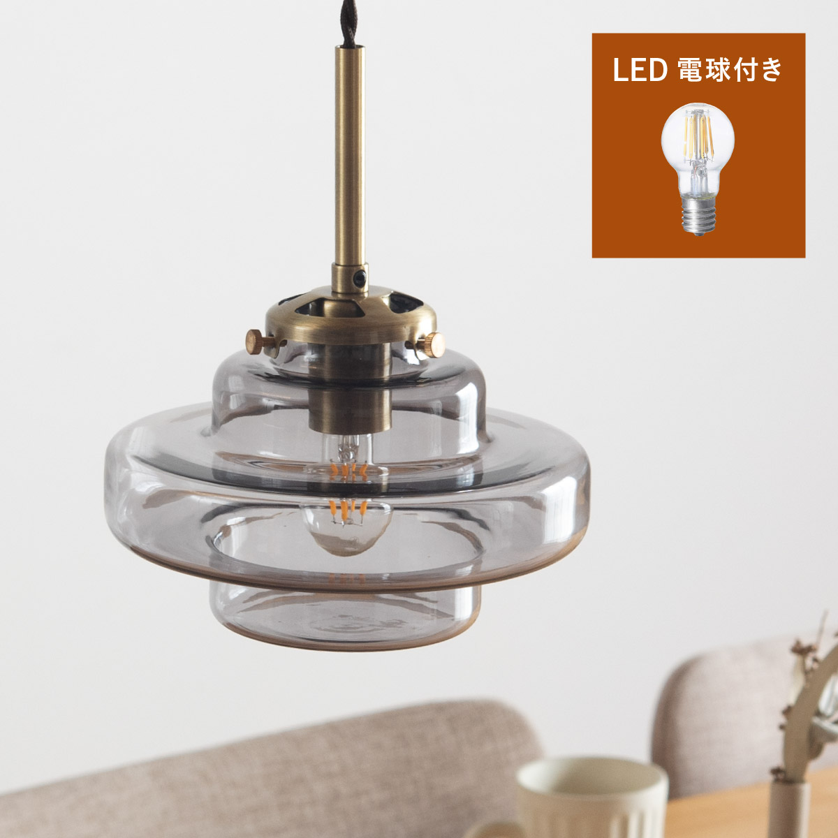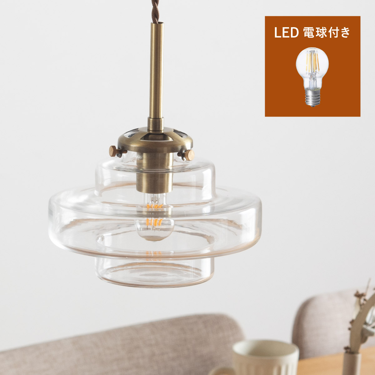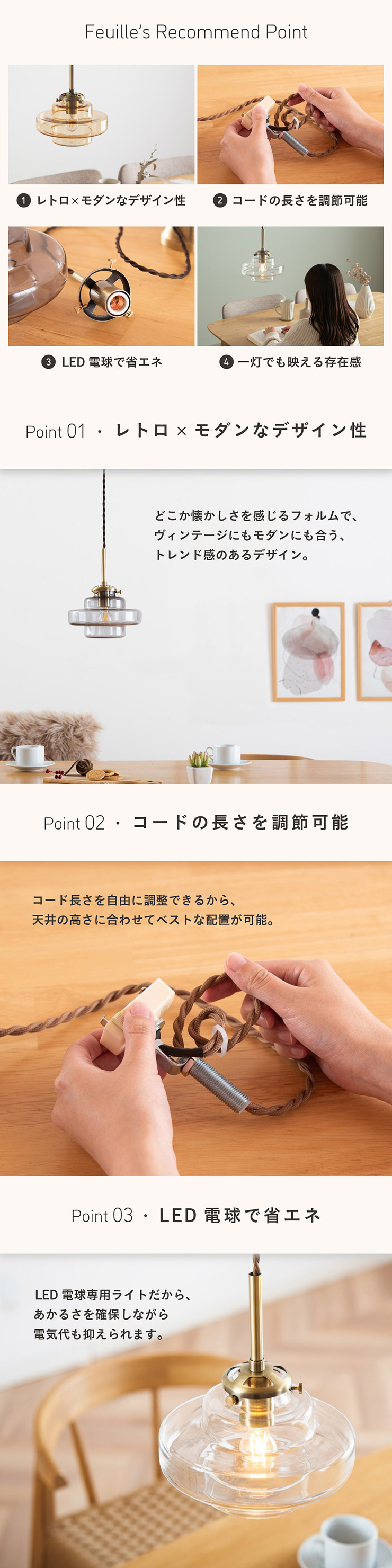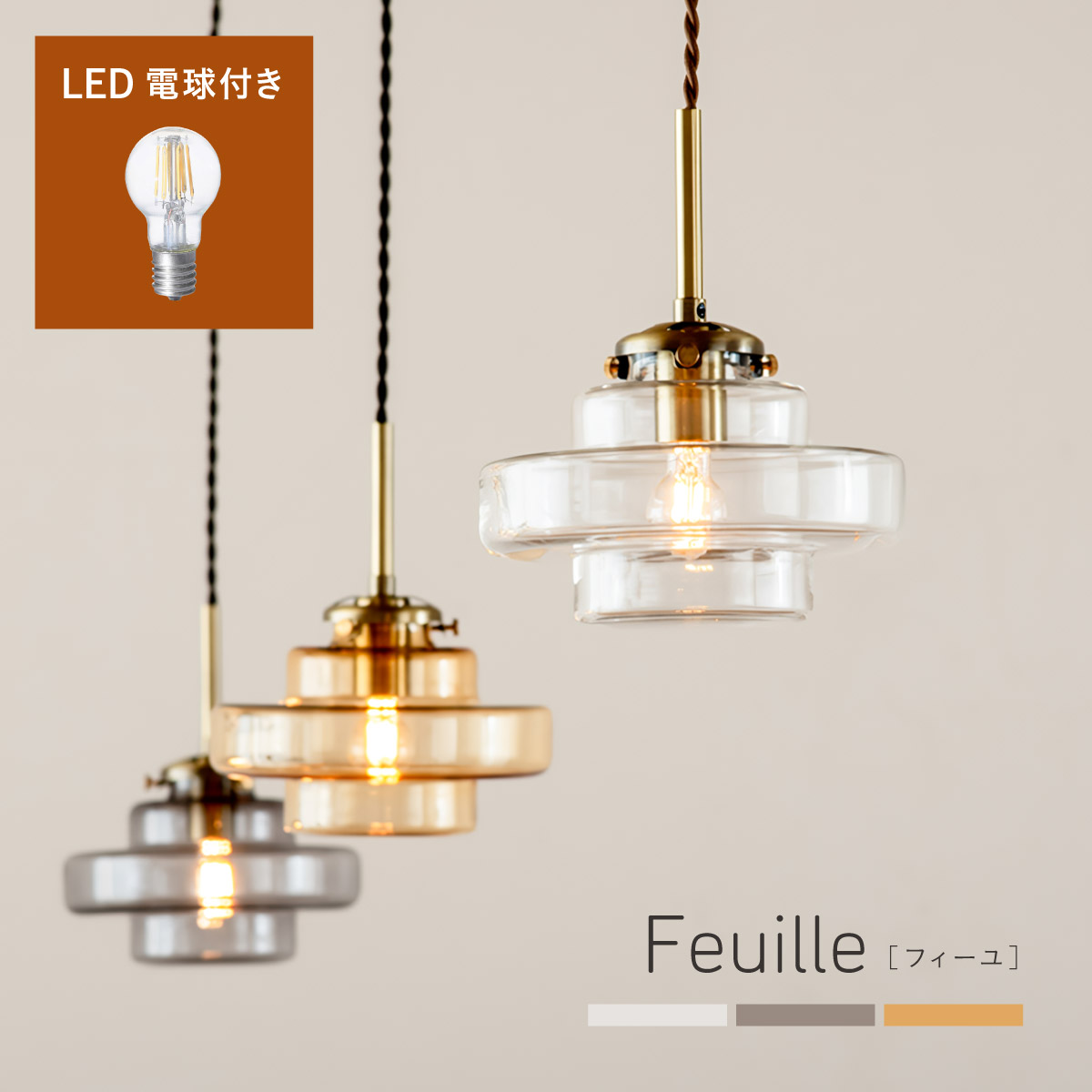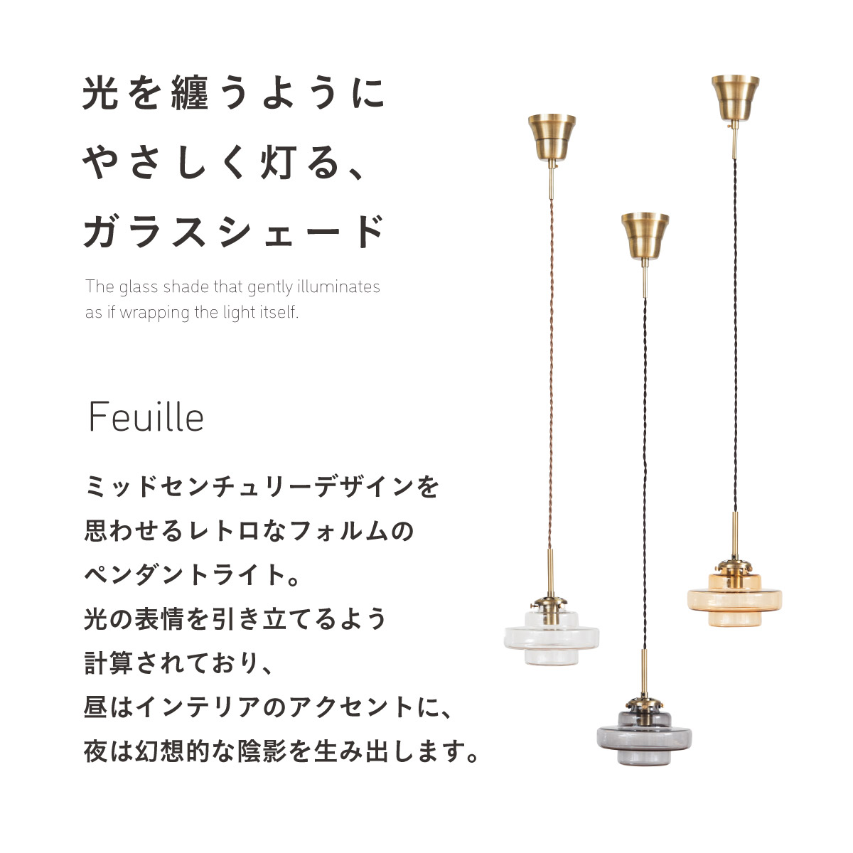 | LED電球専用 ペンダントライト Feuille(フィーユ) 電球セット 光を纏うようにやさしく灯る、ガラスシェード ミッドセンチュリーデザインを思わせるレトロなフォルムのペンダントライト。 光の表情を引き立てるよう計算されており、昼はインテリアのアクセントに、夜は幻想的な陰影を生み出します。 ■レトロxモダンなデザイン性 どこか懐かしさを感じるフォルムで、ヴィンテージにもモダンにも合う、トレンド感のあるデザイン。 ■コードの長さを調節可能 コード長さを自由に調節できるから、天井の高さに合わせてベストな配置が可能 ■LED電球で省エネ LED電球専用ライトだから、あかるさを確保しながら電気代も抑えられます。 ■1灯でも映える存在感 ひとつ灯すだけで空間がグッと洗練された印象に。眺めたくなる存在感 ■電球 ・口金:E17 ・定格消費電力:8W以下(※明るさ40W相当以下) ・定格電圧:100V ・この器具はLED電球専用です。 ・白熱電球や蛍光灯電球は使用できません。 ・電球は付属しておりません。 ・電球をご購入される前に、必ずロ金・ワット数のご確認をお願いいたします。 ・調光調色機能付き電球やリモコン付き電球などは対応可能です。 ■引掛けシーリング 一般的なご家庭に設置されている、下記のいずれかのシーリングがあれば、特別な工具や工事なしで簡単に取り付けが可能です。 ・角型引掛けシーリング ・丸型引掛けシーリング ・丸型フル引掛けシーリング ・フル引掛けシーリング ・引掛け埋込ローゼット ※シーリングが設置されていない場合は、別途電気工事が必要になります。 ※種類によっては、シーリングカバー内に完全に収まらない場合があります。ご了承ください。 ■取り付け場所 次のような天井には取り付けないでください。 ・突出部のある天井 ・たわみやすい天井、補強のない薄い天井(ベニヤ板、石膏ボードなど) ・傾斜した天井 ・凸凹のある天井 ※指定以外の場所に取り付けると、火災・落下などの原因になります。 調光機能がついた壁スイッチには取り付けできません。 ※火災の原因になるため、一般のスイッチに交換する取り付けないでください。 ■ダクトレールでもご使用可能〇 ダクトレールとダクトレール専用の変換プラグは別途ご用意ください。 ■LED電球を1灯付属しています ・クリプトン球40形相当 ・きらめきが広がるLED電球フィラメントタイプ ・光の広がり約290°全方向タイプ ・E17口金、電球色 ・メーカー:オーム電機 ※直径40mm以下の電球をご使用ください。 ※電気用品安全法(PSE法)および日本の安全規格に適合した製品です。 ※本製品のガラス部分には、製造工程上、小さな気泡やゆがみが生じる場合がございます。こちらはガラス製品特有の風合いであり、不良品ではございません。一点ずつ異なる表情をお楽しみいただければ幸いです。 ※屋内専用(屋外使用禁止) ※交流100V 50/60Hz 共有 ※次のような器具には使用できません。 調光機能のついた器具(100%点灯でも使用不可)・誘導灯、非常用照明器具・HIDランプ器具、水銀灯器具・断熱材施工器具1(SB・SGI・SG形表示器具など)・ランプと反射板の距離が狭い器具・直流電源 ※このほか使用器具の種類によって寸法的、熱的、その他の状況(リモコン機器のついた器具など)により使用できない場合があります。 ※ご使用になられる照明器具の構造によっては、放熱不良で短寿命となることがあります。 ※密閉器具でのご使用の場合、器具の寸法により、使用できない場合や寿命が短くなる場合があります。 | |