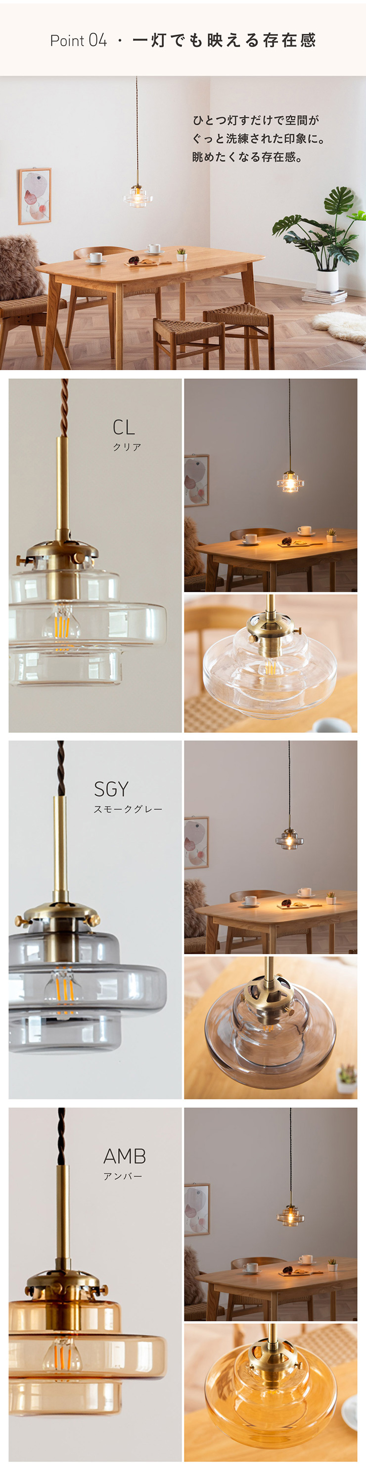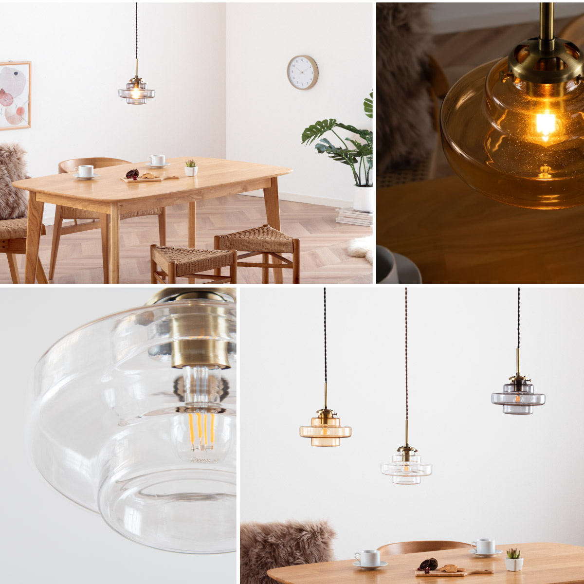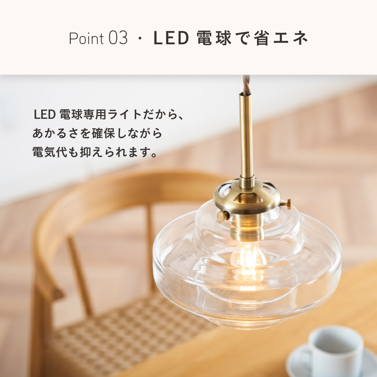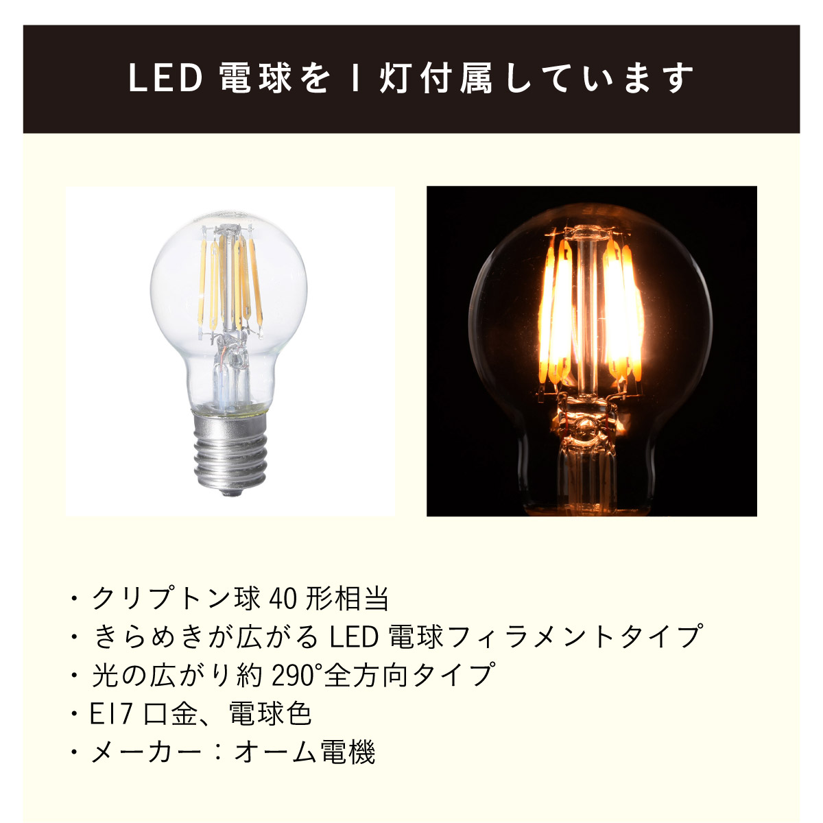 | LED電球専用 ペンダントライト Feuille(フィーユ) 電球セット 光を纏うようにやさしく灯る、ガラスシェード ミッドセンチュリーデザインを思わせるレトロなフォルムのペンダントライト。 光の表情を引き立てるよう計算されており、昼はインテリアのアクセントに、夜は幻想的な陰影を生み出します。 ■レトロxモダンなデザイン性 どこか懐かしさを感じるフォルムで、ヴィンテージにもモダンにも合う、トレンド感のあるデザイン。 ■コードの長さを調節可能 コード長さを自由に調節できるから、天井の高さに合わせてベストな配置が可能 ■LED電球で省エネ LED電球専用ライトだから、あかるさを確保しながら電気代も抑えられます。 ■1灯でも映える存在感 ひとつ灯すだけで空間がグッと洗練された印象に。眺めたくなる存在感 ■電球 ・口金:E17 ・定格消費電力:8W以下(※明るさ40W相当以下) ・定格電圧:100V ・この器具はLED電球専用です。 ・白熱電球や蛍光灯電球は使用できません。 ・電球は付属しておりません。 ・電球をご購入される前に、必ずロ金・ワット数のご確認をお願いいたします。 ・調光調色機能付き電球やリモコン付き電球などは対応可能です。 ■引掛けシーリング 一般的なご家庭に設置されている、下記のいずれかのシーリングがあれば、特別な工具や工事なしで簡単に取り付けが可能です。 ・角型引掛けシーリング ・丸型引掛けシーリング ・丸型フル引掛けシーリング ・フル引掛けシーリング ・引掛け埋込ローゼット ※シーリングが設置されていない場合は、別途電気工事が必要になります。 ※種類によっては、シーリングカバー内に完全に収まらない場合があります。ご了承ください。 ■取り付け場所 次のような天井には取り付けないでください。 ・突出部のある天井 ・たわみやすい天井、補強のない薄い天井(ベニヤ板、石膏ボードなど) ・傾斜した天井 ・凸凹のある天井 ※指定以外の場所に取り付けると、火災・落下などの原因になります。 調光機能がついた壁スイッチには取り付けできません。 ※火災の原因になるため、一般のスイッチに交換する取り付けないでください。 ■ダクトレールでもご使用可能〇 ダクトレールとダクトレール専用の変換プラグは別途ご用意ください。 ■LED電球を1灯付属しています ・クリプトン球40形相当 ・きらめきが広がるLED電球フィラメントタイプ ・光の広がり約290°全方向タイプ ・E17口金、電球色 ・メーカー:オーム電機 ※直径40mm以下の電球をご使用ください。 ※電気用品安全法(PSE法)および日本の安全規格に適合した製品です。 ※本製品のガラス部分には、製造工程上、小さな気泡やゆがみが生じる場合がございます。こちらはガラス製品特有の風合いであり、不良品ではございません。一点ずつ異なる表情をお楽しみいただければ幸いです。 ※屋内専用(屋外使用禁止) ※交流100V 50/60Hz 共有 ※次のような器具には使用できません。 調光機能のついた器具(100%点灯でも使用不可)・誘導灯、非常用照明器具・HIDランプ器具、水銀灯器具・断熱材施工器具1(SB・SGI・SG形表示器具など)・ランプと反射板の距離が狭い器具・直流電源 ※このほか使用器具の種類によって寸法的、熱的、その他の状況(リモコン機器のついた器具など)により使用できない場合があります。 ※ご使用になられる照明器具の構造によっては、放熱不良で短寿命となることがあります。 ※密閉器具でのご使用の場合、器具の寸法により、使用できない場合や寿命が短くなる場合があります。 | |