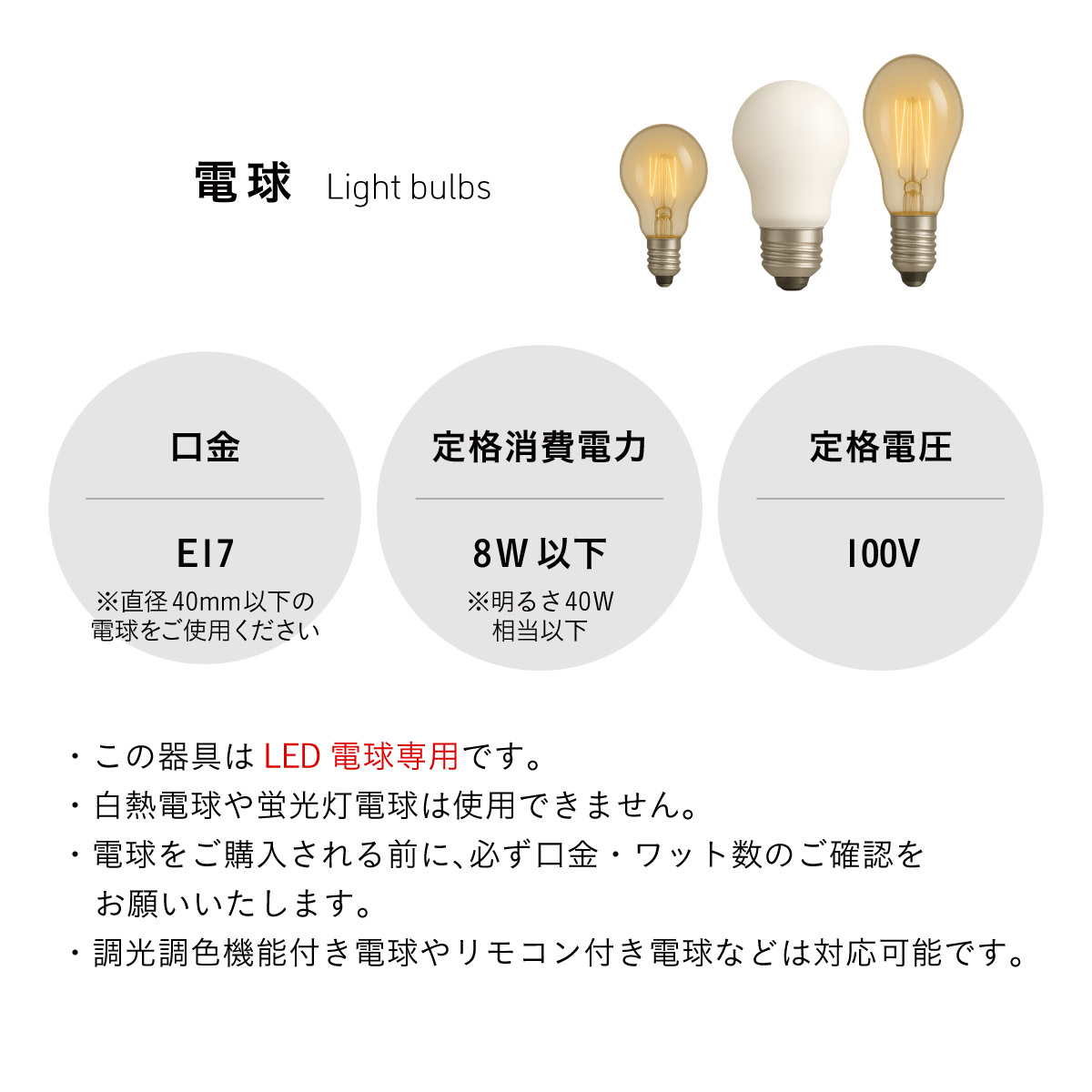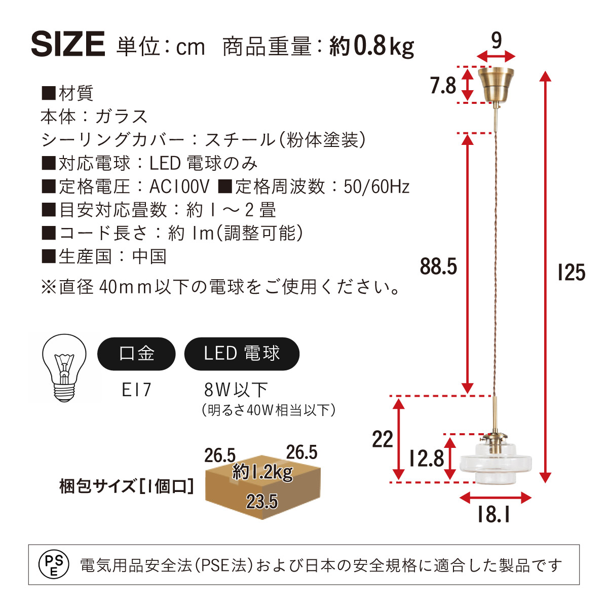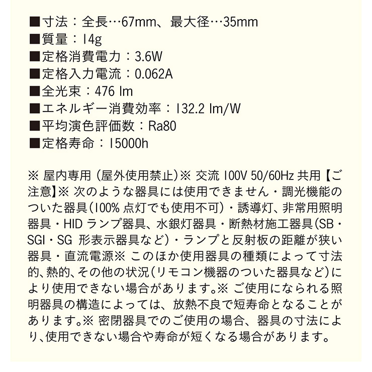 | 材質・素材 | 本体:ガラス シーリングカバー:スチール(粉体塗装) 対応電球:LED電球のみ 定格電圧:AC100V 定格周波数:50/60Hz 目安対応畳数:約1~2畳 コードの長さ:約1m(調節可能) 〇電球 定格消費電力:3.6W 定格入力電流:0.062A 全光束:476lm エネルギー消費効率:132.2lm/W 平均演色評価数:Ra80 設計寿命:15000h |
