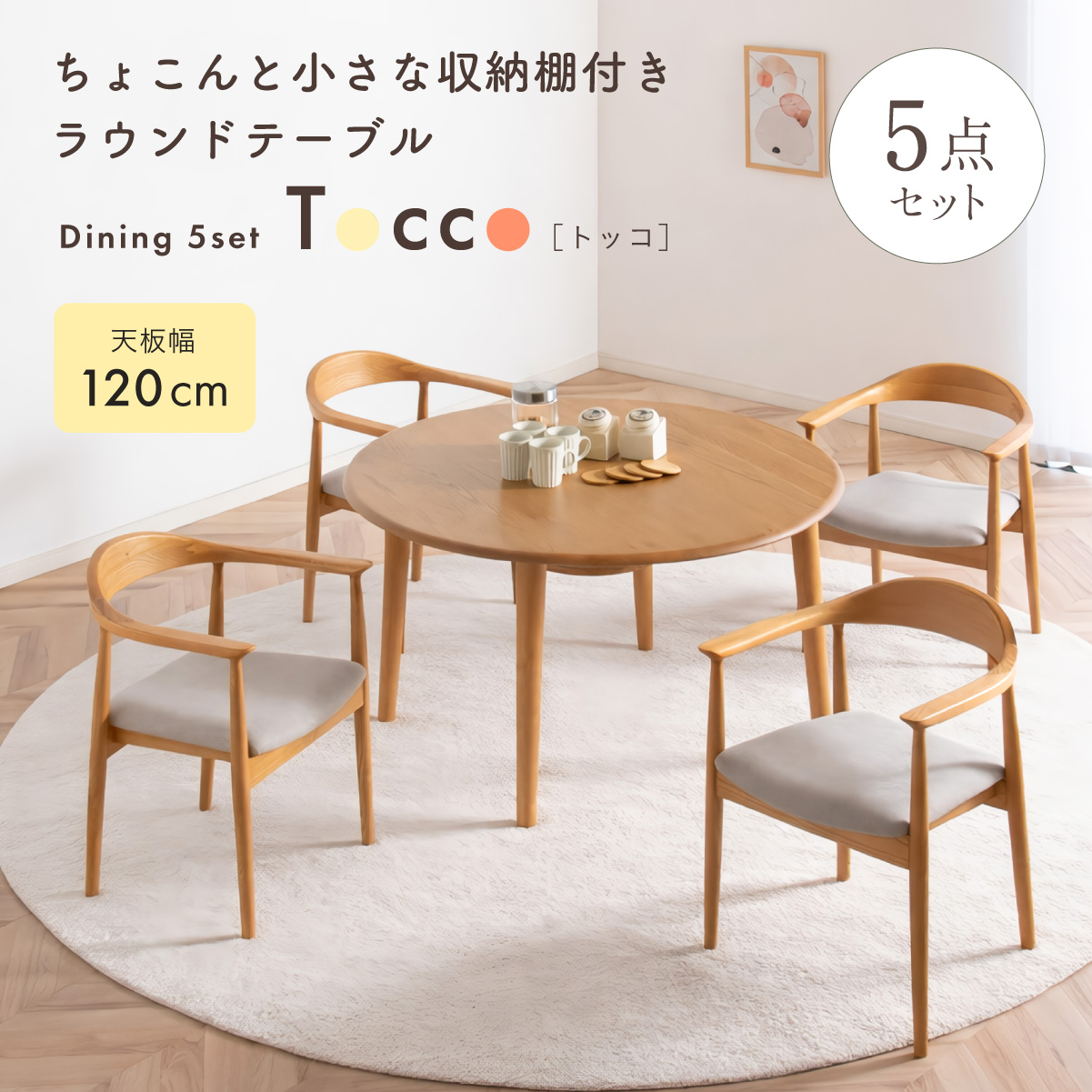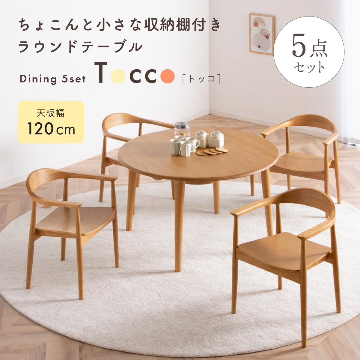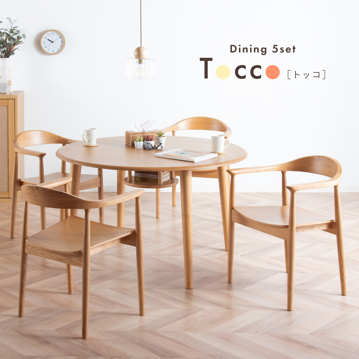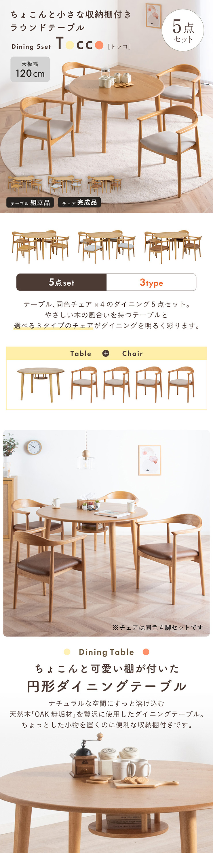 | ちょこんと小さな収納棚付きラウンドテーブル Dining 5set Tocco(トッコ) 5点セット テーブル、同色チェアx4のダイニング5点セット。 やさしい木の風合いを持つテーブルと選べる3タイプのチェアがダイニングを明るく彩ります。 ■円形テーブルならではの使いやすさ 角のない円形テーブルで動線も快適。座る位置を選ばず、みんなで自然に囲めます。 ■広々使える120cmの天板 4人でゆったりと囲める、広々としたサイズ。食事の時間も会話の時間も心地よく広げてくれます。 ■細部までこだわったデザイン 天板の縁はやさしい丸み仕上げ。見た目の柔らかさだけでなく、安全性にも配慮したデザインです。 ■天板下の丸い棚で実用性アップ 天板下には、鳥かごのような丸い棚を設置。ティッシュや本などを置けて、テーブルの上をすっきり保てます。 ■上質なOKA無垢材を使用 天板にはOKA(オーク)無垢材を使用。木目の美しさと経年変化を楽しめる、長く愛用できるダイニングテーブルです。 脚部と収納棚にはラバーウッド材を採用。ナチュラルな風合いと安定感を兼ね備えています。 ■テーブル下にすっきり収納 アームが天板下に収まり、使わないときはきれいに収納可能。 ダイニング空間を広く、すっきりと保てます。 ※チェア4脚使用時。配置によっては、チェア同士の感覚が狭くなり、お互いに接触する場合があります。 ■背中に自然とフィットするやわらかな曲線の背もたれ 背中のラインに沿う曲線が、やさしく身体を支えます。 ■ゆったりと座れる奥行のある座面設計 奥行にゆとりを持たせ、安定感のある座り心地に仕上げました。 ■丸みをもたせた、やさしいフォルム 手すりや脚など、全体的に角を抑え、空間になじむやわらかな印象に仕上げました。 ■Material ・丈夫さと表情豊かな木目をあわせ持つアッシュ材を使用 ・張地(FAB):やわらかな肌触りで、空間にやさしい印象を与えるファブリック素材 ・張地(PVC):水や汚れに強く、お手入れがしやすいPVC素材。日常使いに安心です。 ■Dining detail ・脚裏にはガタツキ防止のアジャスター付き ・天板の厚み2cm ・汚れに強いウレタン塗装 ■Chair detail ・板座:座面の厚み1cm ・FAB:座面の厚み6cm ・PVC:座面の厚み6cm ・脚裏には傷防止のフェルト付き ※テーブルはお客様組み立てとなります。 ※組み立て方や若干の個体差により、表記サイズと完成形サイズに多少の誤差が生じる場合があります。予めご了承下さい。 ※こちらは、テーブルとチェア同色4脚セットの販売ページとなります。 ※熱いものを置くときは、直接置かないように注意してください。 ※防水ではございませんので、濡れた場合は放置せずすぐに拭き取ってください。 ※こちらの商品は天然木を使用しております。その為、木の表情や風合いには個体差がございます。節など木の風合いを理由とした返品・交換は対象外となりますので予めご了承ください。 | |