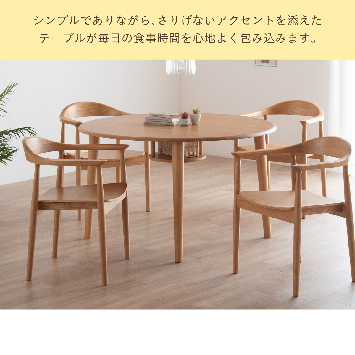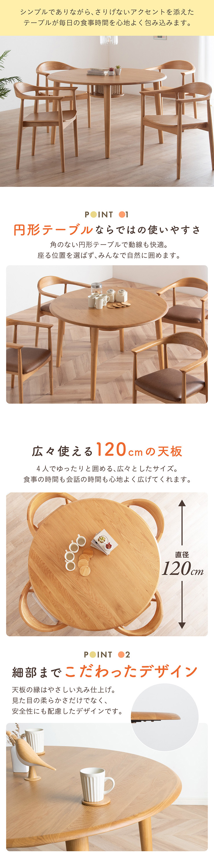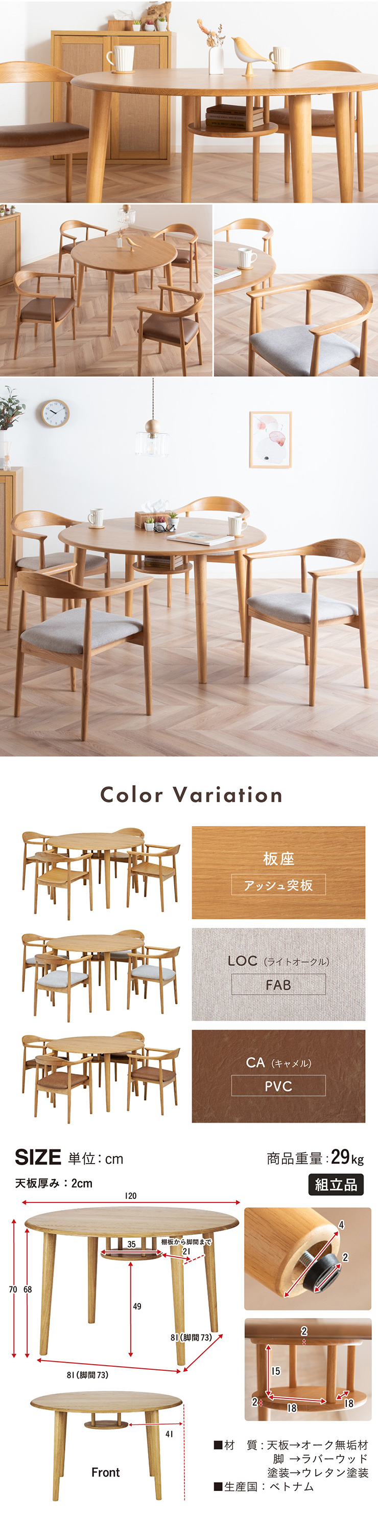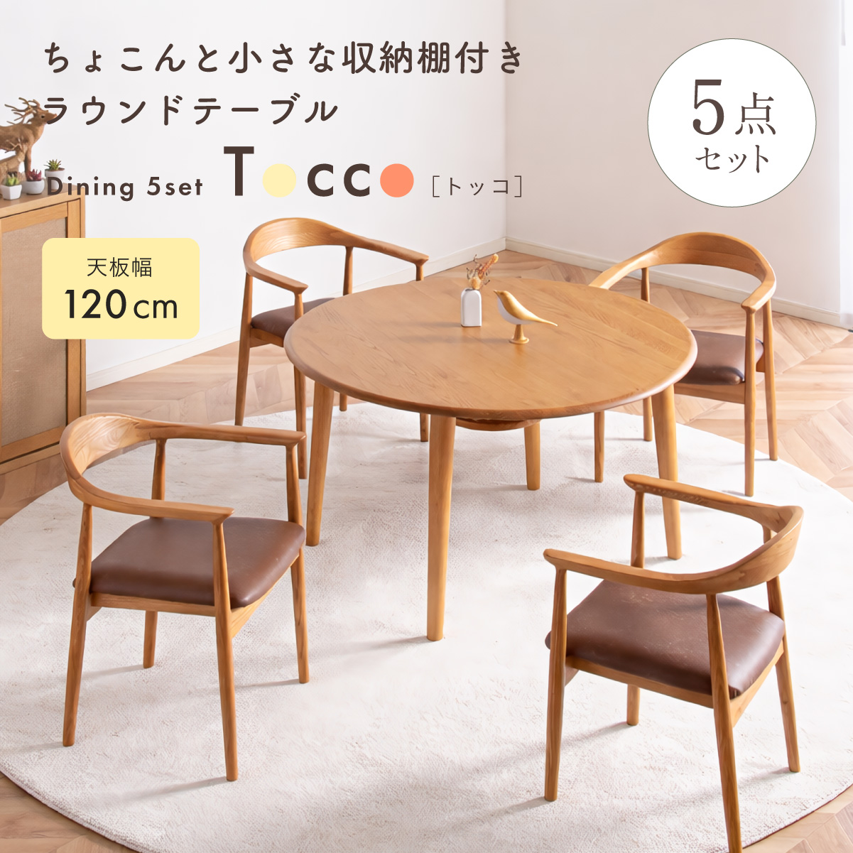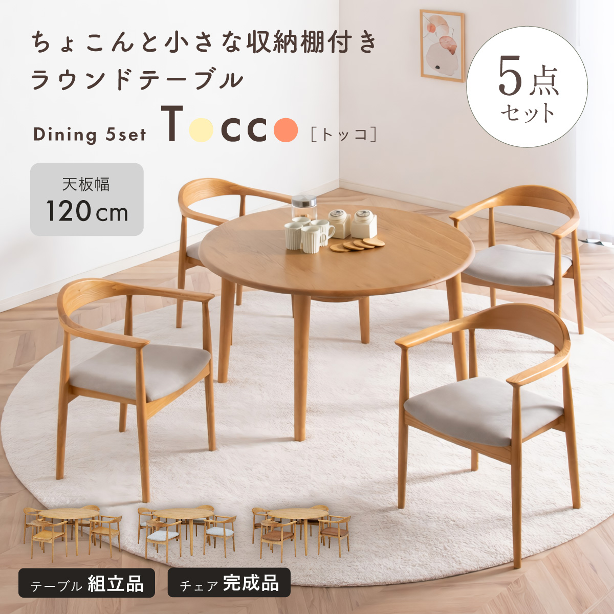 | ちょこんと小さな収納棚付きラウンドテーブル Dining 5set Tocco(トッコ) 5点セット テーブル、同色チェアx4のダイニング5点セット。 やさしい木の風合いを持つテーブルと選べる3タイプのチェアがダイニングを明るく彩ります。 ■円形テーブルならではの使いやすさ 角のない円形テーブルで動線も快適。座る位置を選ばず、みんなで自然に囲めます。 ■広々使える120cmの天板 4人でゆったりと囲める、広々としたサイズ。食事の時間も会話の時間も心地よく広げてくれます。 ■細部までこだわったデザイン 天板の縁はやさしい丸み仕上げ。見た目の柔らかさだけでなく、安全性にも配慮したデザインです。 ■天板下の丸い棚で実用性アップ 天板下には、鳥かごのような丸い棚を設置。ティッシュや本などを置けて、テーブルの上をすっきり保てます。 ■上質なOKA無垢材を使用 天板にはOKA(オーク)無垢材を使用。木目の美しさと経年変化を楽しめる、長く愛用できるダイニングテーブルです。 脚部と収納棚にはラバーウッド材を採用。ナチュラルな風合いと安定感を兼ね備えています。 ■テーブル下にすっきり収納 アームが天板下に収まり、使わないときはきれいに収納可能。 ダイニング空間を広く、すっきりと保てます。 ※チェア4脚使用時。配置によっては、チェア同士の感覚が狭くなり、お互いに接触する場合があります。 ■背中に自然とフィットするやわらかな曲線の背もたれ 背中のラインに沿う曲線が、やさしく身体を支えます。 ■ゆったりと座れる奥行のある座面設計 奥行にゆとりを持たせ、安定感のある座り心地に仕上げました。 ■丸みをもたせた、やさしいフォルム 手すりや脚など、全体的に角を抑え、空間になじむやわらかな印象に仕上げました。 ■Material ・丈夫さと表情豊かな木目をあわせ持つアッシュ材を使用 ・張地(FAB):やわらかな肌触りで、空間にやさしい印象を与えるファブリック素材 ・張地(PVC):水や汚れに強く、お手入れがしやすいPVC素材。日常使いに安心です。 ■Dining detail ・脚裏にはガタツキ防止のアジャスター付き ・天板の厚み2cm ・汚れに強いウレタン塗装 ■Chair detail ・板座:座面の厚み1cm ・FAB:座面の厚み6cm ・PVC:座面の厚み6cm ・脚裏には傷防止のフェルト付き ※テーブルはお客様組み立てとなります。 ※組み立て方や若干の個体差により、表記サイズと完成形サイズに多少の誤差が生じる場合があります。予めご了承下さい。 ※こちらは、テーブルとチェア同色4脚セットの販売ページとなります。 ※熱いものを置くときは、直接置かないように注意してください。 ※防水ではございませんので、濡れた場合は放置せずすぐに拭き取ってください。 ※こちらの商品は天然木を使用しております。その為、木の表情や風合いには個体差がございます。節など木の風合いを理由とした返品・交換は対象外となりますので予めご了承ください。 | |