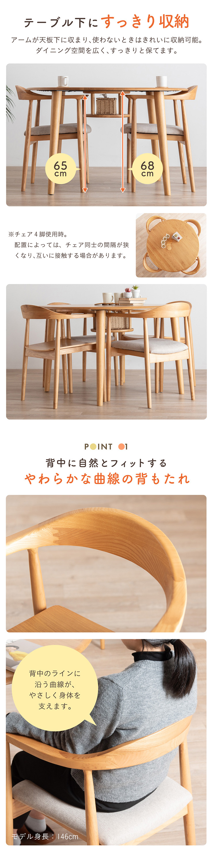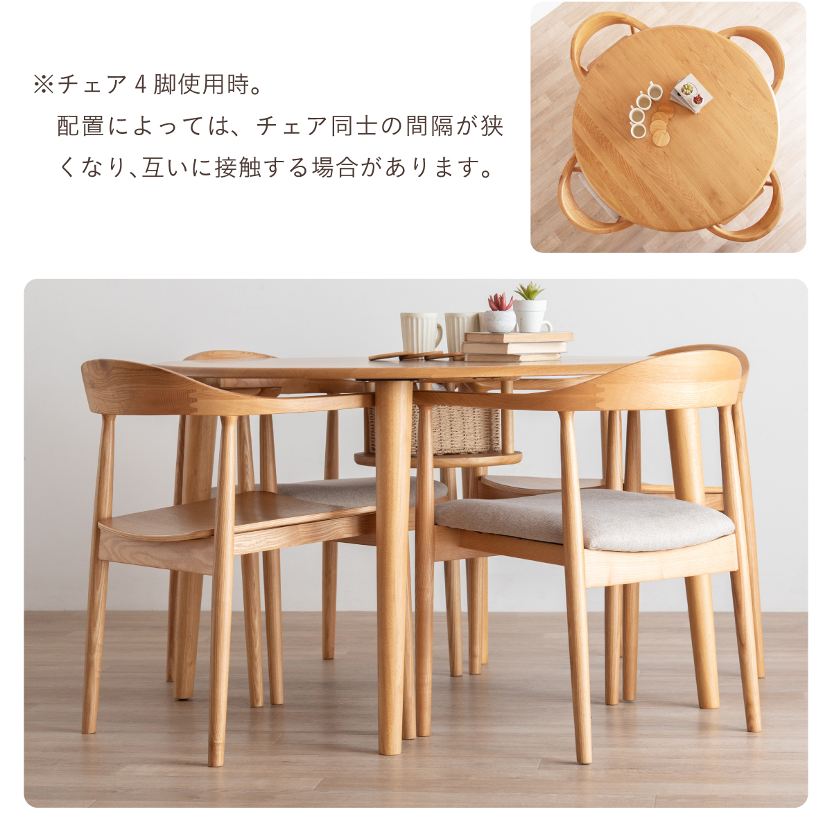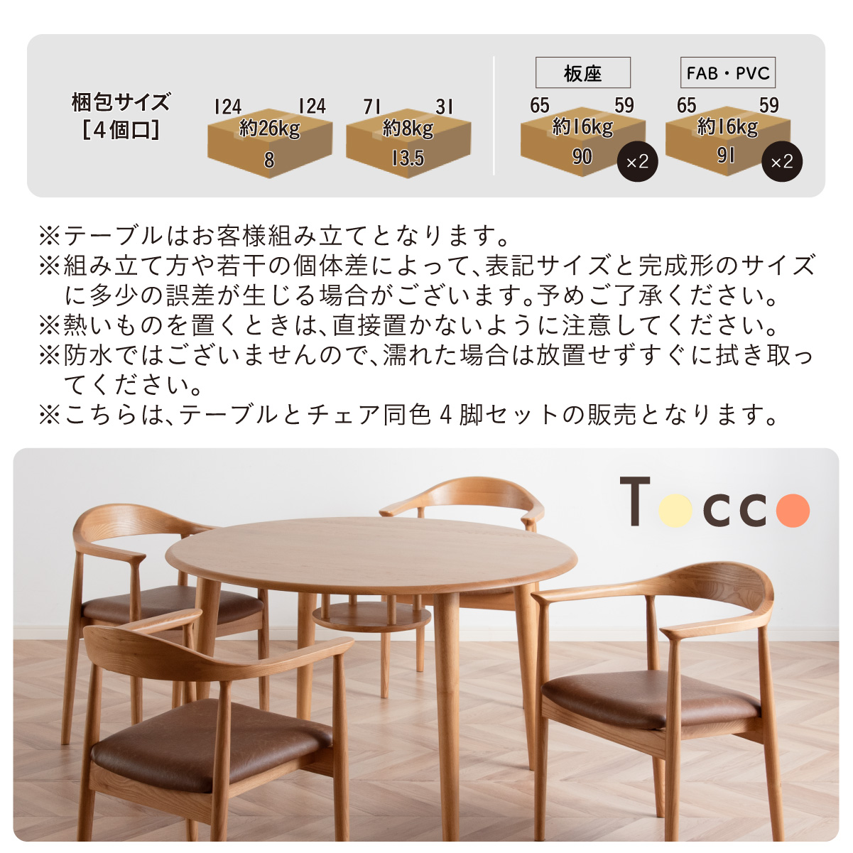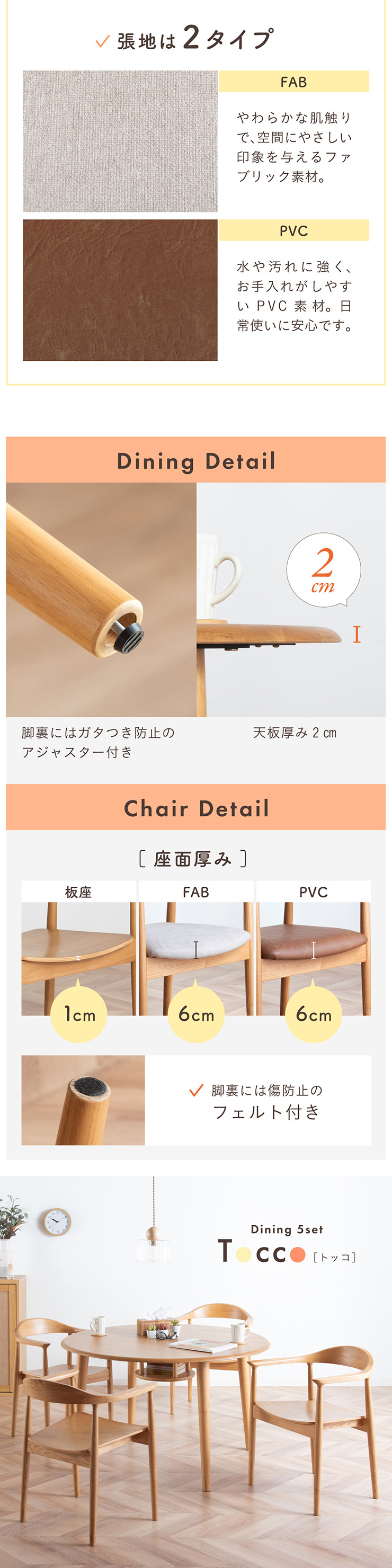 | ちょこんと小さな収納棚付きラウンドテーブル Dining 5set Tocco(トッコ) 5点セット テーブル、同色チェアx4のダイニング5点セット。 やさしい木の風合いを持つテーブルと選べる3タイプのチェアがダイニングを明るく彩ります。 ■円形テーブルならではの使いやすさ 角のない円形テーブルで動線も快適。座る位置を選ばず、みんなで自然に囲めます。 ■広々使える120cmの天板 4人でゆったりと囲める、広々としたサイズ。食事の時間も会話の時間も心地よく広げてくれます。 ■細部までこだわったデザイン 天板の縁はやさしい丸み仕上げ。見た目の柔らかさだけでなく、安全性にも配慮したデザインです。 ■天板下の丸い棚で実用性アップ 天板下には、鳥かごのような丸い棚を設置。ティッシュや本などを置けて、テーブルの上をすっきり保てます。 ■上質なOKA無垢材を使用 天板にはOKA(オーク)無垢材を使用。木目の美しさと経年変化を楽しめる、長く愛用できるダイニングテーブルです。 脚部と収納棚にはラバーウッド材を採用。ナチュラルな風合いと安定感を兼ね備えています。 ■テーブル下にすっきり収納 アームが天板下に収まり、使わないときはきれいに収納可能。 ダイニング空間を広く、すっきりと保てます。 ※チェア4脚使用時。配置によっては、チェア同士の感覚が狭くなり、お互いに接触する場合があります。 ■背中に自然とフィットするやわらかな曲線の背もたれ 背中のラインに沿う曲線が、やさしく身体を支えます。 ■ゆったりと座れる奥行のある座面設計 奥行にゆとりを持たせ、安定感のある座り心地に仕上げました。 ■丸みをもたせた、やさしいフォルム 手すりや脚など、全体的に角を抑え、空間になじむやわらかな印象に仕上げました。 ■Material ・丈夫さと表情豊かな木目をあわせ持つアッシュ材を使用 ・張地(FAB):やわらかな肌触りで、空間にやさしい印象を与えるファブリック素材 ・張地(PVC):水や汚れに強く、お手入れがしやすいPVC素材。日常使いに安心です。 ■Dining detail ・脚裏にはガタツキ防止のアジャスター付き ・天板の厚み2cm ・汚れに強いウレタン塗装 ■Chair detail ・板座:座面の厚み1cm ・FAB:座面の厚み6cm ・PVC:座面の厚み6cm ・脚裏には傷防止のフェルト付き ※テーブルはお客様組み立てとなります。 ※組み立て方や若干の個体差により、表記サイズと完成形サイズに多少の誤差が生じる場合があります。予めご了承下さい。 ※こちらは、テーブルとチェア同色4脚セットの販売ページとなります。 ※熱いものを置くときは、直接置かないように注意してください。 ※防水ではございませんので、濡れた場合は放置せずすぐに拭き取ってください。 ※こちらの商品は天然木を使用しております。その為、木の表情や風合いには個体差がございます。節など木の風合いを理由とした返品・交換は対象外となりますので予めご了承ください。 | |