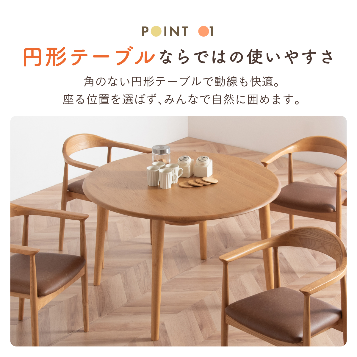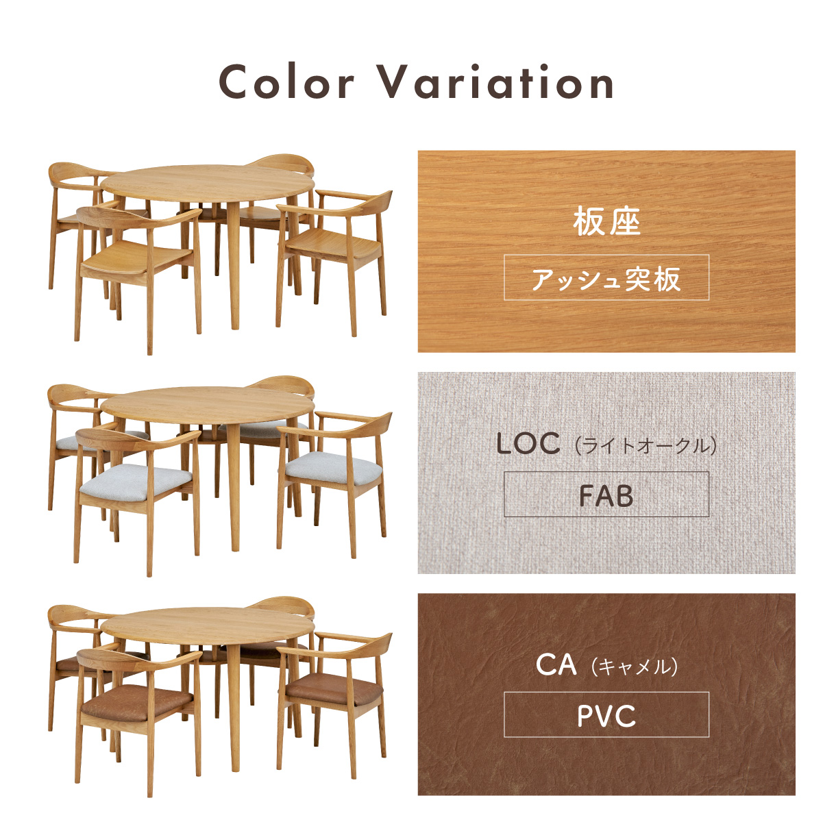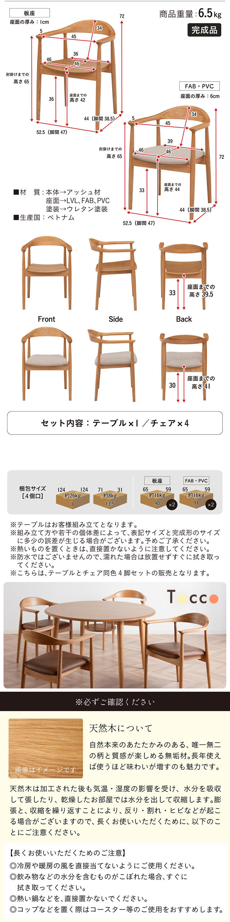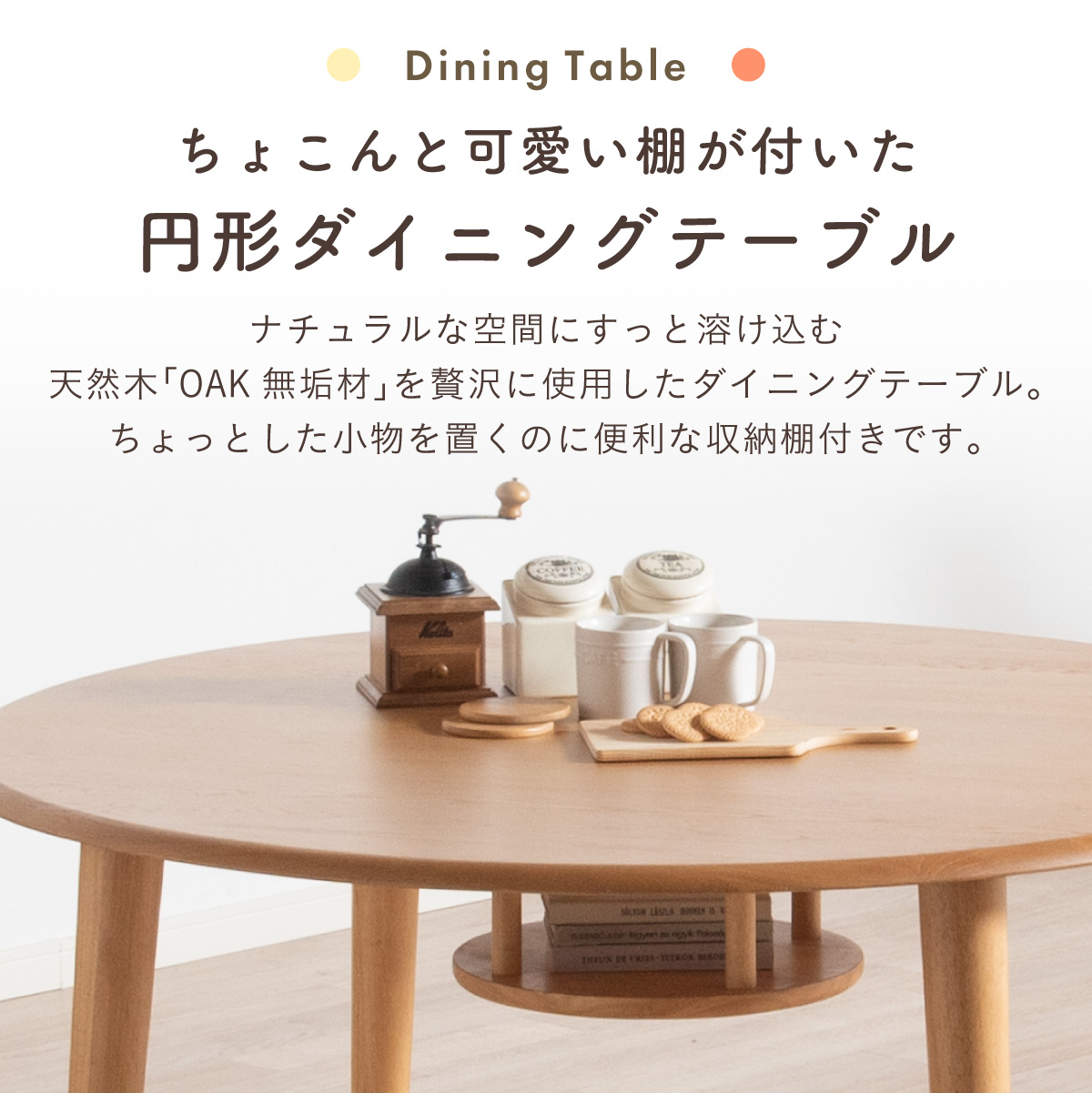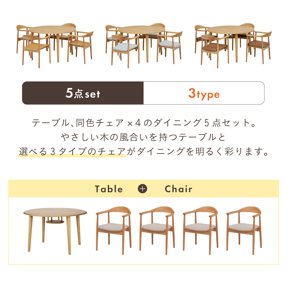 | ちょこんと小さな収納棚付きラウンドテーブル Dining 5set Tocco(トッコ) 5点セット テーブル、同色チェアx4のダイニング5点セット。 やさしい木の風合いを持つテーブルと選べる3タイプのチェアがダイニングを明るく彩ります。 ■円形テーブルならではの使いやすさ 角のない円形テーブルで動線も快適。座る位置を選ばず、みんなで自然に囲めます。 ■広々使える120cmの天板 4人でゆったりと囲める、広々としたサイズ。食事の時間も会話の時間も心地よく広げてくれます。 ■細部までこだわったデザイン 天板の縁はやさしい丸み仕上げ。見た目の柔らかさだけでなく、安全性にも配慮したデザインです。 ■天板下の丸い棚で実用性アップ 天板下には、鳥かごのような丸い棚を設置。ティッシュや本などを置けて、テーブルの上をすっきり保てます。 ■上質なOKA無垢材を使用 天板にはOKA(オーク)無垢材を使用。木目の美しさと経年変化を楽しめる、長く愛用できるダイニングテーブルです。 脚部と収納棚にはラバーウッド材を採用。ナチュラルな風合いと安定感を兼ね備えています。 ■テーブル下にすっきり収納 アームが天板下に収まり、使わないときはきれいに収納可能。 ダイニング空間を広く、すっきりと保てます。 ※チェア4脚使用時。配置によっては、チェア同士の感覚が狭くなり、お互いに接触する場合があります。 ■背中に自然とフィットするやわらかな曲線の背もたれ 背中のラインに沿う曲線が、やさしく身体を支えます。 ■ゆったりと座れる奥行のある座面設計 奥行にゆとりを持たせ、安定感のある座り心地に仕上げました。 ■丸みをもたせた、やさしいフォルム 手すりや脚など、全体的に角を抑え、空間になじむやわらかな印象に仕上げました。 ■Material ・丈夫さと表情豊かな木目をあわせ持つアッシュ材を使用 ・張地(FAB):やわらかな肌触りで、空間にやさしい印象を与えるファブリック素材 ・張地(PVC):水や汚れに強く、お手入れがしやすいPVC素材。日常使いに安心です。 ■Dining detail ・脚裏にはガタツキ防止のアジャスター付き ・天板の厚み2cm ・汚れに強いウレタン塗装 ■Chair detail ・板座:座面の厚み1cm ・FAB:座面の厚み6cm ・PVC:座面の厚み6cm ・脚裏には傷防止のフェルト付き ※テーブルはお客様組み立てとなります。 ※組み立て方や若干の個体差により、表記サイズと完成形サイズに多少の誤差が生じる場合があります。予めご了承下さい。 ※こちらは、テーブルとチェア同色4脚セットの販売ページとなります。 ※熱いものを置くときは、直接置かないように注意してください。 ※防水ではございませんので、濡れた場合は放置せずすぐに拭き取ってください。 ※こちらの商品は天然木を使用しております。その為、木の表情や風合いには個体差がございます。節など木の風合いを理由とした返品・交換は対象外となりますので予めご了承ください。 | |