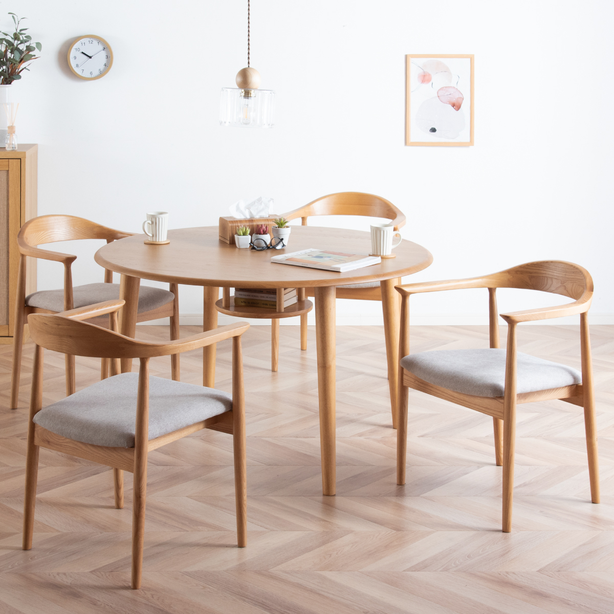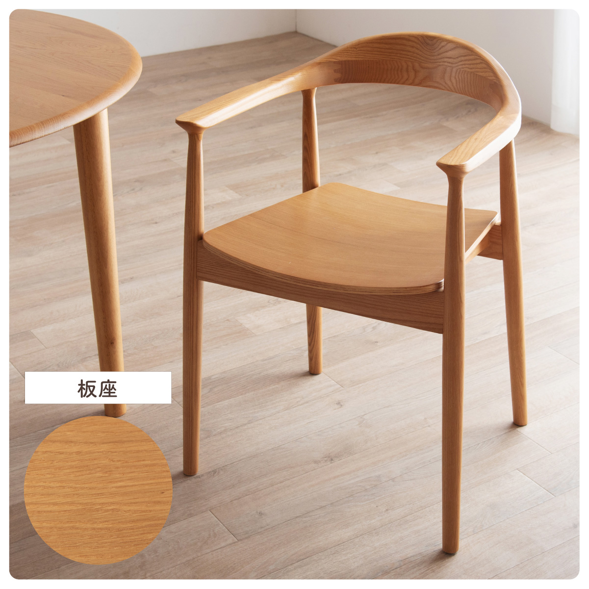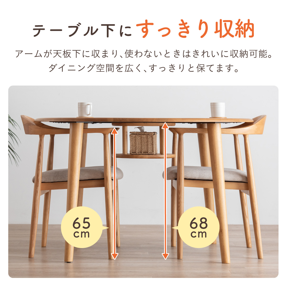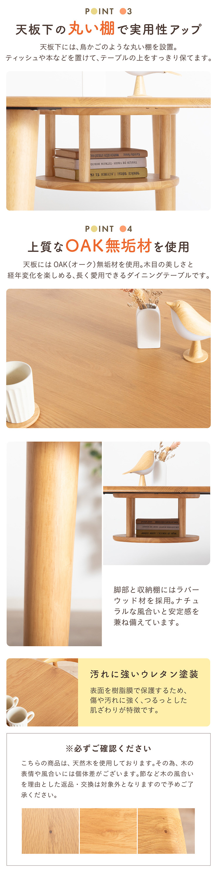 | ちょこんと小さな収納棚付きラウンドテーブル Dining 5set Tocco(トッコ) 5点セット テーブル、同色チェアx4のダイニング5点セット。 やさしい木の風合いを持つテーブルと選べる3タイプのチェアがダイニングを明るく彩ります。 ■円形テーブルならではの使いやすさ 角のない円形テーブルで動線も快適。座る位置を選ばず、みんなで自然に囲めます。 ■広々使える120cmの天板 4人でゆったりと囲める、広々としたサイズ。食事の時間も会話の時間も心地よく広げてくれます。 ■細部までこだわったデザイン 天板の縁はやさしい丸み仕上げ。見た目の柔らかさだけでなく、安全性にも配慮したデザインです。 ■天板下の丸い棚で実用性アップ 天板下には、鳥かごのような丸い棚を設置。ティッシュや本などを置けて、テーブルの上をすっきり保てます。 ■上質なOKA無垢材を使用 天板にはOKA(オーク)無垢材を使用。木目の美しさと経年変化を楽しめる、長く愛用できるダイニングテーブルです。 脚部と収納棚にはラバーウッド材を採用。ナチュラルな風合いと安定感を兼ね備えています。 ■テーブル下にすっきり収納 アームが天板下に収まり、使わないときはきれいに収納可能。 ダイニング空間を広く、すっきりと保てます。 ※チェア4脚使用時。配置によっては、チェア同士の感覚が狭くなり、お互いに接触する場合があります。 ■背中に自然とフィットするやわらかな曲線の背もたれ 背中のラインに沿う曲線が、やさしく身体を支えます。 ■ゆったりと座れる奥行のある座面設計 奥行にゆとりを持たせ、安定感のある座り心地に仕上げました。 ■丸みをもたせた、やさしいフォルム 手すりや脚など、全体的に角を抑え、空間になじむやわらかな印象に仕上げました。 ■Material ・丈夫さと表情豊かな木目をあわせ持つアッシュ材を使用 ・張地(FAB):やわらかな肌触りで、空間にやさしい印象を与えるファブリック素材 ・張地(PVC):水や汚れに強く、お手入れがしやすいPVC素材。日常使いに安心です。 ■Dining detail ・脚裏にはガタツキ防止のアジャスター付き ・天板の厚み2cm ・汚れに強いウレタン塗装 ■Chair detail ・板座:座面の厚み1cm ・FAB:座面の厚み6cm ・PVC:座面の厚み6cm ・脚裏には傷防止のフェルト付き ※テーブルはお客様組み立てとなります。 ※組み立て方や若干の個体差により、表記サイズと完成形サイズに多少の誤差が生じる場合があります。予めご了承下さい。 ※こちらは、テーブルとチェア同色4脚セットの販売ページとなります。 ※熱いものを置くときは、直接置かないように注意してください。 ※防水ではございませんので、濡れた場合は放置せずすぐに拭き取ってください。 ※こちらの商品は天然木を使用しております。その為、木の表情や風合いには個体差がございます。節など木の風合いを理由とした返品・交換は対象外となりますので予めご了承ください。 | |