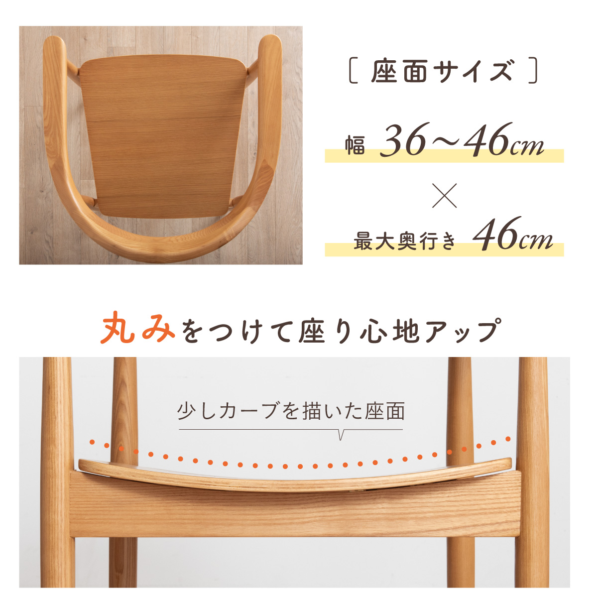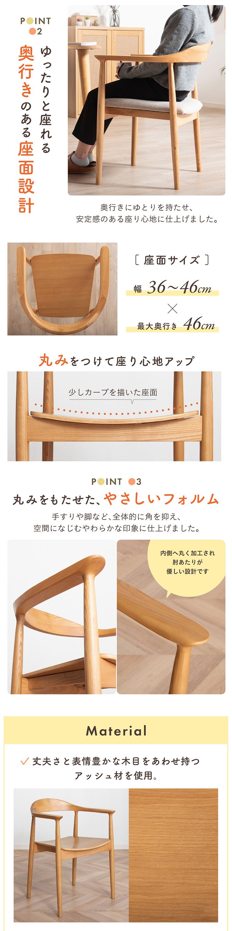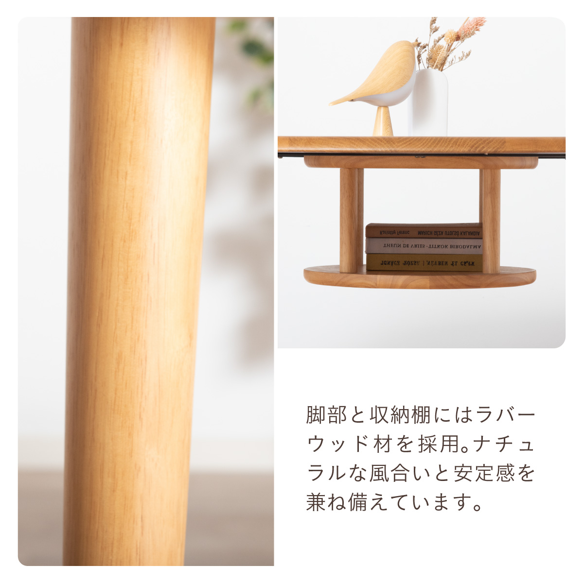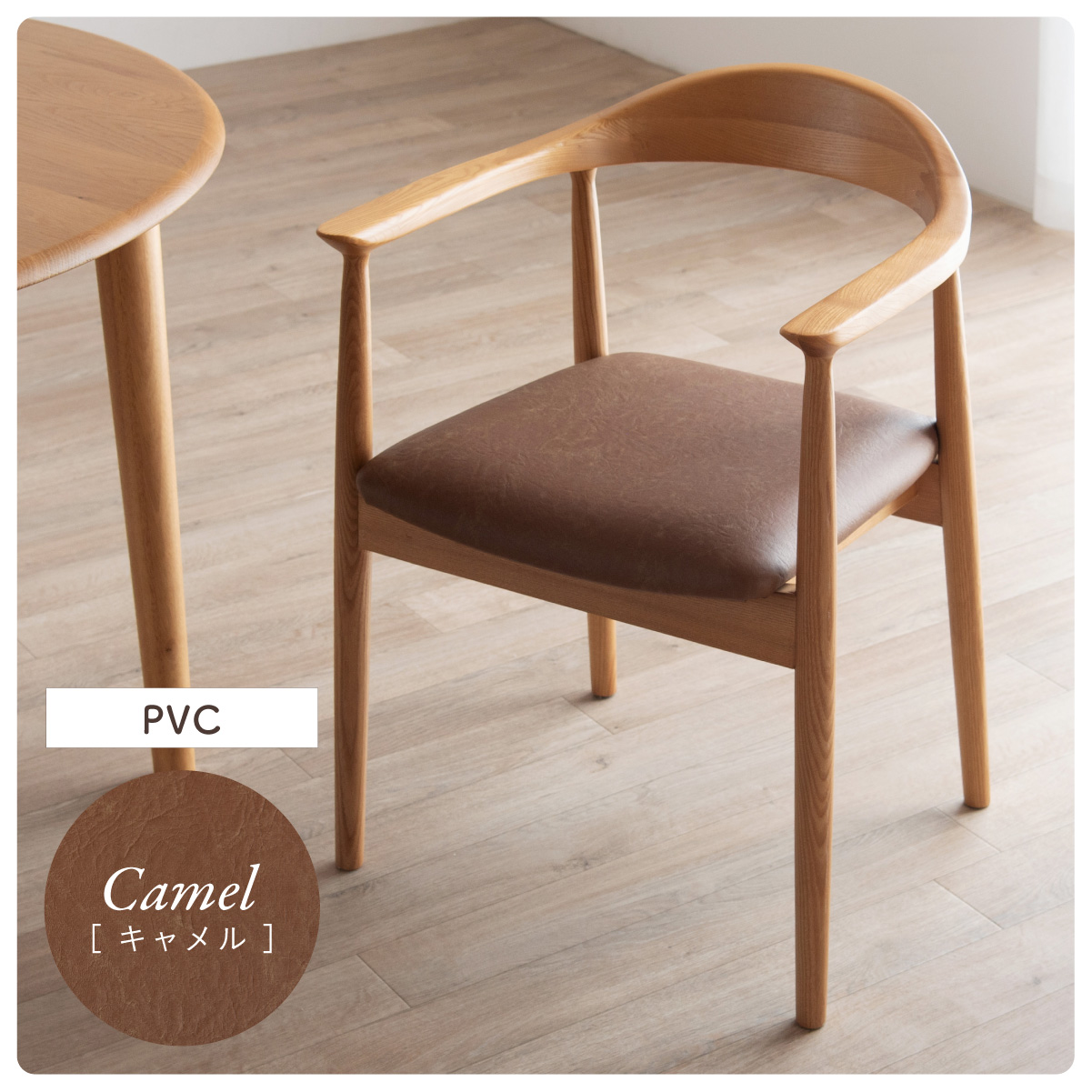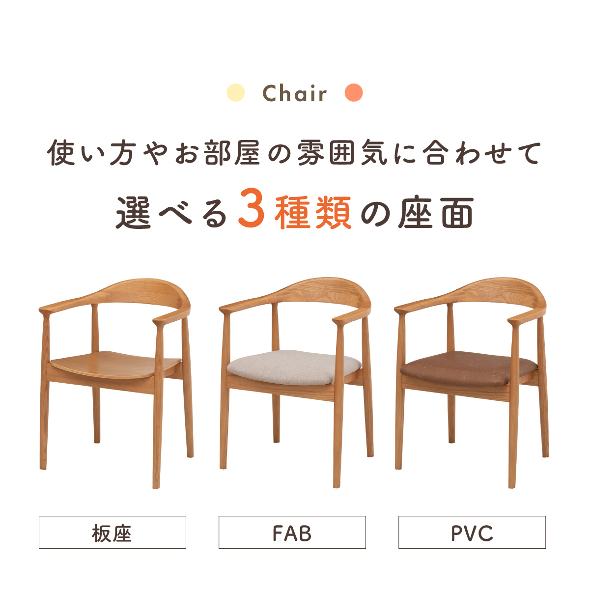 | ちょこんと小さな収納棚付きラウンドテーブル Dining 5set Tocco(トッコ) 5点セット テーブル、同色チェアx4のダイニング5点セット。 やさしい木の風合いを持つテーブルと選べる3タイプのチェアがダイニングを明るく彩ります。 ■円形テーブルならではの使いやすさ 角のない円形テーブルで動線も快適。座る位置を選ばず、みんなで自然に囲めます。 ■広々使える120cmの天板 4人でゆったりと囲める、広々としたサイズ。食事の時間も会話の時間も心地よく広げてくれます。 ■細部までこだわったデザイン 天板の縁はやさしい丸み仕上げ。見た目の柔らかさだけでなく、安全性にも配慮したデザインです。 ■天板下の丸い棚で実用性アップ 天板下には、鳥かごのような丸い棚を設置。ティッシュや本などを置けて、テーブルの上をすっきり保てます。 ■上質なOKA無垢材を使用 天板にはOKA(オーク)無垢材を使用。木目の美しさと経年変化を楽しめる、長く愛用できるダイニングテーブルです。 脚部と収納棚にはラバーウッド材を採用。ナチュラルな風合いと安定感を兼ね備えています。 ■テーブル下にすっきり収納 アームが天板下に収まり、使わないときはきれいに収納可能。 ダイニング空間を広く、すっきりと保てます。 ※チェア4脚使用時。配置によっては、チェア同士の感覚が狭くなり、お互いに接触する場合があります。 ■背中に自然とフィットするやわらかな曲線の背もたれ 背中のラインに沿う曲線が、やさしく身体を支えます。 ■ゆったりと座れる奥行のある座面設計 奥行にゆとりを持たせ、安定感のある座り心地に仕上げました。 ■丸みをもたせた、やさしいフォルム 手すりや脚など、全体的に角を抑え、空間になじむやわらかな印象に仕上げました。 ■Material ・丈夫さと表情豊かな木目をあわせ持つアッシュ材を使用 ・張地(FAB):やわらかな肌触りで、空間にやさしい印象を与えるファブリック素材 ・張地(PVC):水や汚れに強く、お手入れがしやすいPVC素材。日常使いに安心です。 ■Dining detail ・脚裏にはガタツキ防止のアジャスター付き ・天板の厚み2cm ・汚れに強いウレタン塗装 ■Chair detail ・板座:座面の厚み1cm ・FAB:座面の厚み6cm ・PVC:座面の厚み6cm ・脚裏には傷防止のフェルト付き ※テーブルはお客様組み立てとなります。 ※組み立て方や若干の個体差により、表記サイズと完成形サイズに多少の誤差が生じる場合があります。予めご了承下さい。 ※こちらは、テーブルとチェア同色4脚セットの販売ページとなります。 ※熱いものを置くときは、直接置かないように注意してください。 ※防水ではございませんので、濡れた場合は放置せずすぐに拭き取ってください。 ※こちらの商品は天然木を使用しております。その為、木の表情や風合いには個体差がございます。節など木の風合いを理由とした返品・交換は対象外となりますので予めご了承ください。 | |