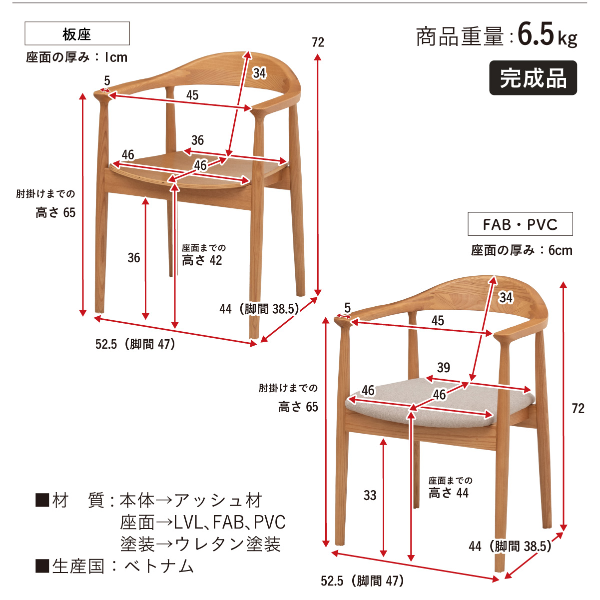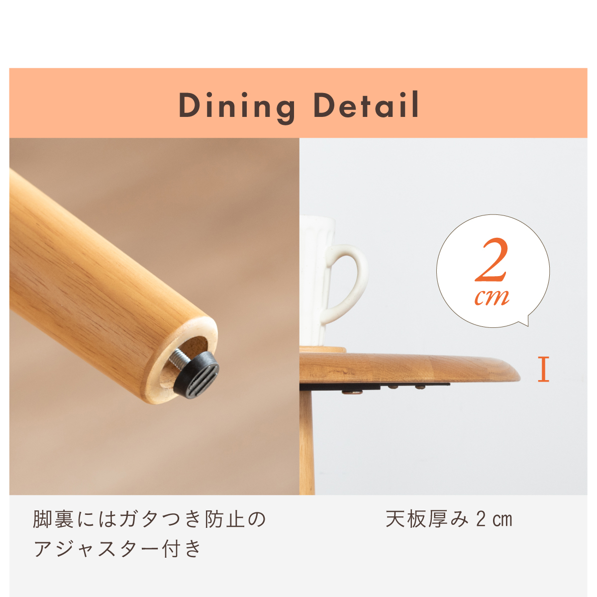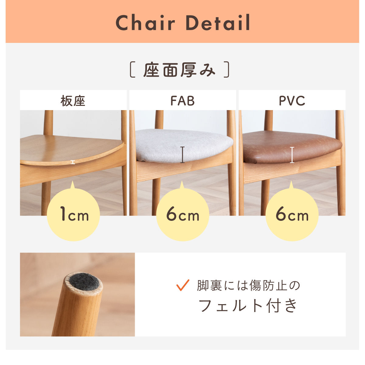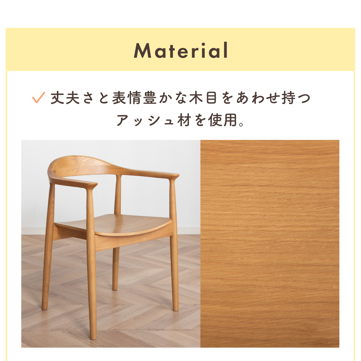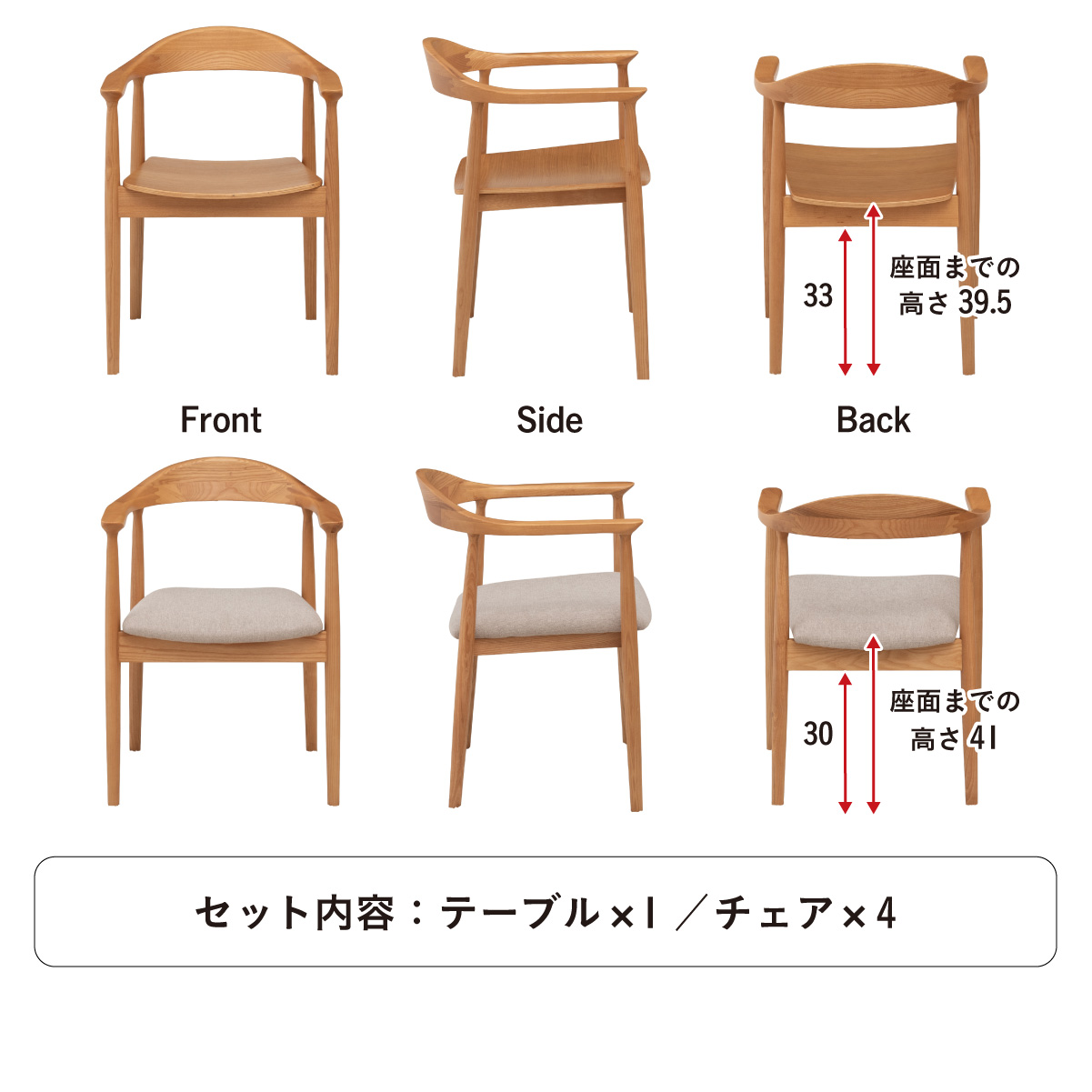 | 材質 | 天板:オーク無垢材 脚:ラバーウッド 塗装:ウレタン塗装 チェア:アッシュ材 座面:LVL・FAB・PVC 塗装:ウレタン塗装 |