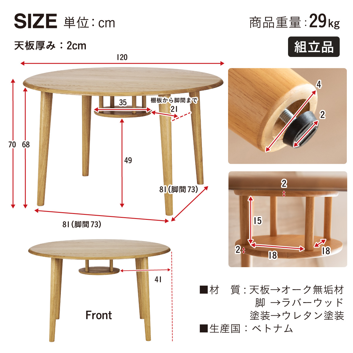 | サイズ | テーブル:約W120 x D120 x H70cm(重量:29kg) チェア:約W52.5 x D44 x H72cm(重量:6.5kg) 梱包サイズ(4個口):124 x 124 x 8cm(重量:26kg)・71 x 31 x 13.5cm(重量:8kg) 板座/65 x 59 x 90cm(重量:16kg)x2・FAB・PVC/65 x 59 x 91cm(重量:16kg)x2 |