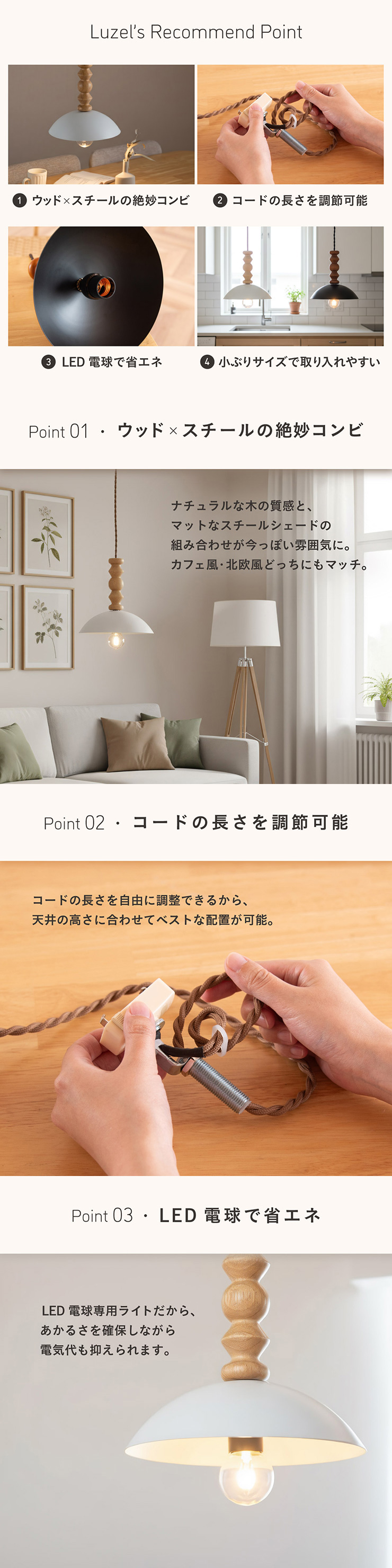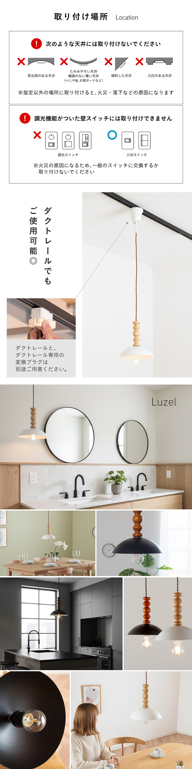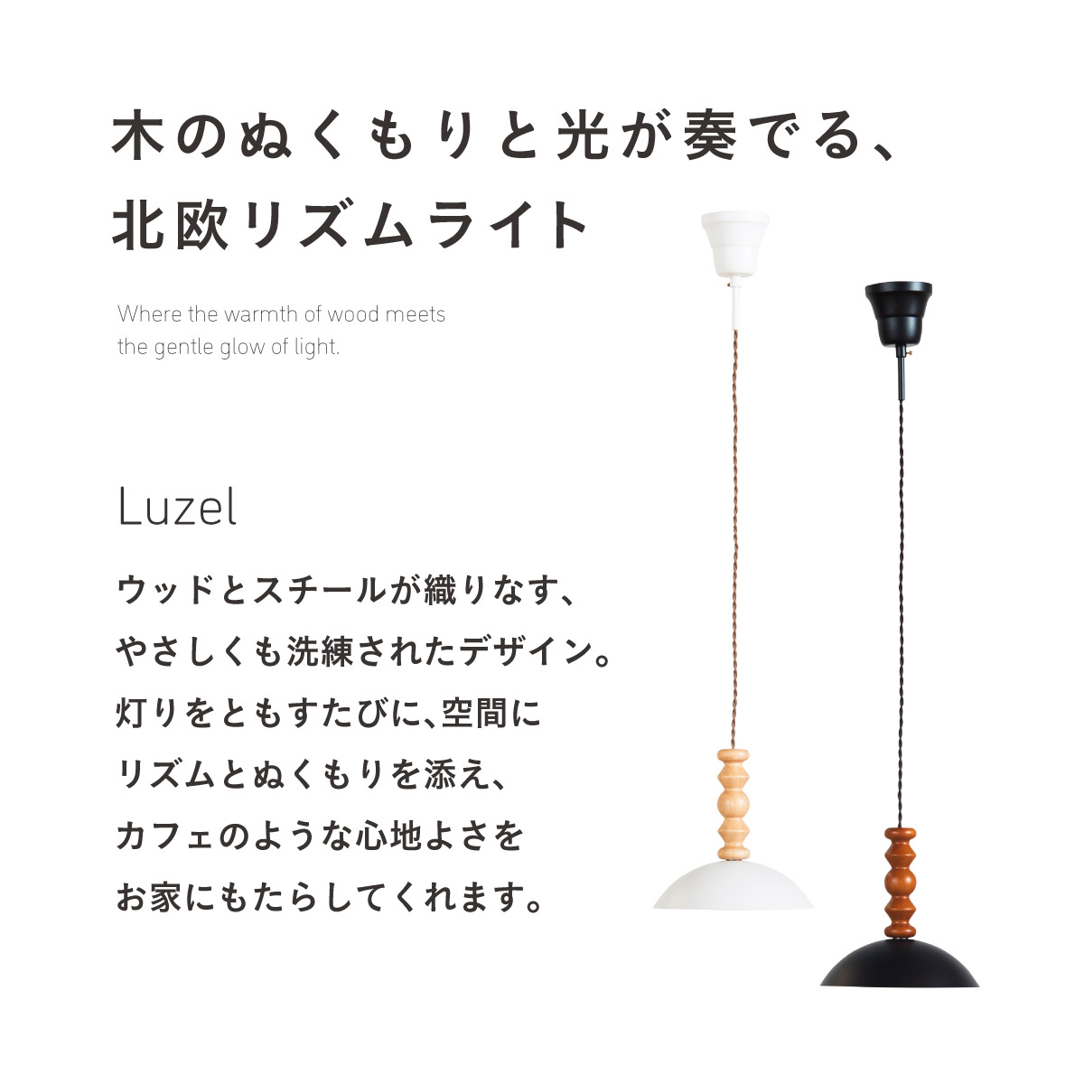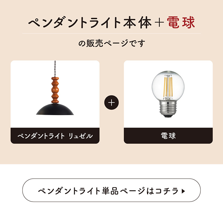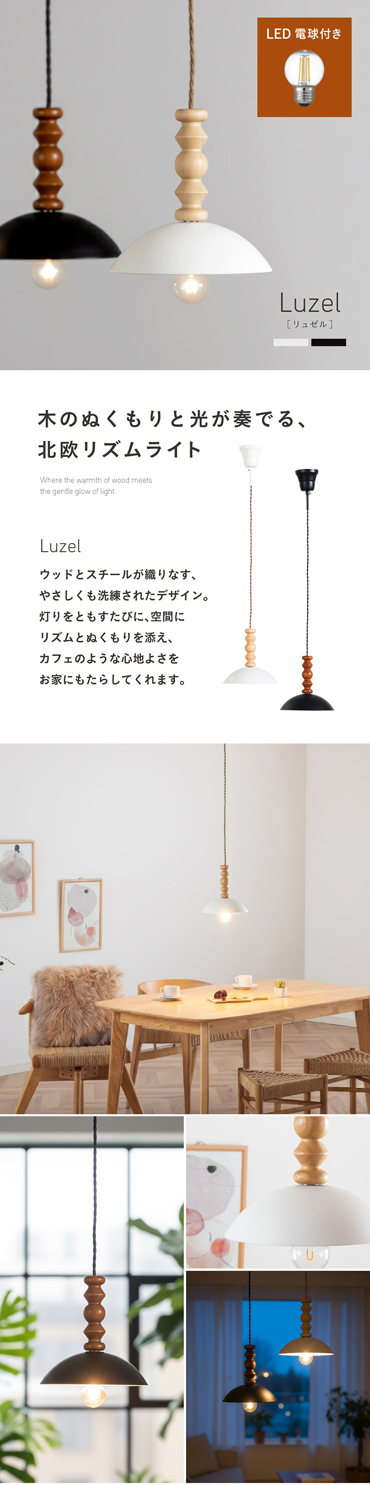 | LED電球専用 ペンダントライト Luzel(リュゼル) 電球セット 木のぬくもりと光が奏でる、北欧リズムライト ウッドとスチールが織りなす、やさしくも洗練されたデザイン。 灯りをともすたびに、空間にリズムとぬくもりを添え、カフェのような心地よさをお家にもたらしてくれます。 ■ウッドxスチールの絶妙コンピ ナチュラルな木の質感と、マットなスチールシェードの組み合わせが今っぽい雰囲気に。 カフェ風・北欧風どっちにもマッチ。 ■コードの長さを調節可能 コード長さを自由に調節できるから、天井の高さに合わせてベストな配置が可能 ■LED電球で省エネ LED電球専用ライトだから、あかるさを確保しながら電気代も抑えられます。 ■小ぶりサイズで取り入れやすい キッチンカウンターや、ダイニングの2灯3灯吊りにも〇 圧迫感なく、空間をおしゃれに彩ります。 ■電球 ・口金:E26 ・定格消費電力:13W以下(※明るさ60W相当以下) ・定格電圧:100V ・この器具はLED電球専用です。 ・白熱電球や蛍光灯電球は使用できません。 ・電球は付属しておりません。 ・電球をご購入される前に、必ずロ金・ワット数のご確認をお願いいたします。 ・調光調色機能付き電球やリモコン付き電球などは対応可能です。 ■引掛けシーリング 一般的なご家庭に設置されている、下記のいずれかのシーリングがあれば、特別な工具や工事なしで簡単に取り付けが可能です。 ・角型引掛けシーリング ・丸型引掛けシーリング ・丸型フル引掛けシーリング ・フル引掛けシーリング ・引掛け埋込ローゼット ※シーリングが設置されていない場合は、別途電気工事が必要になります。 ※種類によっては、シーリングカバー内に完全に収まらない場合があります。ご了承ください。 ■取り付け場所 次のような天井には取り付けないでください。 ・突出部のある天井 ・たわみやすい天井、補強のない薄い天井(ベニヤ板、石膏ボードなど) ・傾斜した天井 ・凸凹のある天井 ※指定以外の場所に取り付けると、火災・落下などの原因になります。 調光機能がついた壁スイッチには取り付けできません。 ※火災の原因になるため、一般のスイッチに交換する取り付けないでください。 ■ダクトレールでもご使用可能〇 ダクトレールとダクトレール専用の変換プラグは別途ご用意ください。 ■LED電球を1灯付属しています ・フィラメント 40形相当 ・光の広がり全方向タイプ ・E26口金、電球色相当 ・メーカー:YAZAWA(ヤザワ) ※電気用品安全法(PSE法)および日本の安全規格に適合した製品です。 ※本製品は天然木を使用しているため、木目や色味には個体差があり、また、木材の性質上、幹の節目などにより小さな黒い点や筋が見られる場合がございます。これらは天然素材ならではの風合いであり、品質には問題ございません。世界に一つだけの、天然木が持つ個性としてお楽しみいただければ幸いです。※以下の器具には絶対使用しないでください。 ・調光機能のついた電球器具や回路 [調光:電球の明るさを変える機能](100%点灯も使用不可) ・リモコンのついた電球器具 ・誘導灯・非常用照明器具 ・水銀灯・ナトリウムランプ・メタルハライドライプなどのHIDランプ器具 ・断熱材施工器具[SB、SGI、SG形表器具] ・下向き器具でも、細長い器具やランプの取り付け位置が奥まっている器具 ・センサー付き器具 ・取り付けた高さが3.0m以上になる器具 ・ランプを2個以上装着する器具 ・電子スイッチでは使用できません。(誤作動の原因) (このほか使用器具の種類によって寸法的、熱的、その他の状況により使用できない場合があります。) | |
