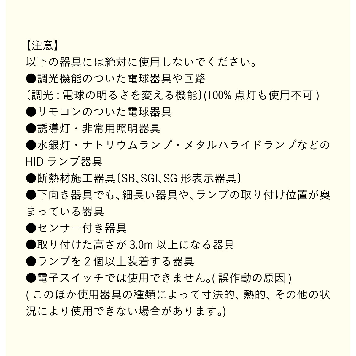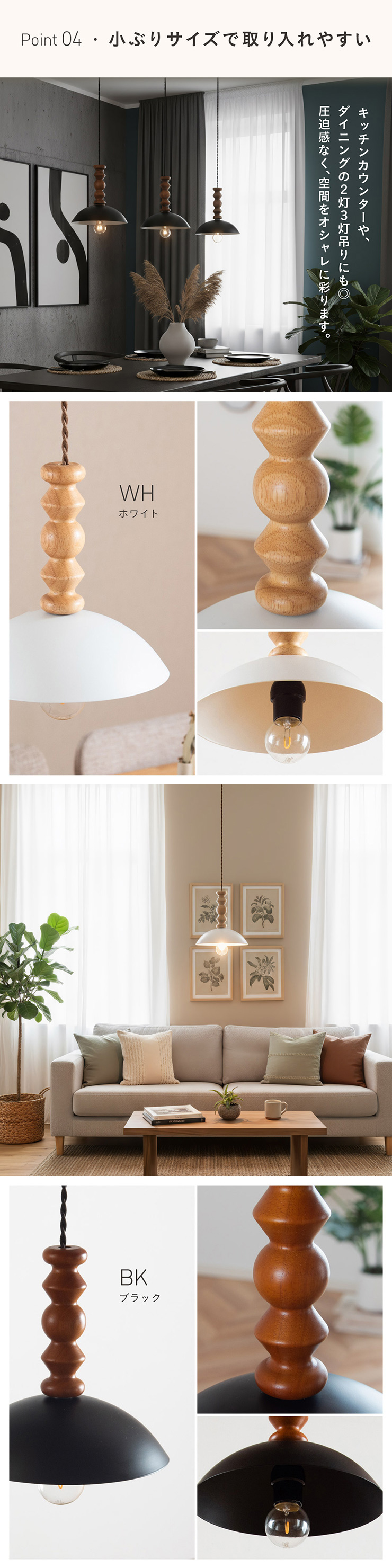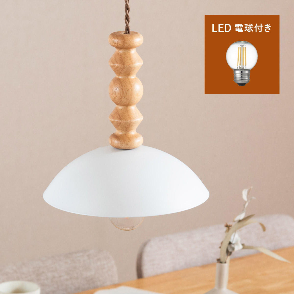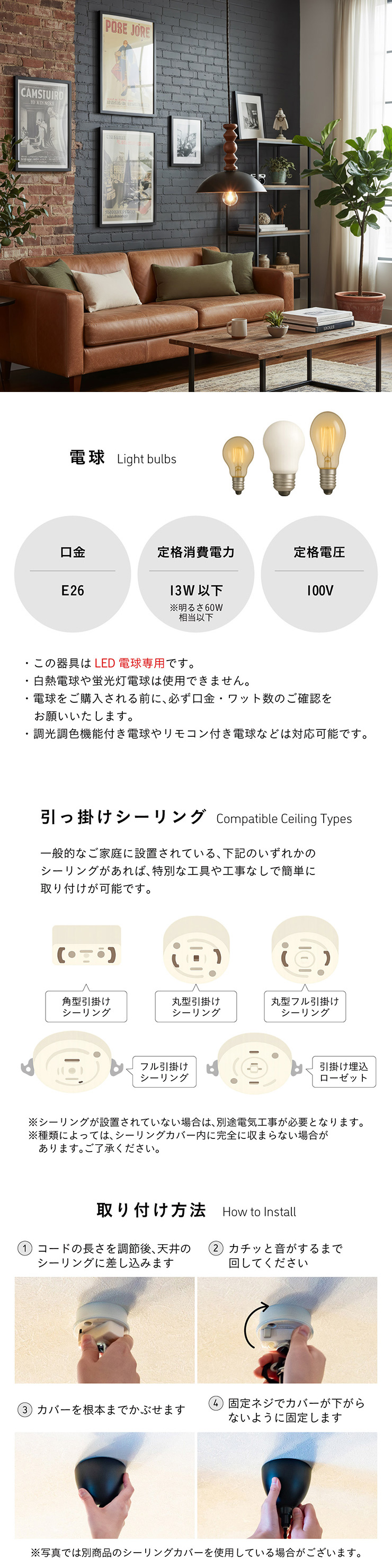 | LED電球専用 ペンダントライト Luzel(リュゼル) 電球セット 木のぬくもりと光が奏でる、北欧リズムライト ウッドとスチールが織りなす、やさしくも洗練されたデザイン。 灯りをともすたびに、空間にリズムとぬくもりを添え、カフェのような心地よさをお家にもたらしてくれます。 ■ウッドxスチールの絶妙コンピ ナチュラルな木の質感と、マットなスチールシェードの組み合わせが今っぽい雰囲気に。 カフェ風・北欧風どっちにもマッチ。 ■コードの長さを調節可能 コード長さを自由に調節できるから、天井の高さに合わせてベストな配置が可能 ■LED電球で省エネ LED電球専用ライトだから、あかるさを確保しながら電気代も抑えられます。 ■小ぶりサイズで取り入れやすい キッチンカウンターや、ダイニングの2灯3灯吊りにも〇 圧迫感なく、空間をおしゃれに彩ります。 ■電球 ・口金:E26 ・定格消費電力:13W以下(※明るさ60W相当以下) ・定格電圧:100V ・この器具はLED電球専用です。 ・白熱電球や蛍光灯電球は使用できません。 ・電球は付属しておりません。 ・電球をご購入される前に、必ずロ金・ワット数のご確認をお願いいたします。 ・調光調色機能付き電球やリモコン付き電球などは対応可能です。 ■引掛けシーリング 一般的なご家庭に設置されている、下記のいずれかのシーリングがあれば、特別な工具や工事なしで簡単に取り付けが可能です。 ・角型引掛けシーリング ・丸型引掛けシーリング ・丸型フル引掛けシーリング ・フル引掛けシーリング ・引掛け埋込ローゼット ※シーリングが設置されていない場合は、別途電気工事が必要になります。 ※種類によっては、シーリングカバー内に完全に収まらない場合があります。ご了承ください。 ■取り付け場所 次のような天井には取り付けないでください。 ・突出部のある天井 ・たわみやすい天井、補強のない薄い天井(ベニヤ板、石膏ボードなど) ・傾斜した天井 ・凸凹のある天井 ※指定以外の場所に取り付けると、火災・落下などの原因になります。 調光機能がついた壁スイッチには取り付けできません。 ※火災の原因になるため、一般のスイッチに交換する取り付けないでください。 ■ダクトレールでもご使用可能〇 ダクトレールとダクトレール専用の変換プラグは別途ご用意ください。 ■LED電球を1灯付属しています ・フィラメント 40形相当 ・光の広がり全方向タイプ ・E26口金、電球色相当 ・メーカー:YAZAWA(ヤザワ) ※電気用品安全法(PSE法)および日本の安全規格に適合した製品です。 ※本製品は天然木を使用しているため、木目や色味には個体差があり、また、木材の性質上、幹の節目などにより小さな黒い点や筋が見られる場合がございます。これらは天然素材ならではの風合いであり、品質には問題ございません。世界に一つだけの、天然木が持つ個性としてお楽しみいただければ幸いです。※以下の器具には絶対使用しないでください。 ・調光機能のついた電球器具や回路 [調光:電球の明るさを変える機能](100%点灯も使用不可) ・リモコンのついた電球器具 ・誘導灯・非常用照明器具 ・水銀灯・ナトリウムランプ・メタルハライドライプなどのHIDランプ器具 ・断熱材施工器具[SB、SGI、SG形表器具] ・下向き器具でも、細長い器具やランプの取り付け位置が奥まっている器具 ・センサー付き器具 ・取り付けた高さが3.0m以上になる器具 ・ランプを2個以上装着する器具 ・電子スイッチでは使用できません。(誤作動の原因) (このほか使用器具の種類によって寸法的、熱的、その他の状況により使用できない場合があります。) | |