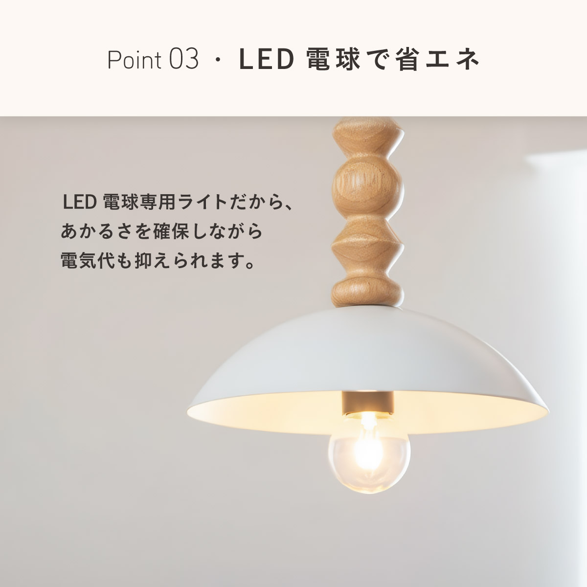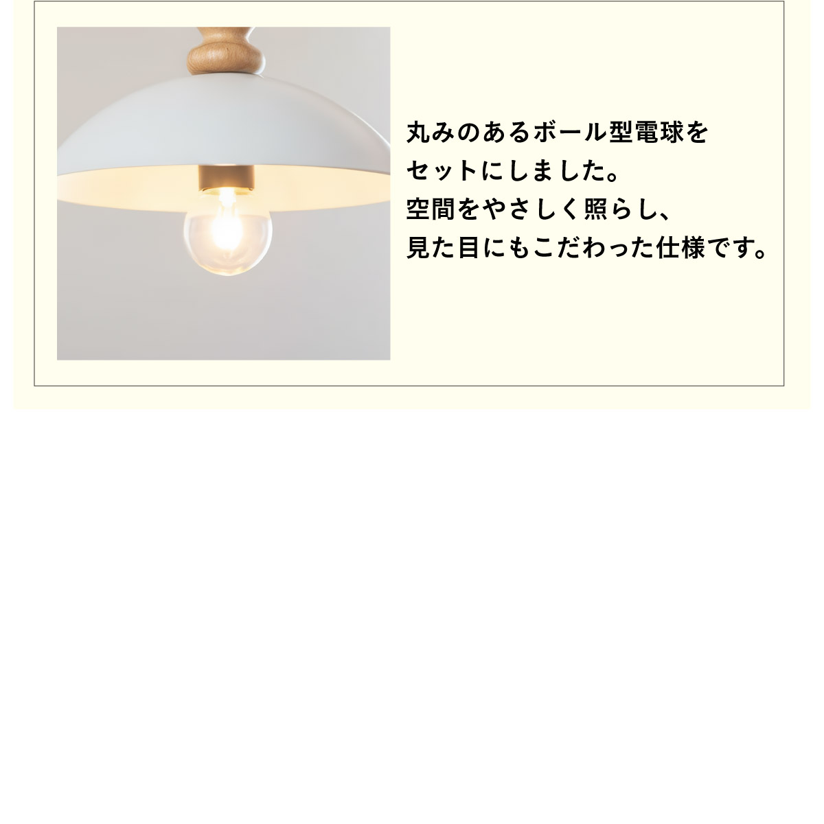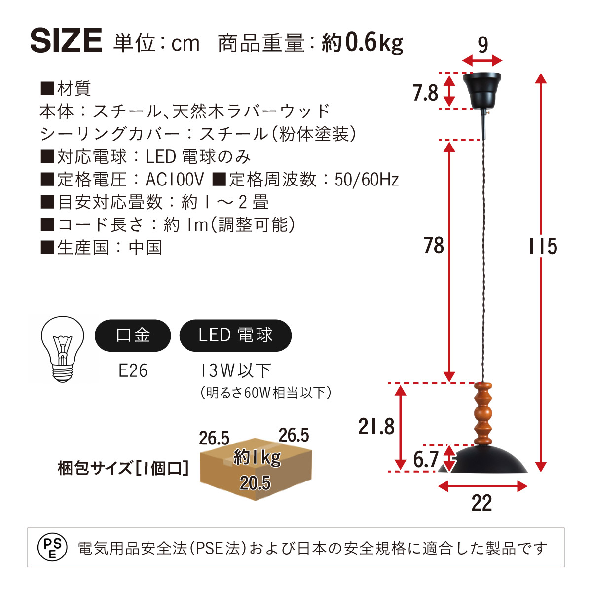 | 材質・素材 | 本体:天然木ラバーウッド・スチール シーリングカバー:スチール(粉体塗装) 対応電球:LED電球のみ 定格電圧:AC100V 定格周波数:50/60Hz 目安対応畳数:約1~2畳 コードの長さ:約1m(調節可能) 〇電球 定格電圧:100V 定格消費電力:4.0W 定格入力電流:0.05A 全光束:500lm 色温度:2700K 設計寿命:20000h |