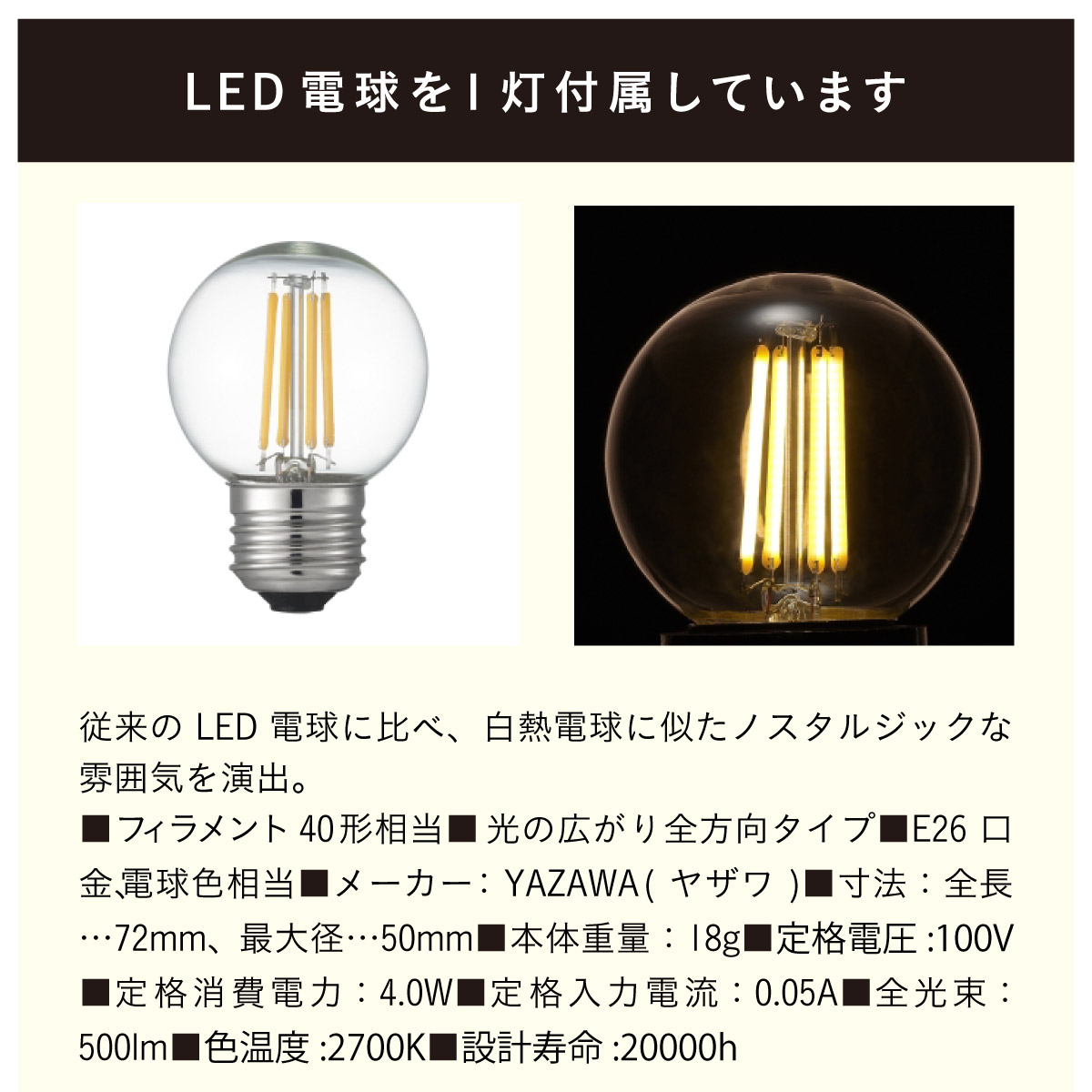 | サイズ | 本体:約W22 x H115cm(重量:約0.6kg) 電球:全長72mm・最大径50mm(質量:18g) 梱包サイズ:約26.5 x 26.5 x 20.5cm(重量:約1kg) |